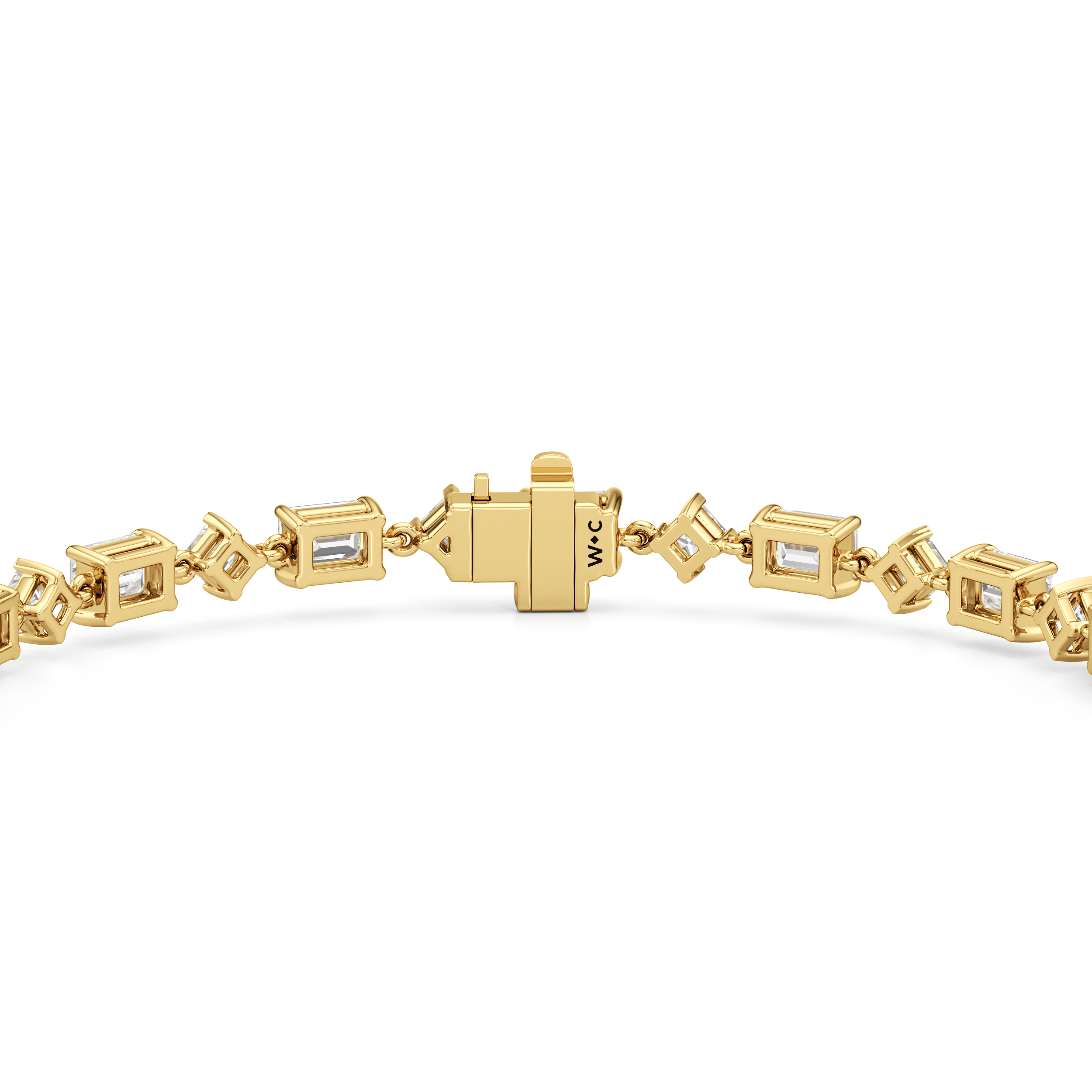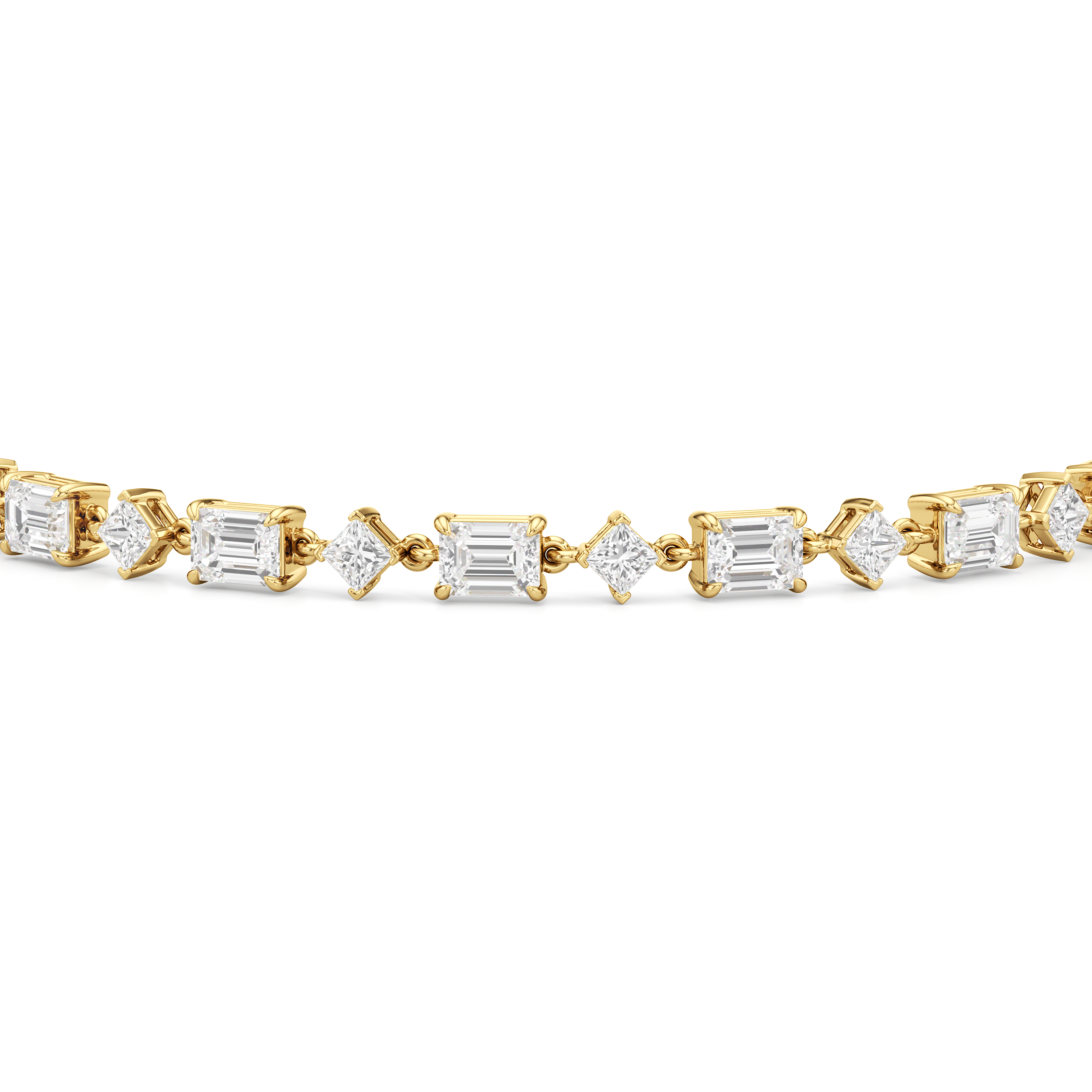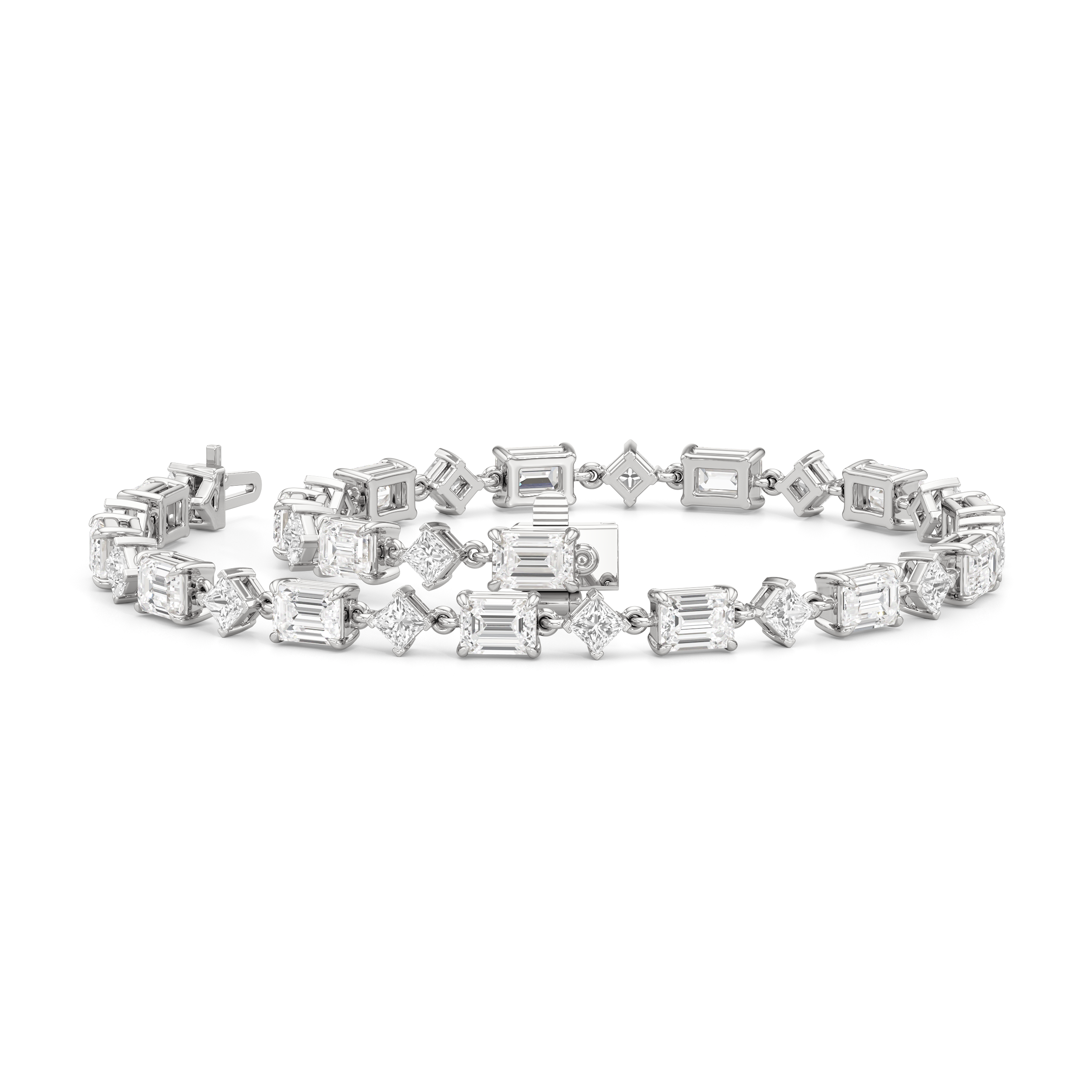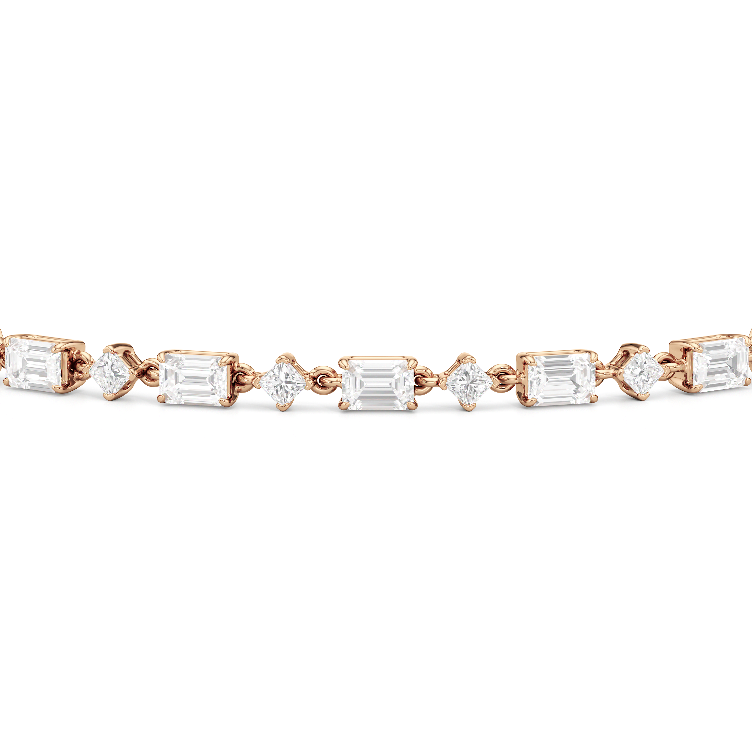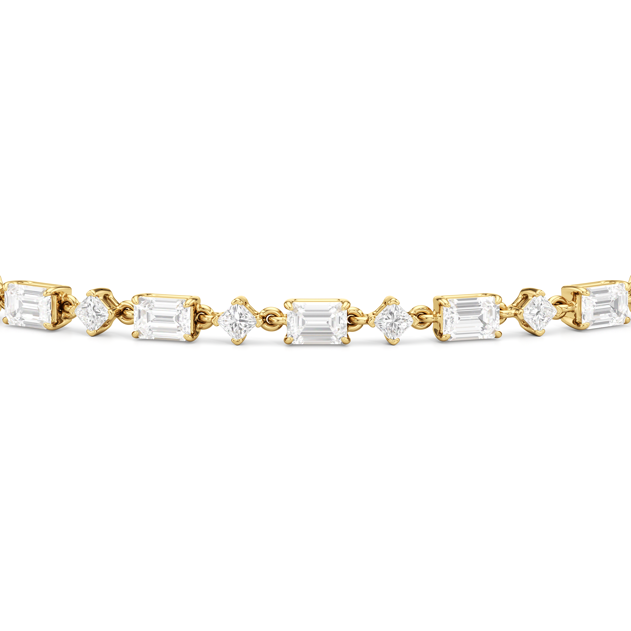 Emerald-cut and princess-cut diamonds dance in perfect unison, creating a symphony of regal refinement. This tennis bracelet features mindfully selected diamonds carefully set by hand on v-prong and claw-prong settings. The lines, angles, and facets of the step-cut diamonds put on show the dazzling hall-of-mirrors effect, showcasing flashes of light that will leave you mesmerized.