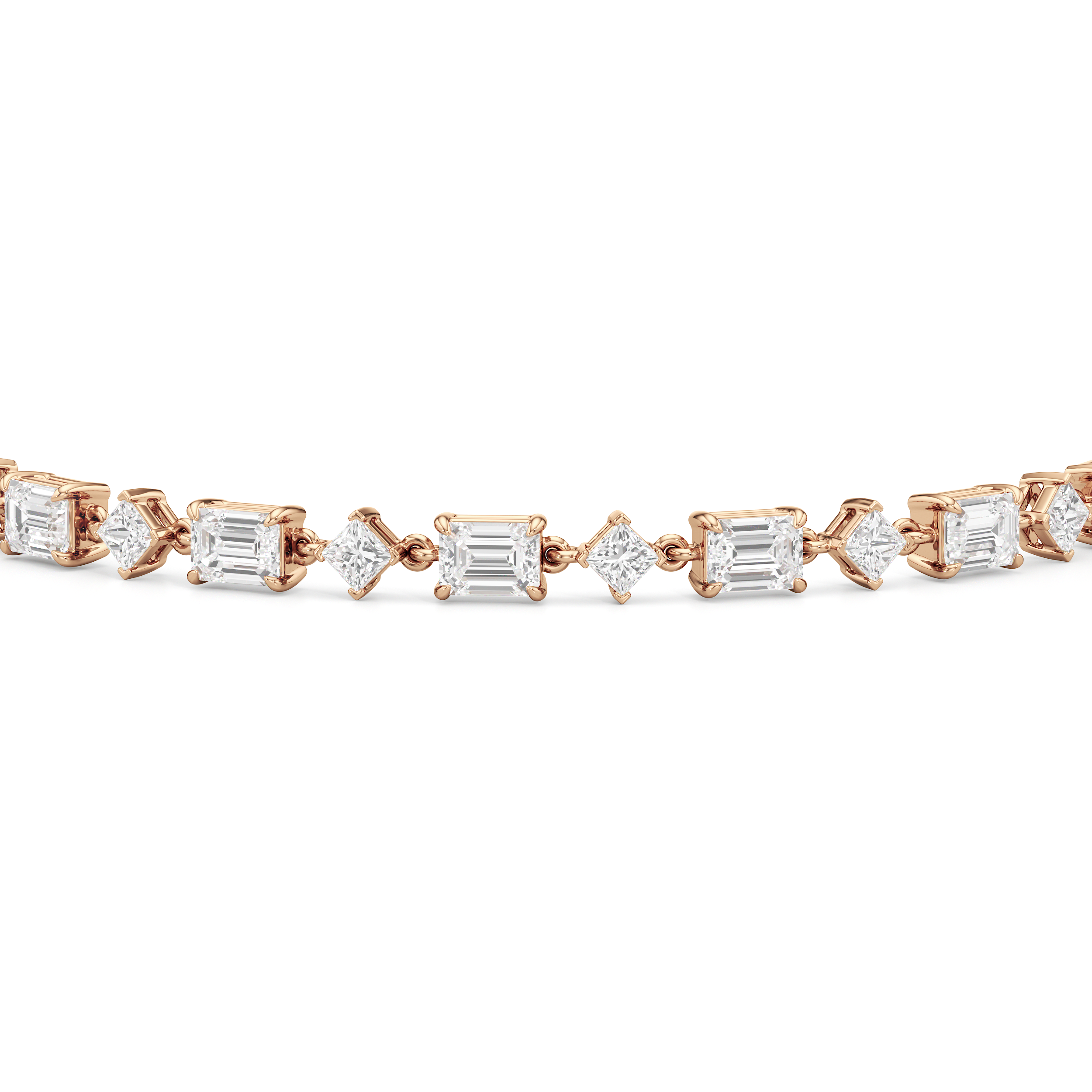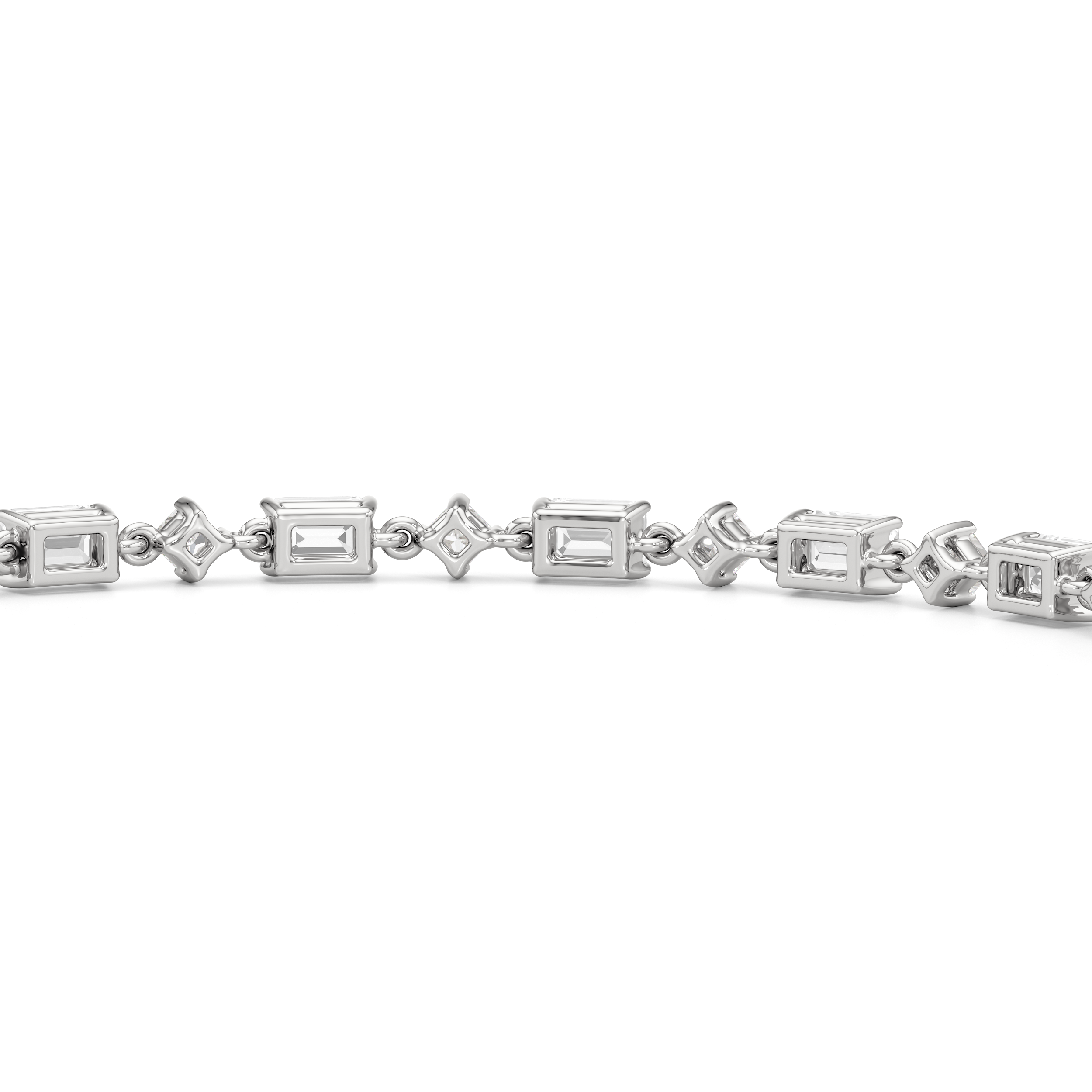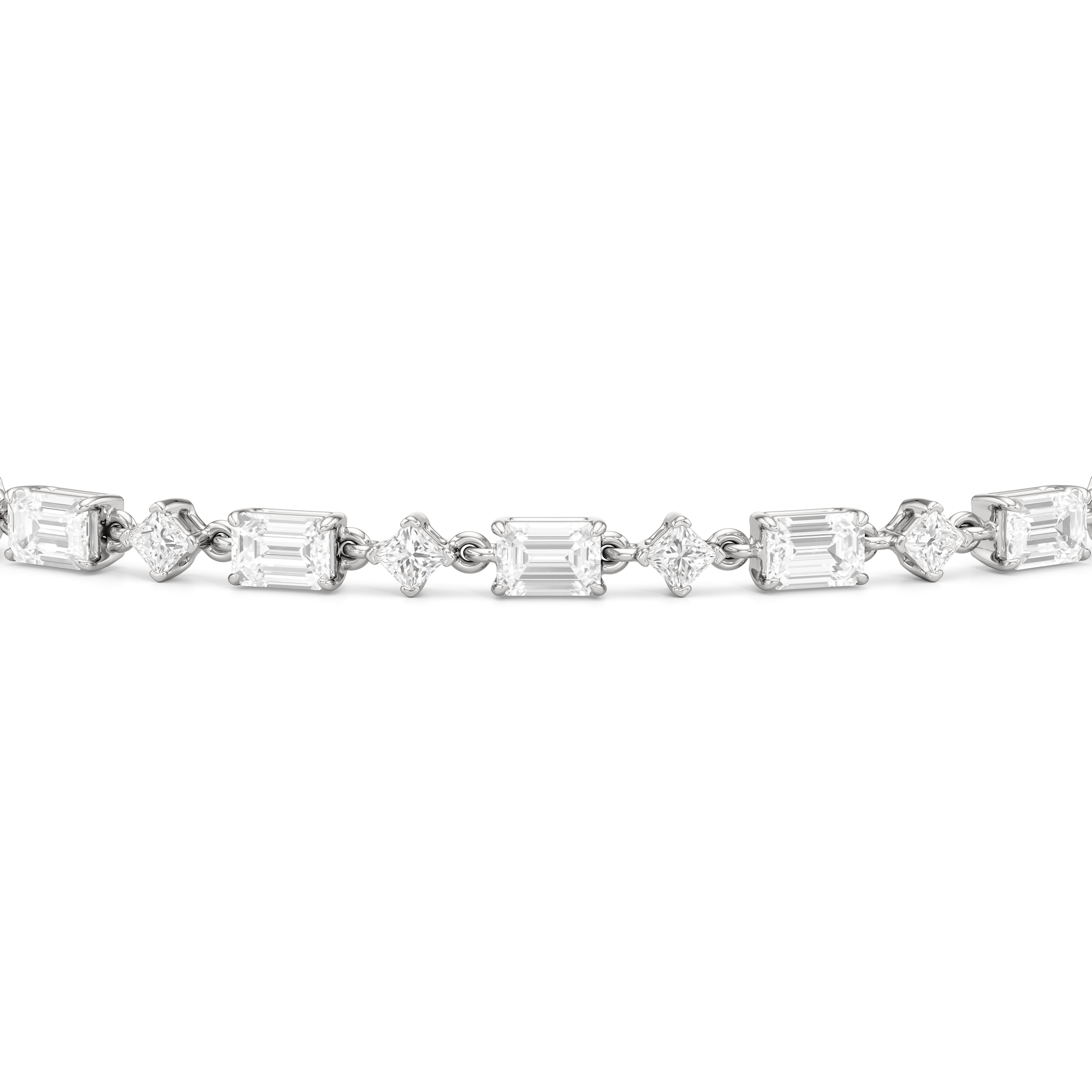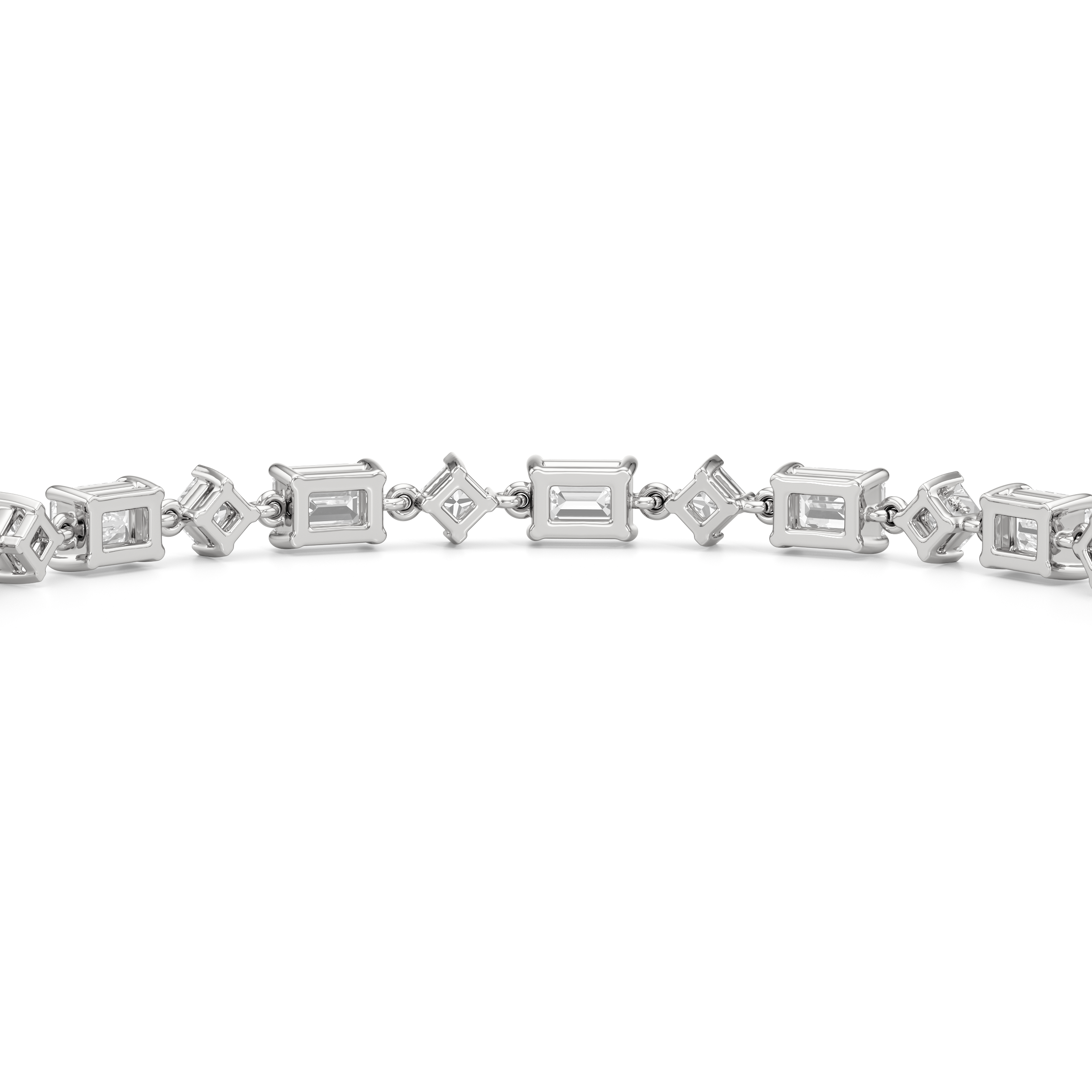 Emerald-cut and princess-cut diamonds dance in perfect unison, creating a symphony of regal refinement. This tennis bracelet features mindfully selected diamonds carefully set by hand on v-prong and claw-prong settings. The lines, angles, and facets of the step-cut diamonds put on show the dazzling hall-of-mirrors effect, showcasing flashes of light that will leave you mesmerized.