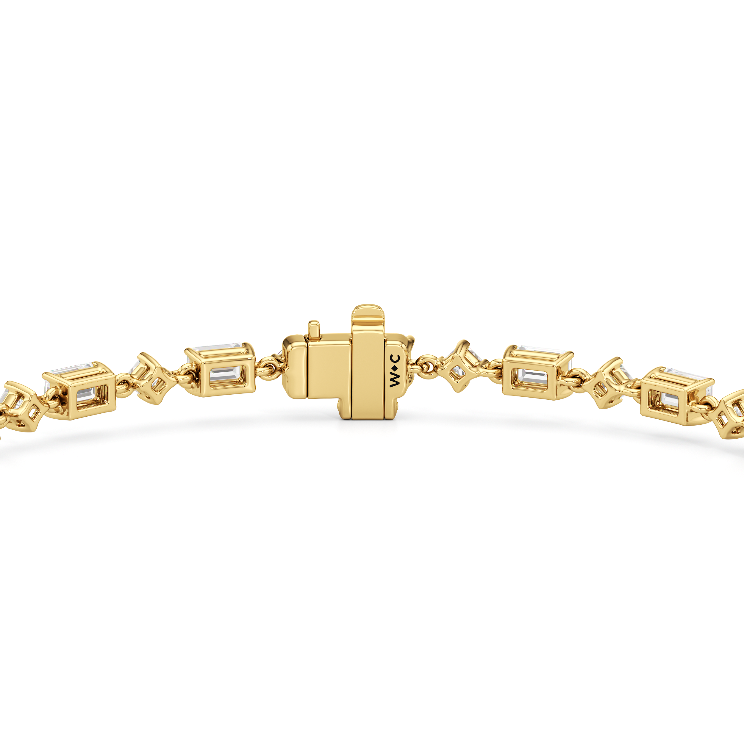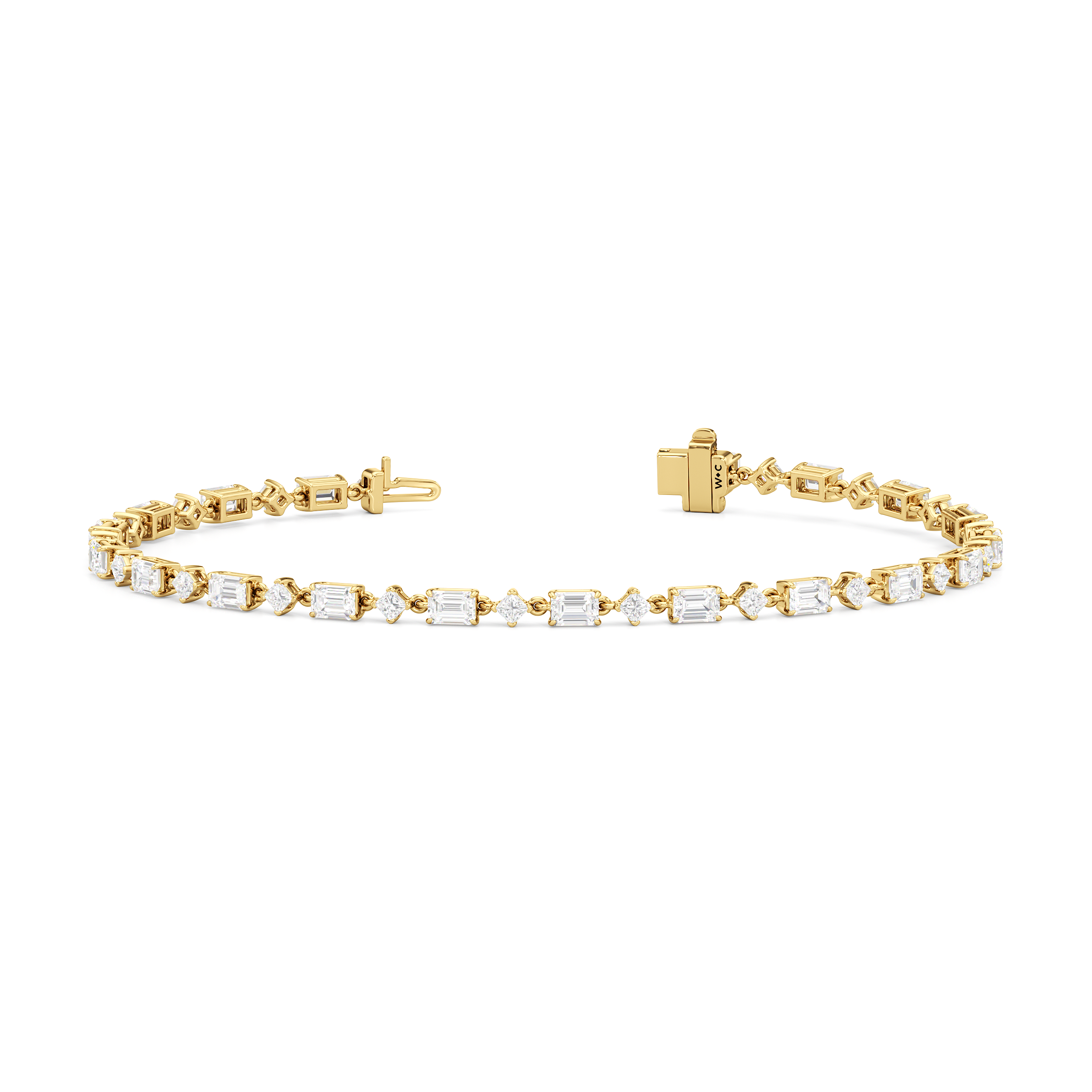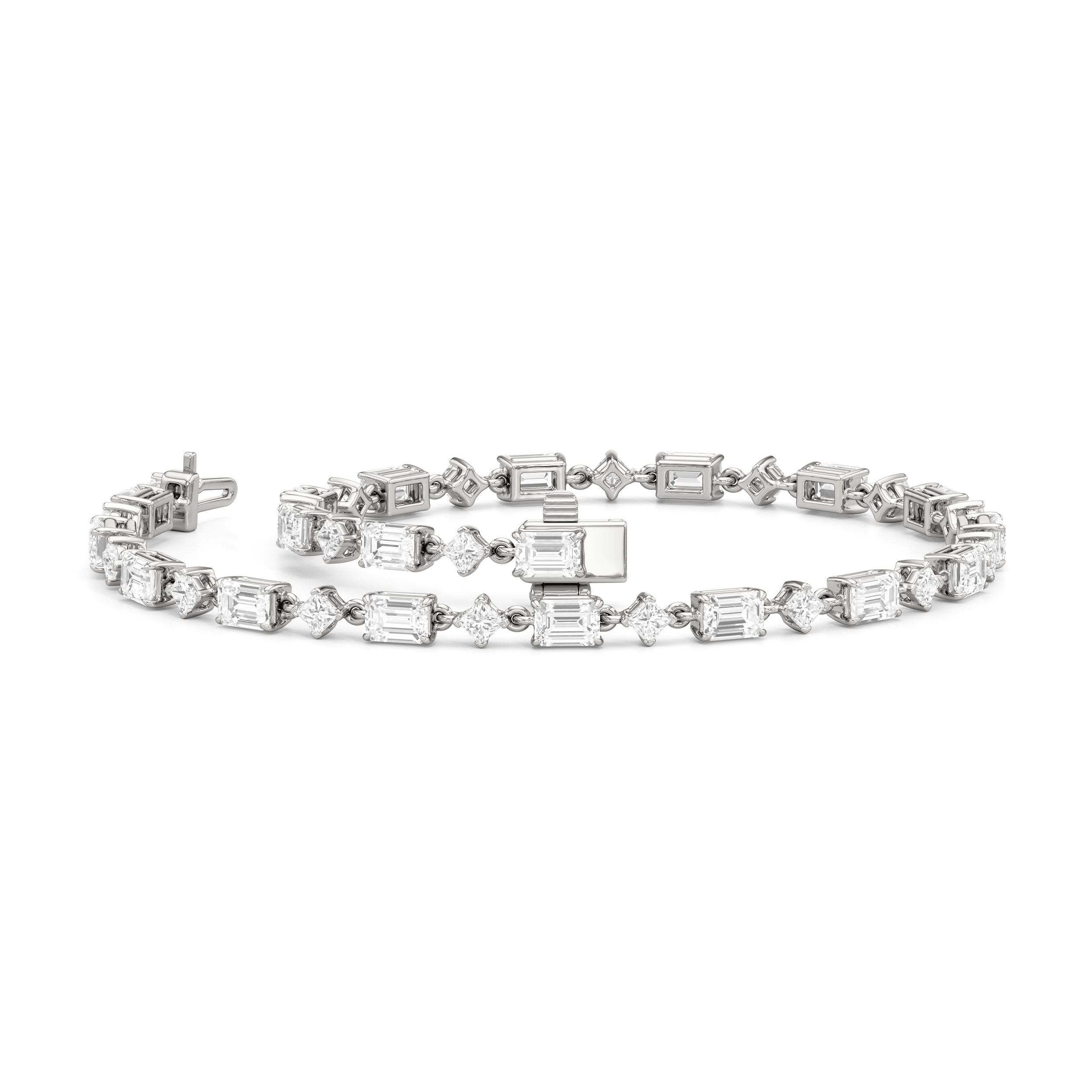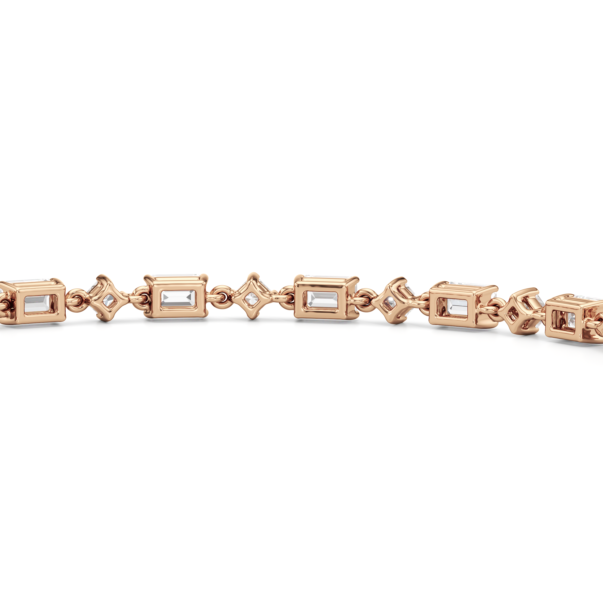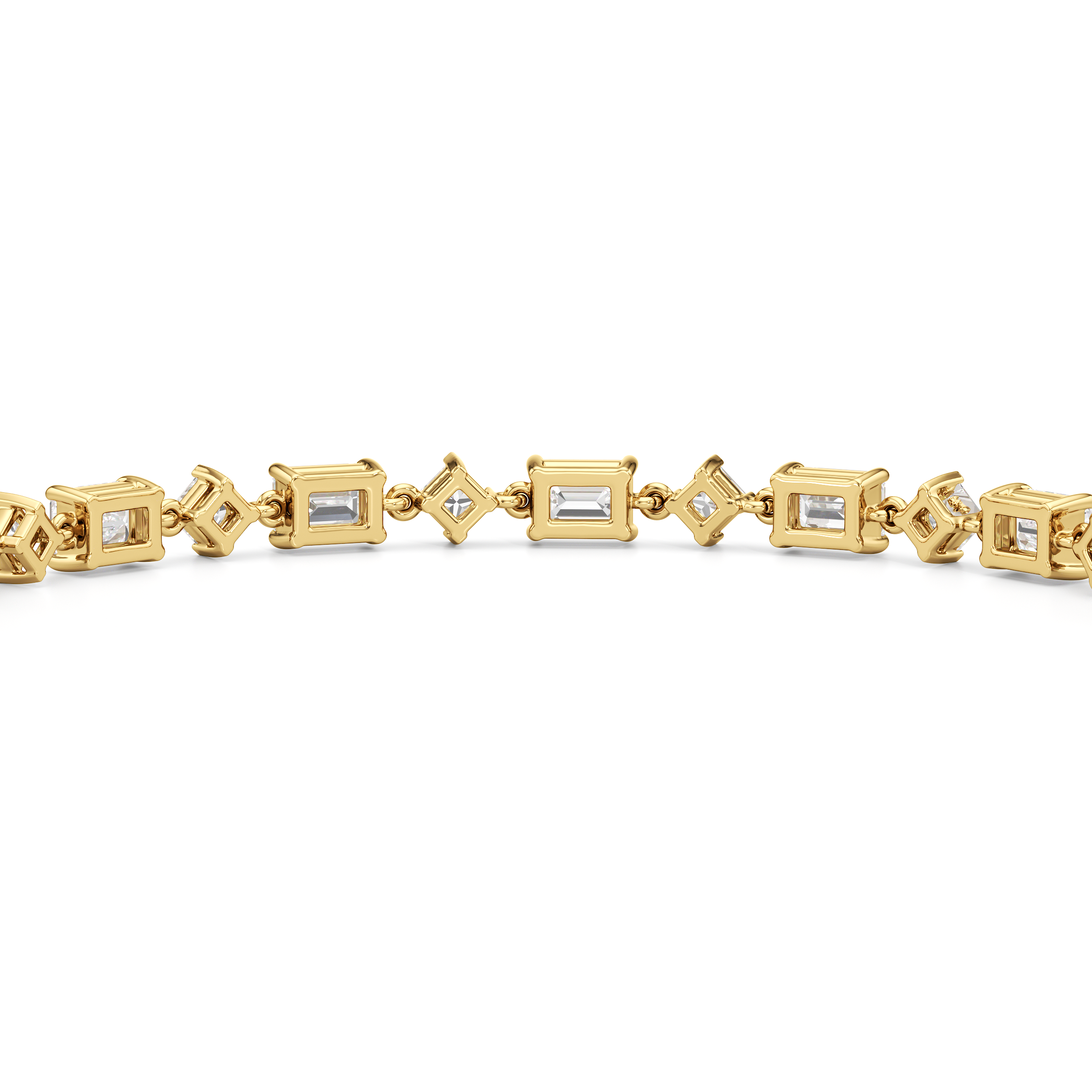 Emerald-cut and princess-cut diamonds dance in perfect unison, creating a symphony of regal refinement. This tennis bracelet features mindfully selected diamonds carefully set by hand on v-prong and claw-prong settings. The lines, angles, and facets of the step-cut diamonds put on show the dazzling hall-of-mirrors effect, showcasing flashes of light that will leave you mesmerized.