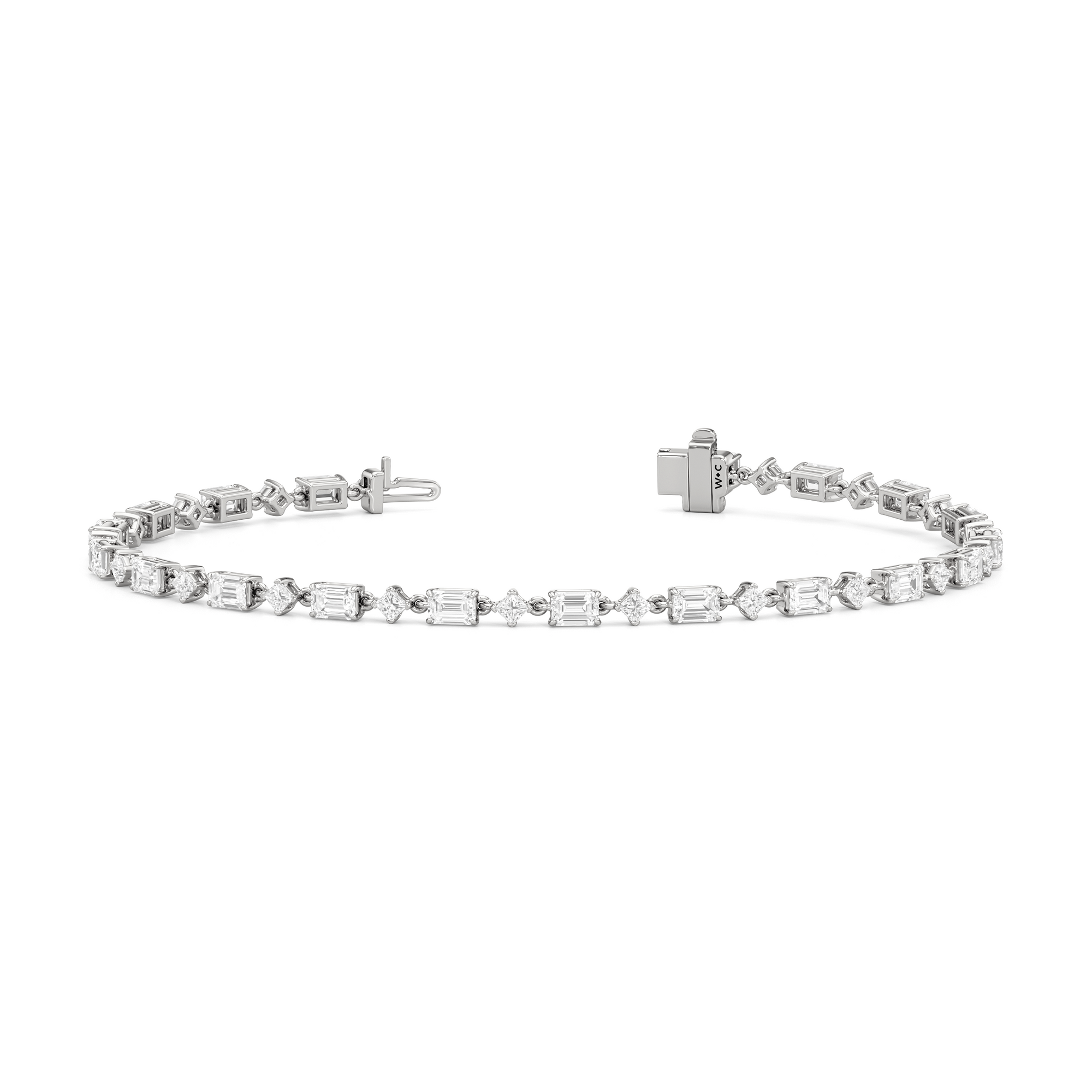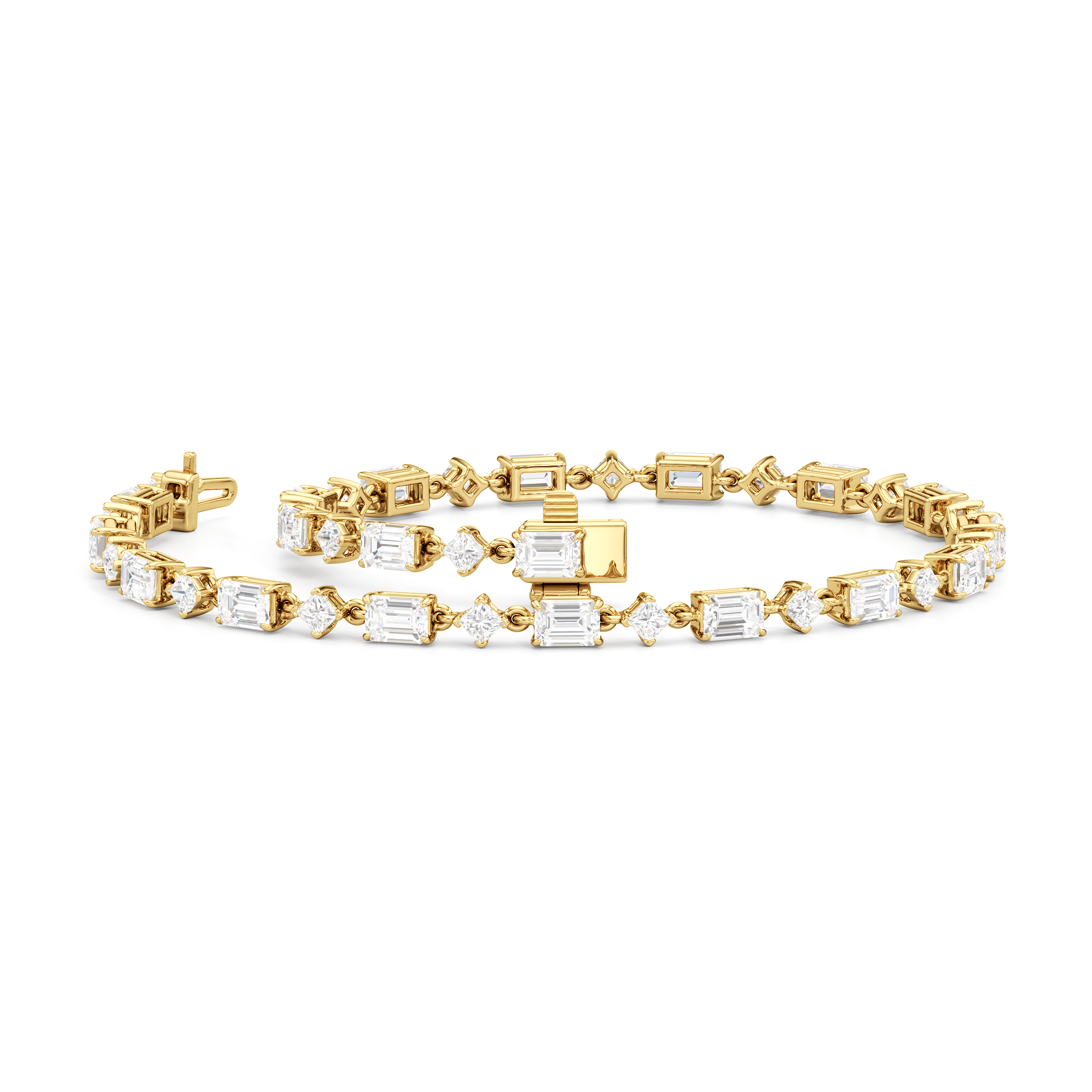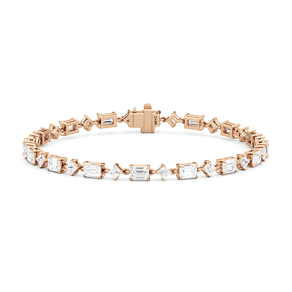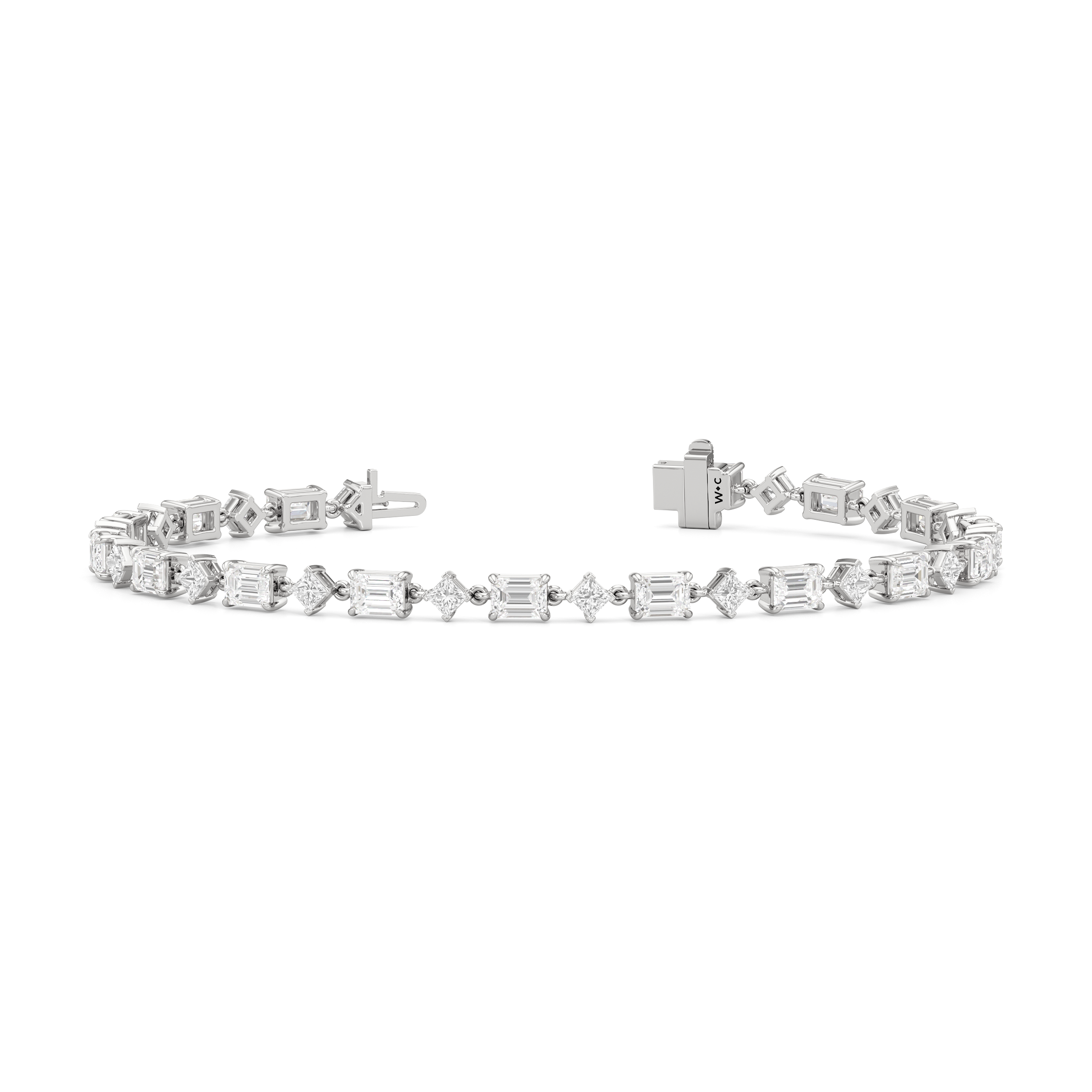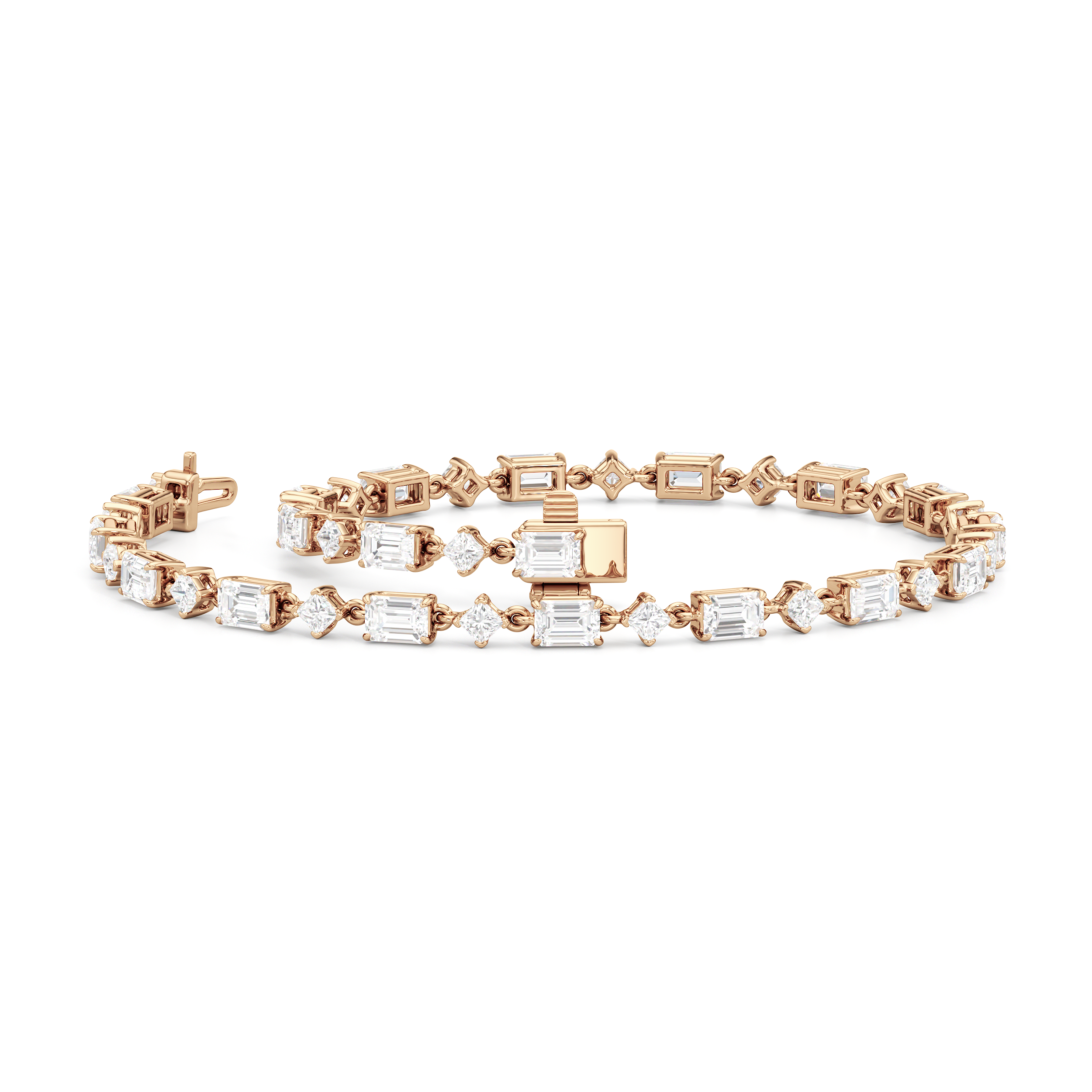 Emerald-cut and princess-cut diamonds dance in perfect unison, creating a symphony of regal refinement. This tennis bracelet features mindfully selected diamonds carefully set by hand on v-prong and claw-prong settings. The lines, angles, and facets of the step-cut diamonds put on show the dazzling hall-of-mirrors effect, showcasing flashes of light that will leave you mesmerized.