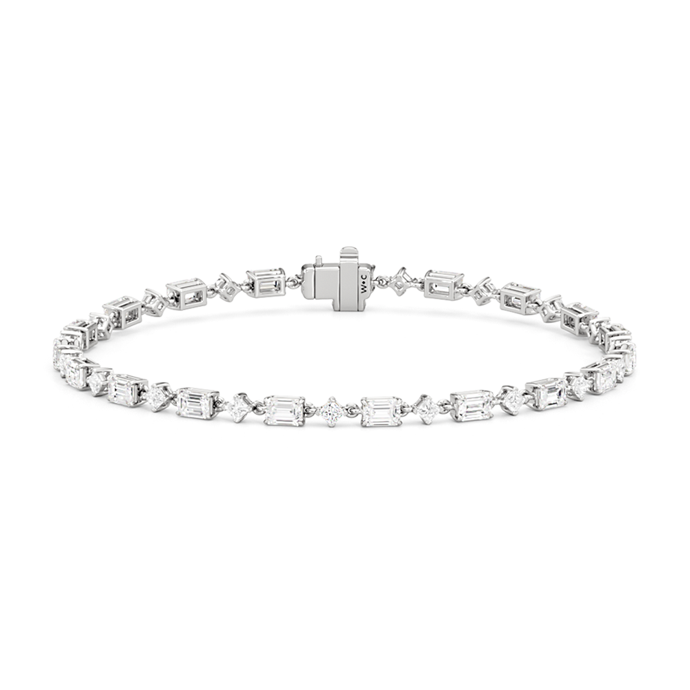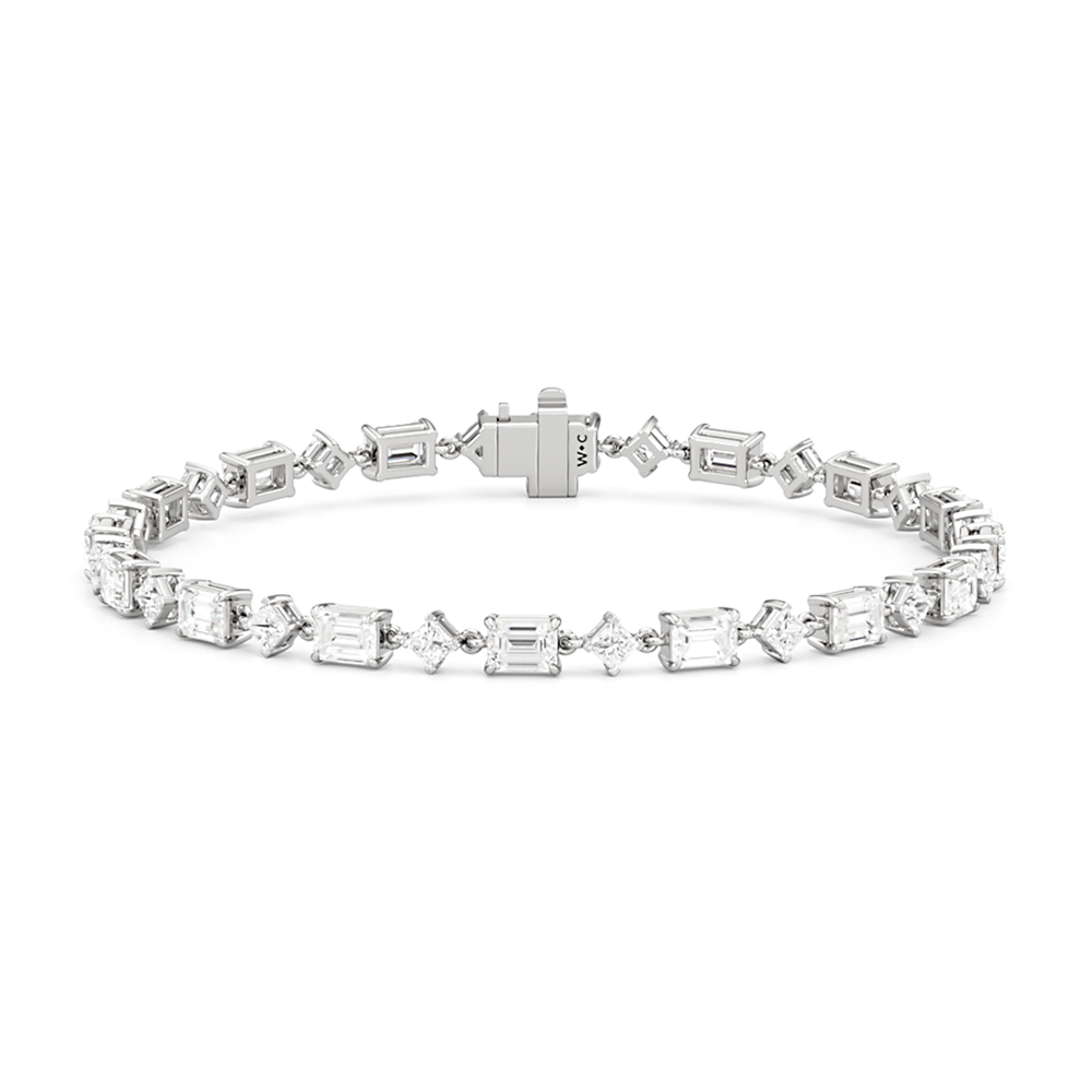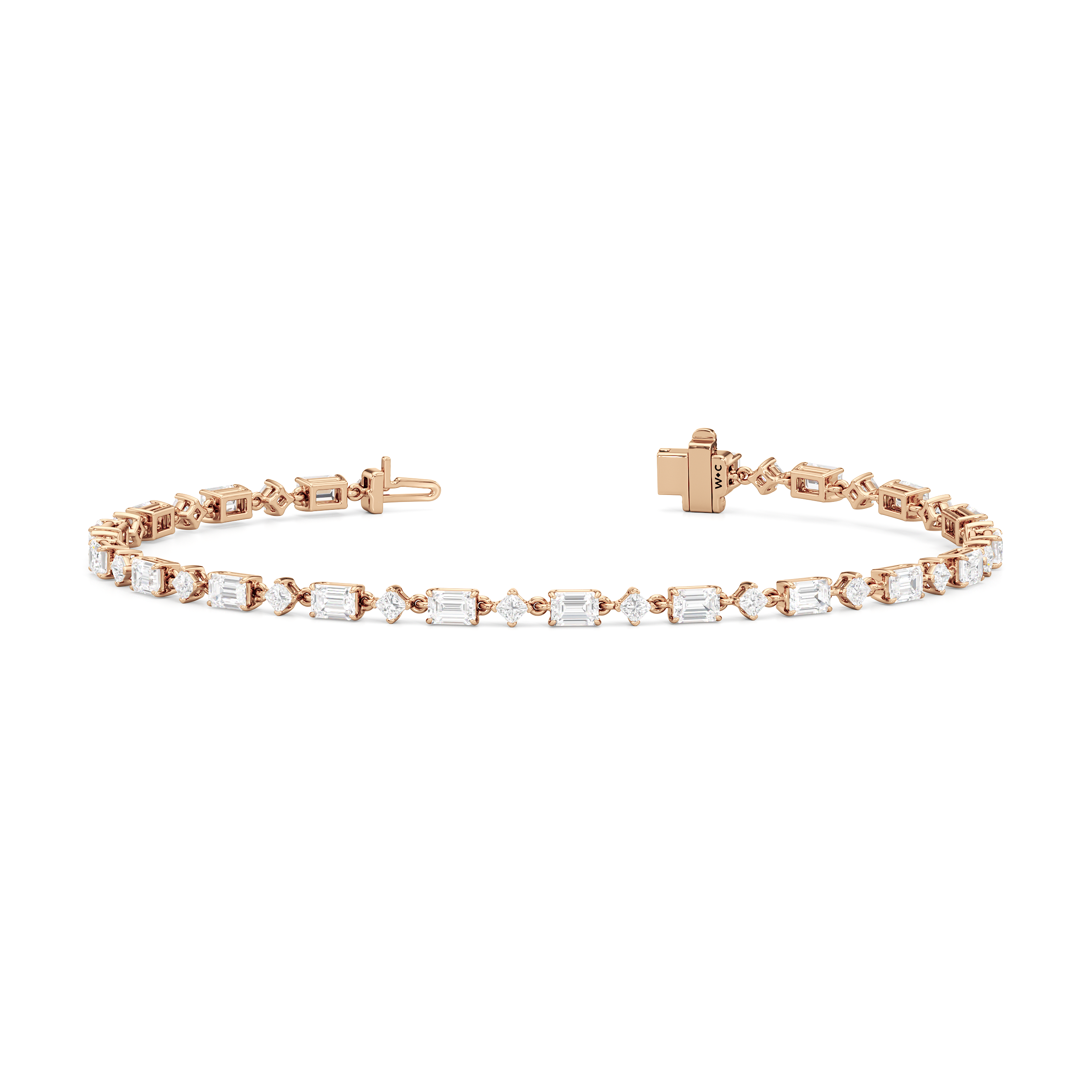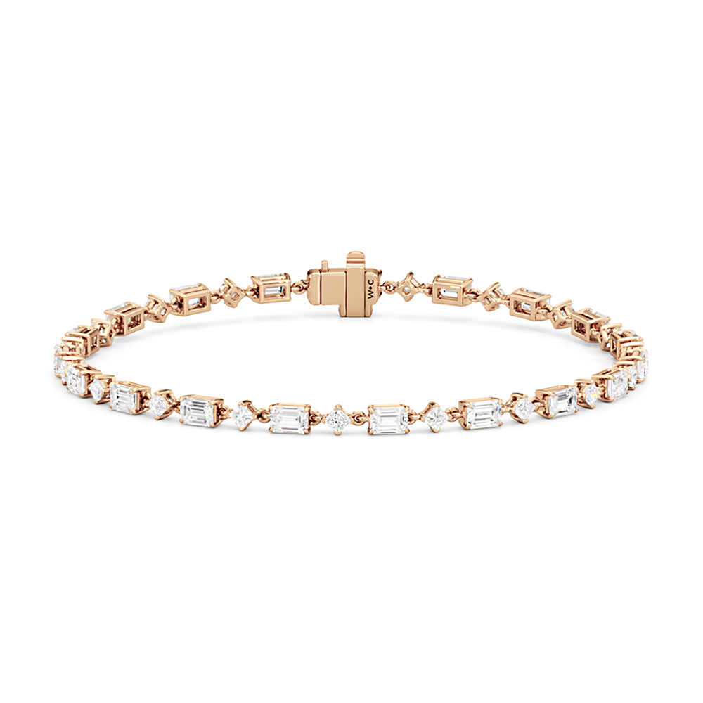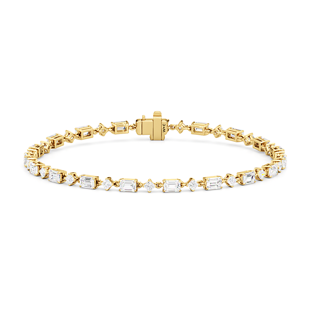 Emerald-cut and princess-cut diamonds dance in perfect unison, creating a symphony of regal refinement. This tennis bracelet features mindfully selected diamonds carefully set by hand on v-prong and claw-prong settings. The lines, angles, and facets of the step-cut diamonds put on show the dazzling hall-of-mirrors effect, showcasing flashes of light that will leave you mesmerized.