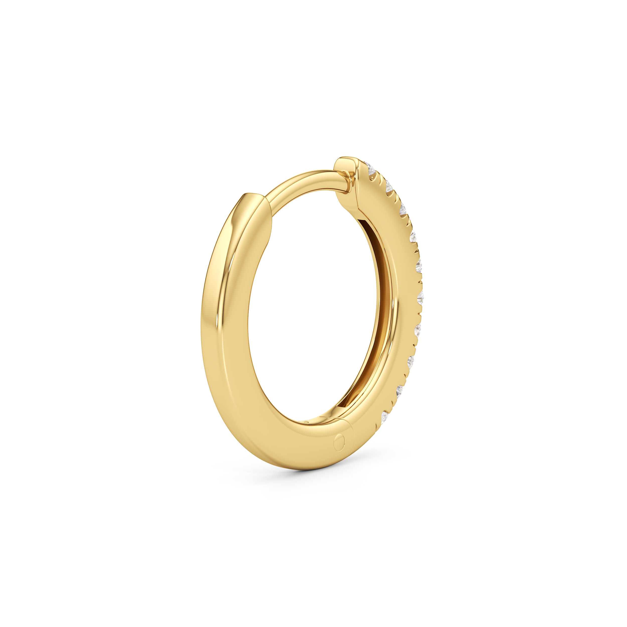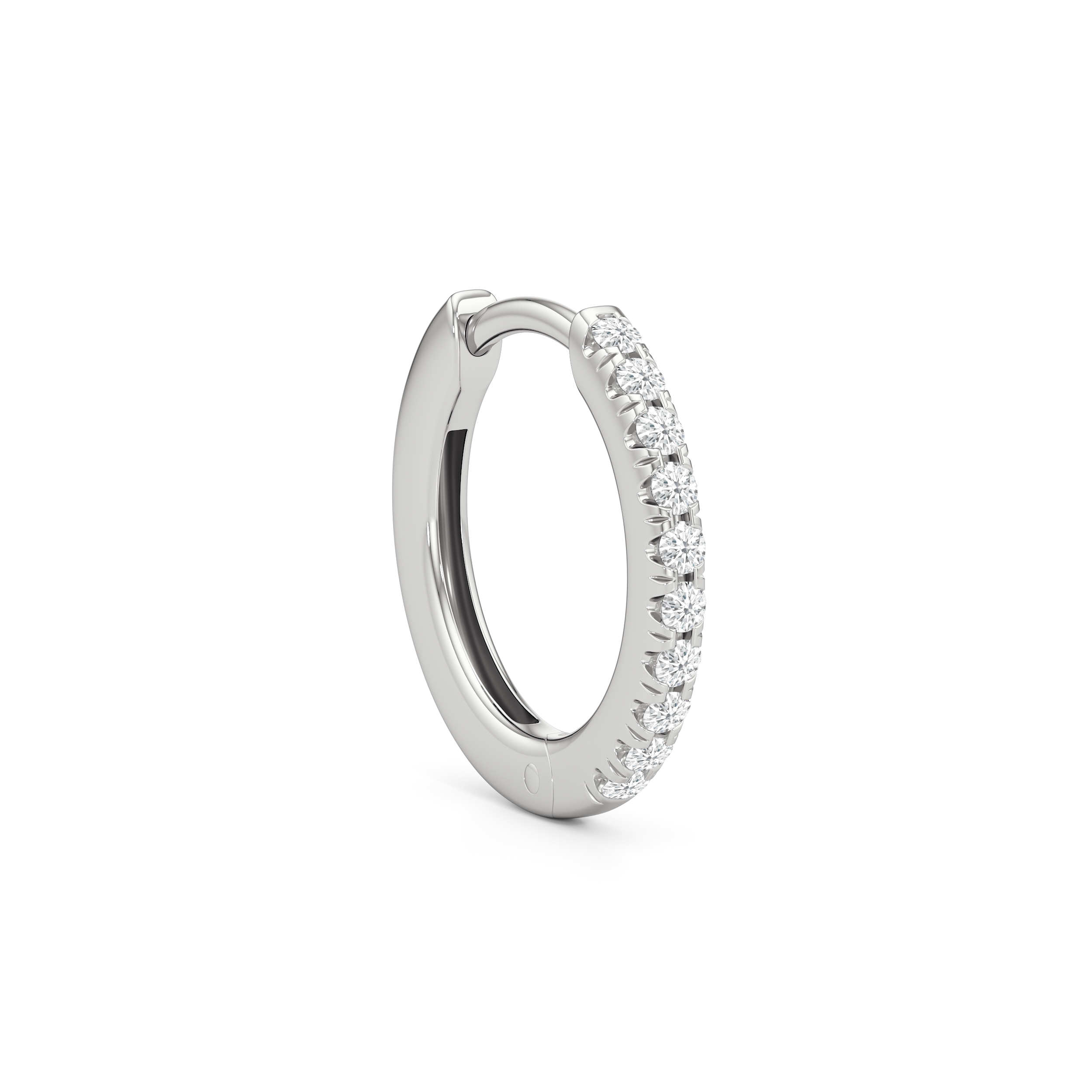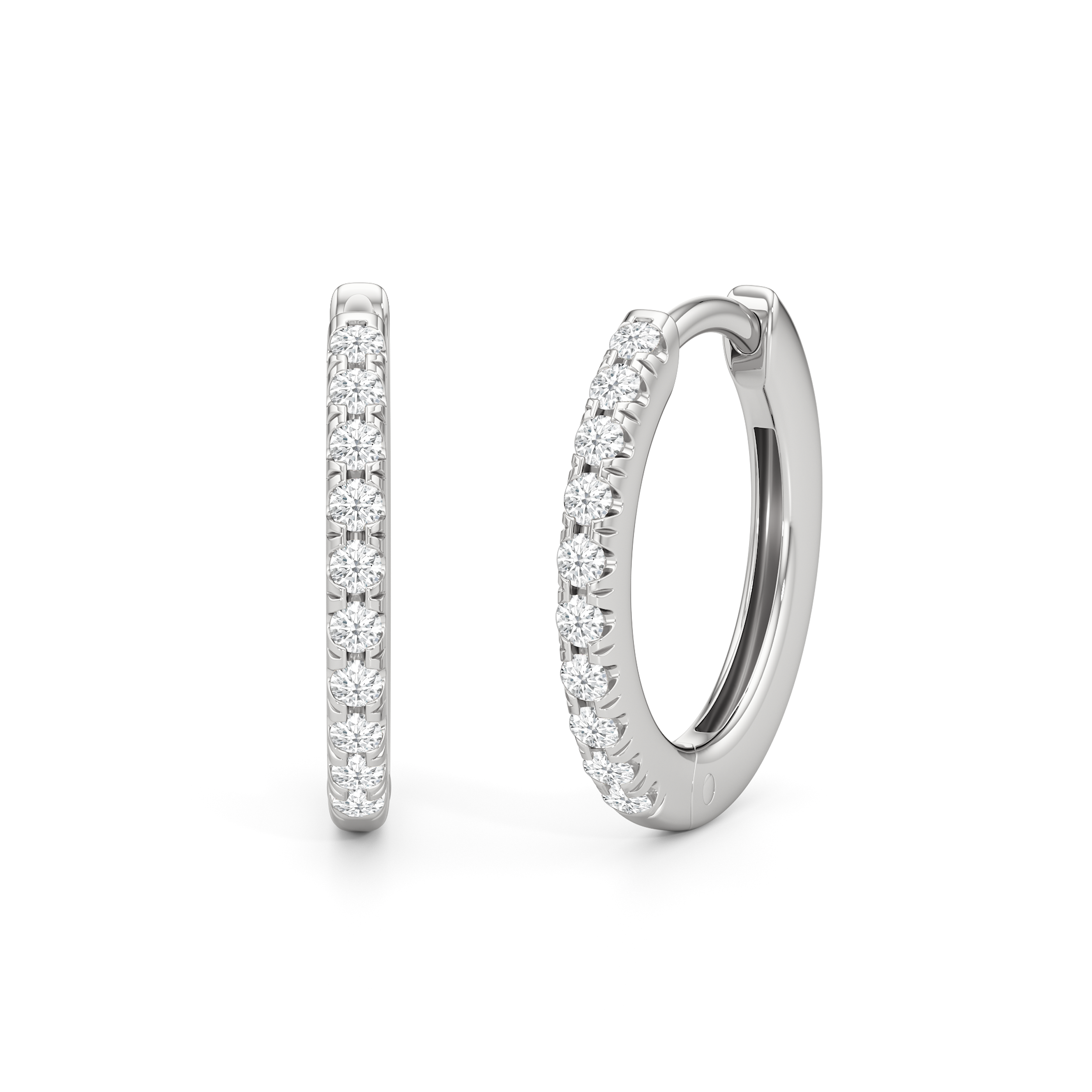 Sleek and subtly shaped, Anya is all about comfort that doesn’t compromise security and style. The huggie hoops have their front curved traced with round diamonds on U-cut prongs. A pair that’s easy on your ears and ready for wherever your day takes you.