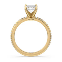 18 round accent diamonds are pave set within this ring for a sparkling yet minimalistic look. The band showcases the sparkle of the center diamond and the accent diamonds while minimizing the appearance of the metal.