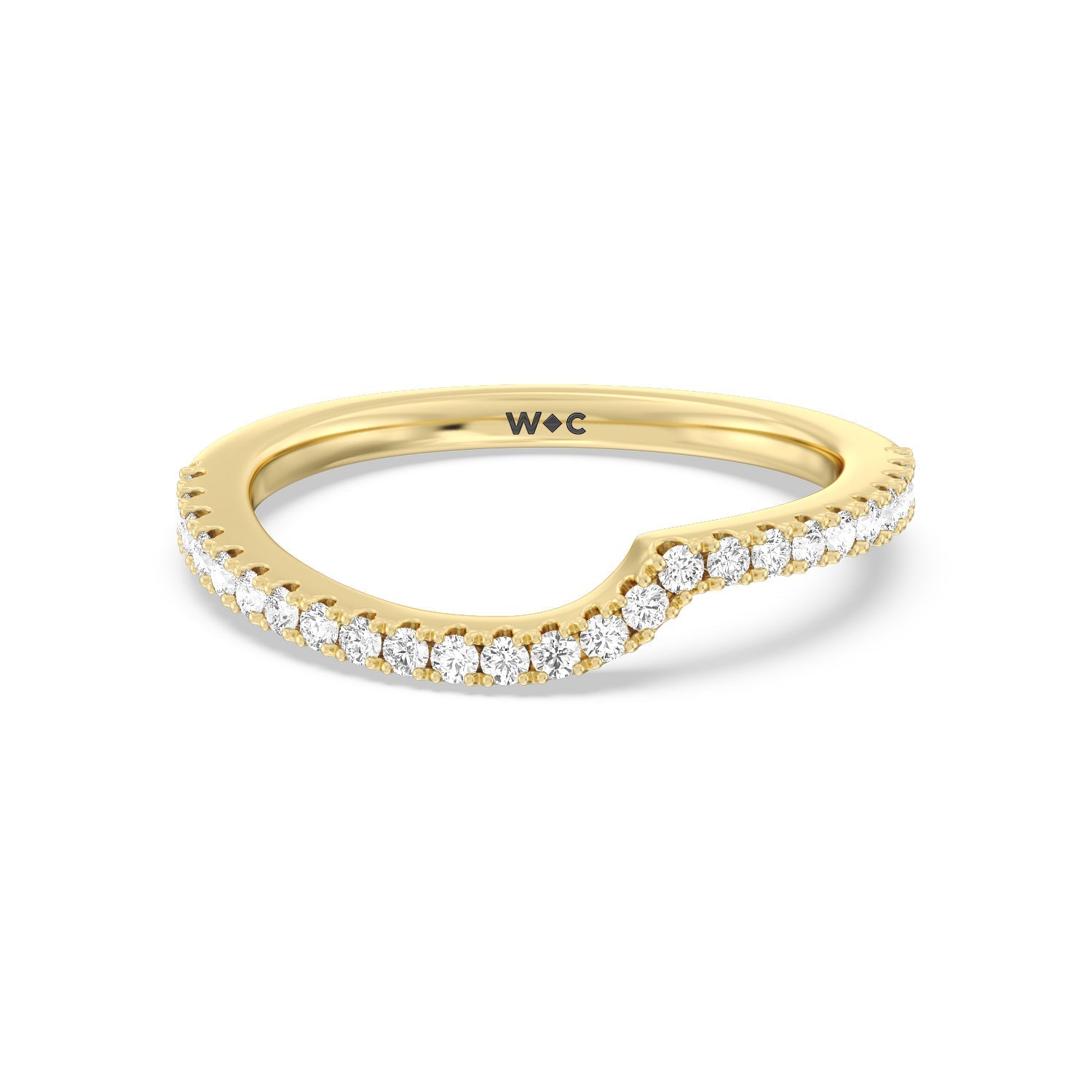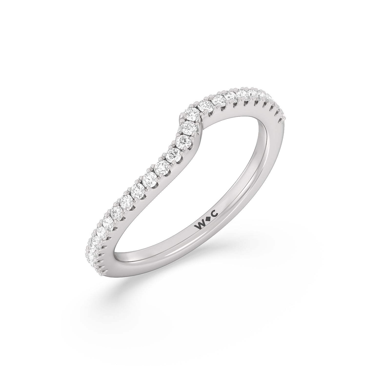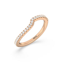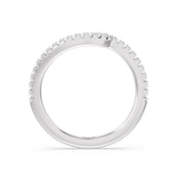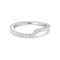 This curved diamond set wedding band is perfectly contoured to complement our ascending gallery studded hidden halo diamond wedding band for a simple and sophisticated look.