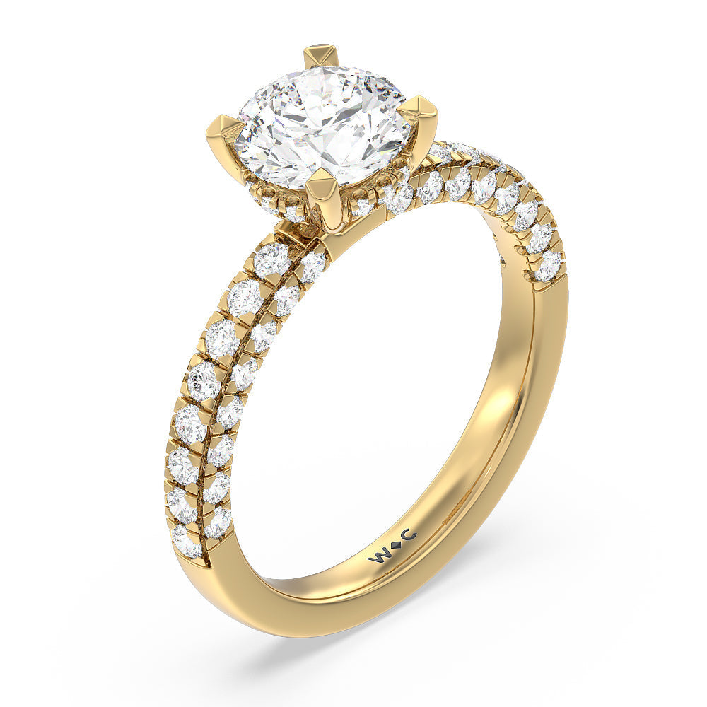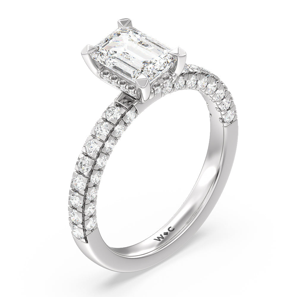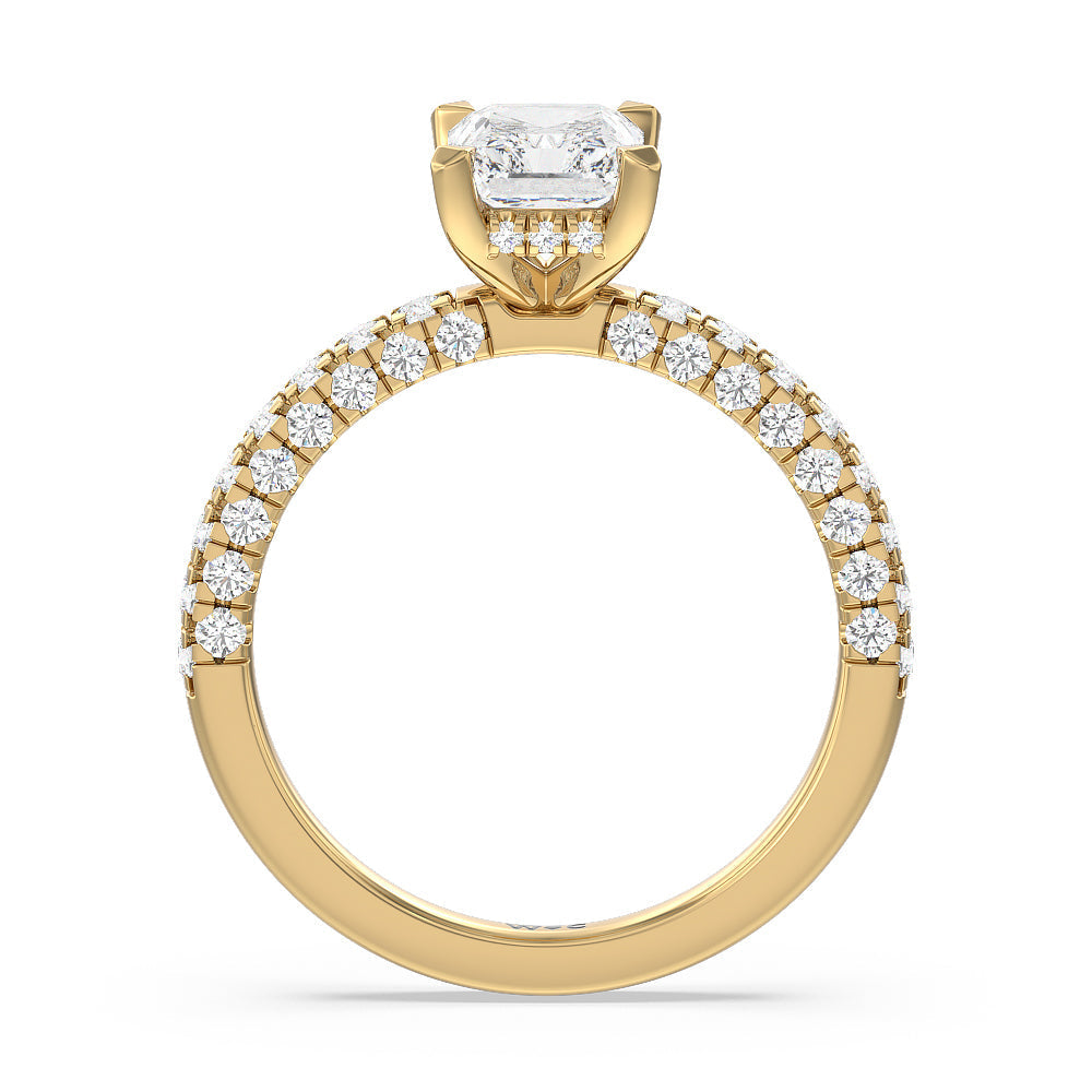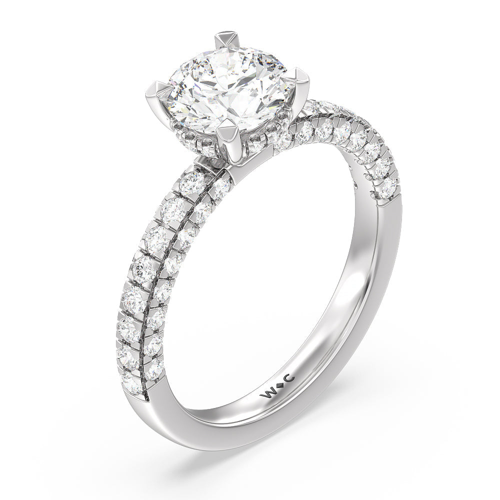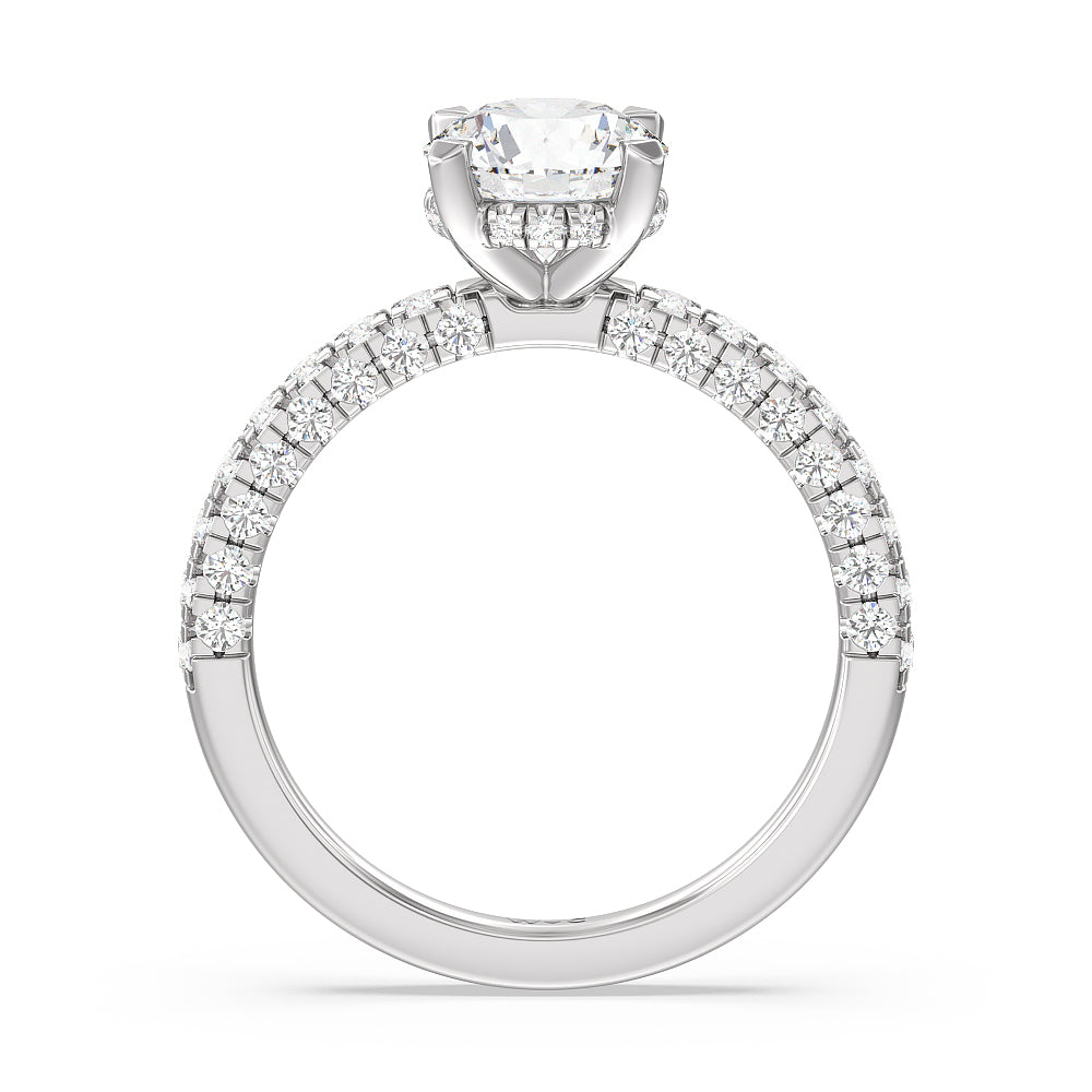 Make a statement with the under-the-radar elegance of this hidden halo diamond ring. This classy piece has its gorgeous center stone encircled from the side by a discreet band of diamonds. The ring brilliantly sparkles whether viewed on top, from the side, or at any angle.
