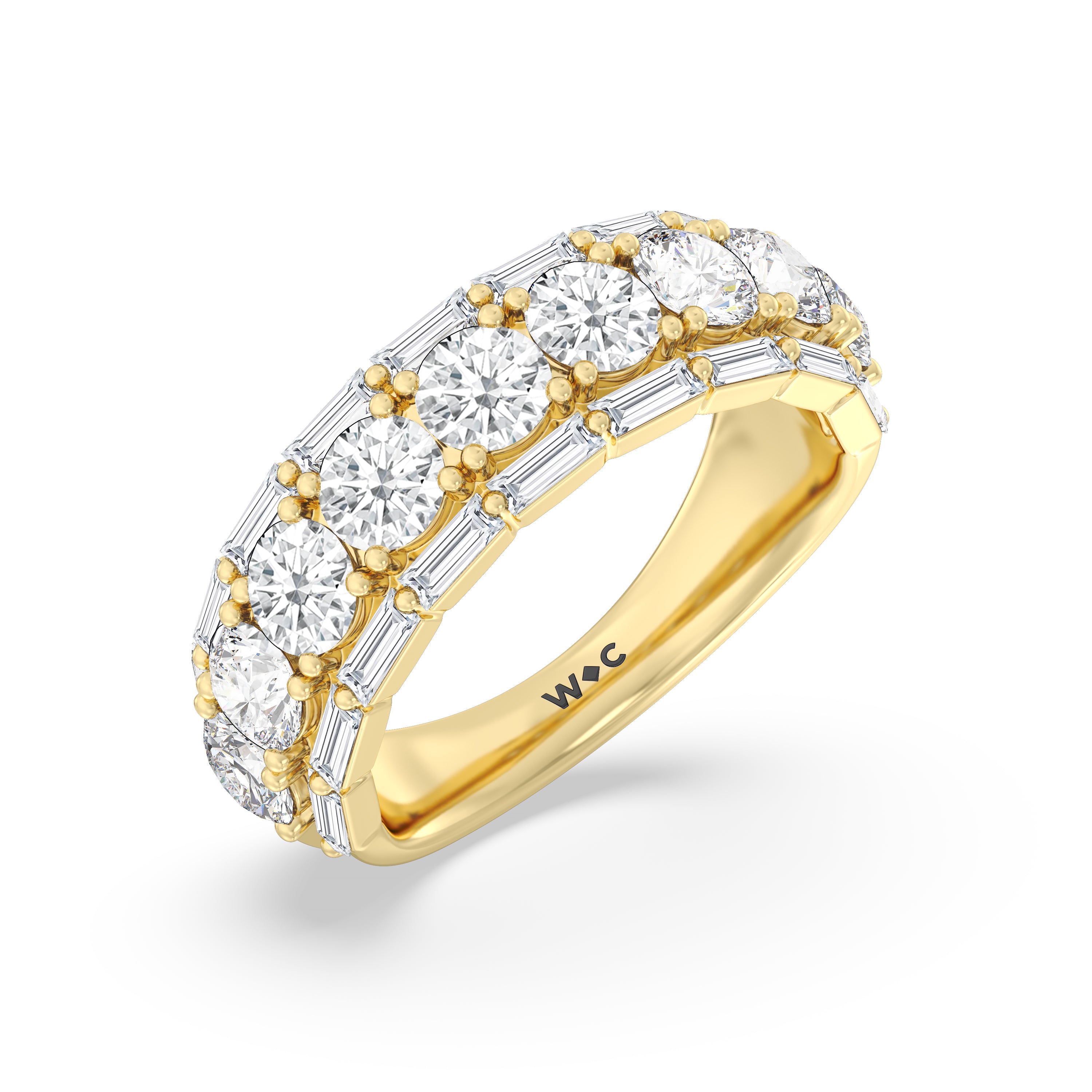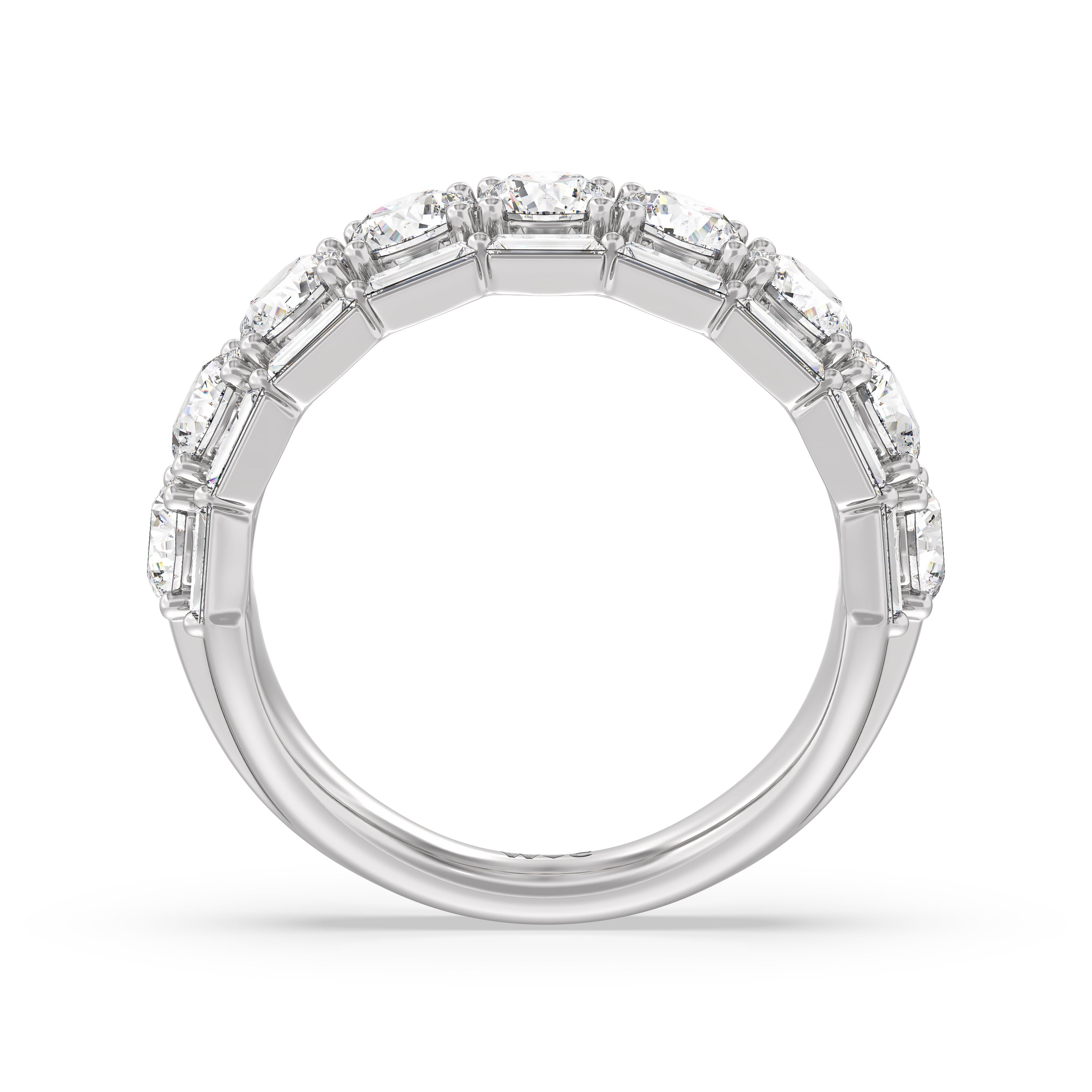 A classic half-eternity ring with a deep and diverse brilliance. This anniversary ring features a central arch of round diamonds sandwiched between two rows of baguette-cut diamonds. The edges of the shank are slightly ridged to follow the silhouette of the step-cut gems.
