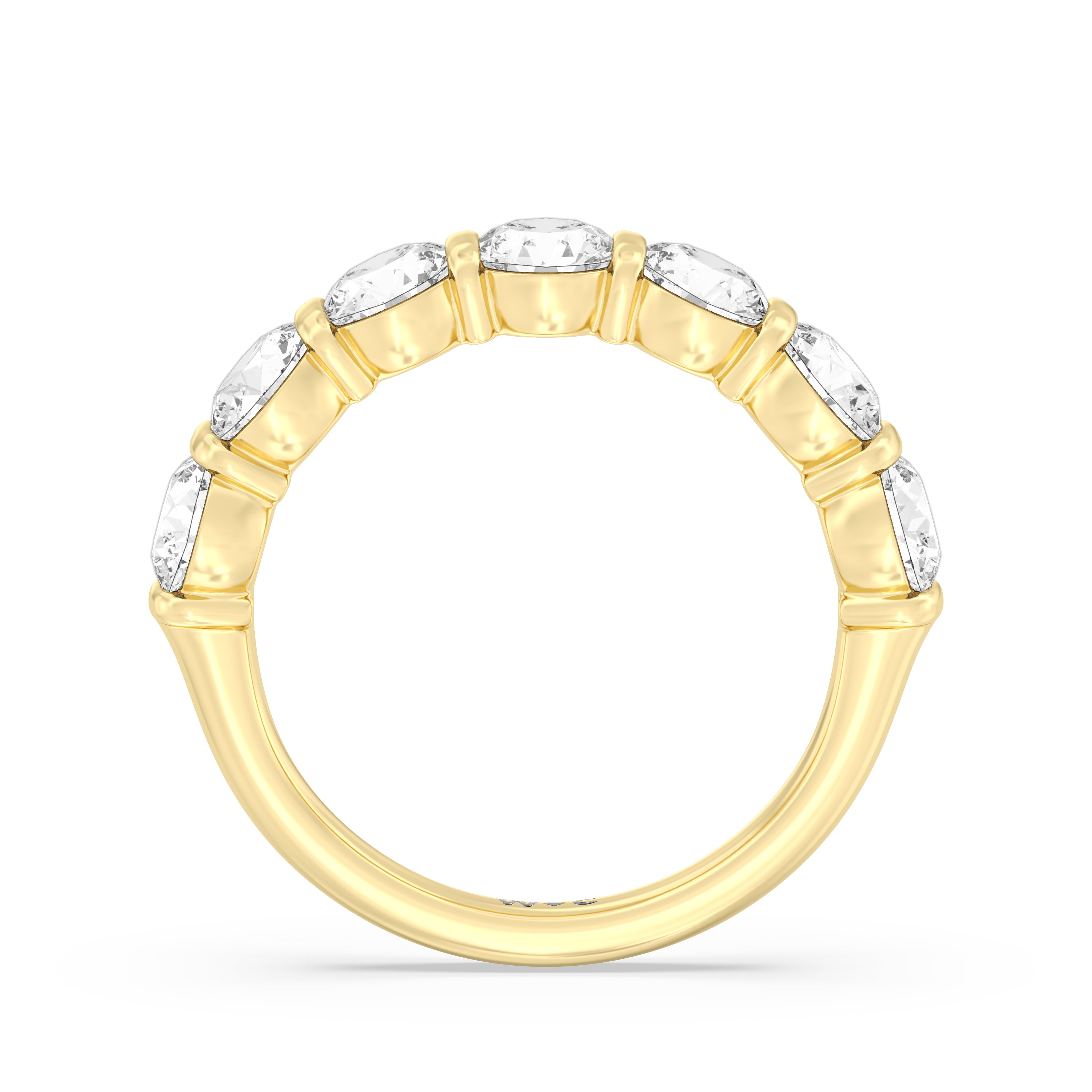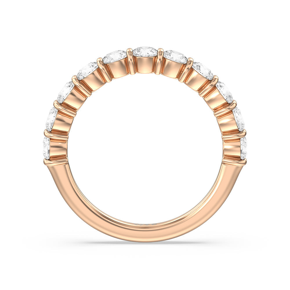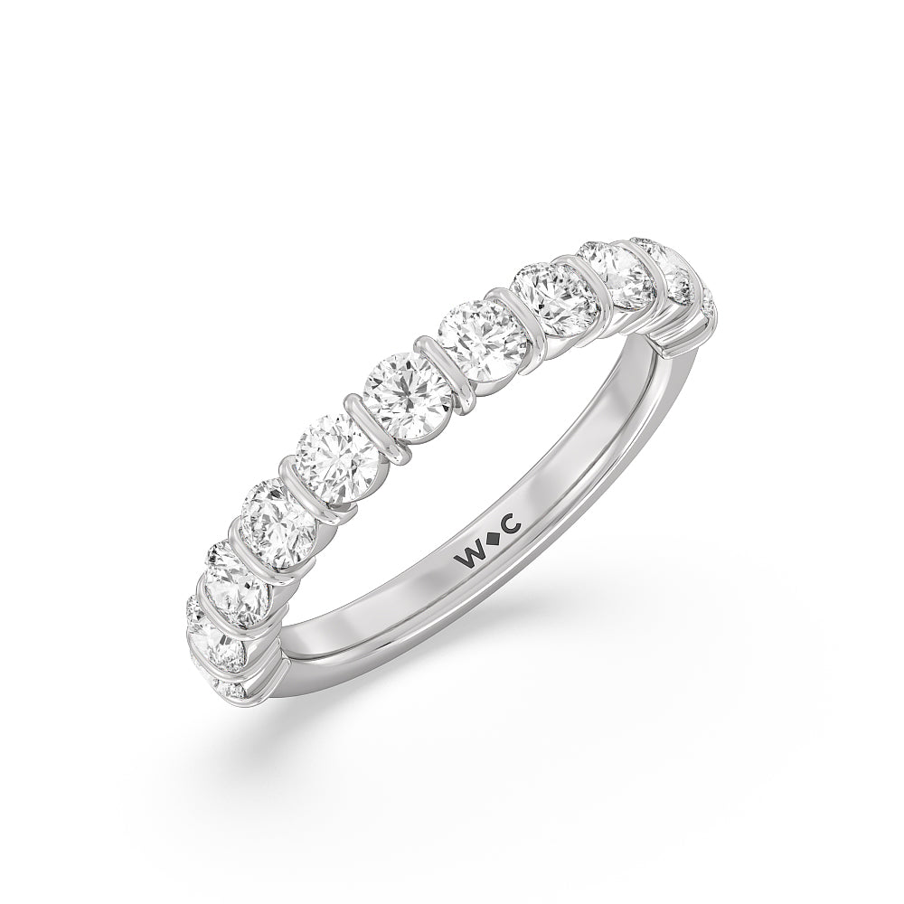 A sophisticated diamond ring designed to look polished and structured yet feminine and chic This anniversary ring features a total of eleven round diamonds, nine of which are of the same size tracing half of the band. Two slightly smaller diamonds punctuate each end of the glittering diamond arch.