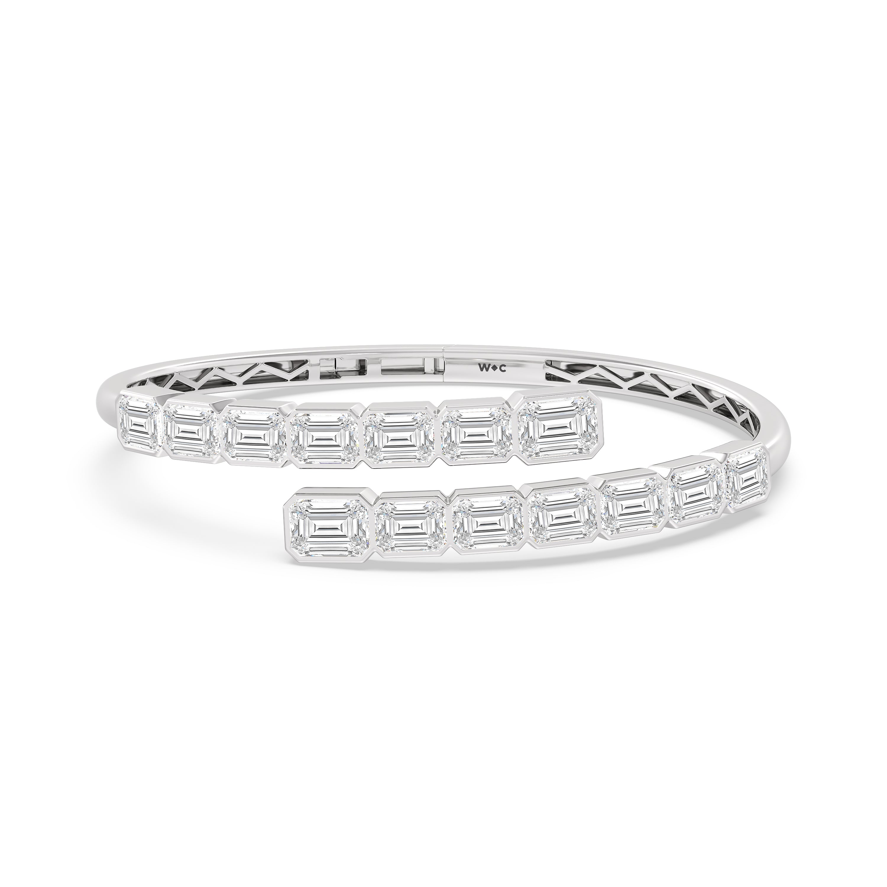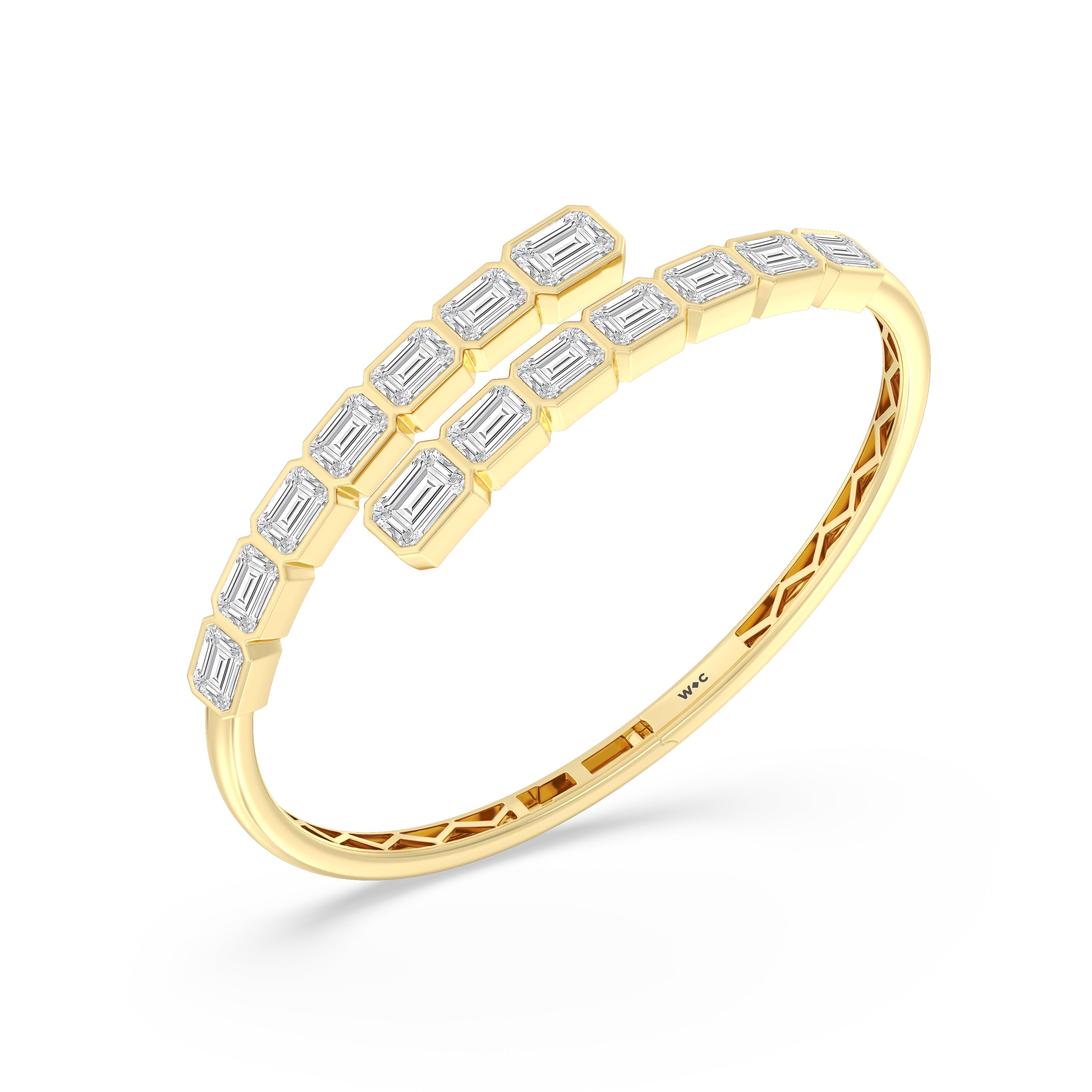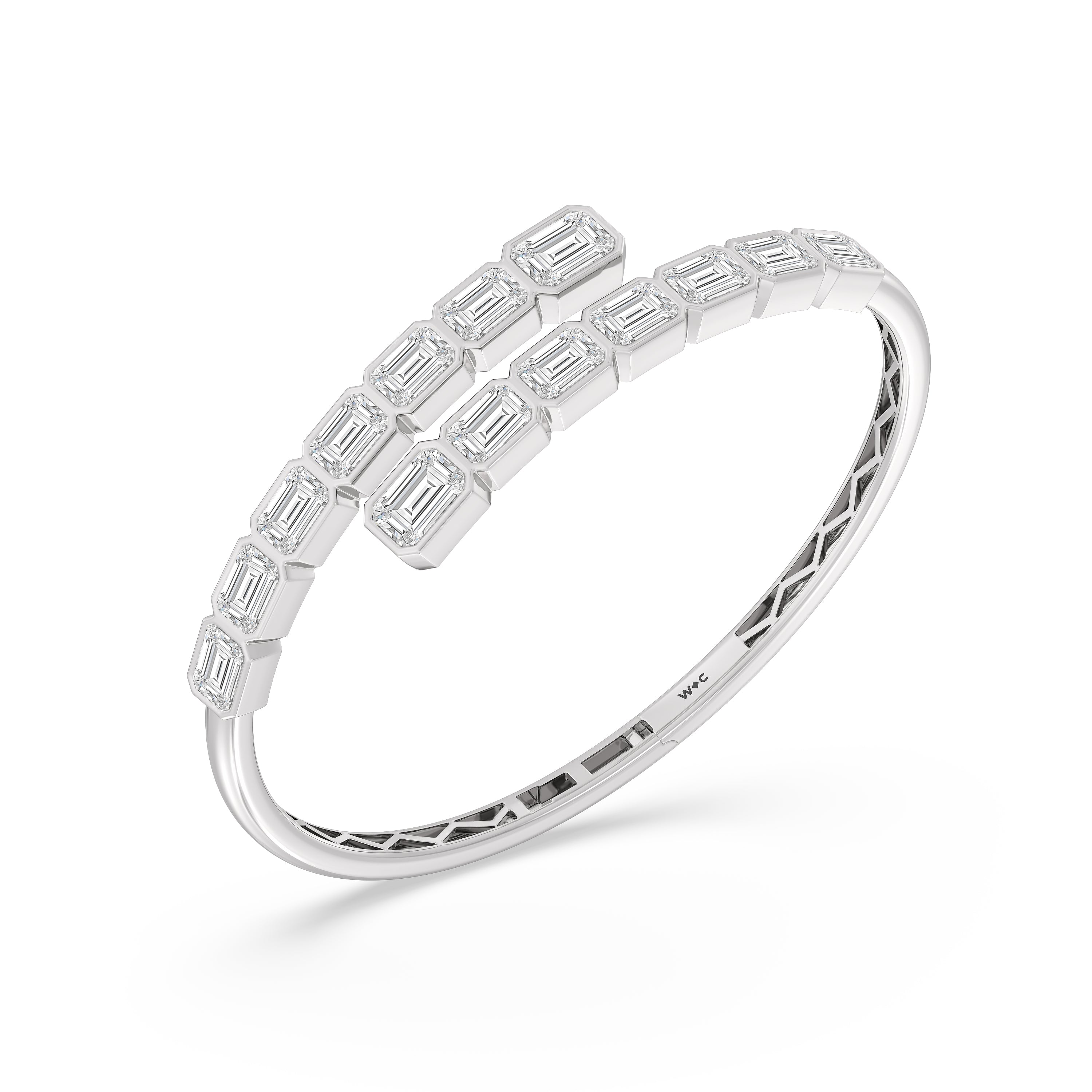 A beautiful add-on to literally any high-fashion outfit. This diamond bangle bracelet mixes and matches well with different fashion styles. It features a bypass design with bezel-set emerald-cut diamonds that offer a subtle yet still striking sparkle.
