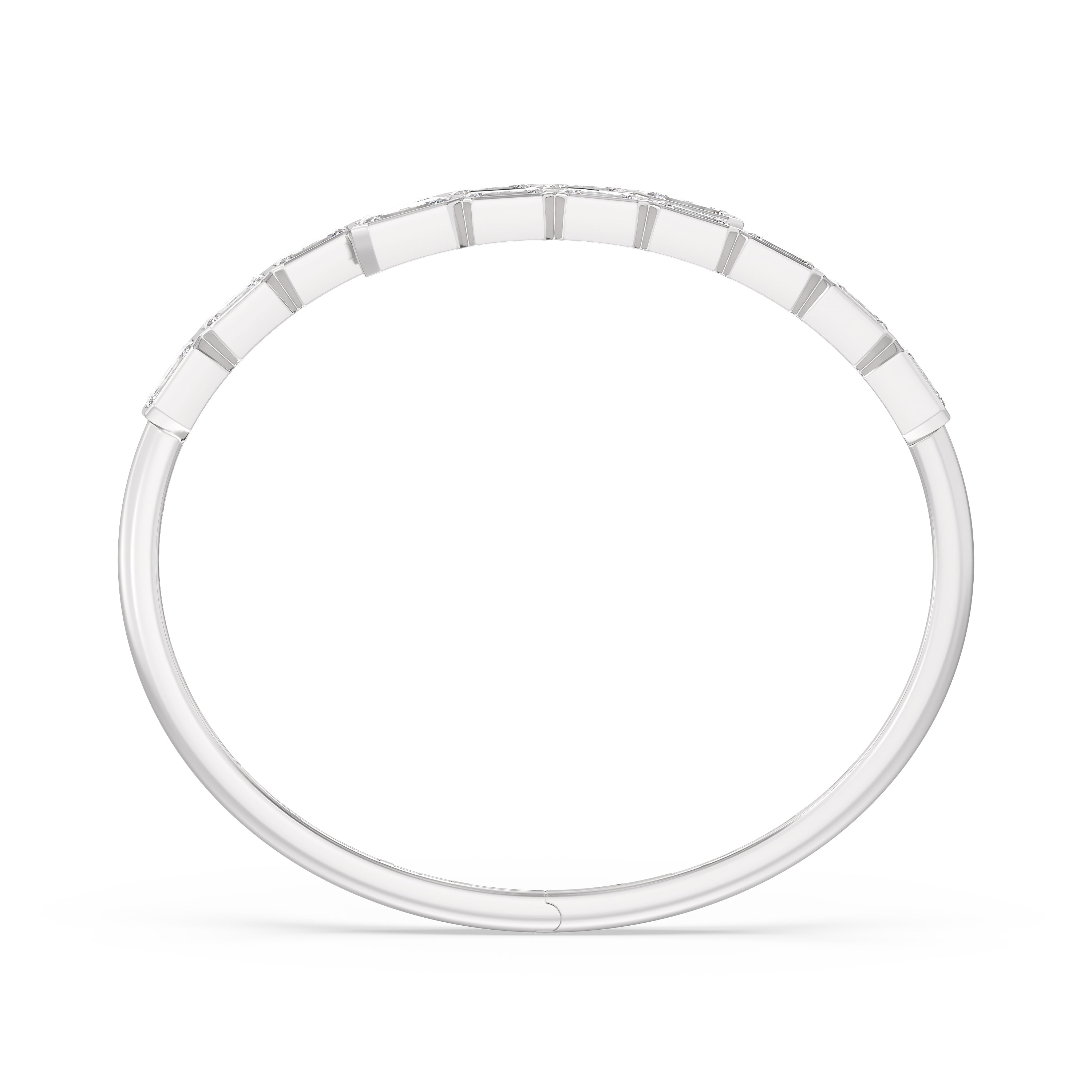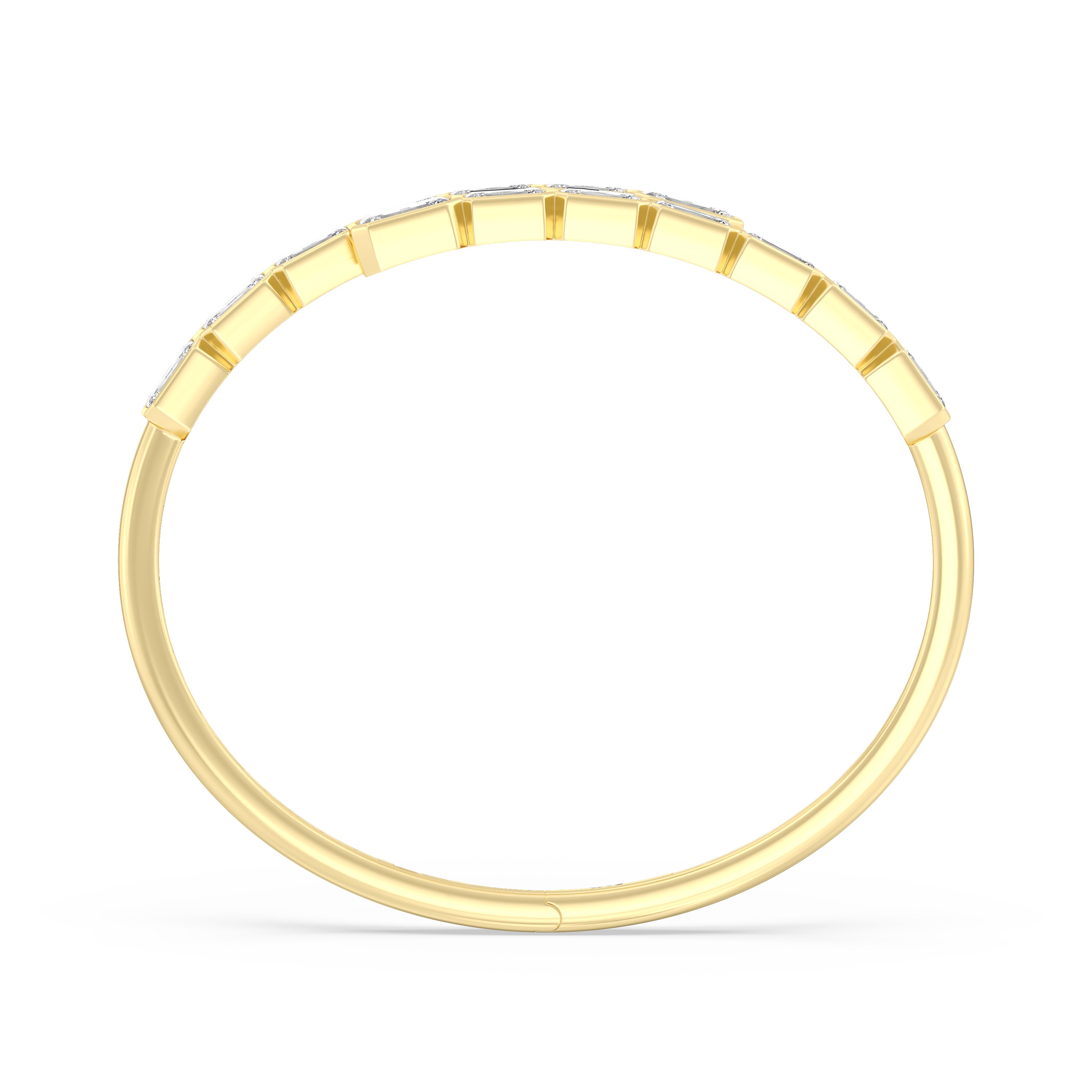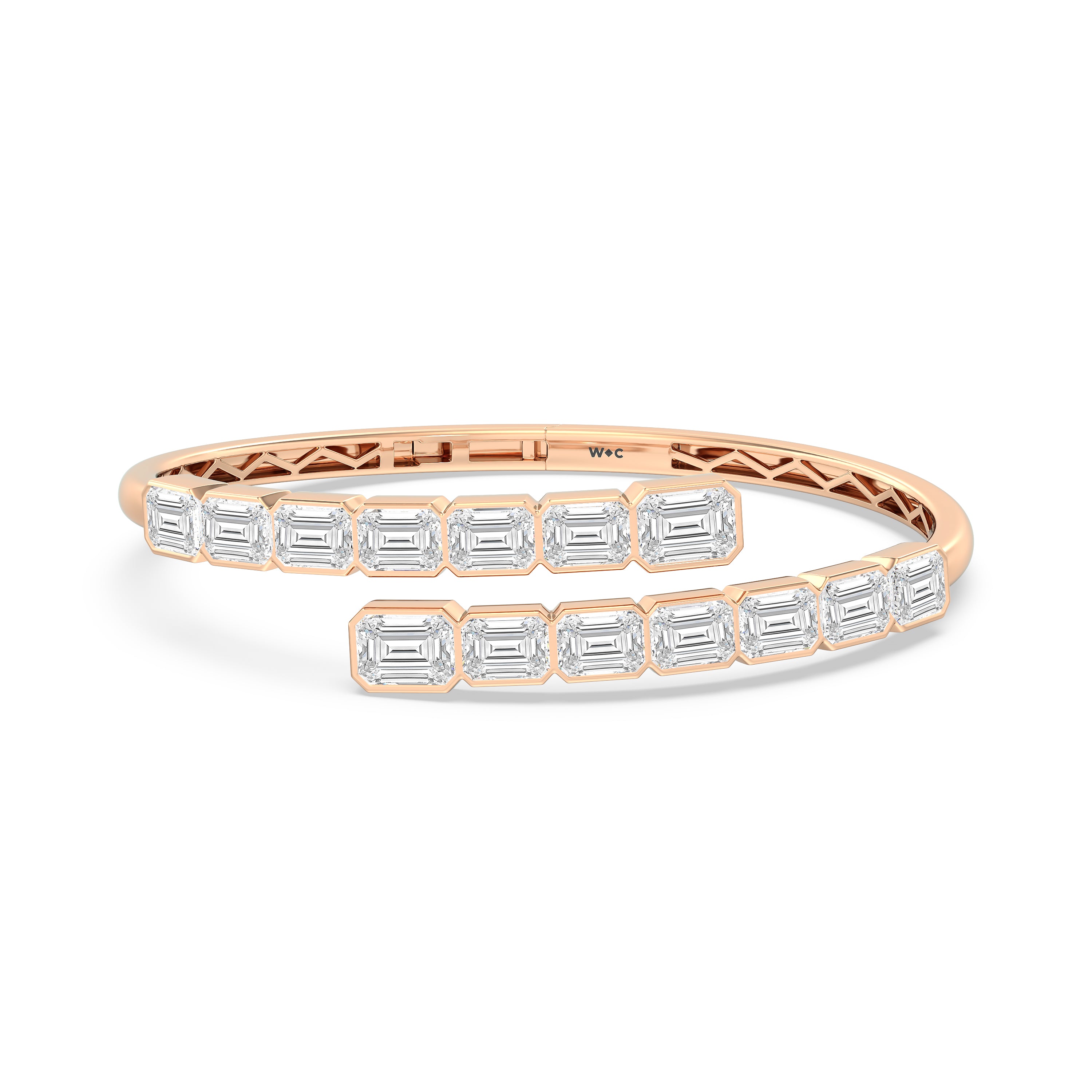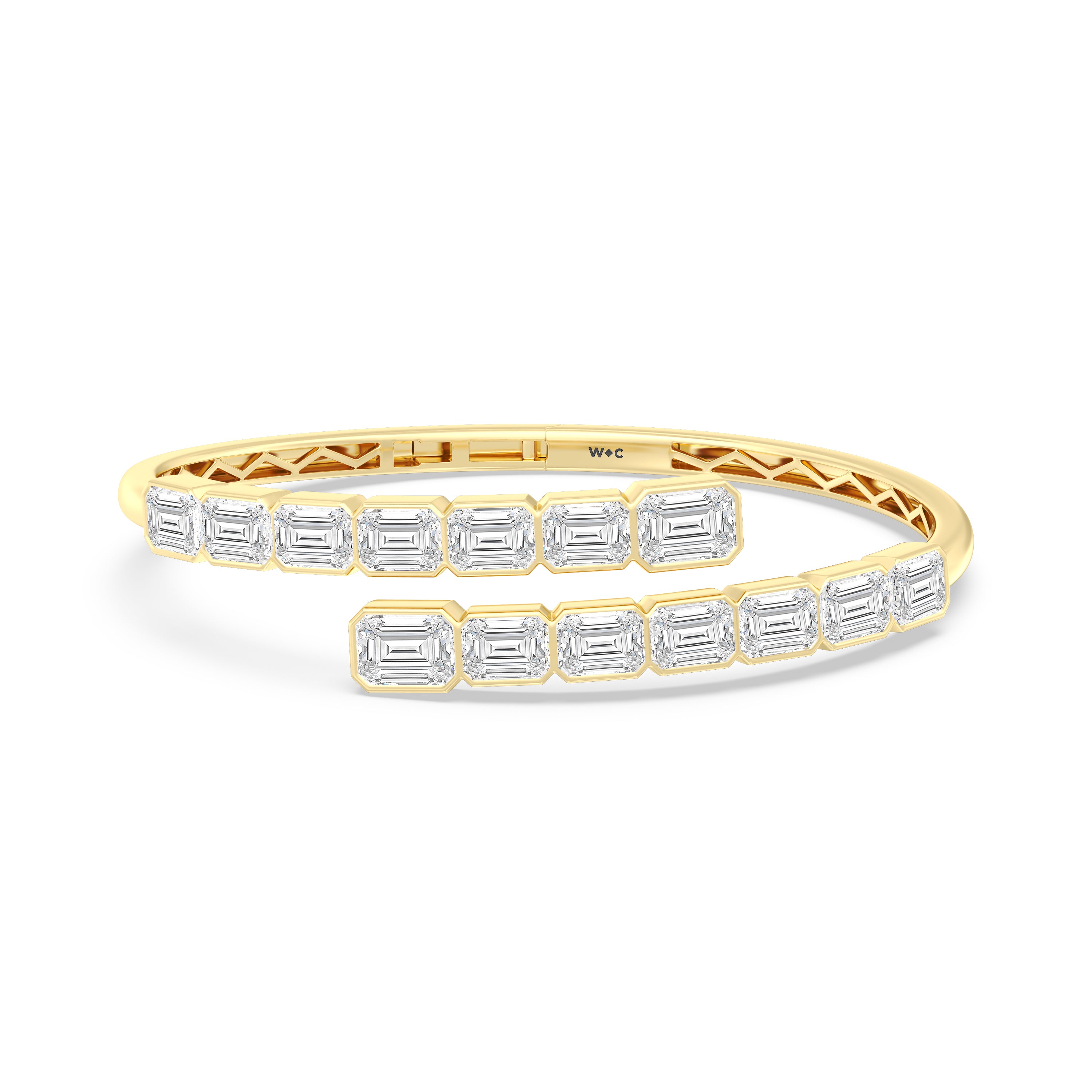 A beautiful add-on to literally any high-fashion outfit. This diamond bangle bracelet mixes and matches well with different fashion styles. It features a bypass design with bezel-set emerald-cut diamonds that offer a subtle yet still striking sparkle.