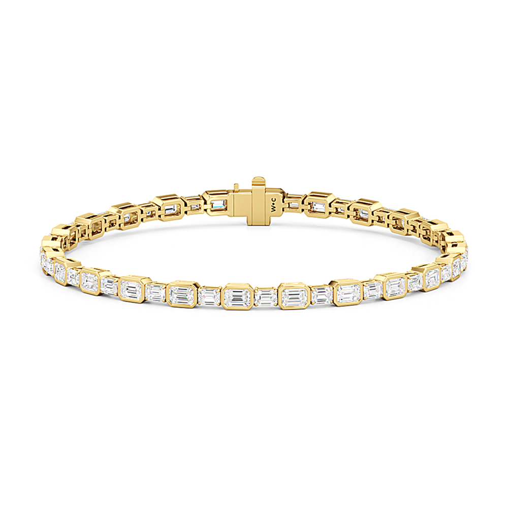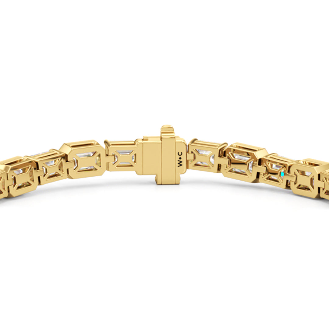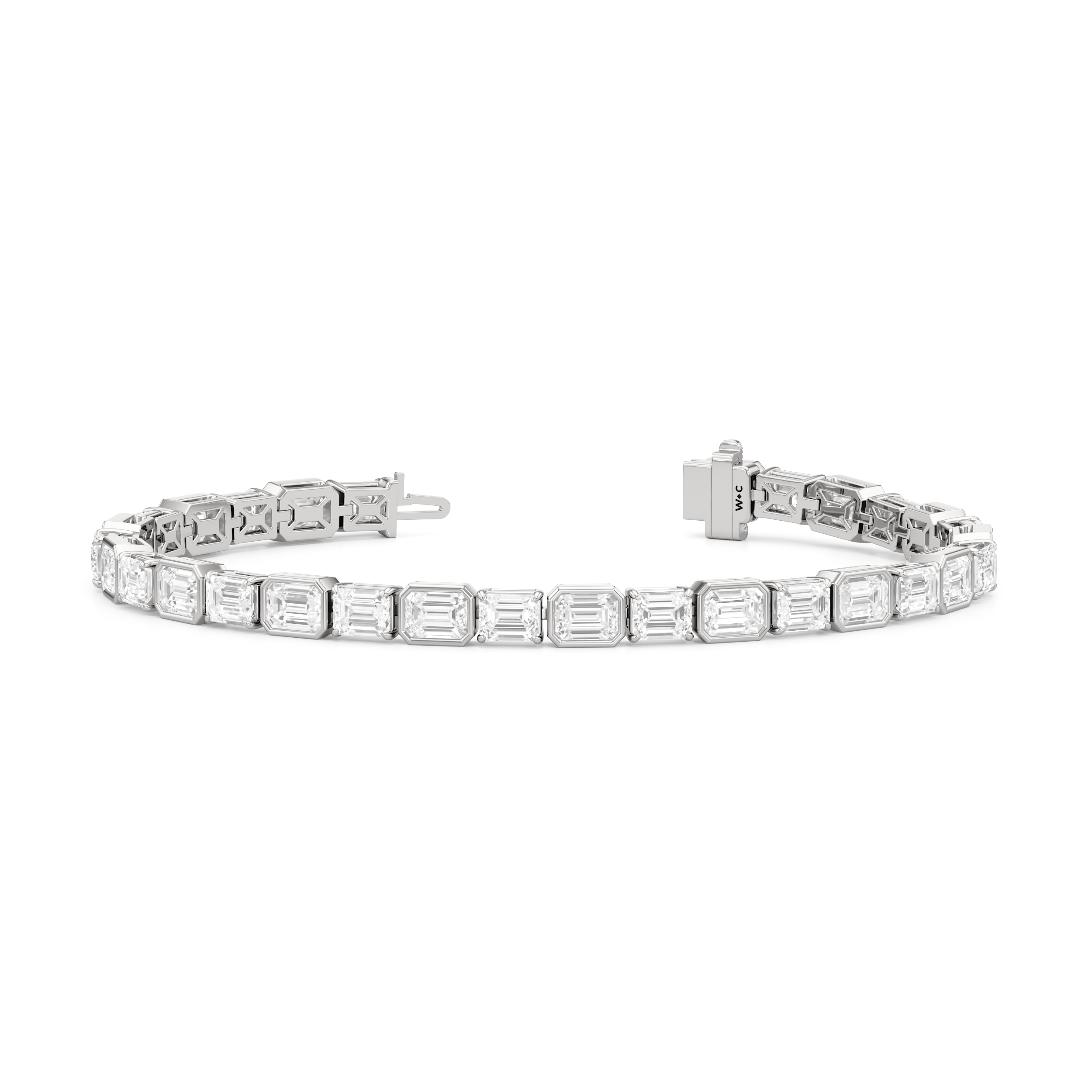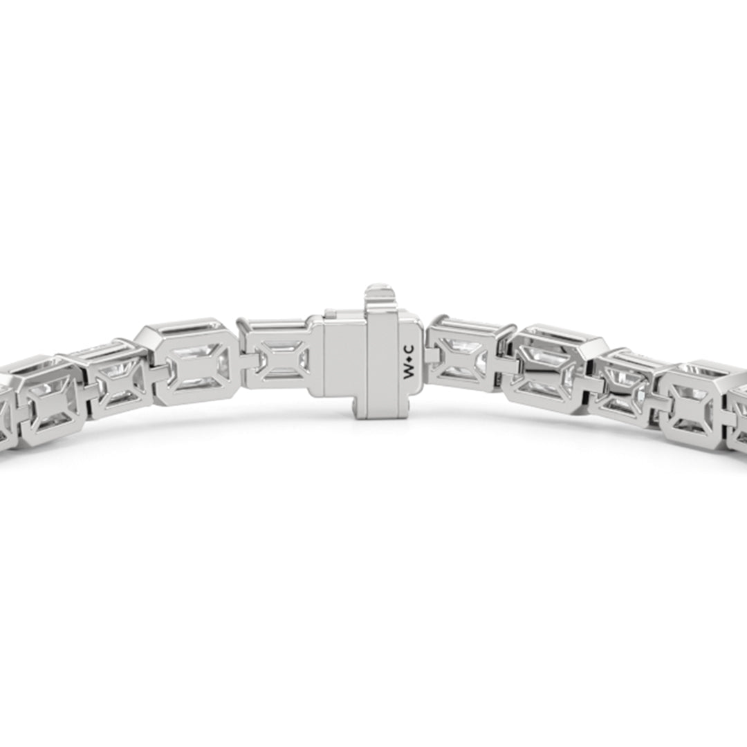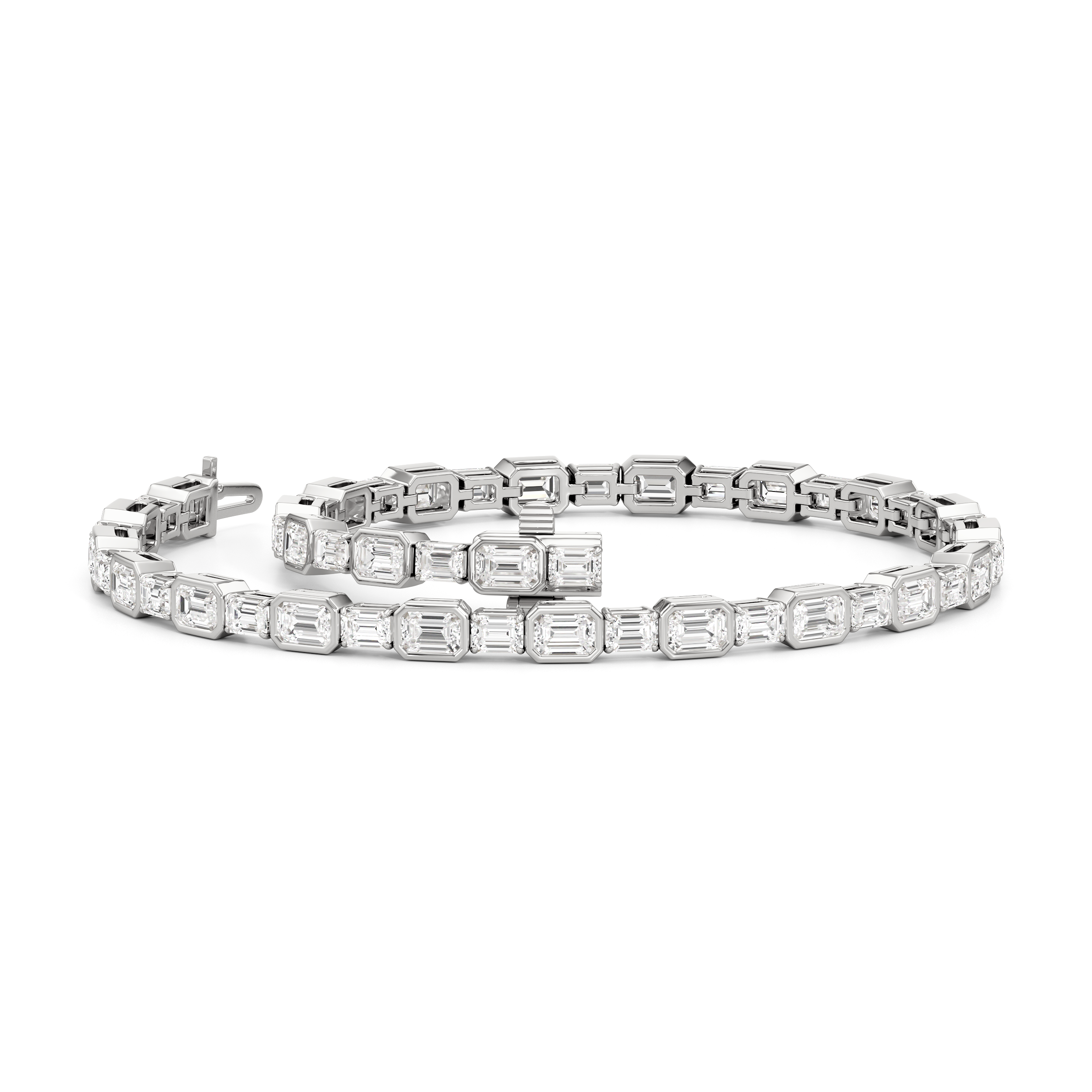 See this diamond tennis bracelet sit boldly on your wrist. It features a continuous line of emerald-cut diamonds alternately set in claw prongs and bezel settings. With its series of emerald-cut diamonds that command attention, this diamond bracelet is undeniably a covetable piece.