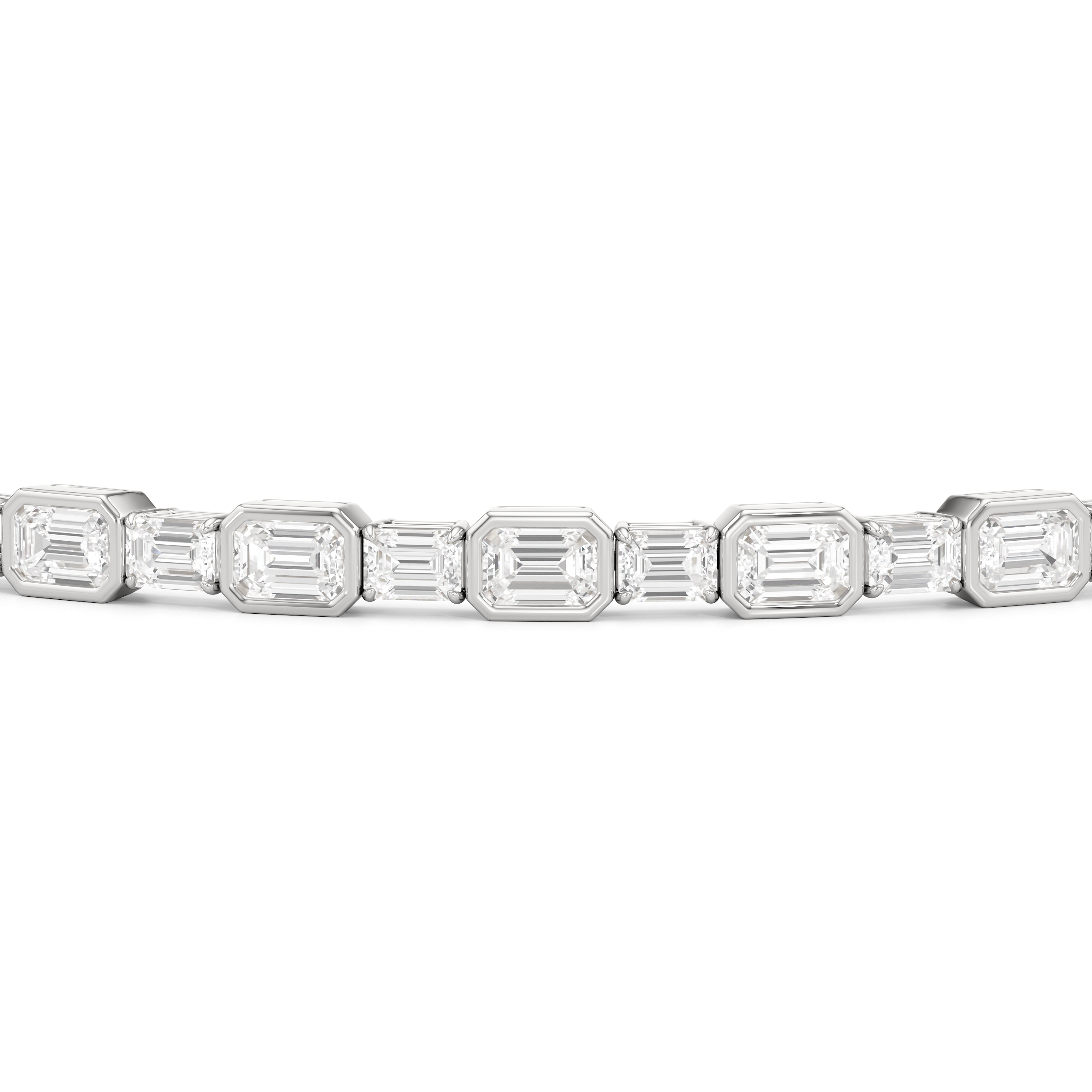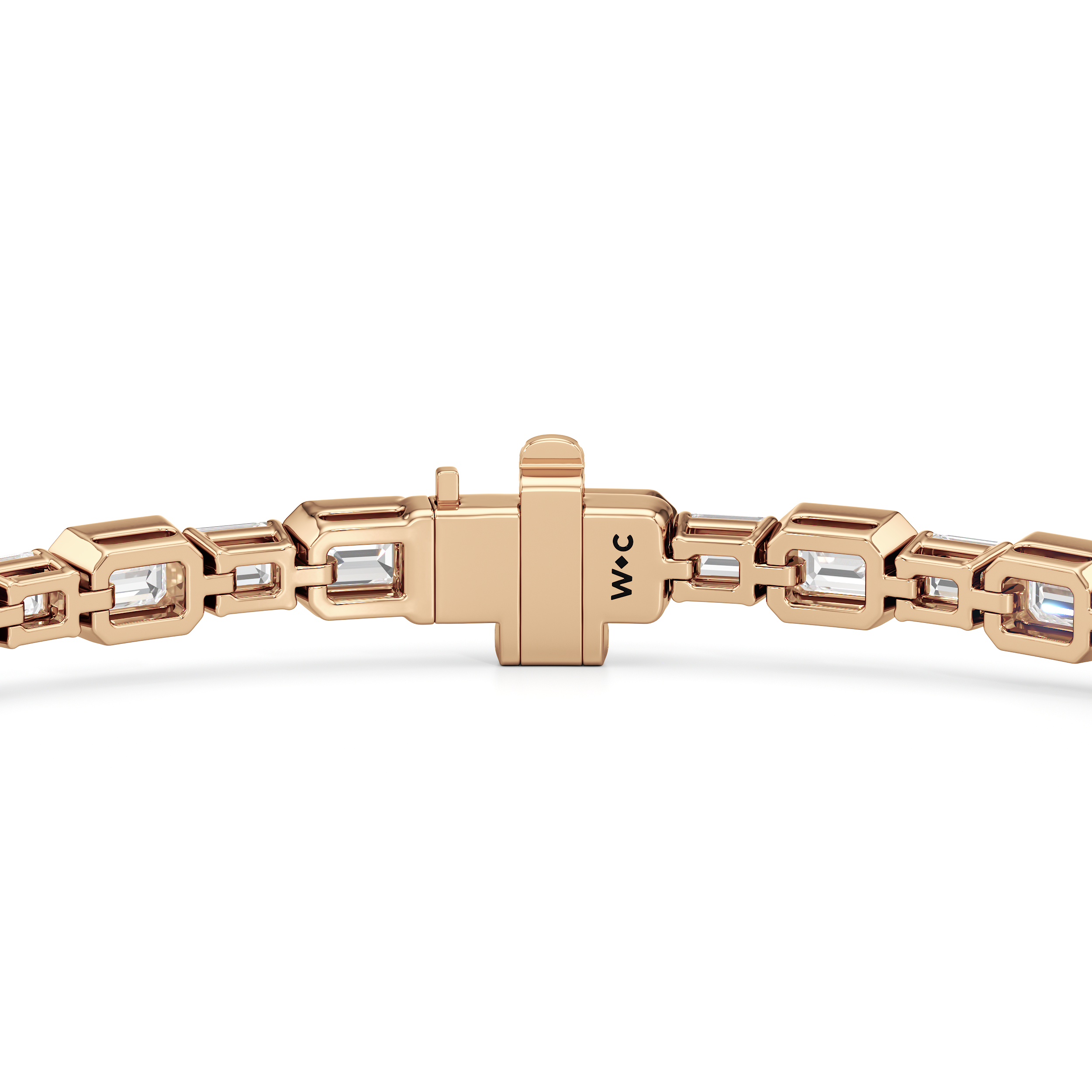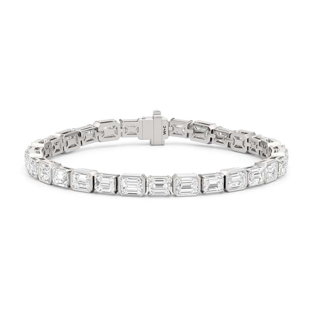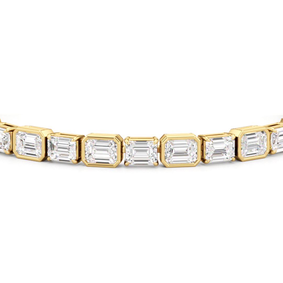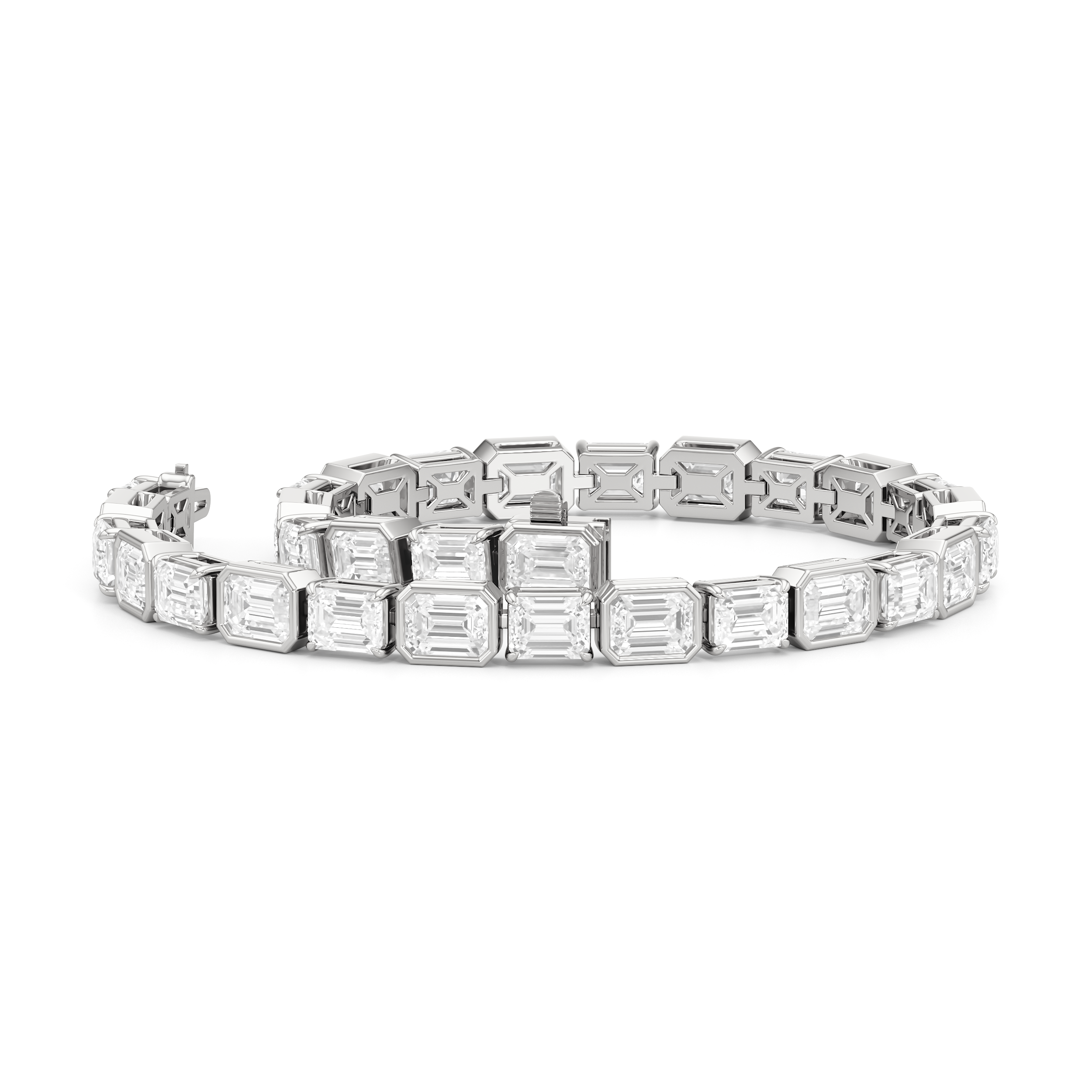 See this diamond tennis bracelet sit boldly on your wrist. It features a continuous line of emerald-cut diamonds alternately set in claw prongs and bezel settings. With its series of emerald-cut diamonds that command attention, this diamond bracelet is undeniably a covetable piece.