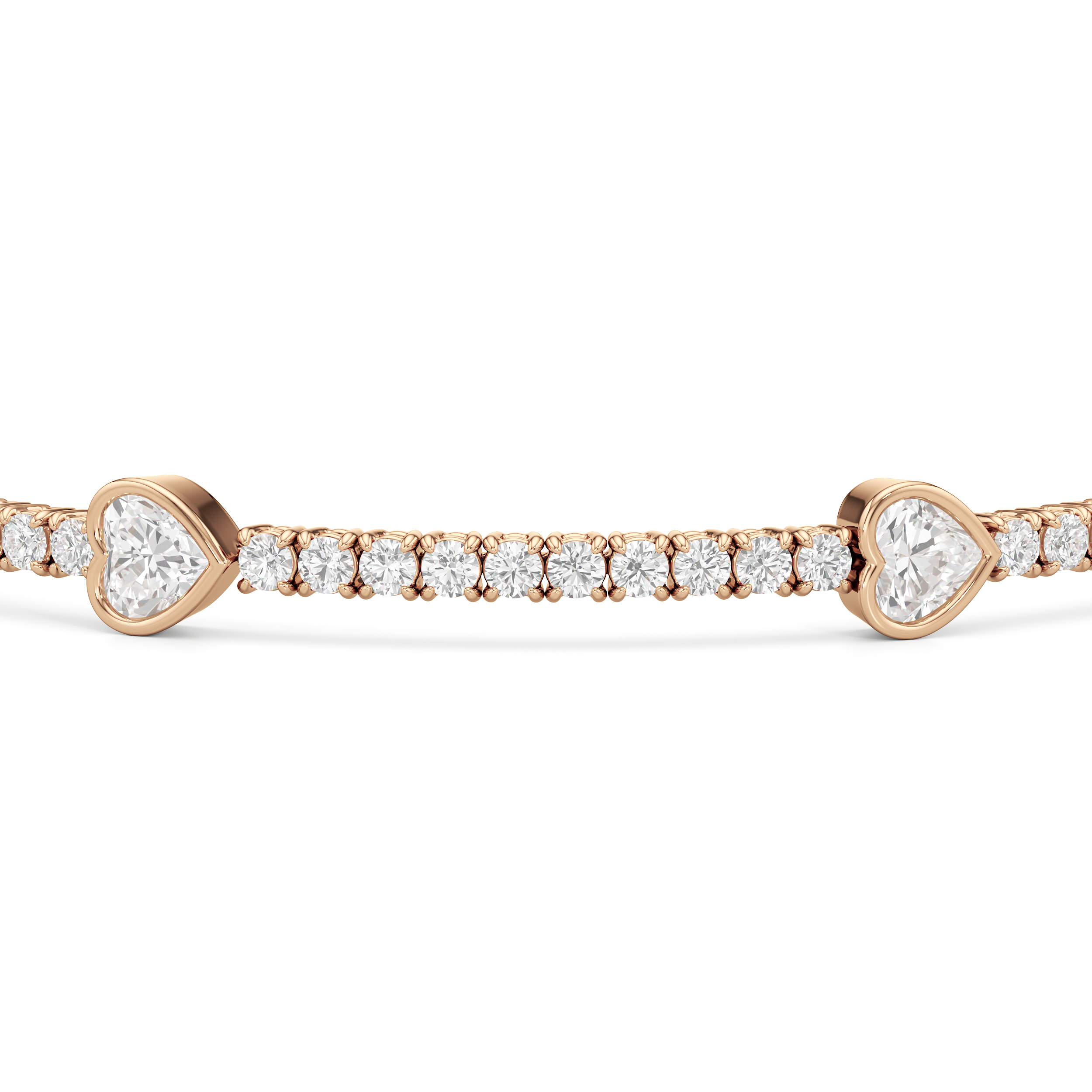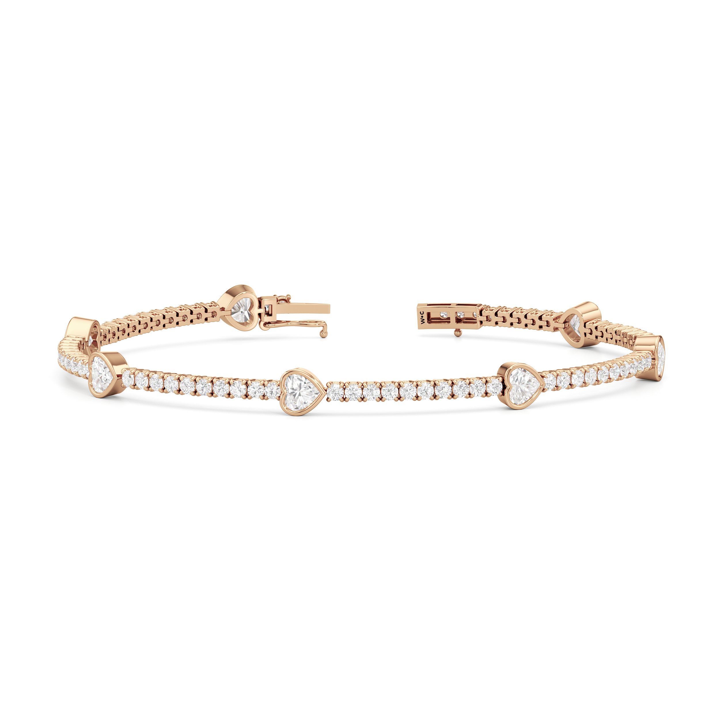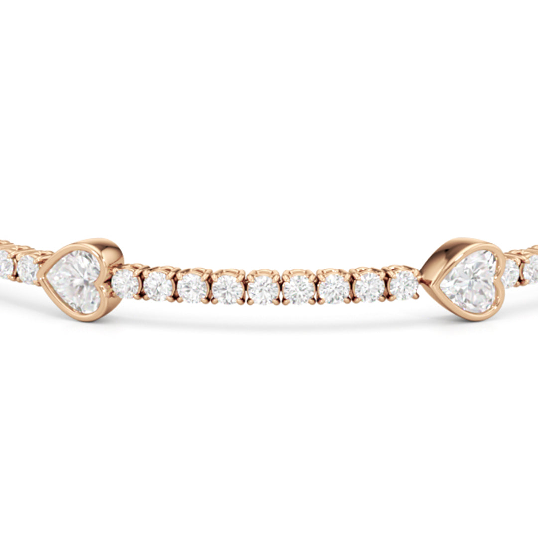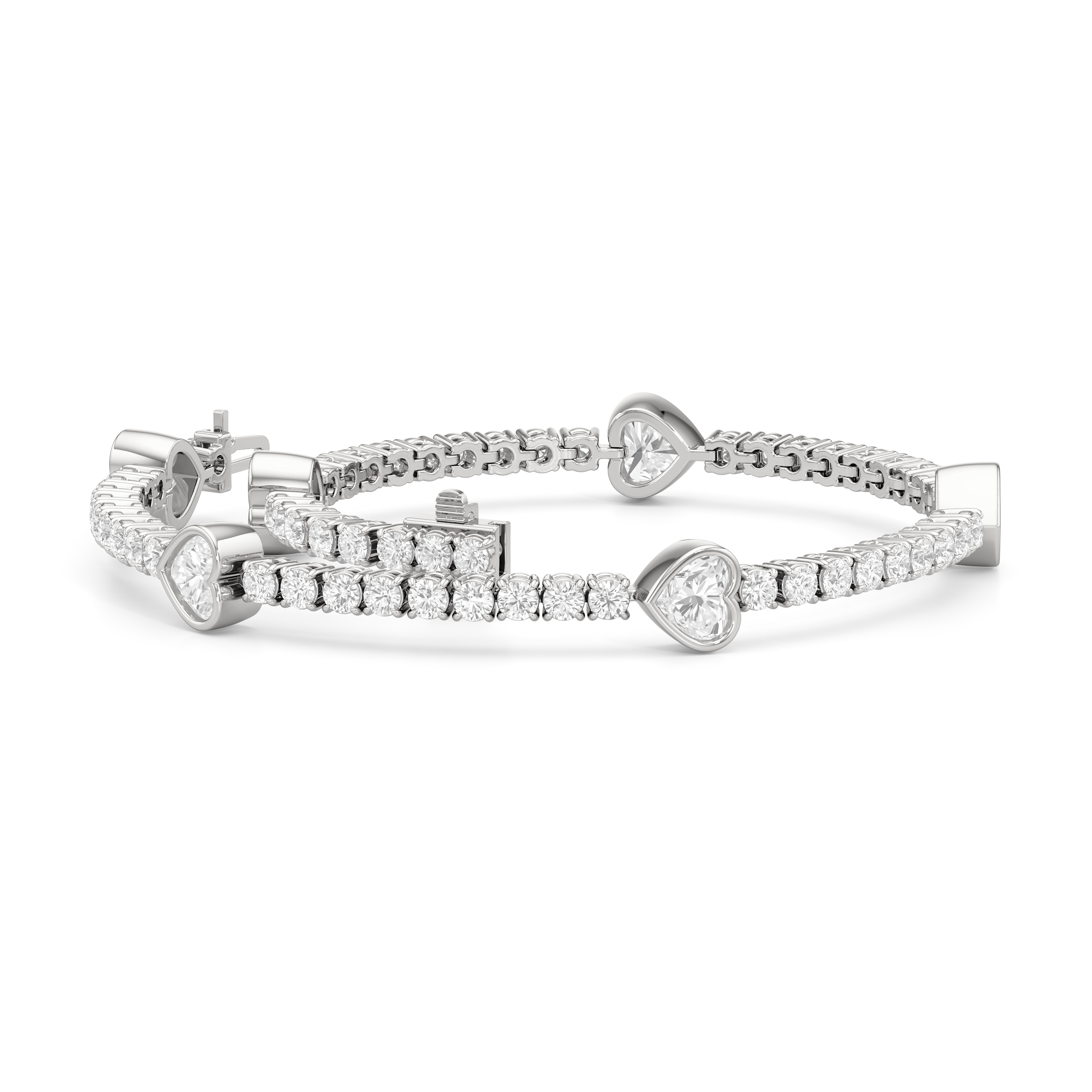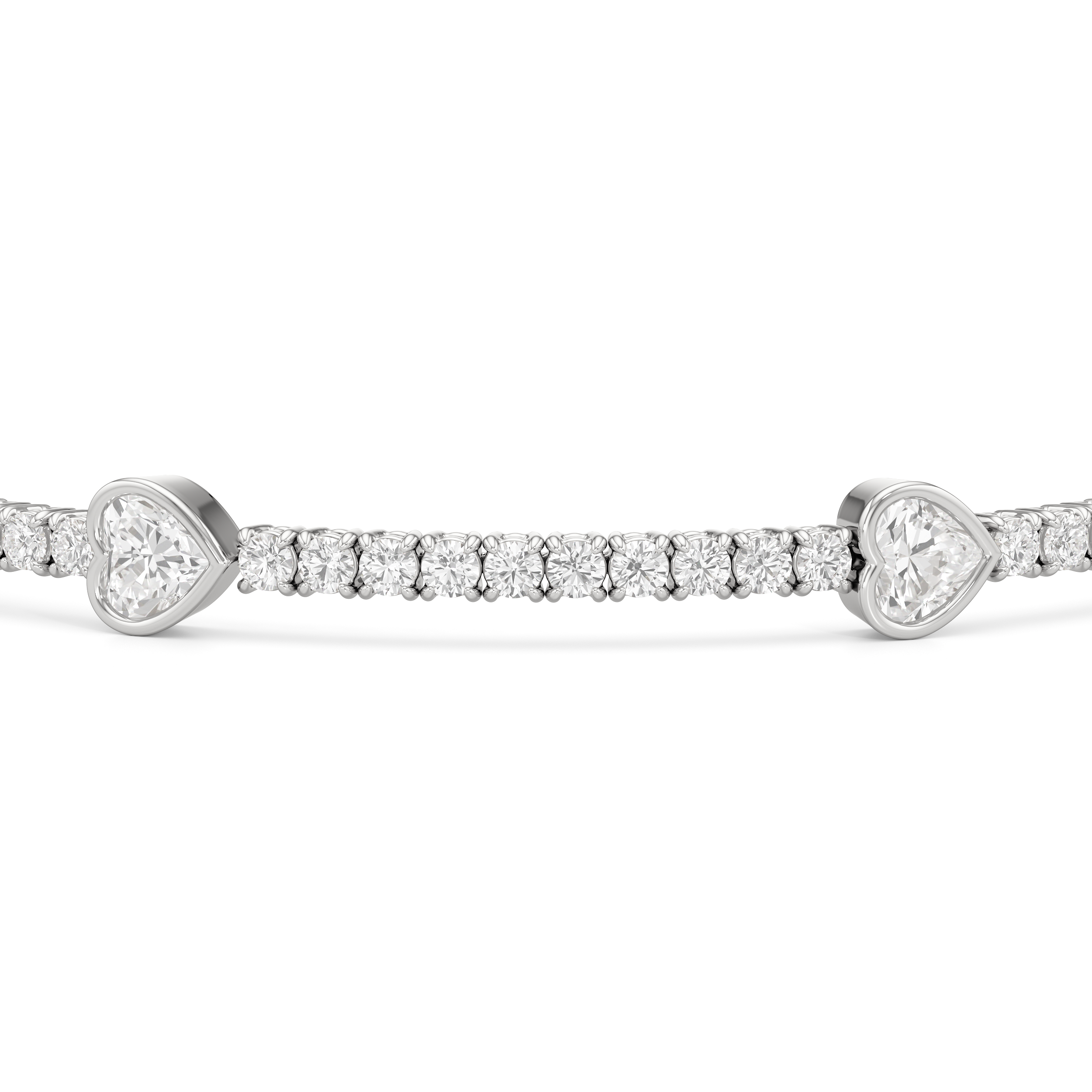 A picture of romance and indulgence. This diamond tennis bracelet is comprised of round diamonds, each on claw prongs, forming a straight but flexible line. Several heart-shaped diamonds, each secured by a bezel, sit at evenly spaced stations, breaking the line with its impressive brilliance.