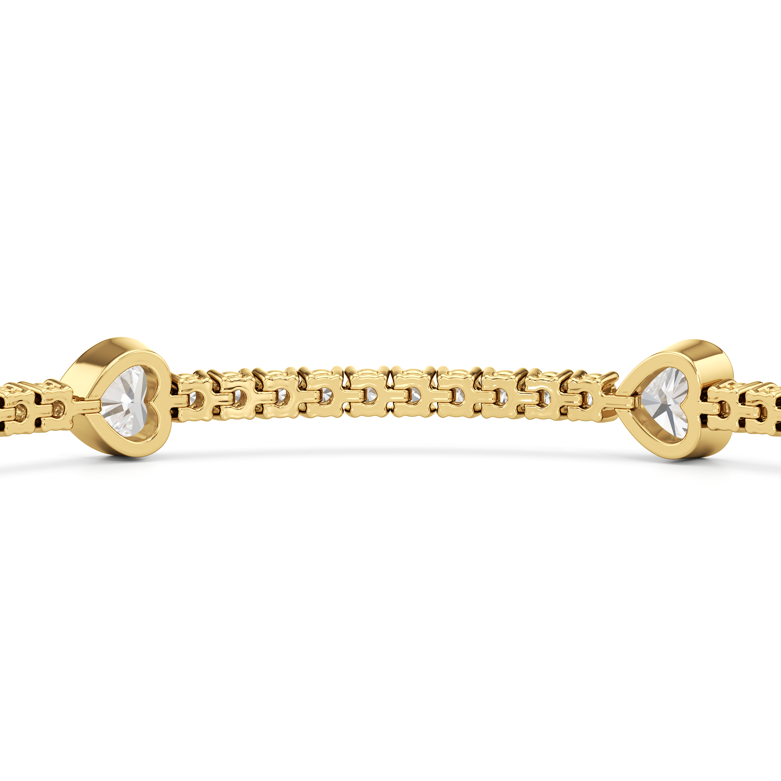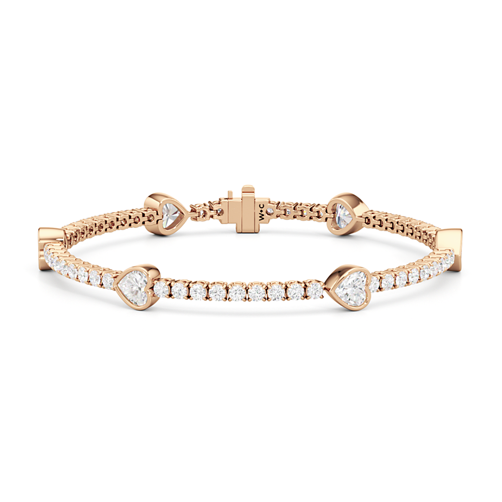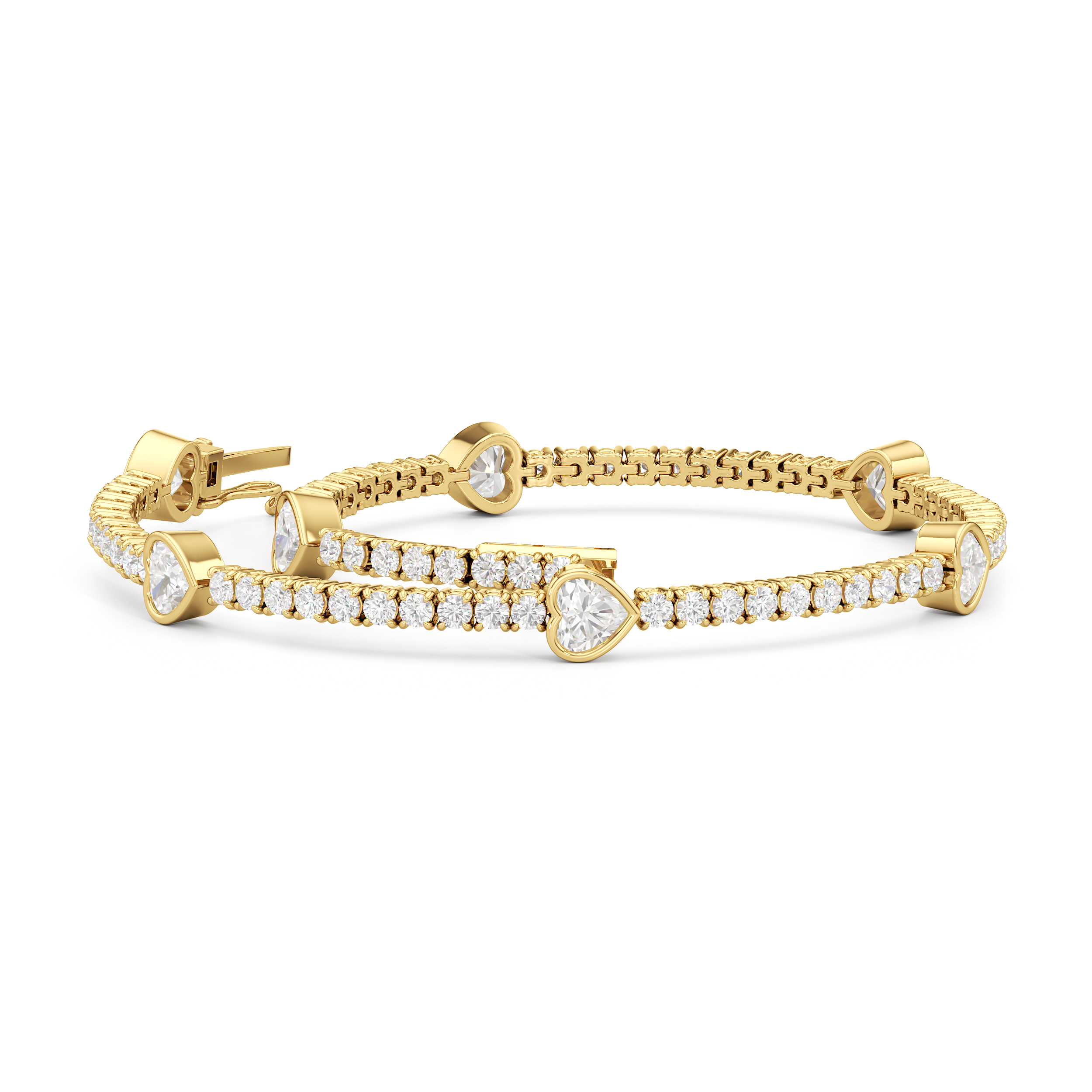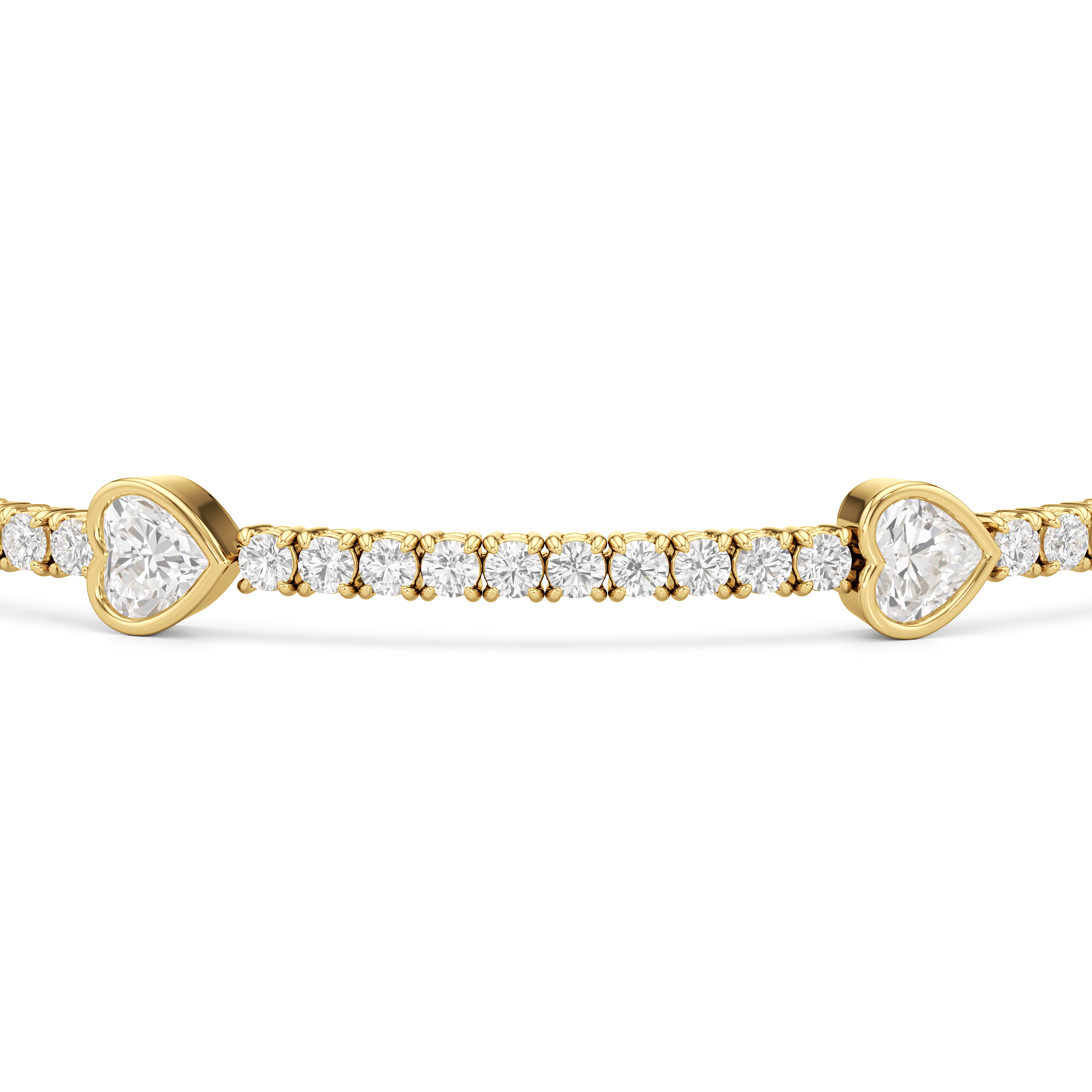 A picture of romance and indulgence. This diamond tennis bracelet is comprised of round diamonds, each on claw prongs, forming a straight but flexible line. Several heart-shaped diamonds, each secured by a bezel, sit at evenly spaced stations, breaking the line with its impressive brilliance.