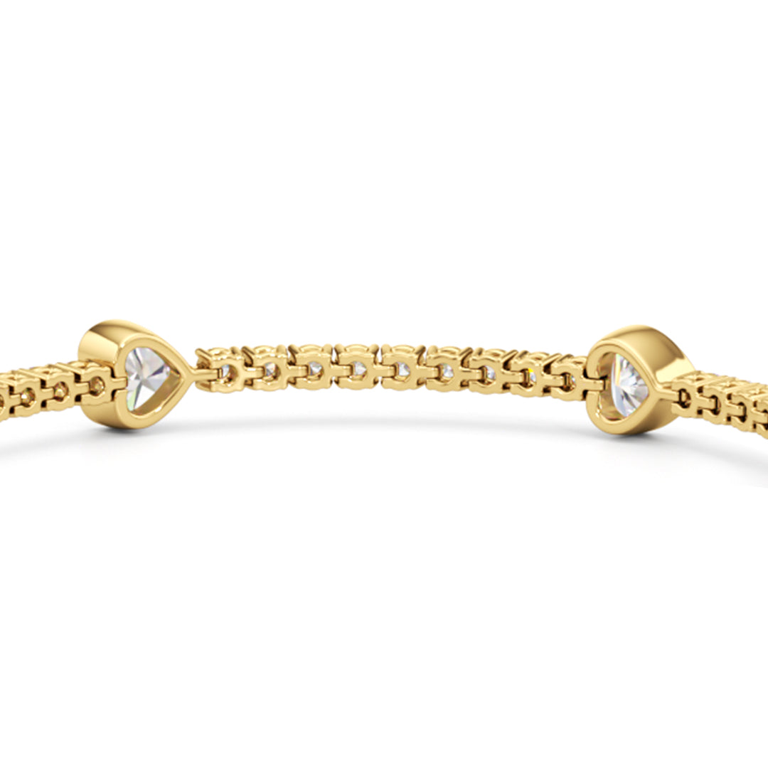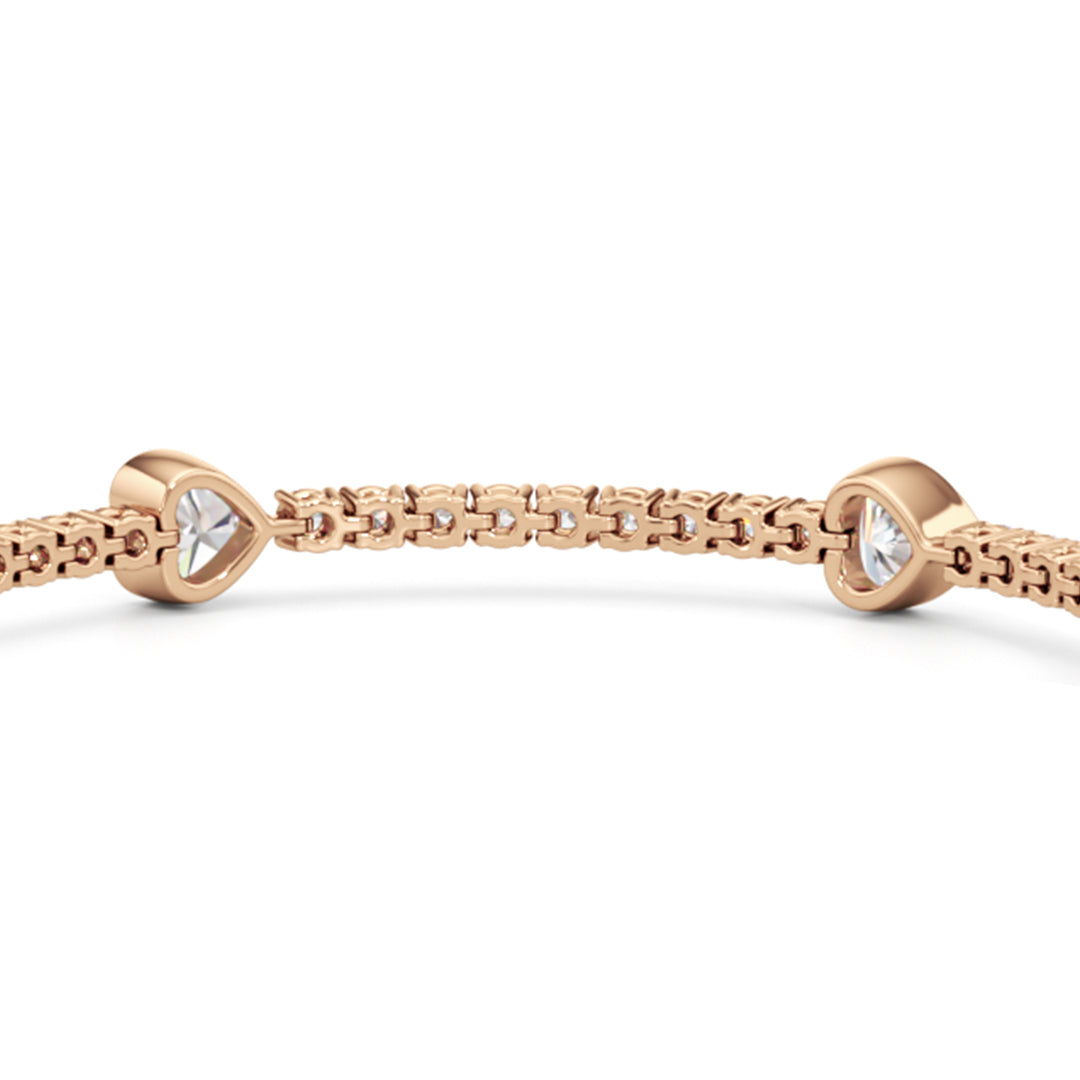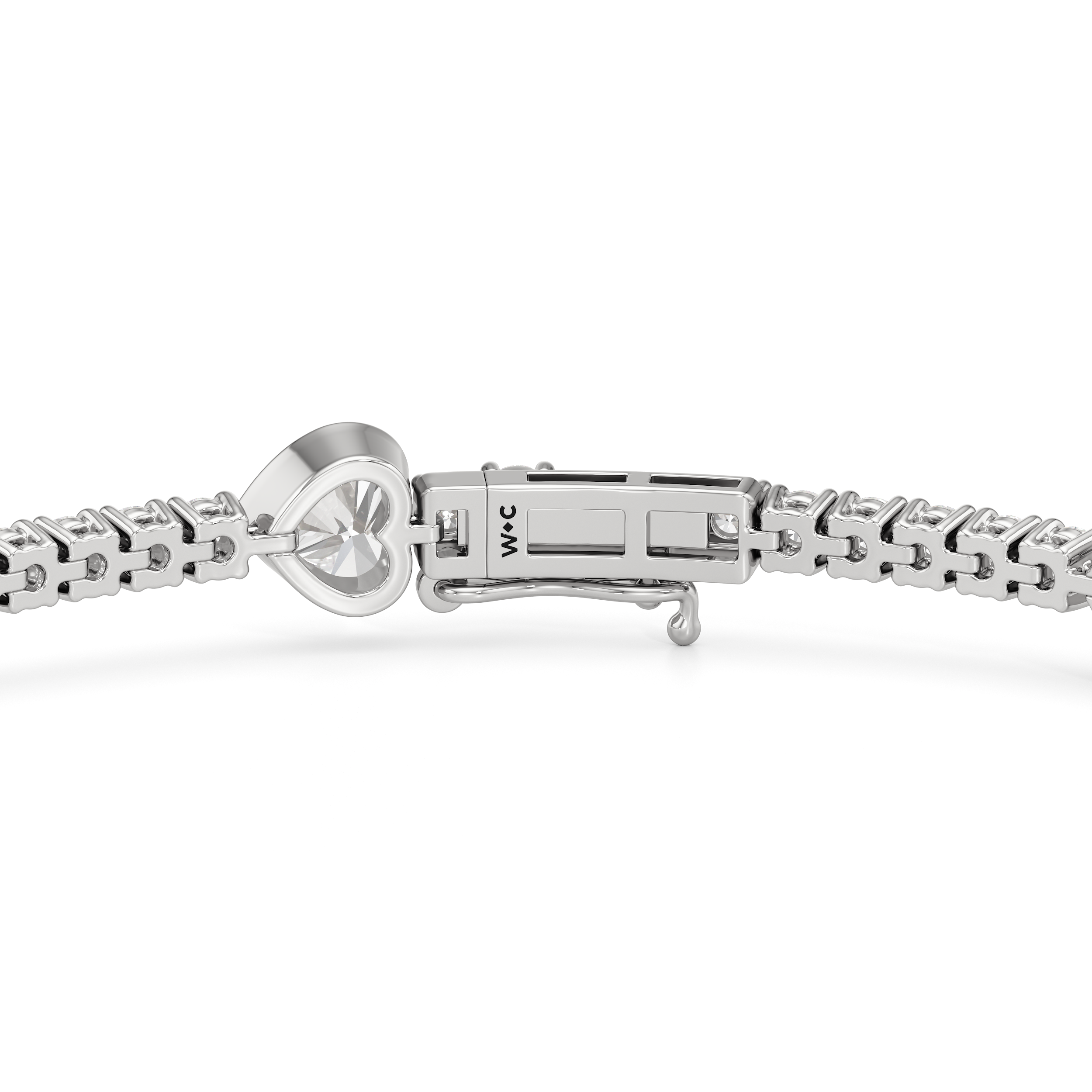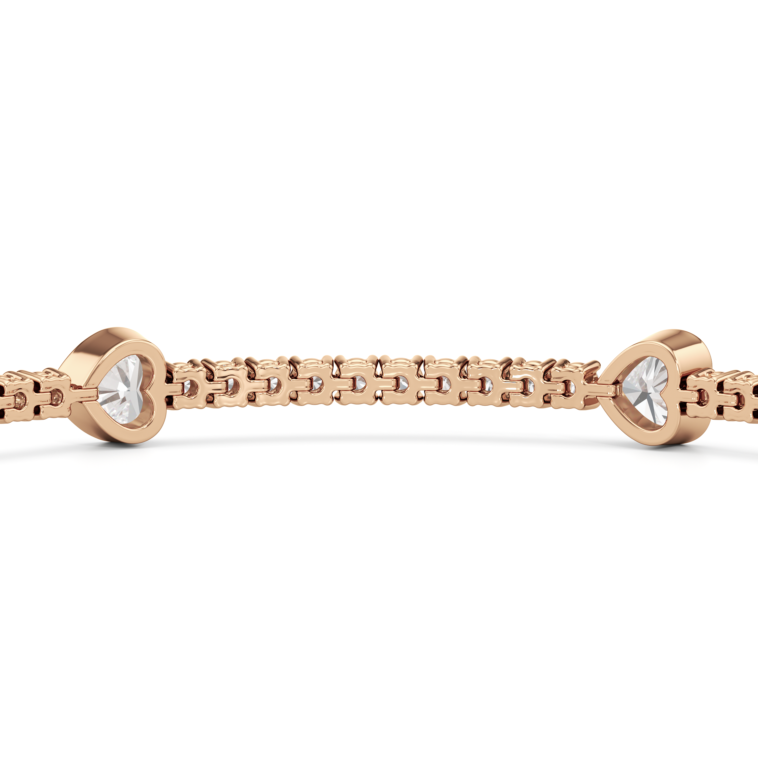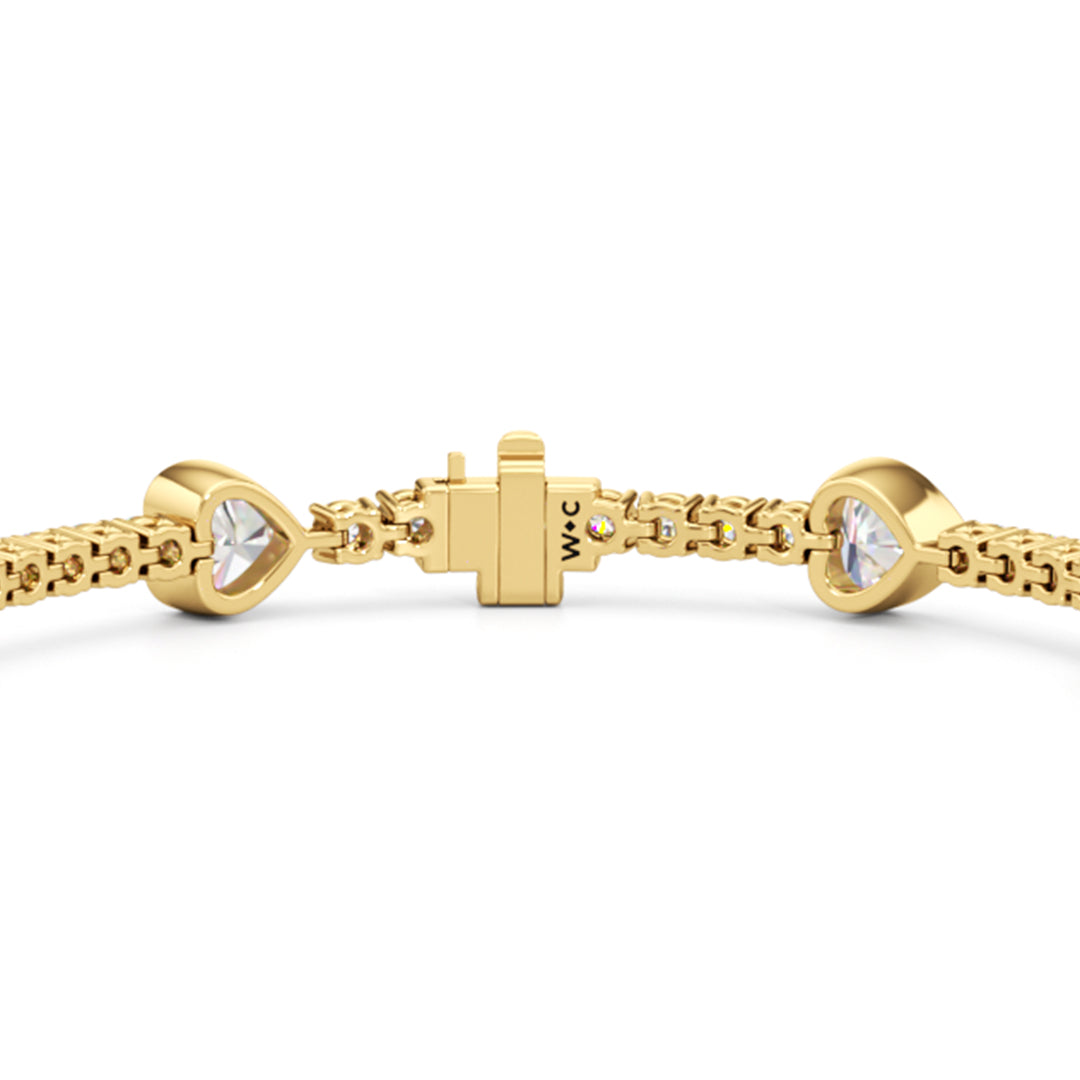 A picture of romance and indulgence. This diamond tennis bracelet is comprised of round diamonds, each on claw prongs, forming a straight but flexible line. Several heart-shaped diamonds, each secured by a bezel, sit at evenly spaced stations, breaking the line with its impressive brilliance.