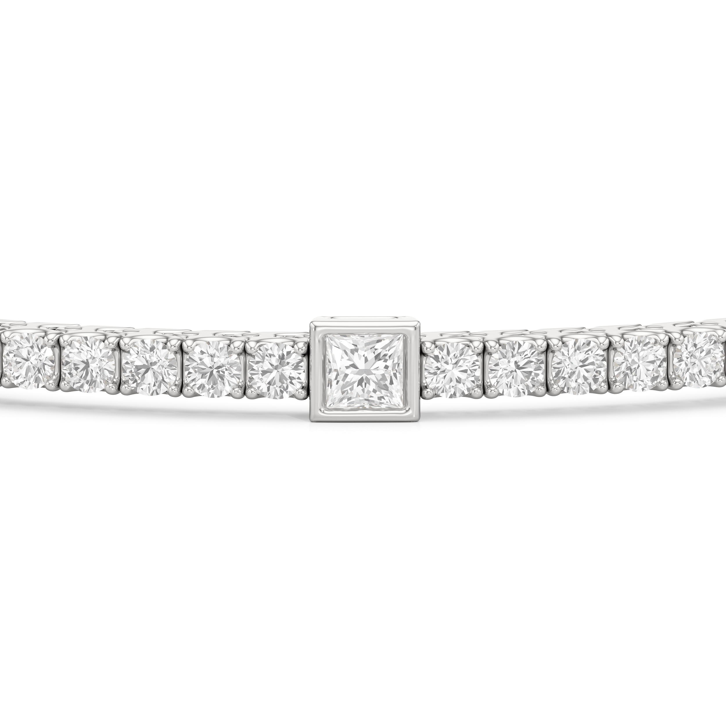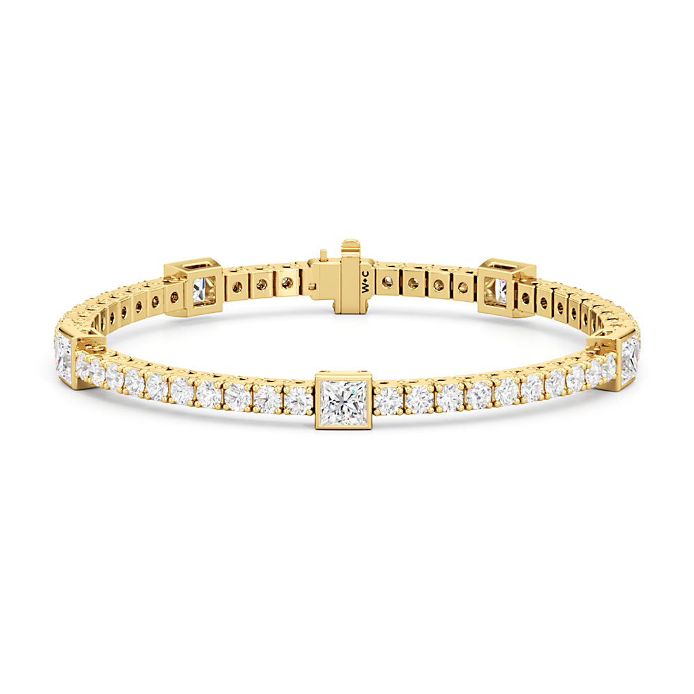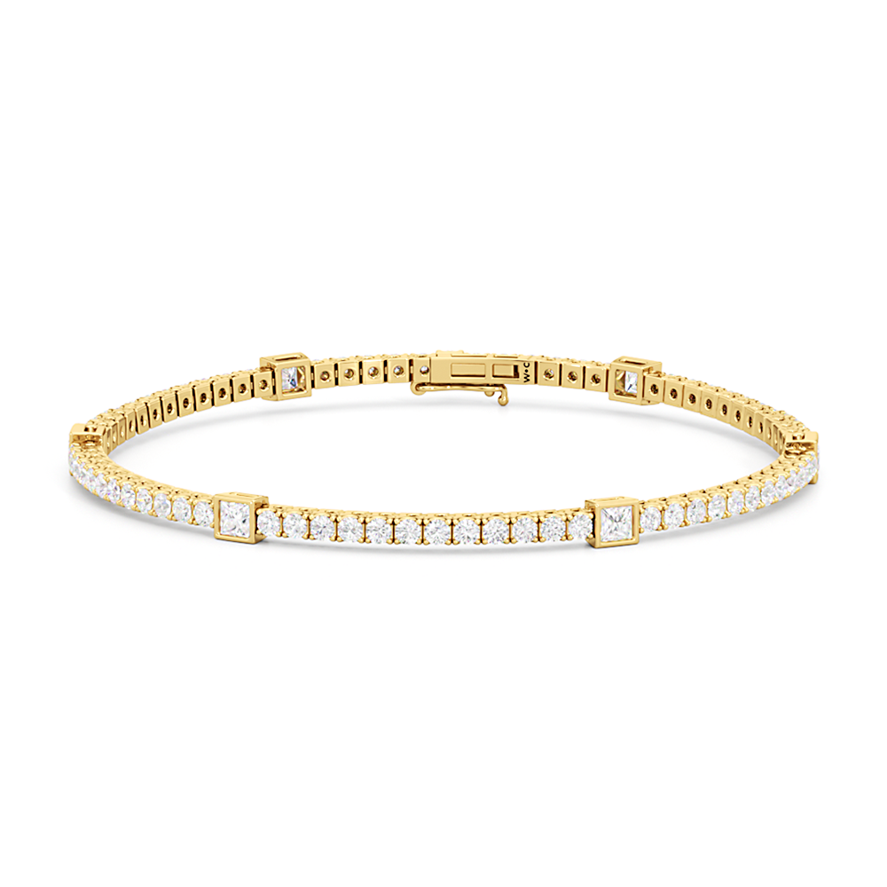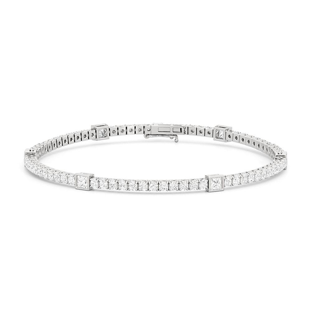 A unique choice. This tennis bracelet's singular strand of round diamonds is interrupted by princess-cut diamonds, each on a bezel setting. With its distinctive brilliance, this diamond bracelet ensures your jewelry stack is better than ever.