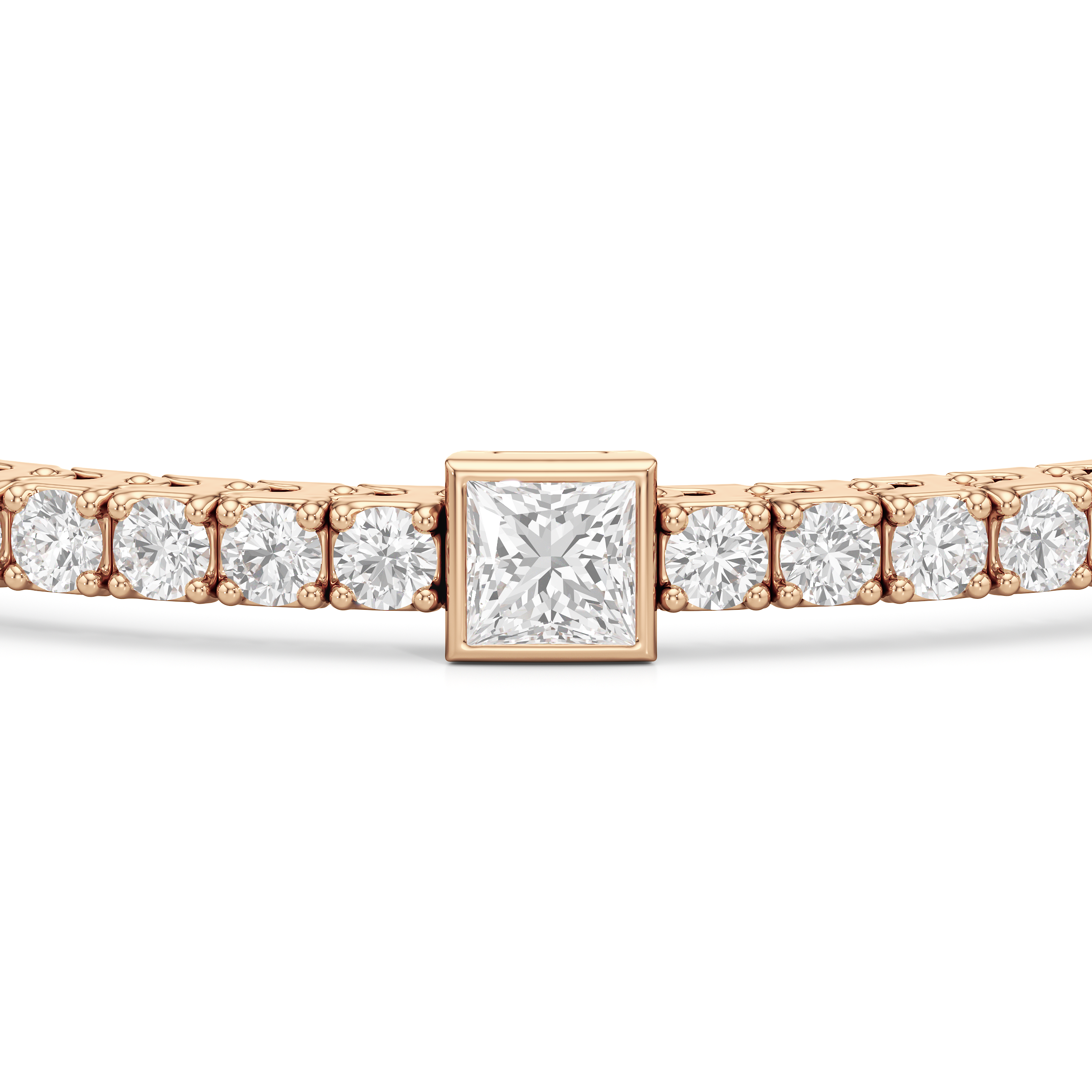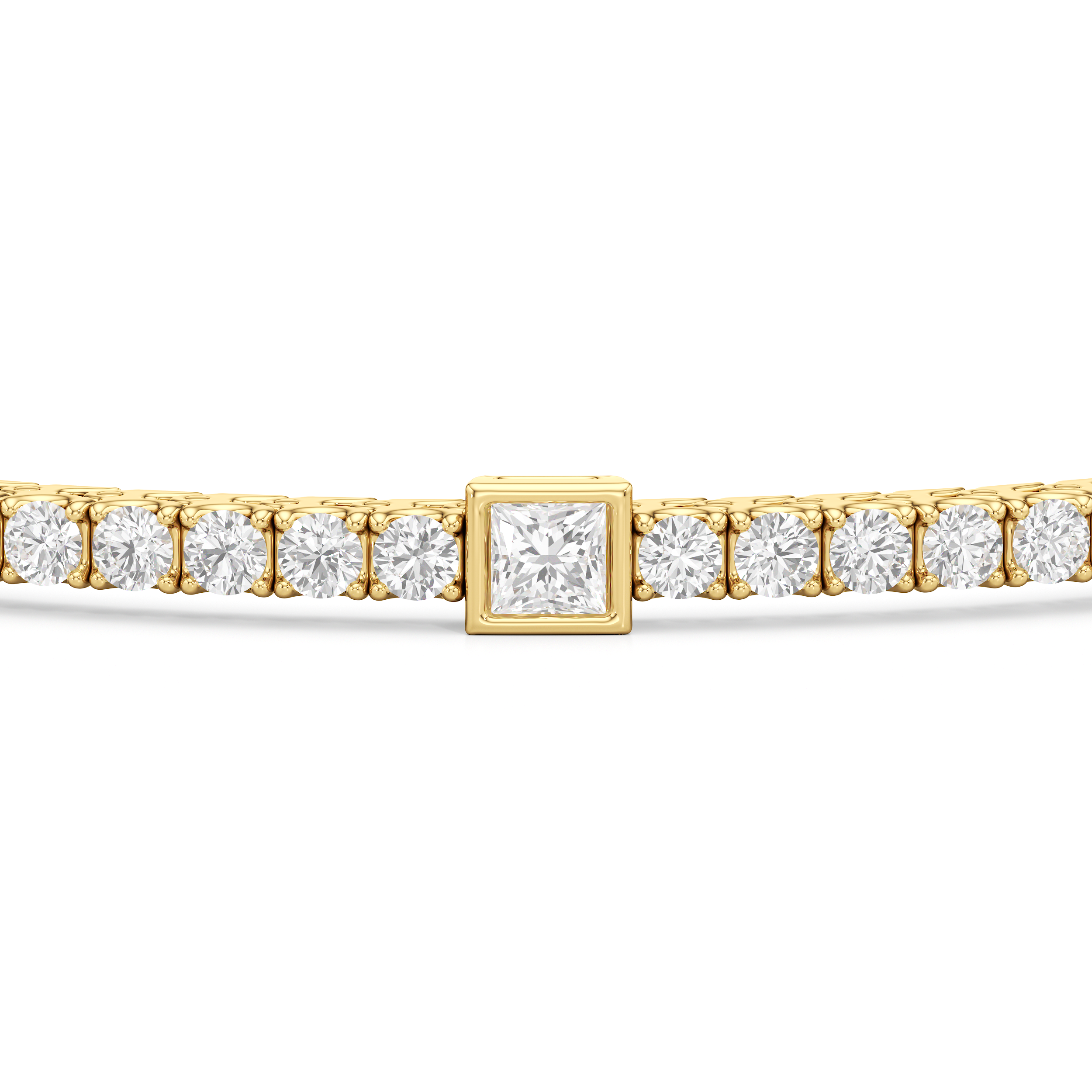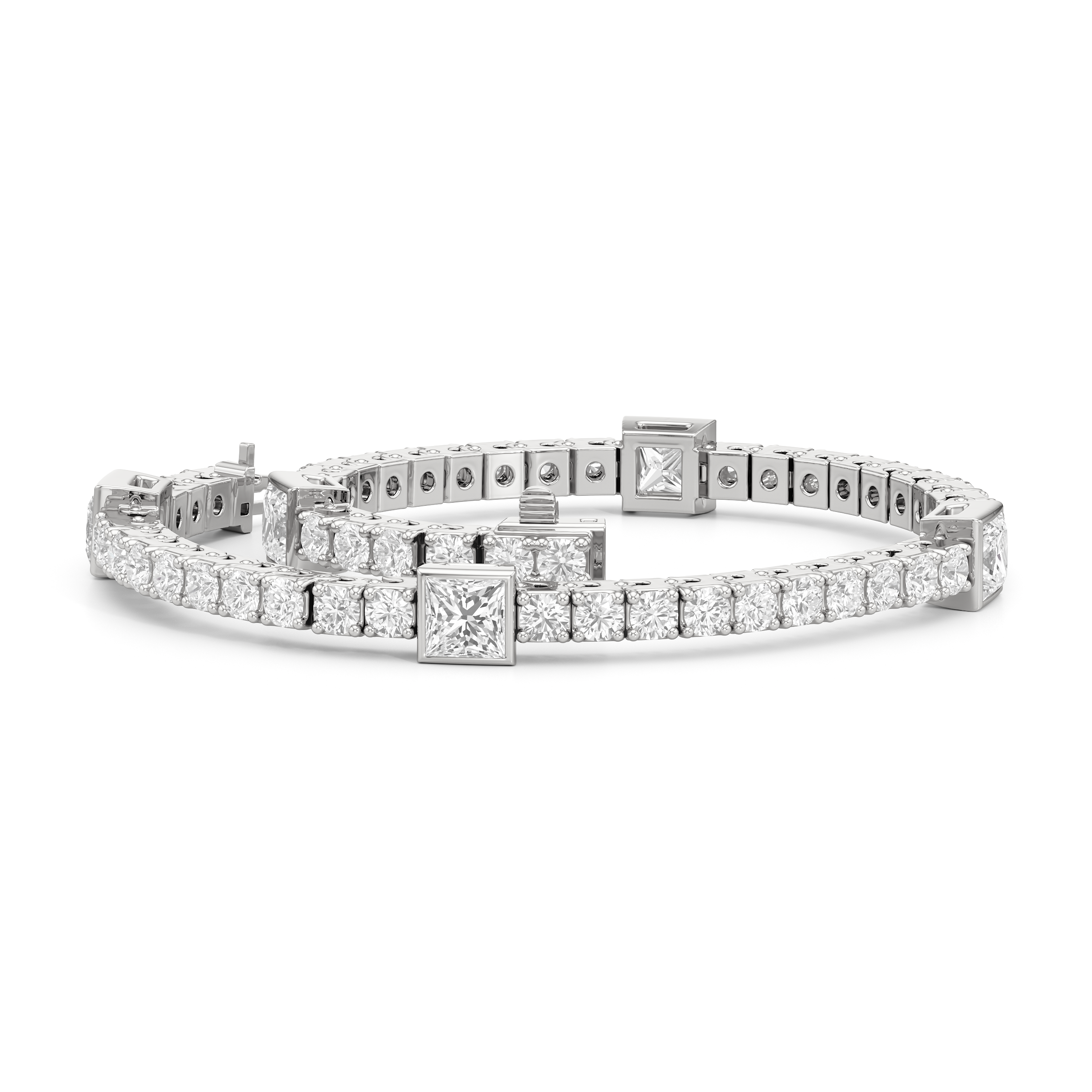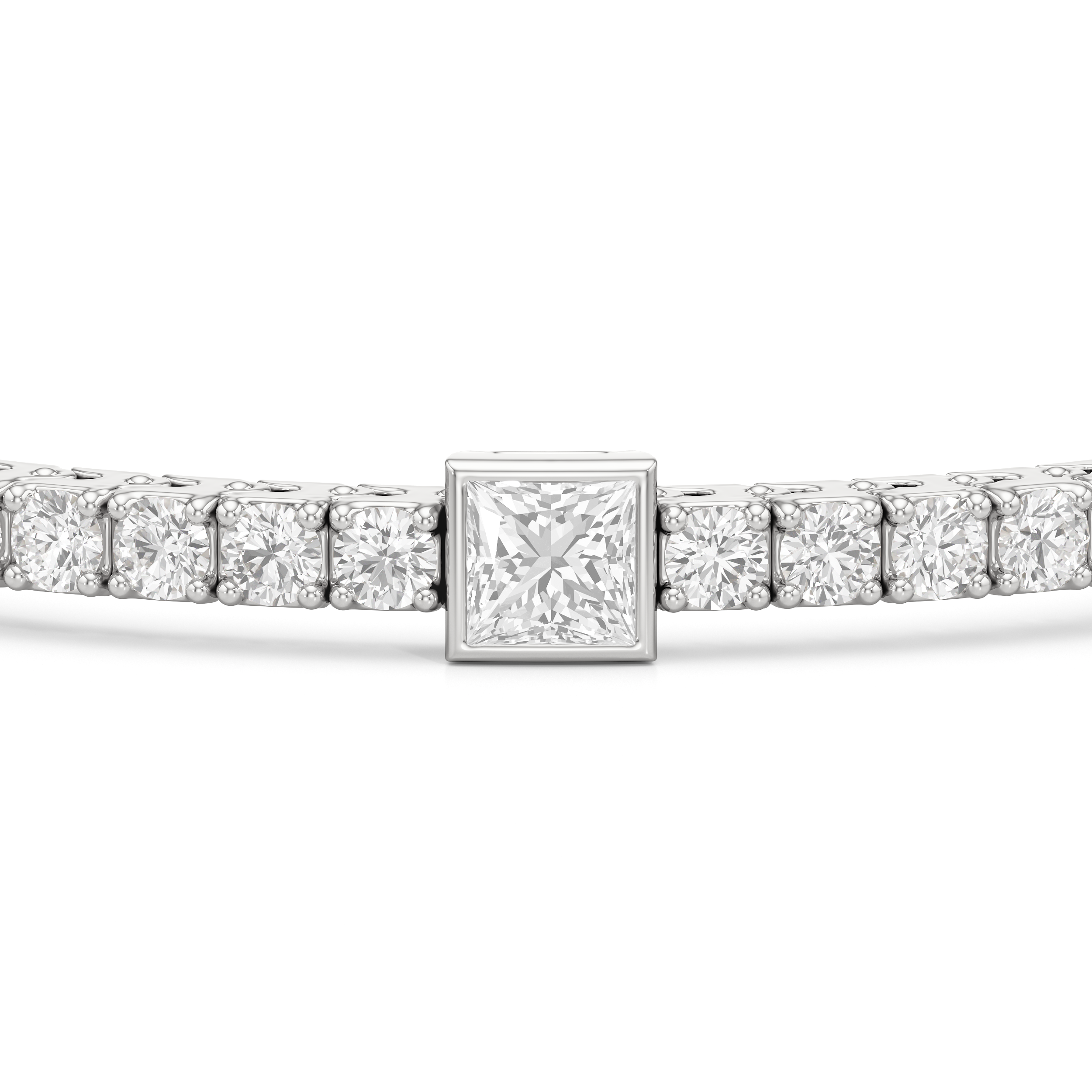 A unique choice. This tennis bracelet's singular strand of round diamonds is interrupted by princess-cut diamonds, each on a bezel setting. With its distinctive brilliance, this diamond bracelet ensures your jewelry stack is better than ever.