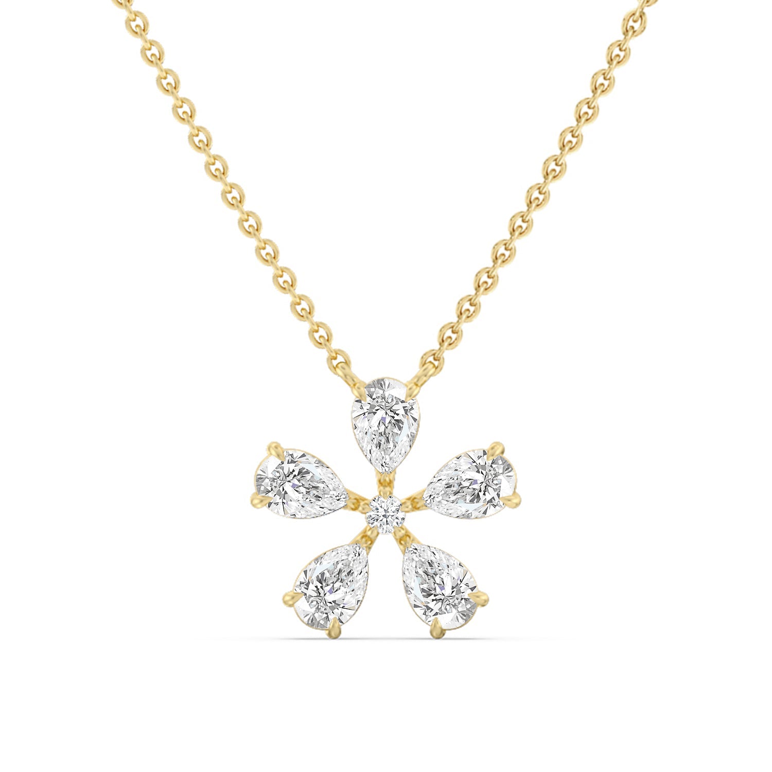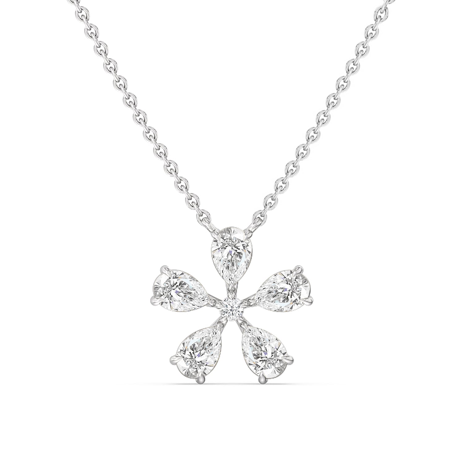 The Periwinkle Necklace is delicately beautiful. Its pendant bears the pinwheel-like look of its namesake, with radially symmetrical and meticulously positioned pear-cut diamond petals. The luxe bloom evokes a sense of nostalgia, bringing to mind warm memories and serving as a notice of the passage of time.