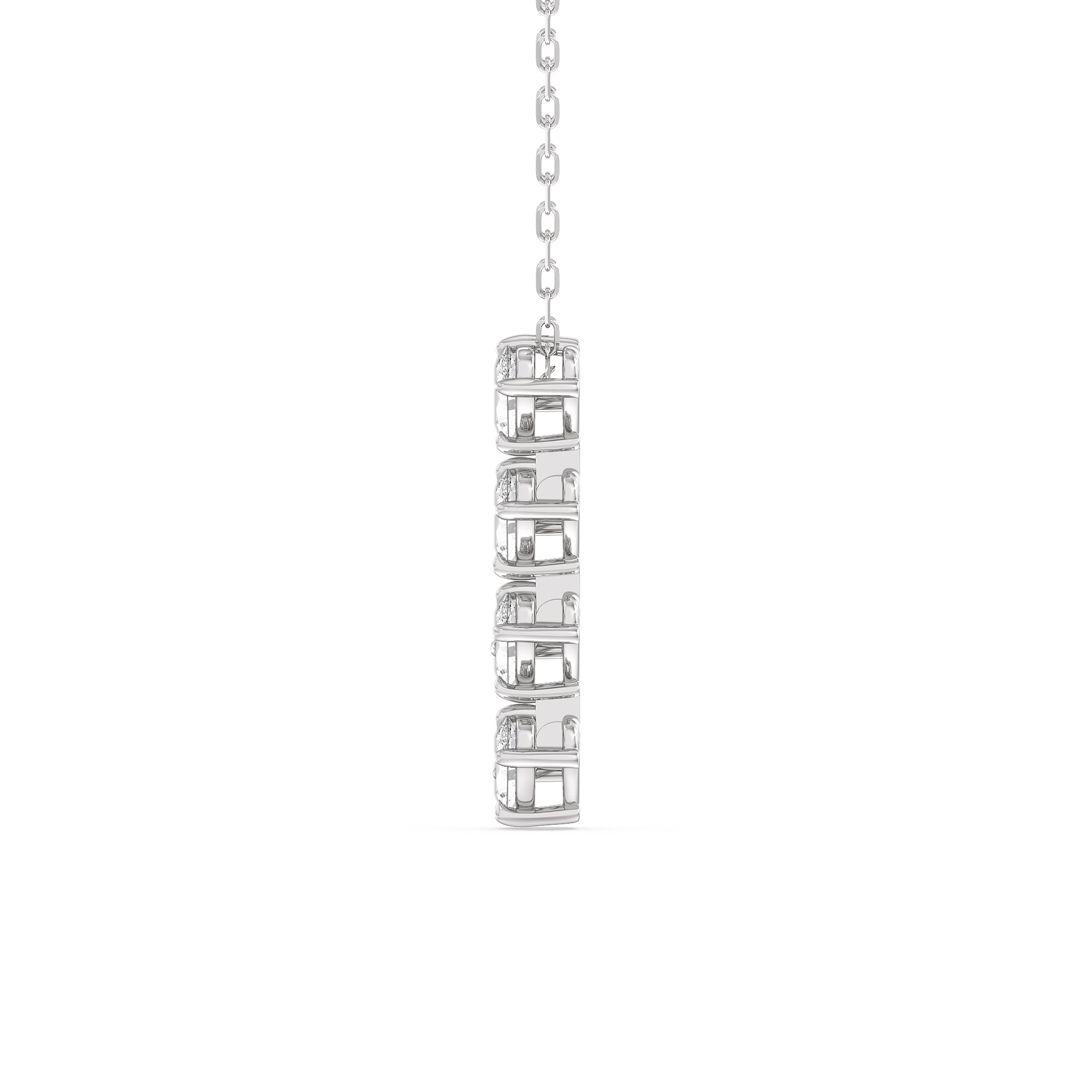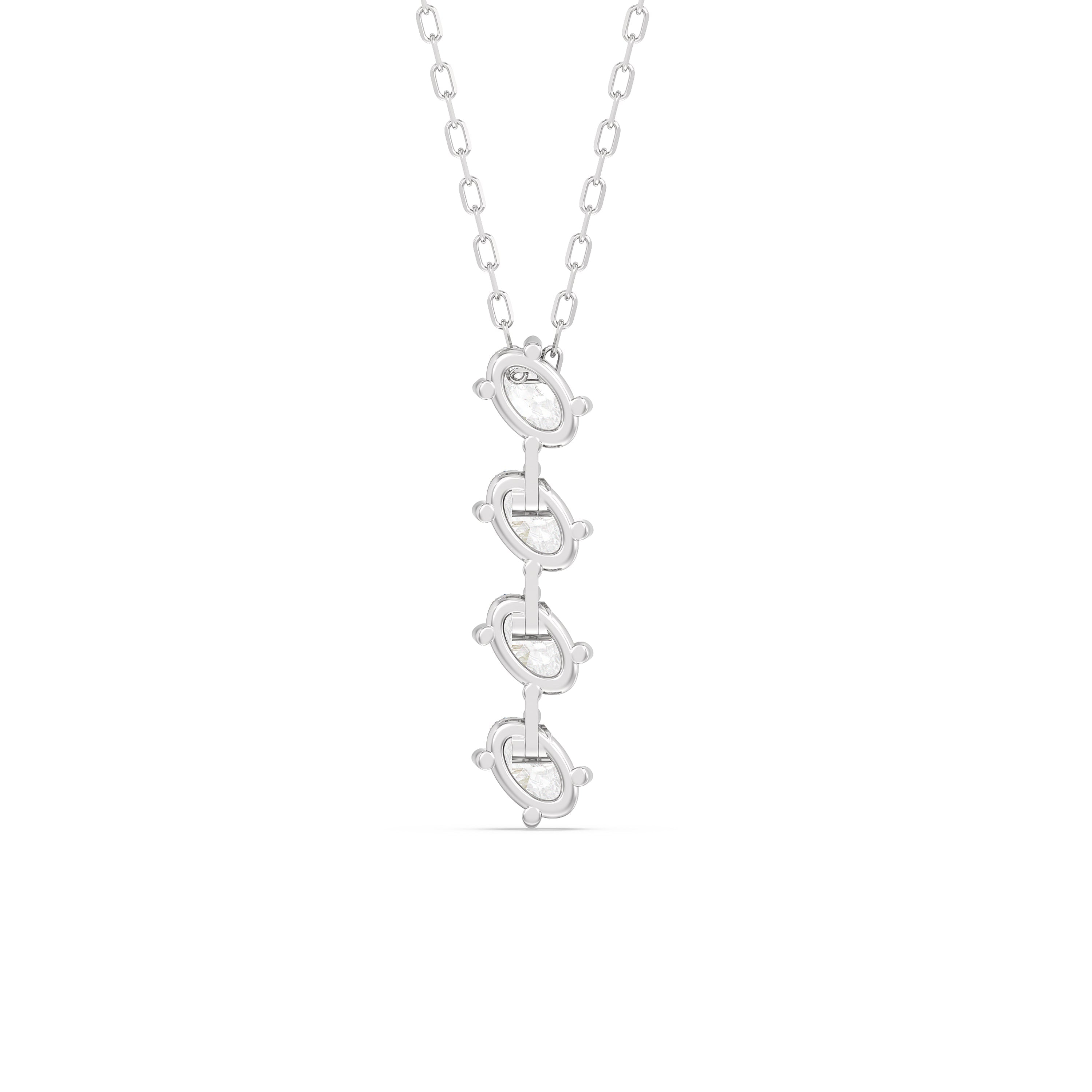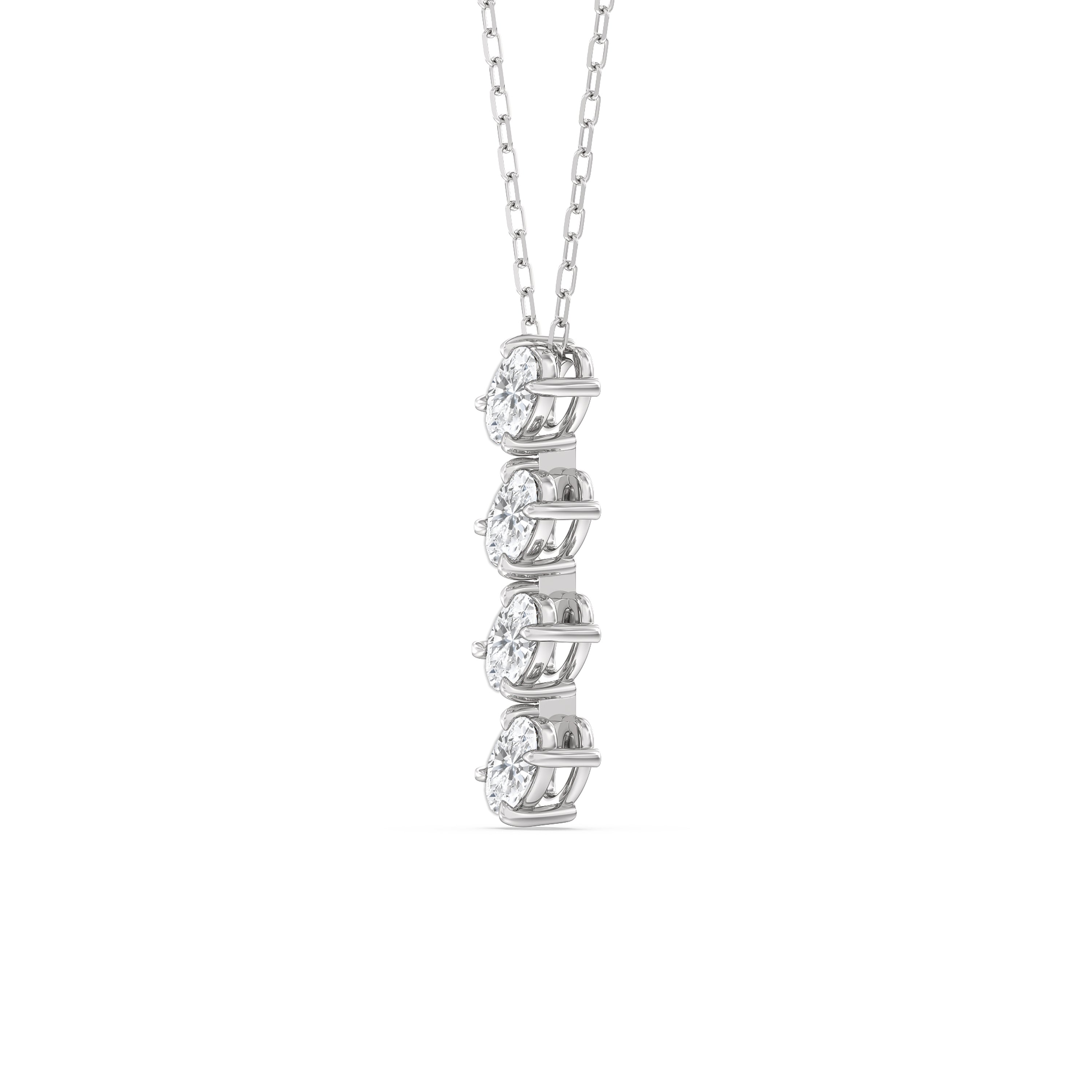 Best worn alone, this linear diamond necklace exudes an air of elegance that won't go out of fashion. Its glittering style showcases a vertical row of four 0.25 ct oval diamonds. Each diamond is set in a slanted orientation for an extra dazzling effect.