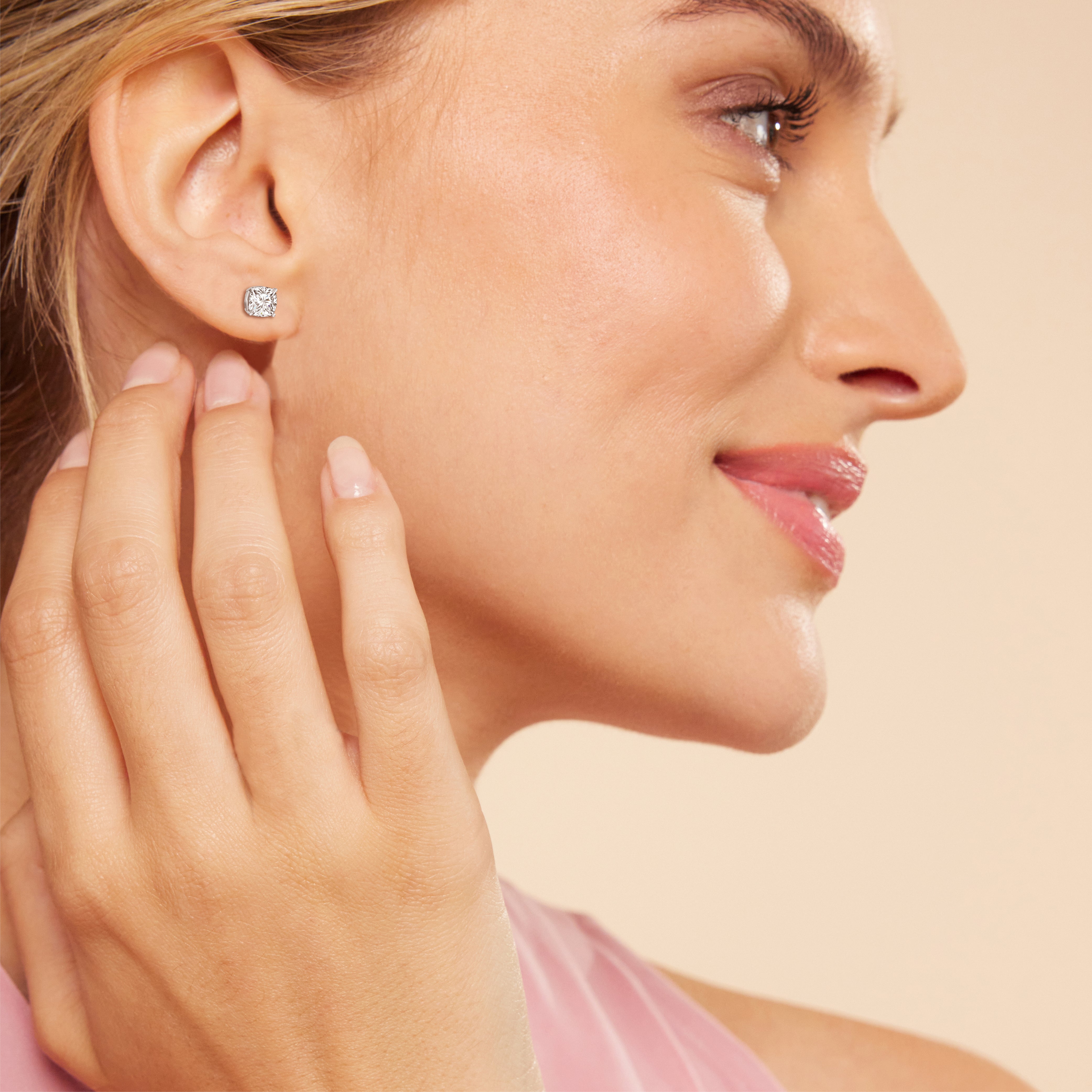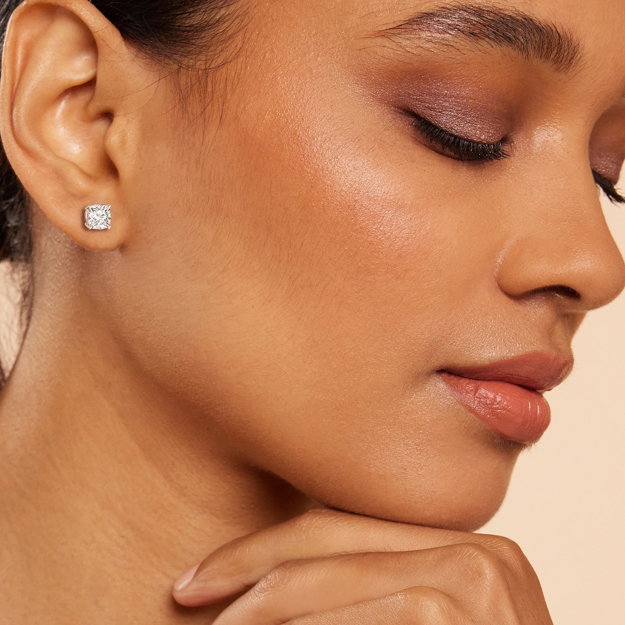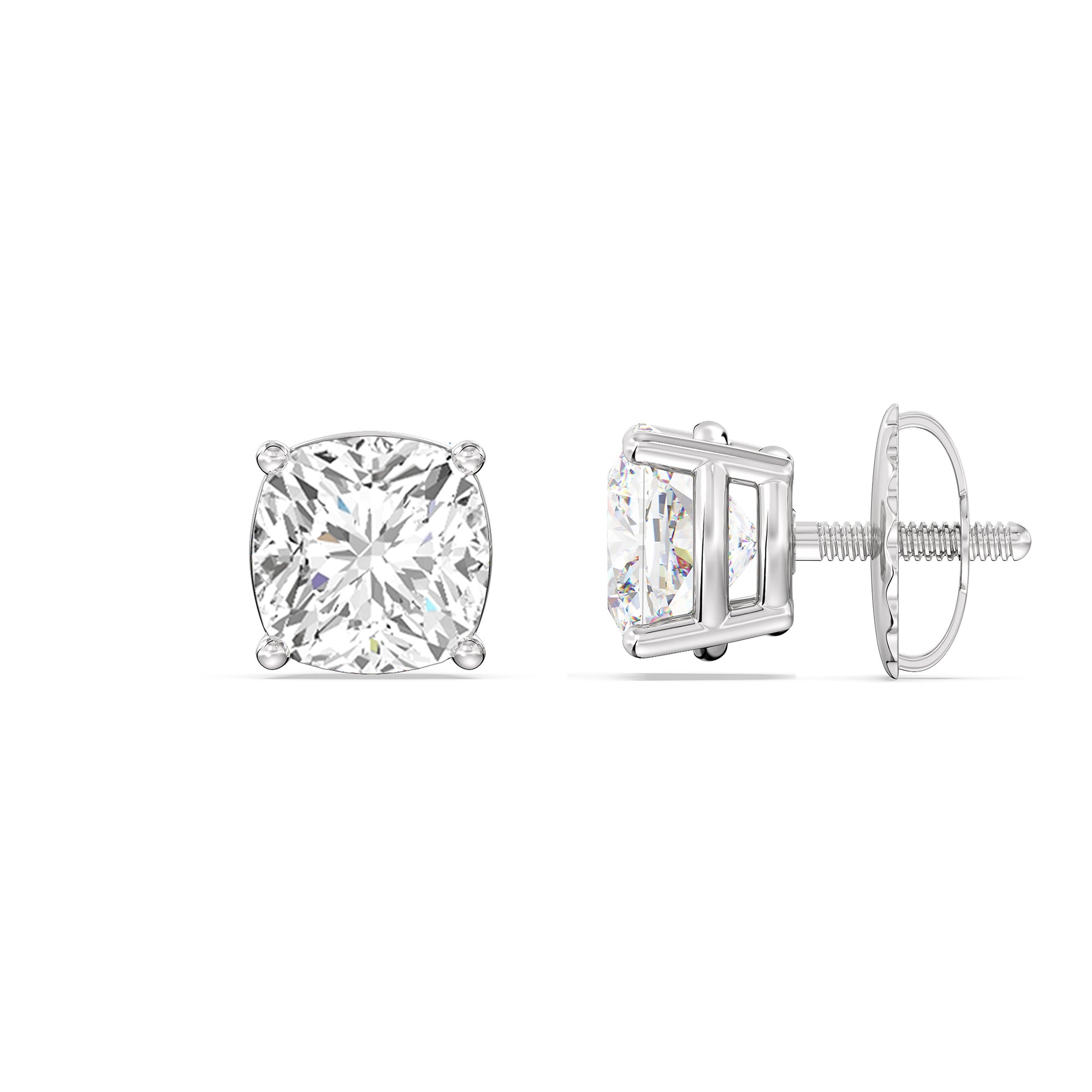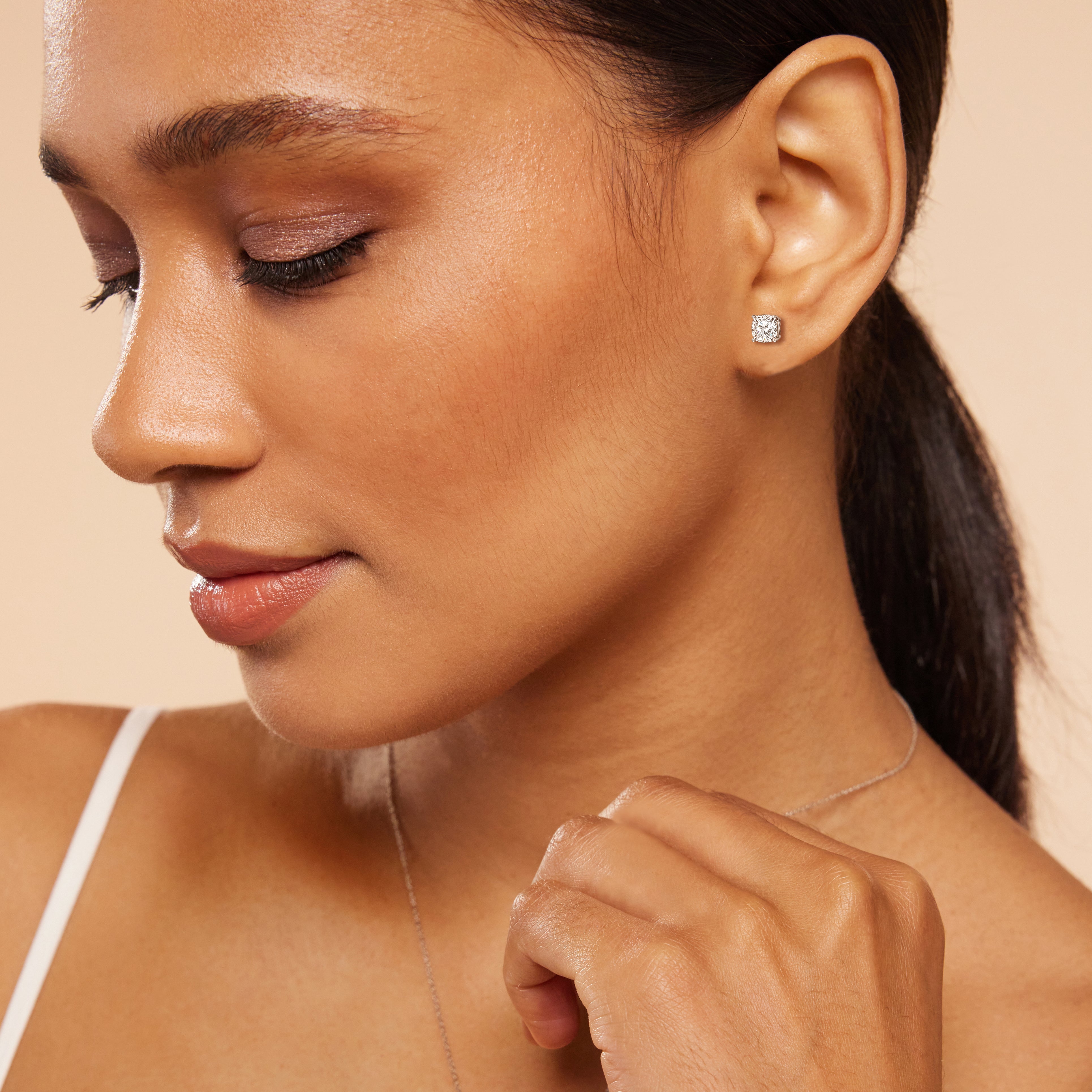 These cushion diamond stud earrings make daily accessorizing infinitely easier. They boast a distinct look with their square shape, rounded corners, large facets, and exceptional brilliance—all presented in a versatile, minimalist profile. The screw backs ensure a secure and effortless fit.