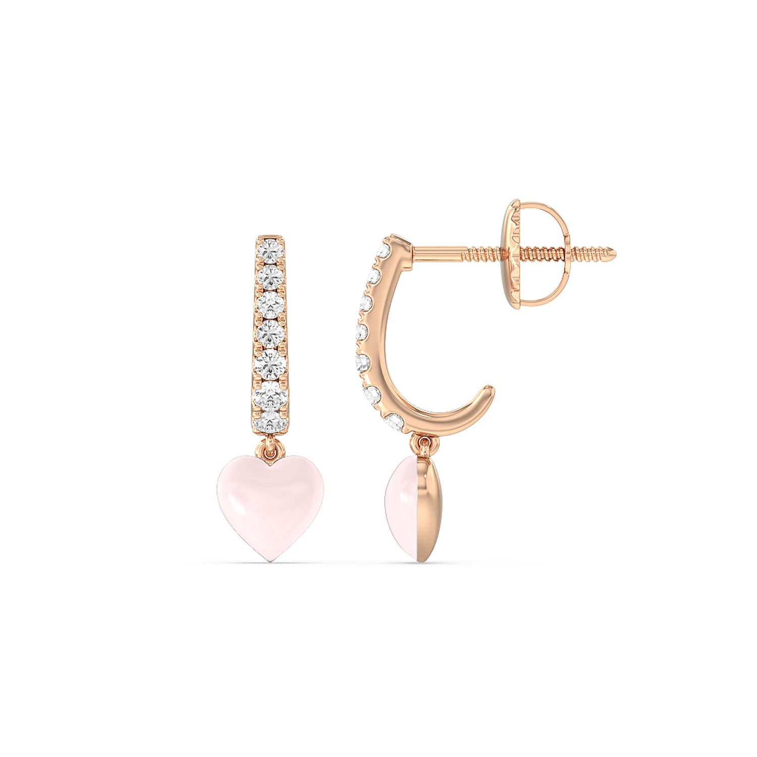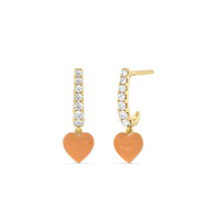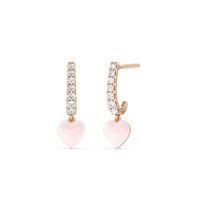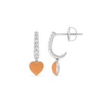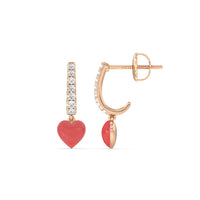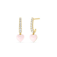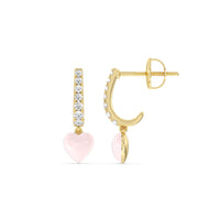 These heart huggies are a must have in every jewelry wardrobe. Each silk earring has a c-shaped post embellished with round diamonds of graduating sizes. At the bottom of the half-hoop is a heart-shaped drop accent, creating the perfect finishing touch.