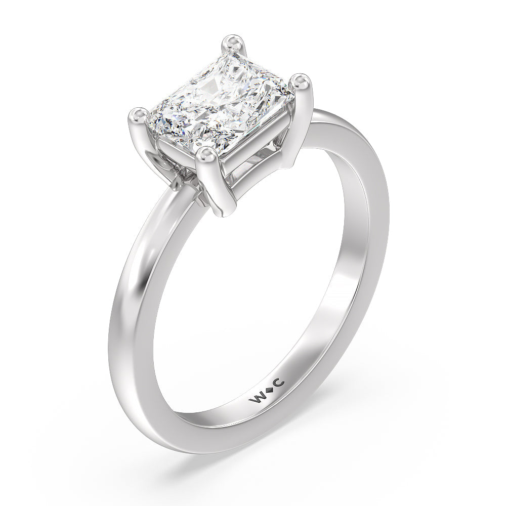 An east west style prong setting holds the center diamond for a distinctive look that sets this apart from classic solitaire rings.