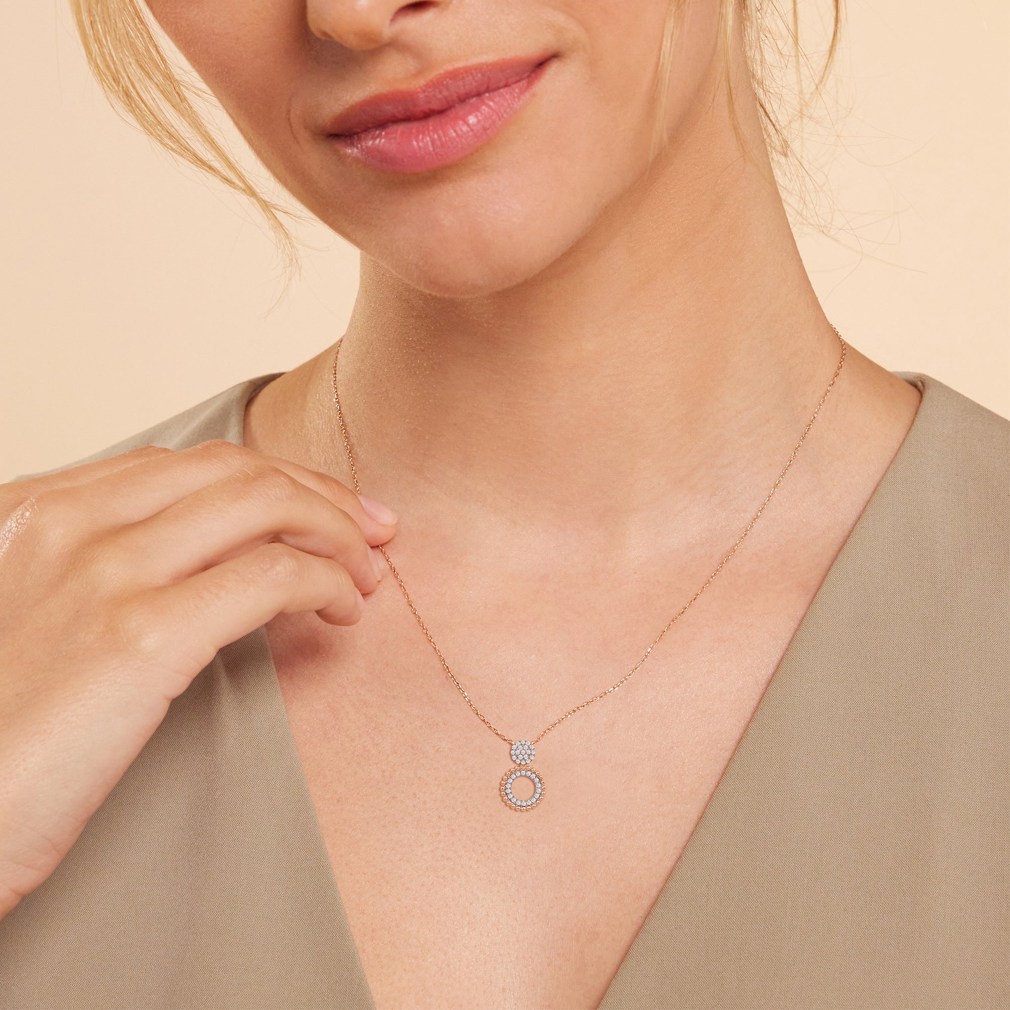 A diamond necklace that looks right with everything. This piece features a figure-8 pendant shining and shimmering in style. The pendant's top small circle is completely dressed with a cluster of diamonds while the bottom bigger circle has a concentric design with an inner ring of diamonds and an outer beaded ring in yellow gold.