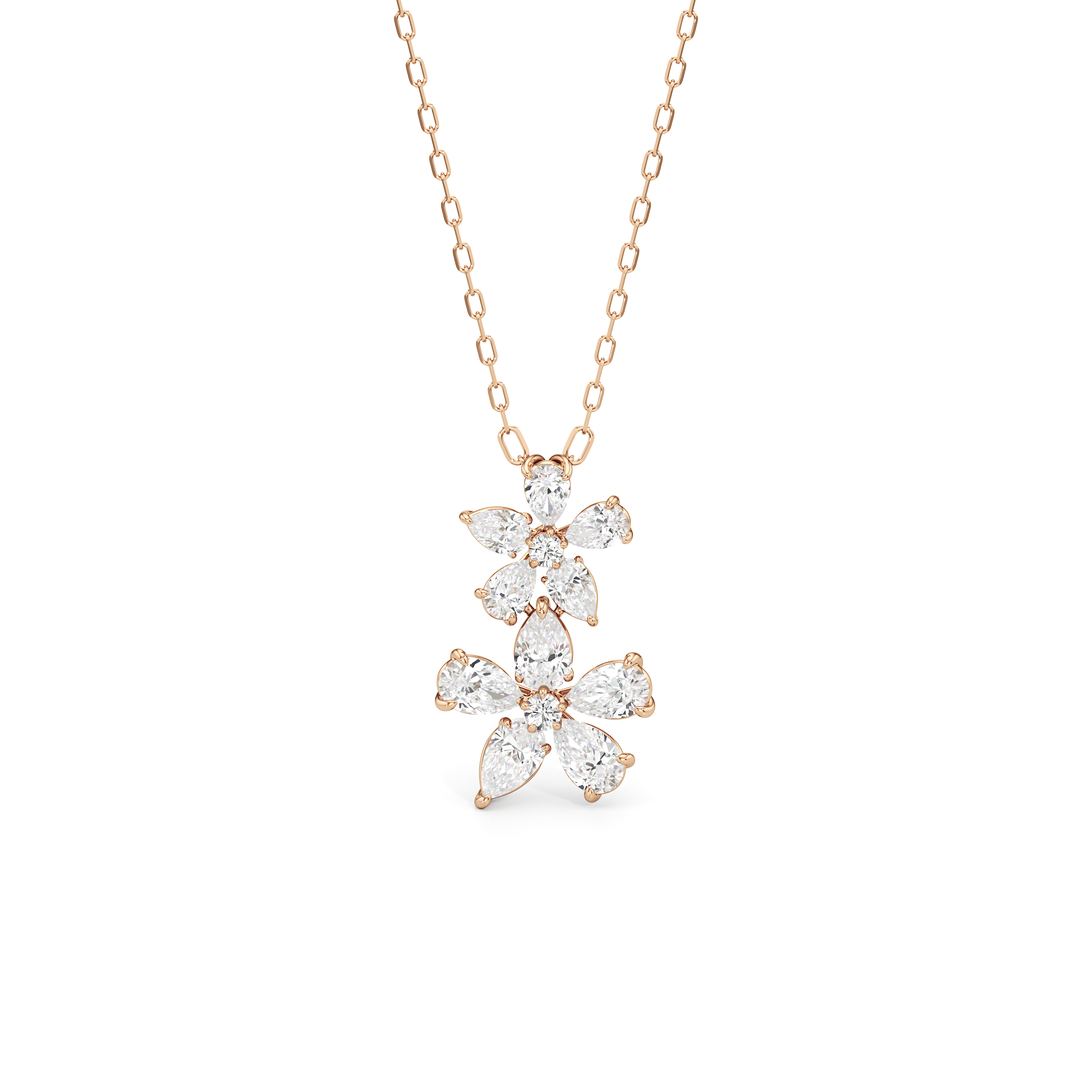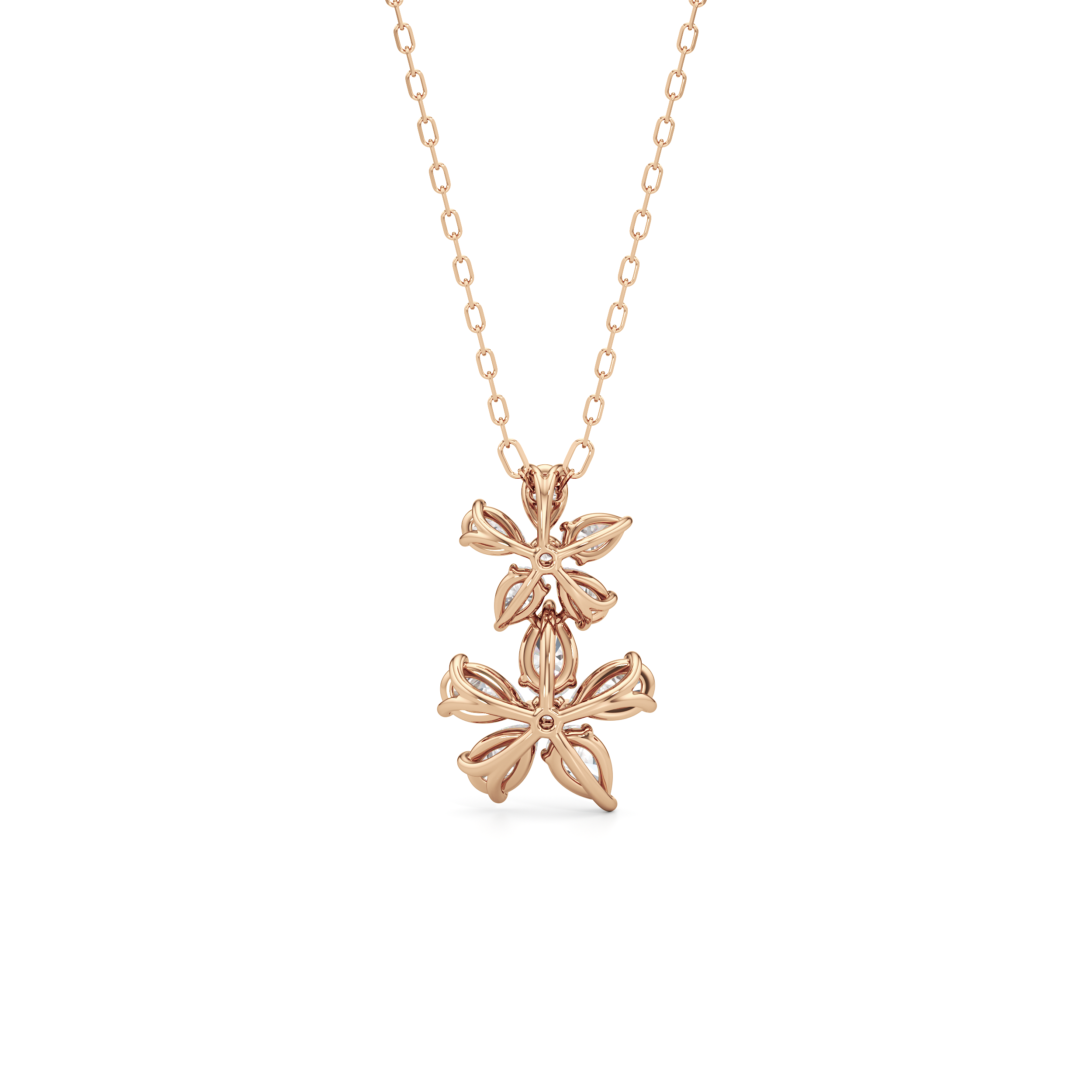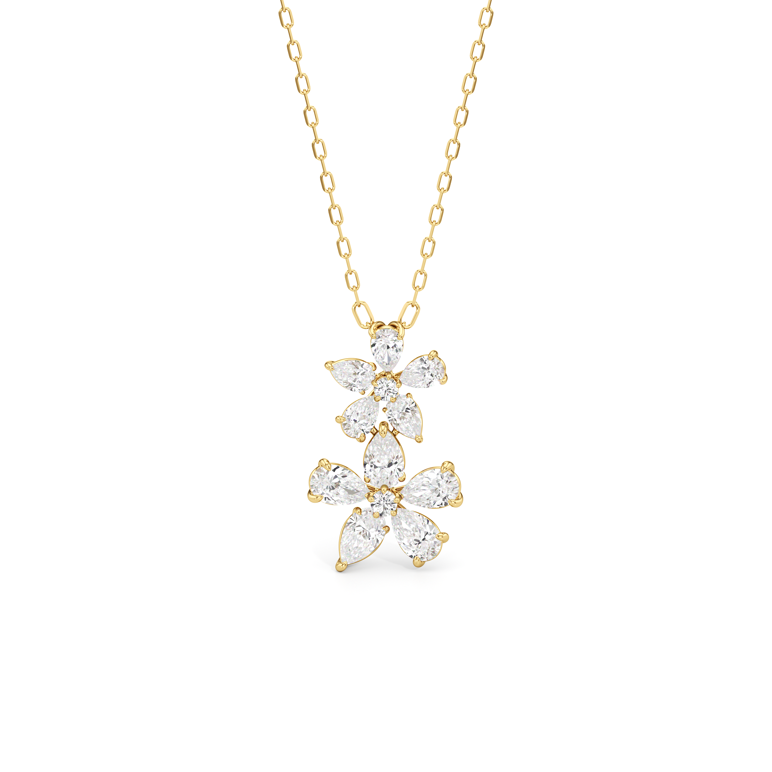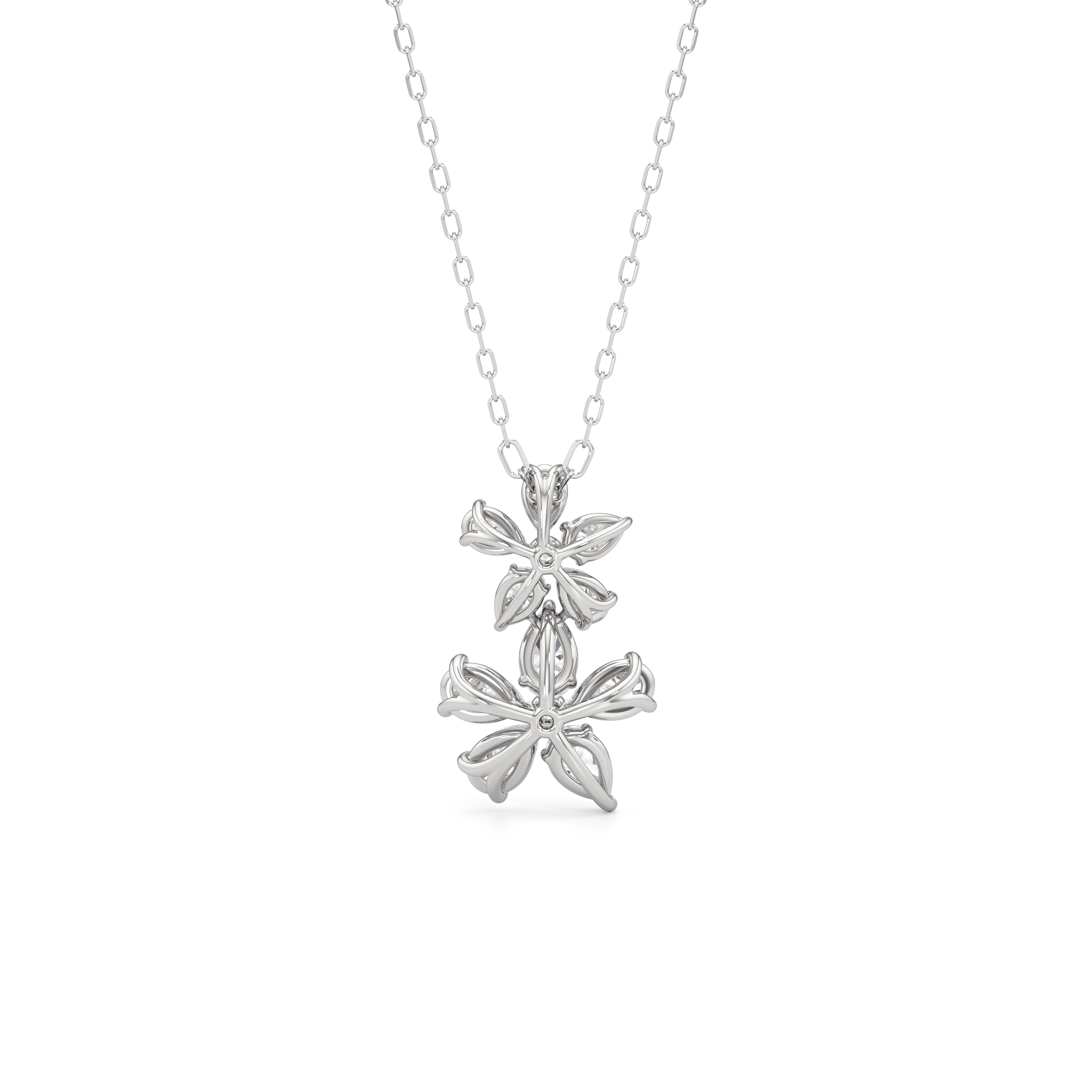 Inspired by the timeless charm of daisies, the Daisy Duet Diamond Pendant is a celebration of nature’s beauty and refined elegance. This enchanting piece features two five-petal diamond flowers, delicately clustered together in a cascading design. One dazzling bloom gracefully suspends below the other, creating a mesmerizing movement that catches the light from every angle. Each petal is encrusted with shimmering diamonds, radiating a soft yet striking glow, while the expertly crafted setting enhances their brilliance. Suspended from a fine chain, this pendant exudes a delicate yet luxurious appeal, making it a perfect statement piece for any occasion.
