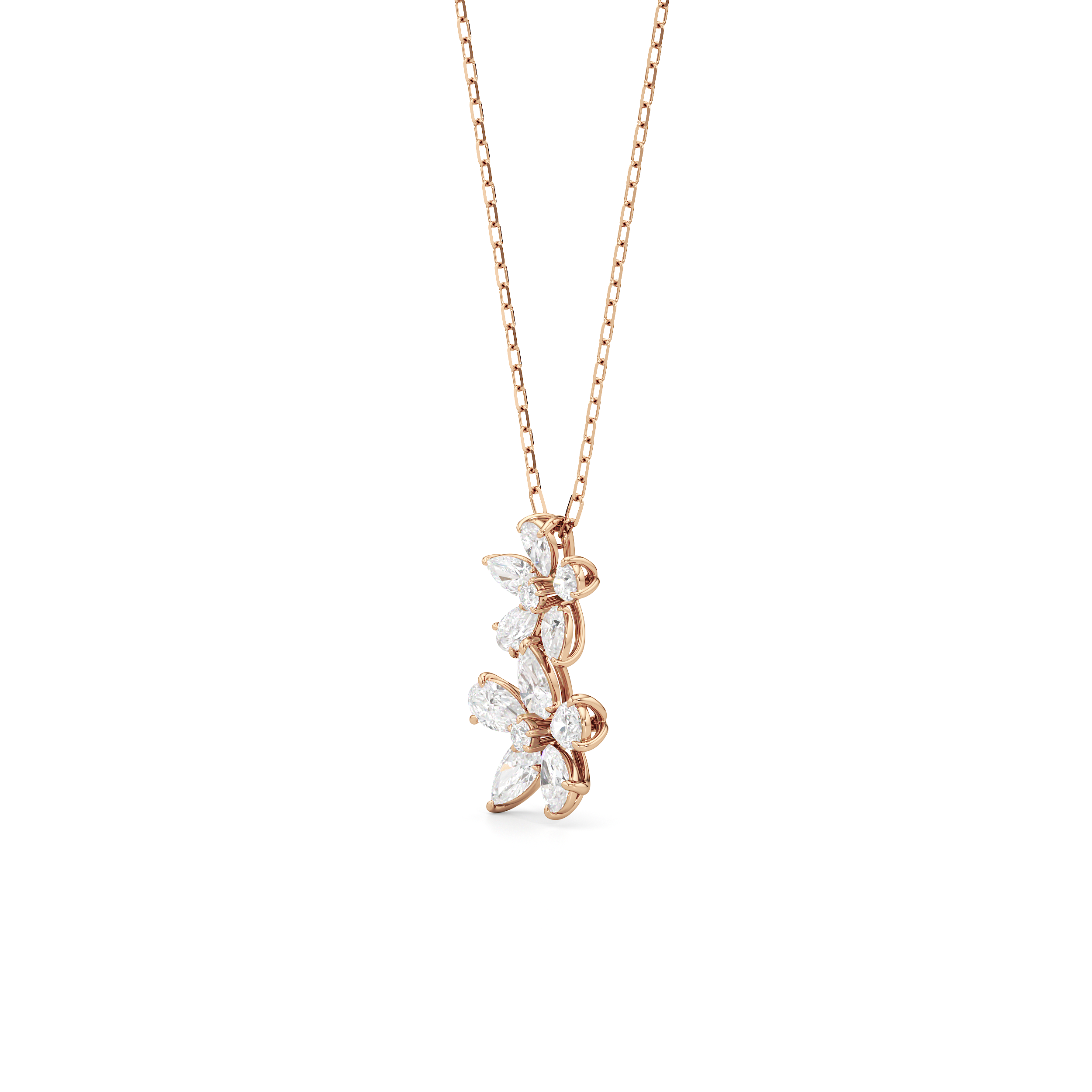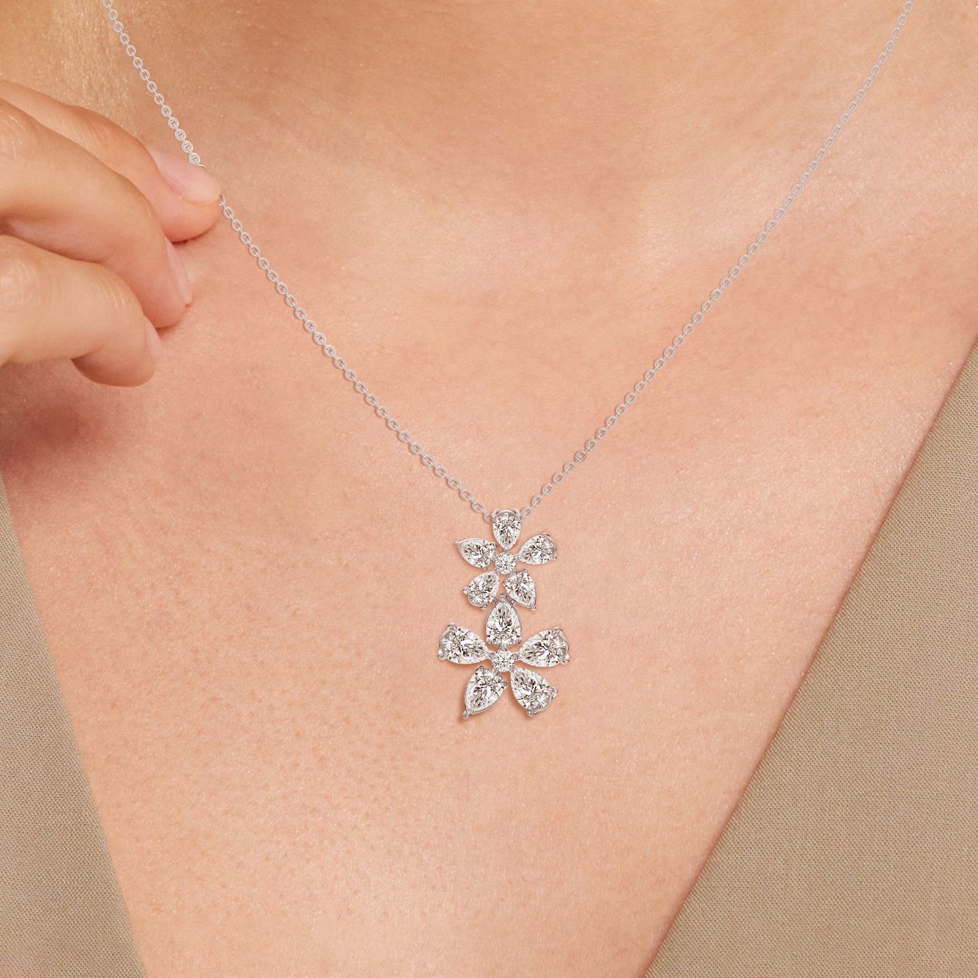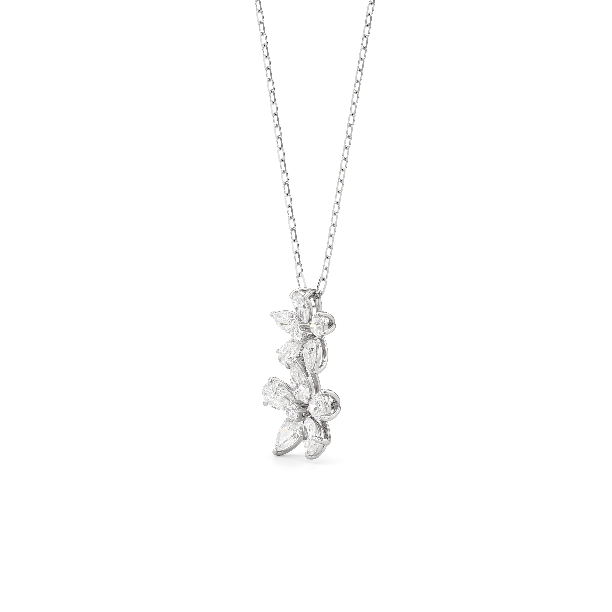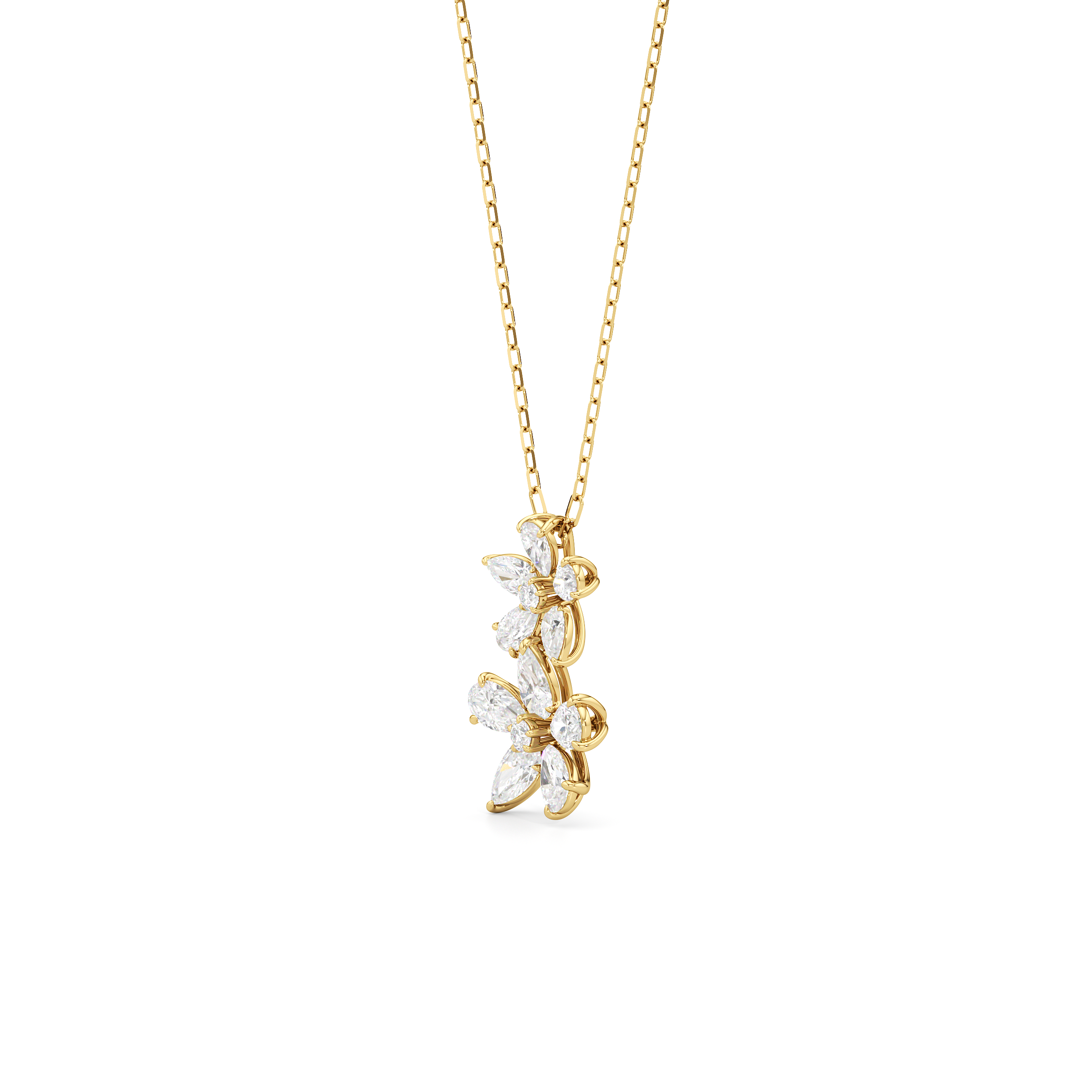 Inspired by the timeless charm of daisies, the Daisy Duet Diamond Pendant is a celebration of nature’s beauty and refined elegance. This enchanting piece features two five-petal diamond flowers, delicately clustered together in a cascading design. One dazzling bloom gracefully suspends below the other, creating a mesmerizing movement that catches the light from every angle. Each petal is encrusted with shimmering diamonds, radiating a soft yet striking glow, while the expertly crafted setting enhances their brilliance. Suspended from a fine chain, this pendant exudes a delicate yet luxurious appeal, making it a perfect statement piece for any occasion.