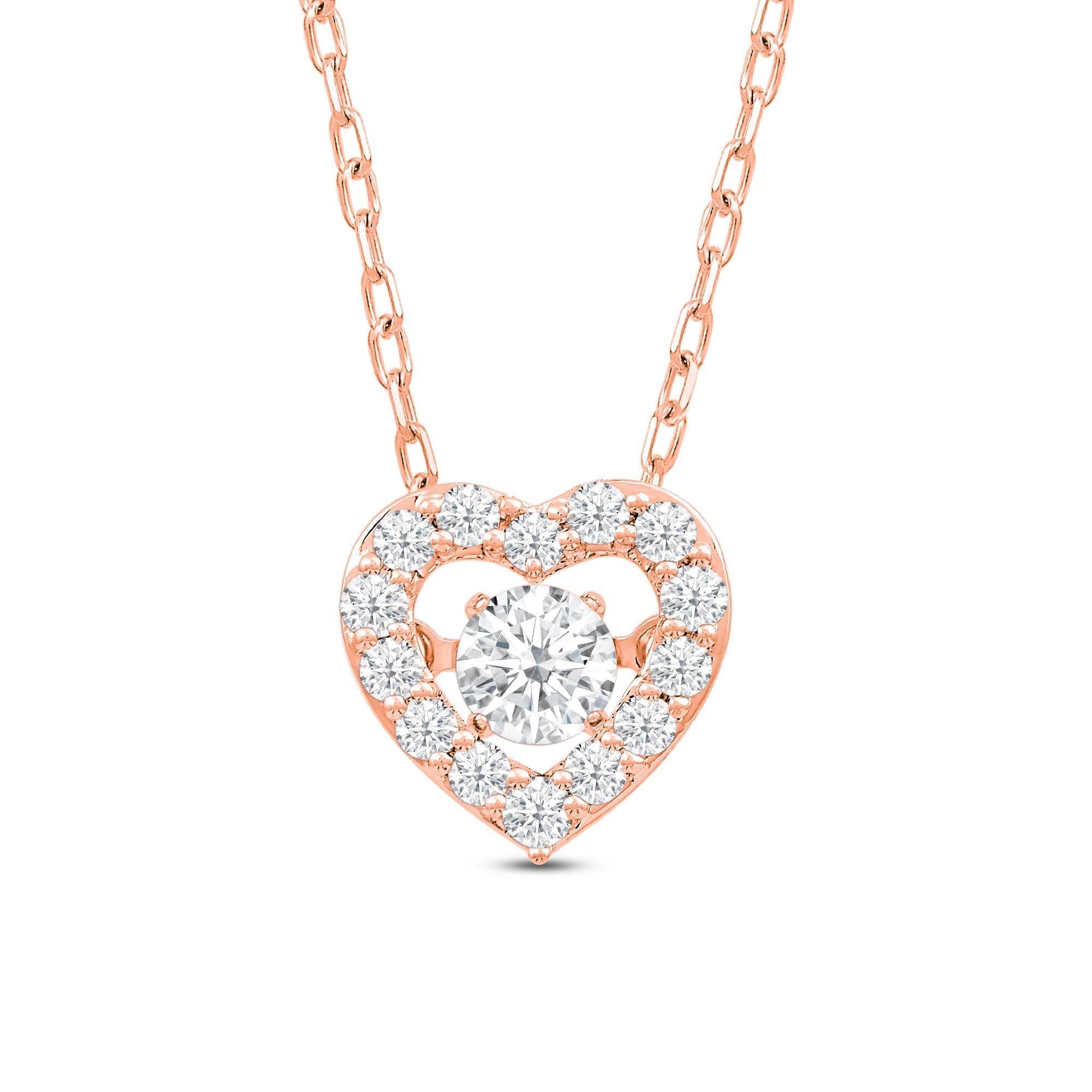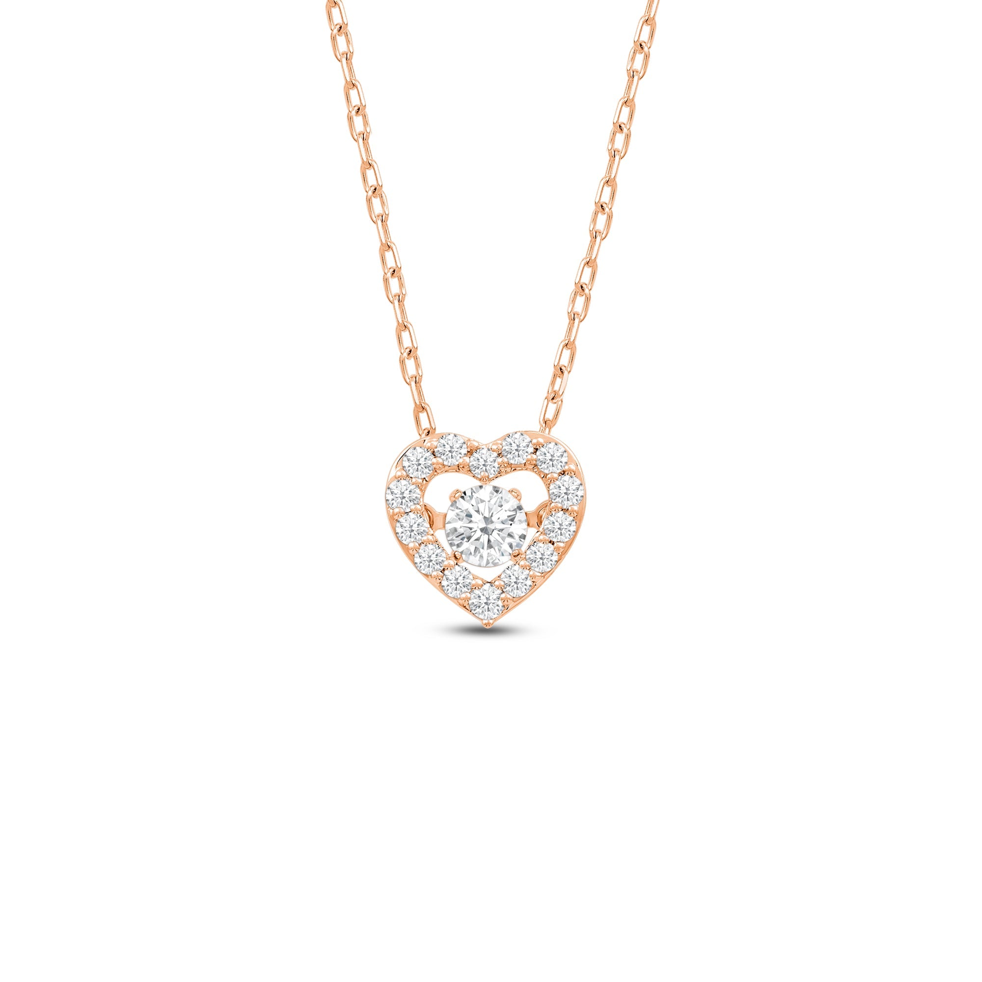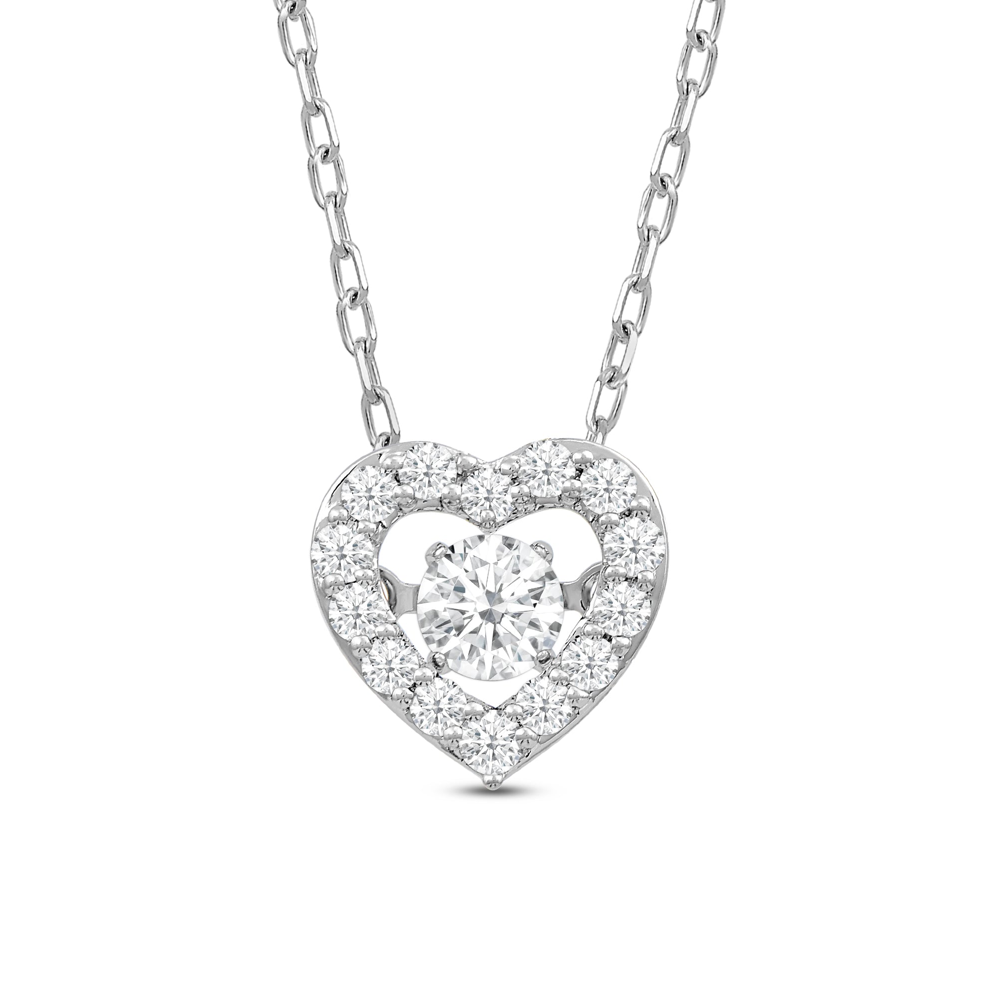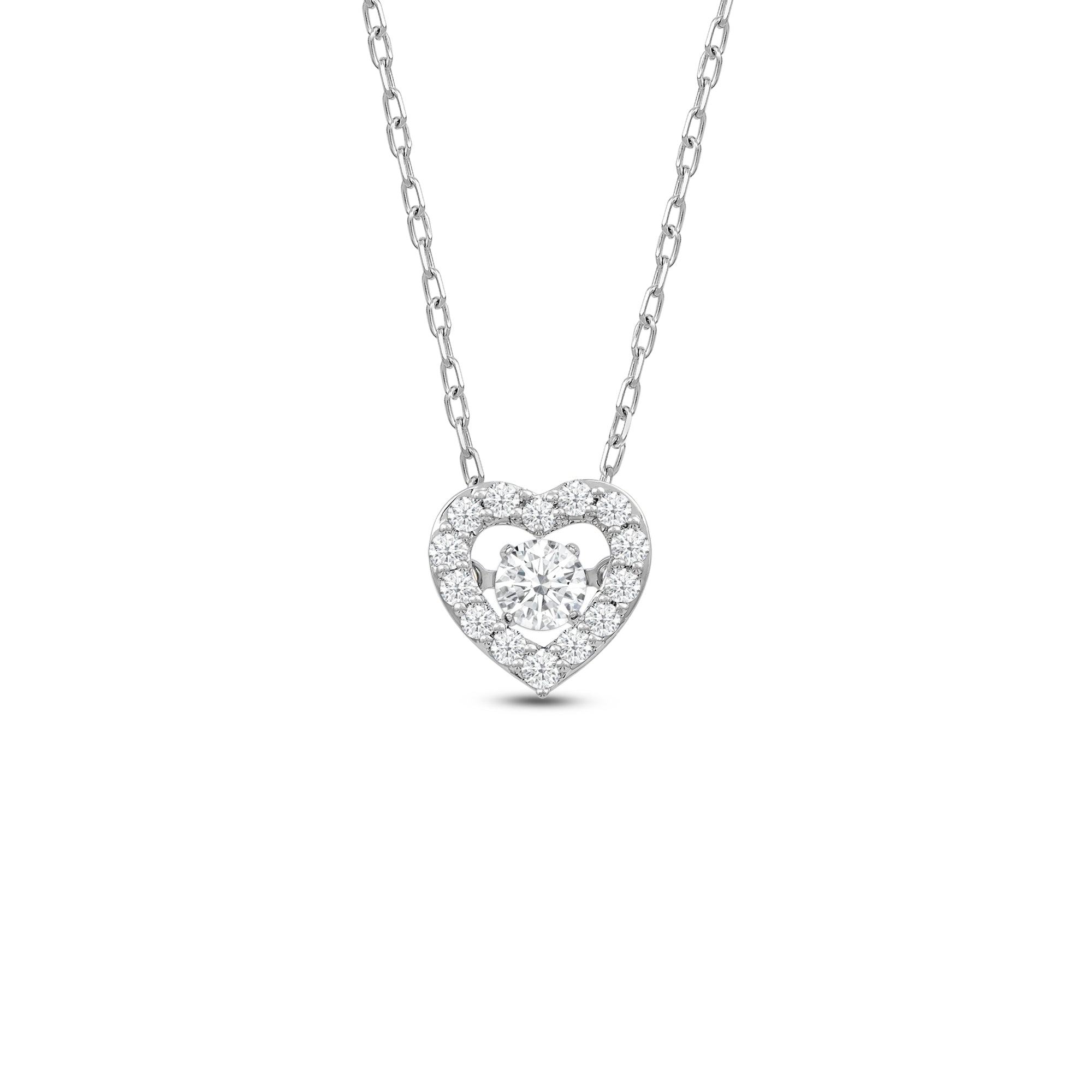 Basic with a sweet twist, this dancing diamond heart necklace will give your everyday wear an extra chic finish. The pendant features a heart-shaped outline traced with round diamonds. The open center is dotted with a single diamond suspended so that it doesn't touch the wearer's body. This diamond setting allows the diamond to "dance" or move at the slightest movement of the necklace and the wearer.