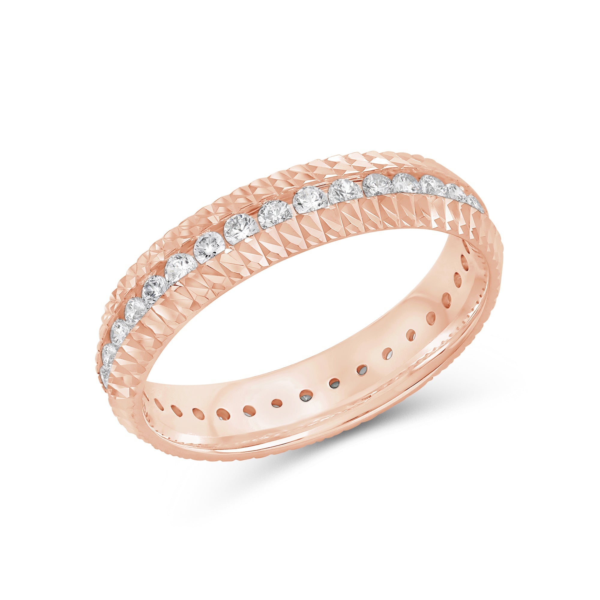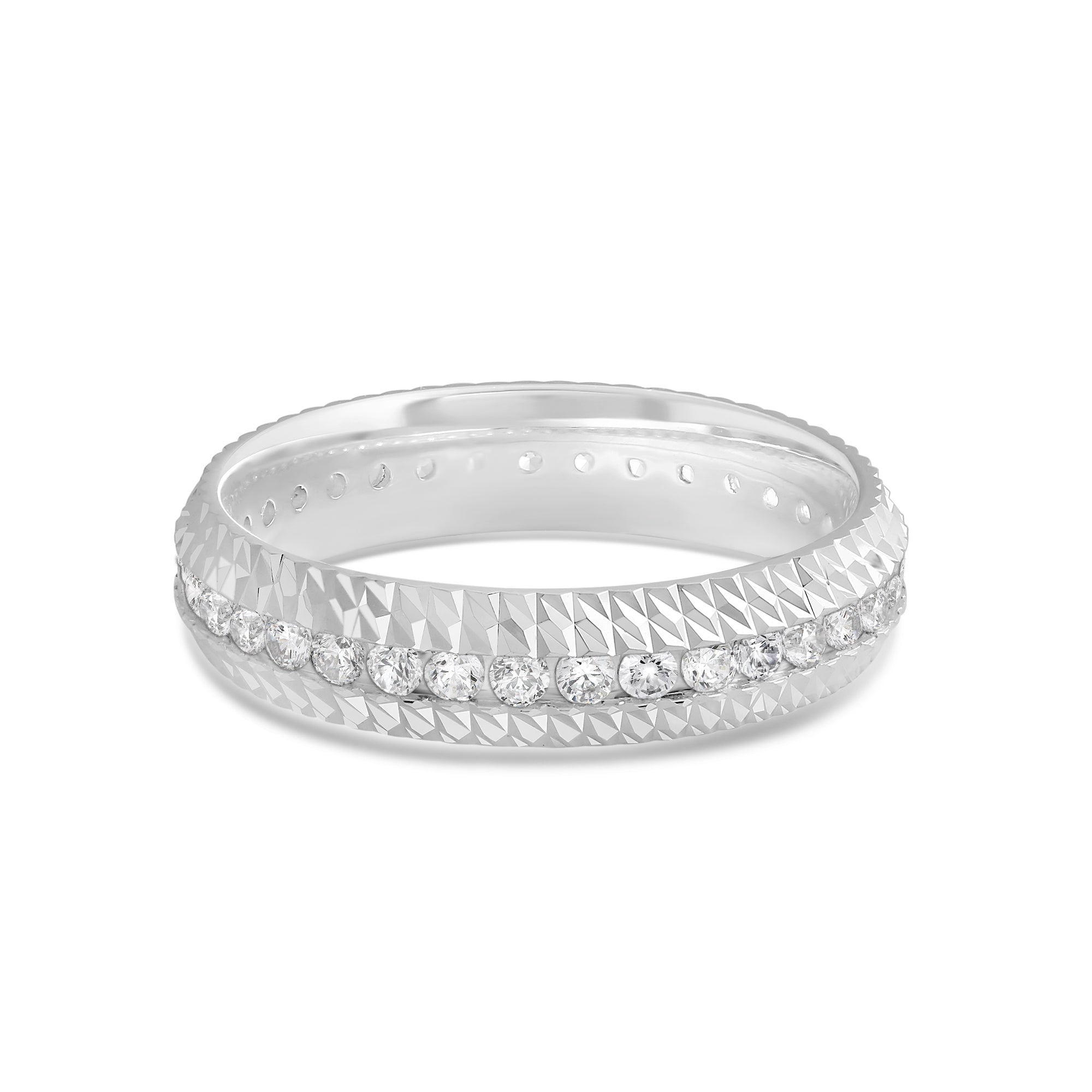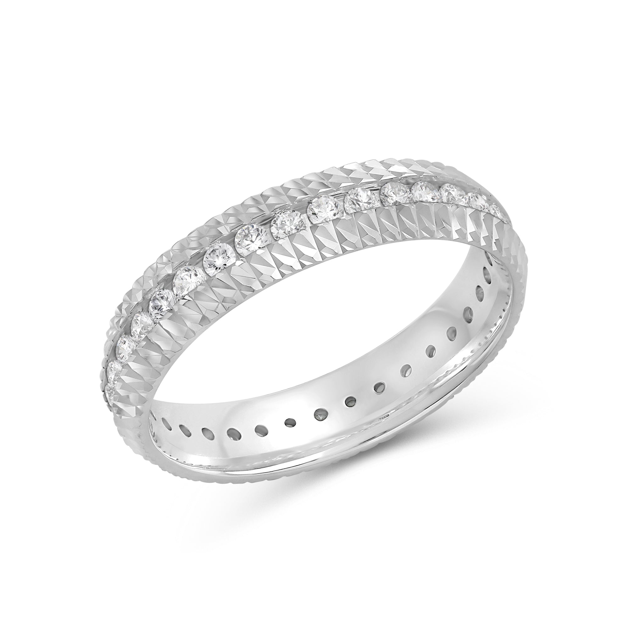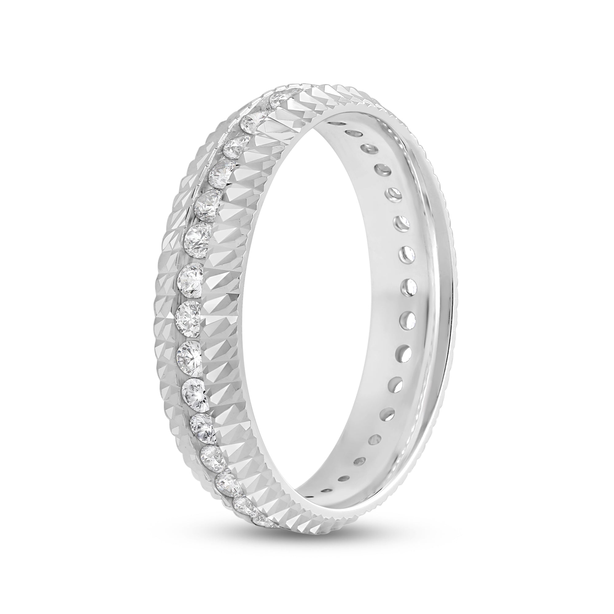 It's time to upgrade your bauble collection. You won't regret getting this band, uniquely forged with a diagonal pattern. Set in between the diagonally ridged edges of the ring is a circle of diamonds for a brilliant impression.
