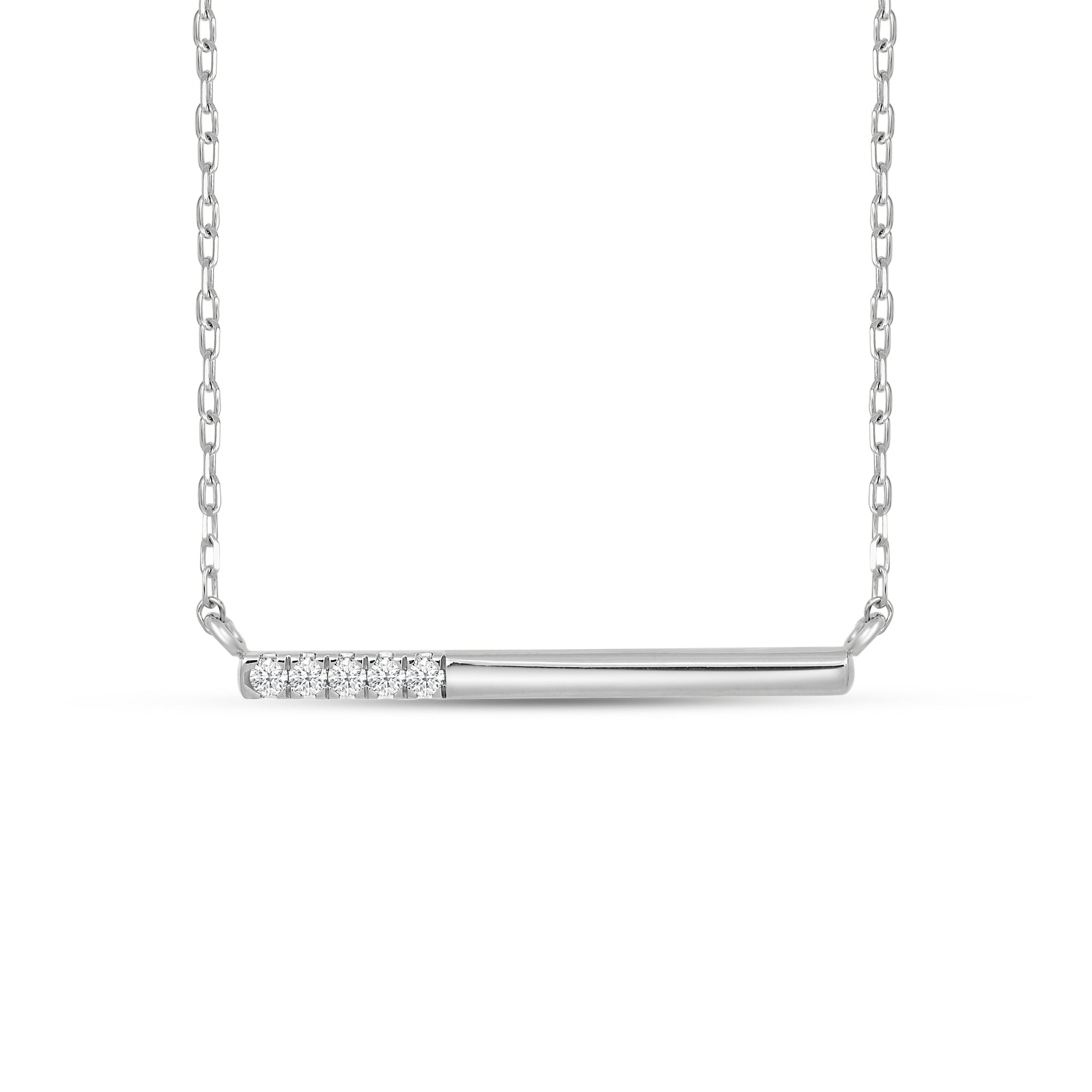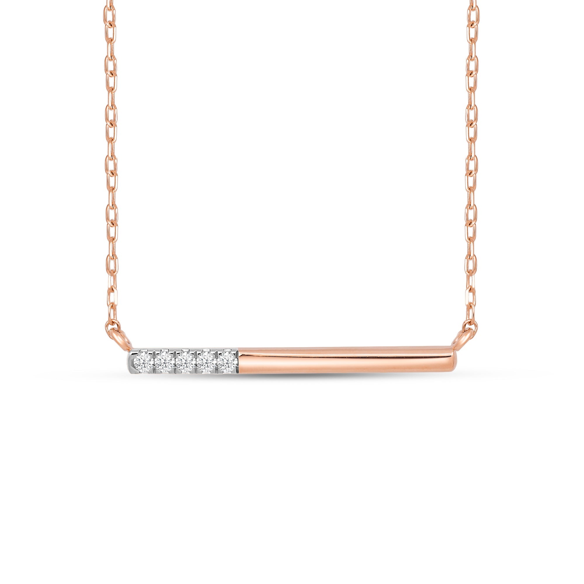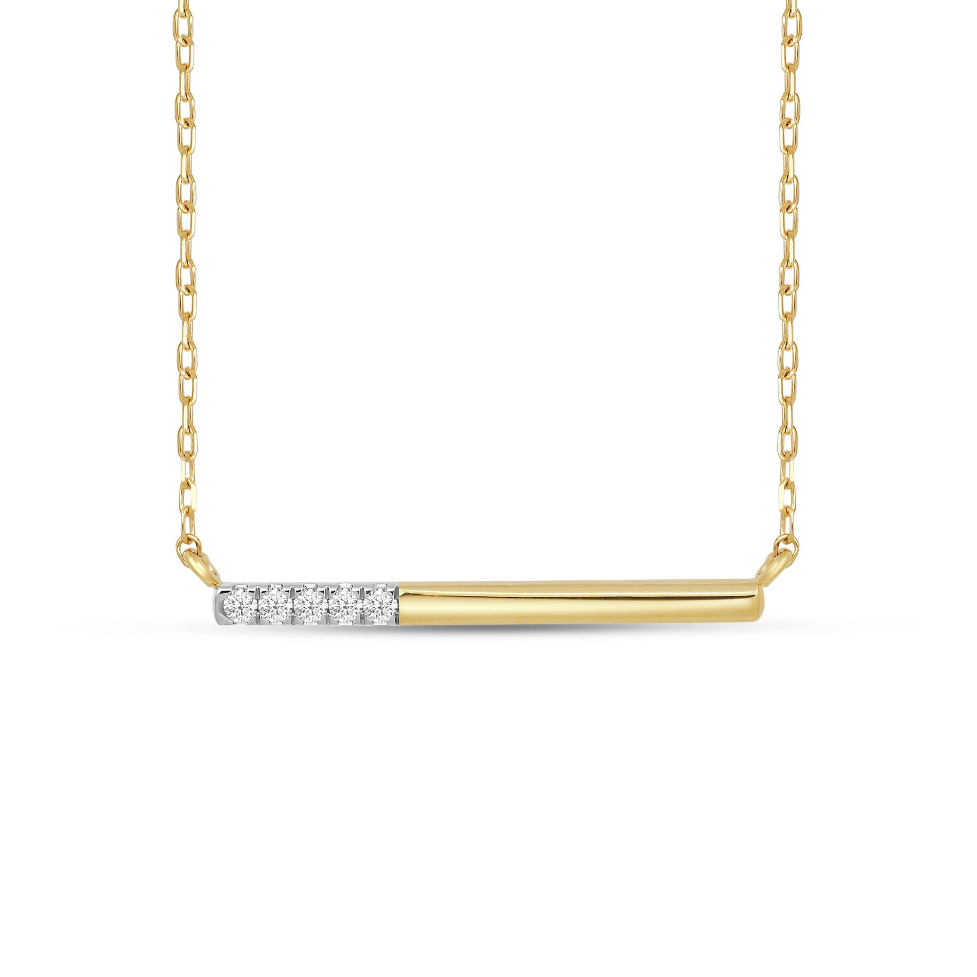 This studded bar pendant shines to prove that less is more. Measuring just an inch long is a slender bar in polished gold, with a portion decorated with brilliant diamonds. The quiet elegance of this piece is enough to take any outfit from drab to fab.