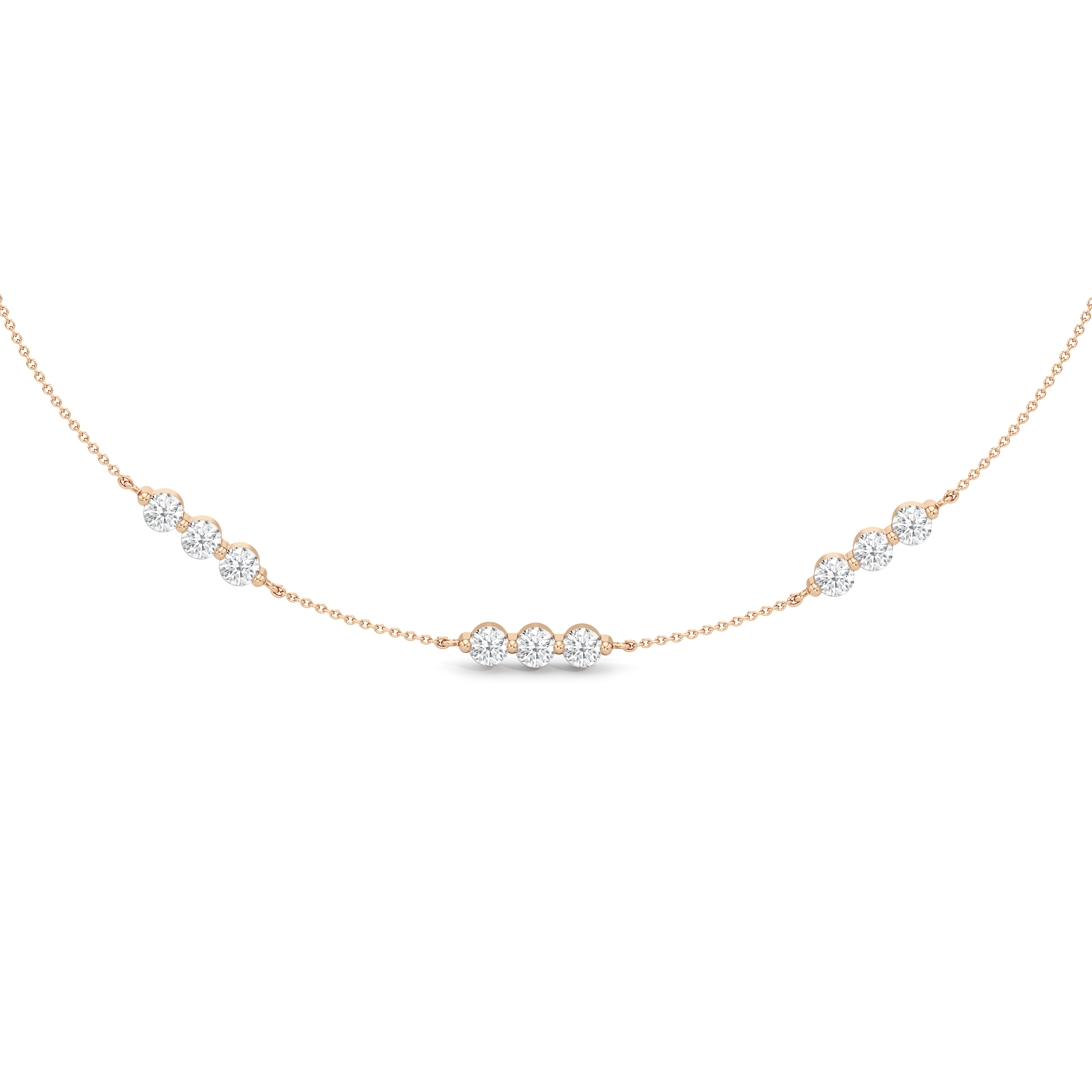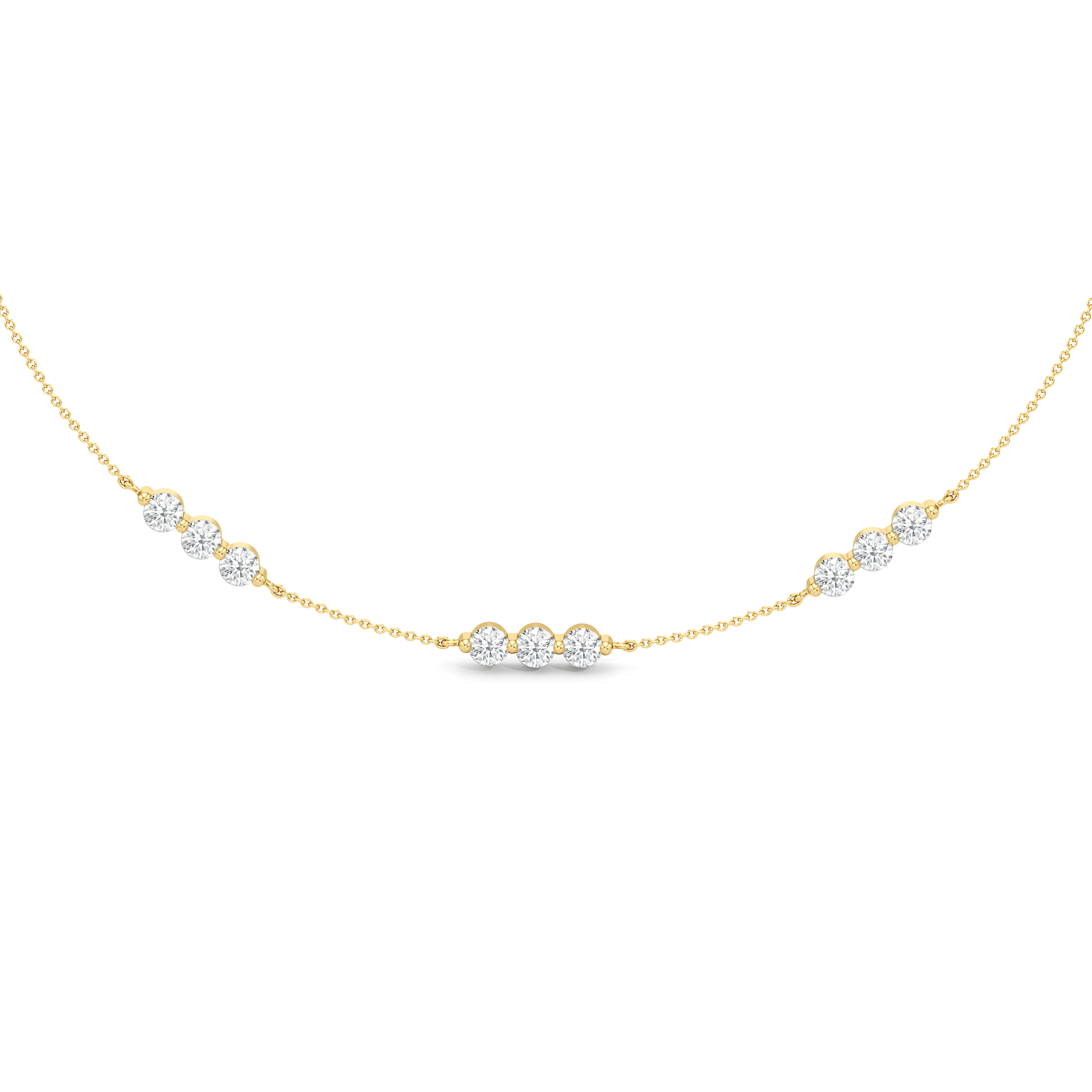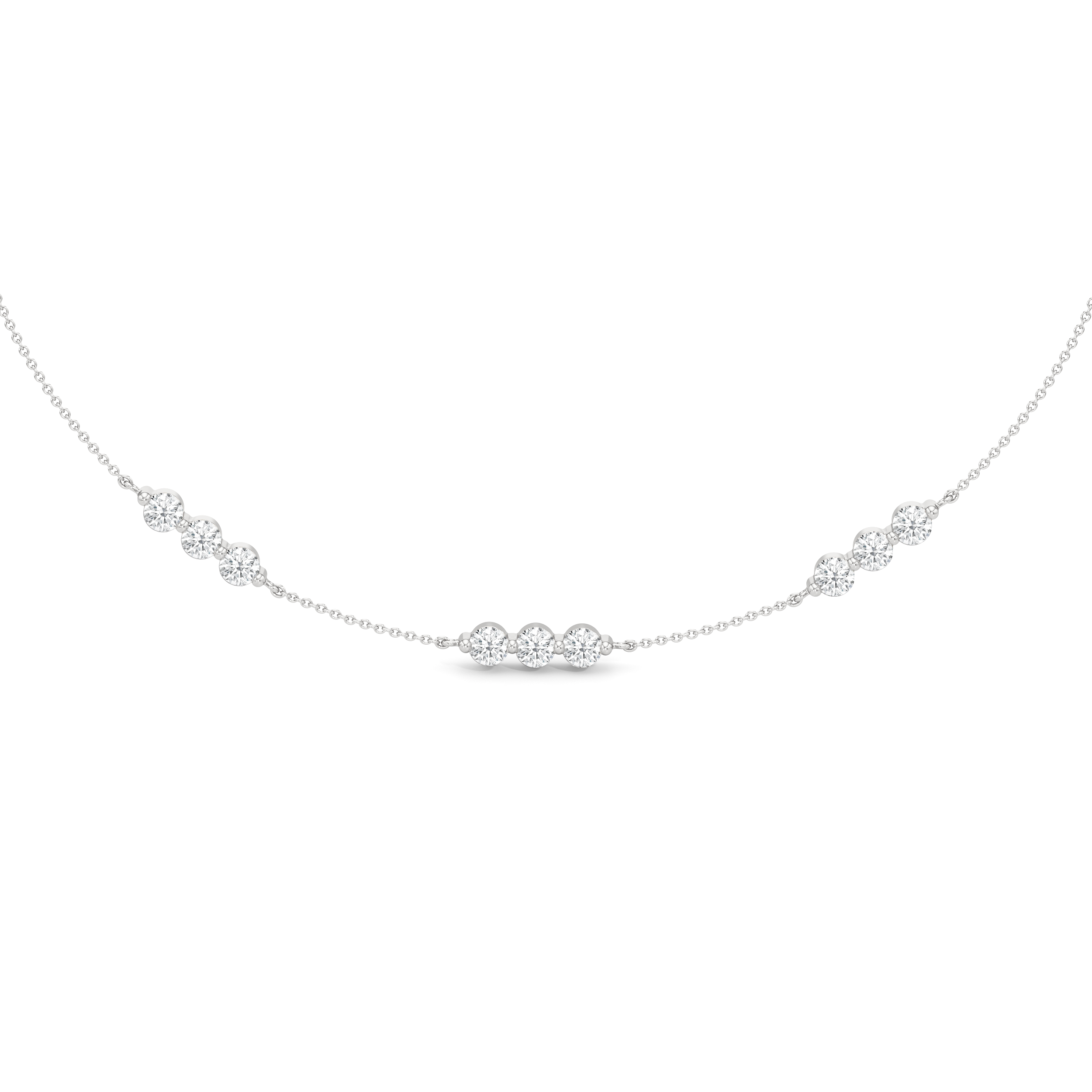 On a delicate cable chain are trios of diamonds on shared prongs, positioned on evenly spaced stations. Of subtle yet captivating radiance, here is a necklace of modern simplicity perfect for everyday wear and special occasions.