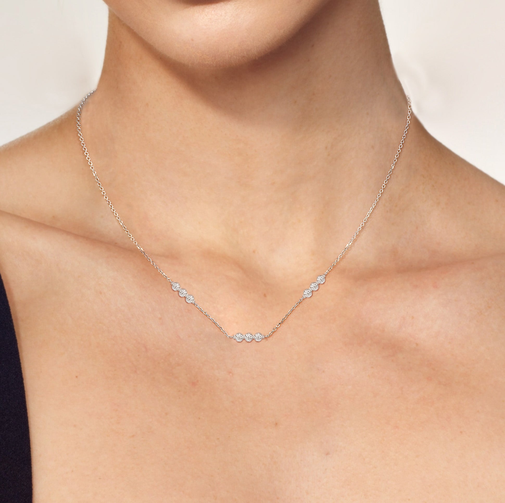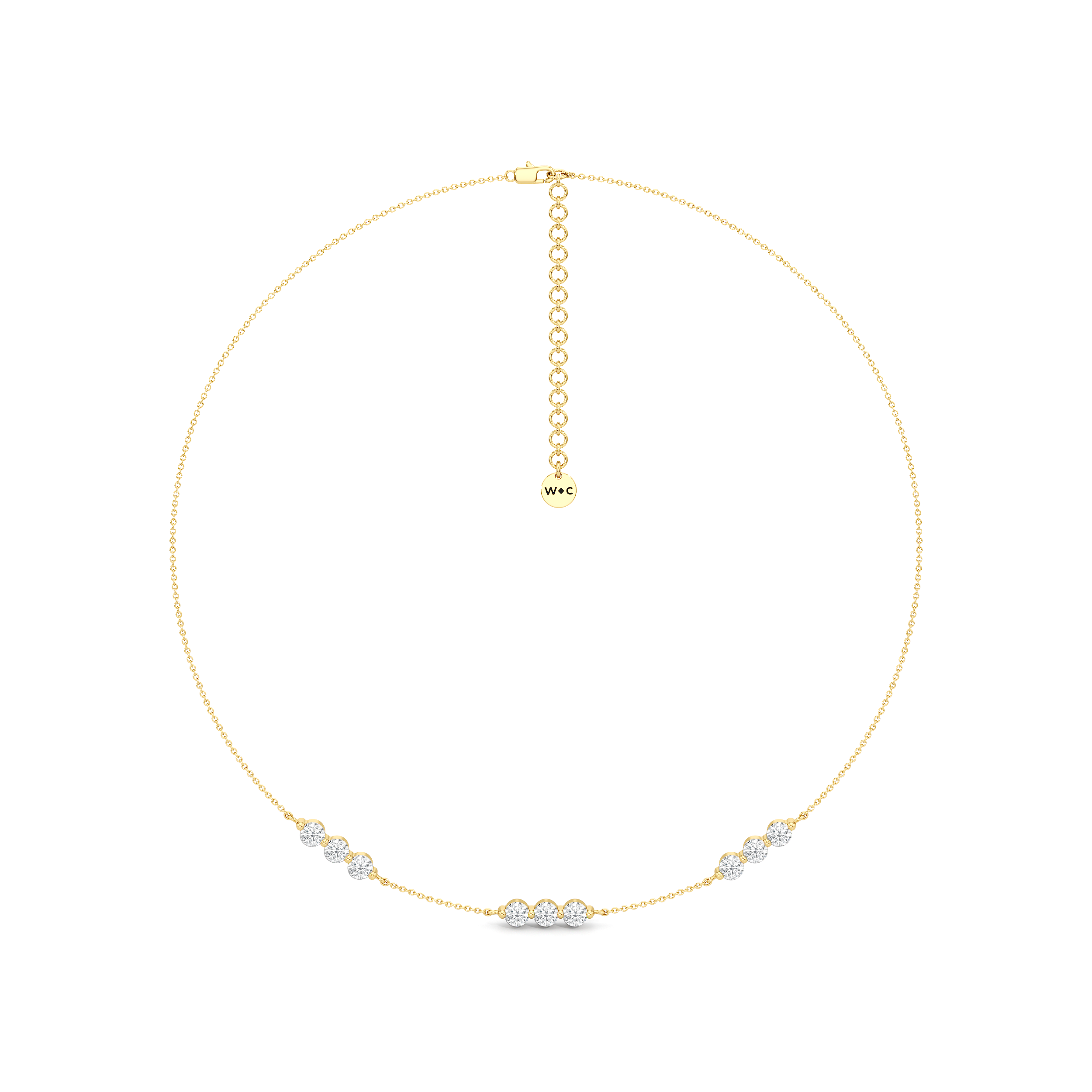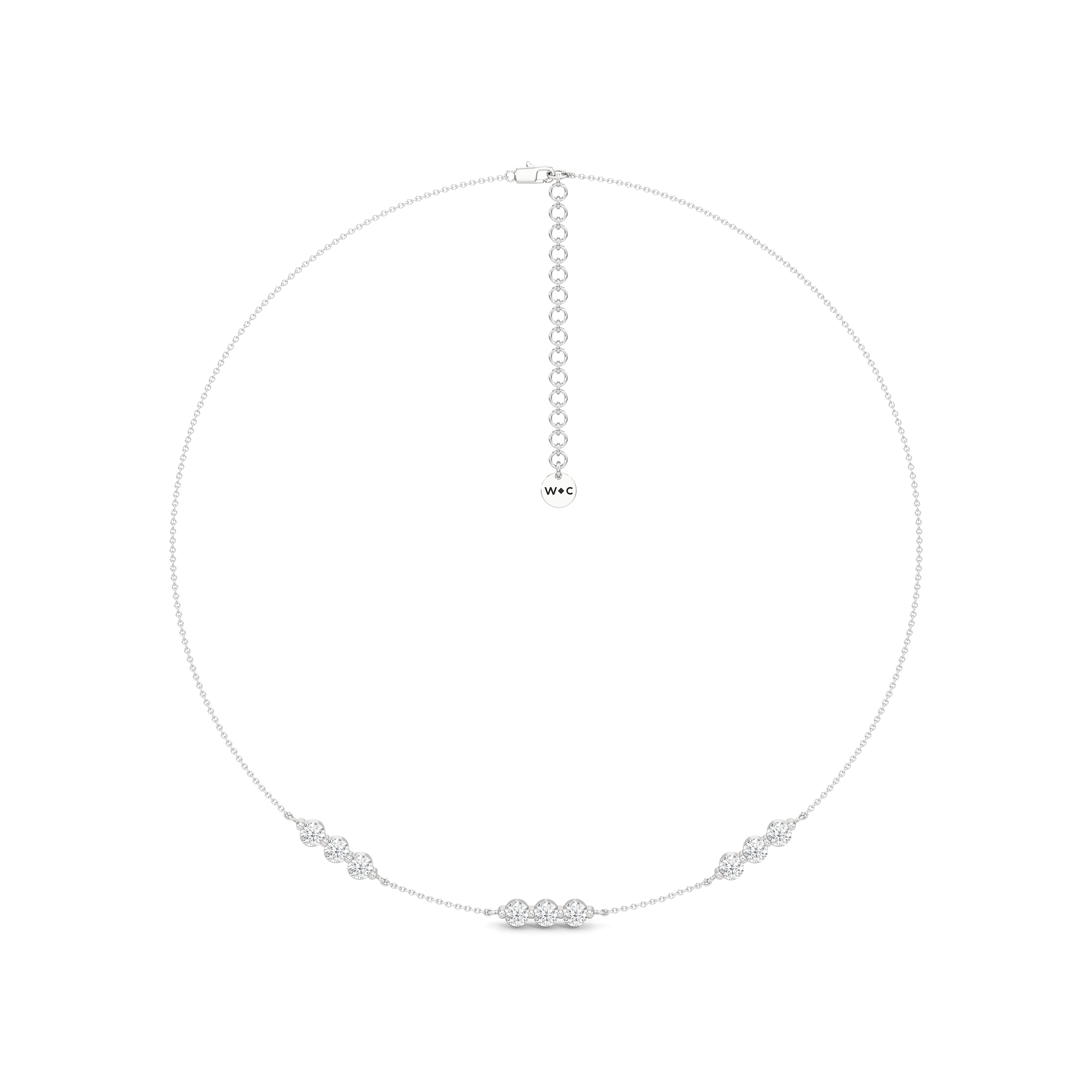 On a delicate cable chain are trios of diamonds on shared prongs, positioned on evenly spaced stations. Of subtle yet captivating radiance, here is a necklace of modern simplicity perfect for everyday wear and special occasions.