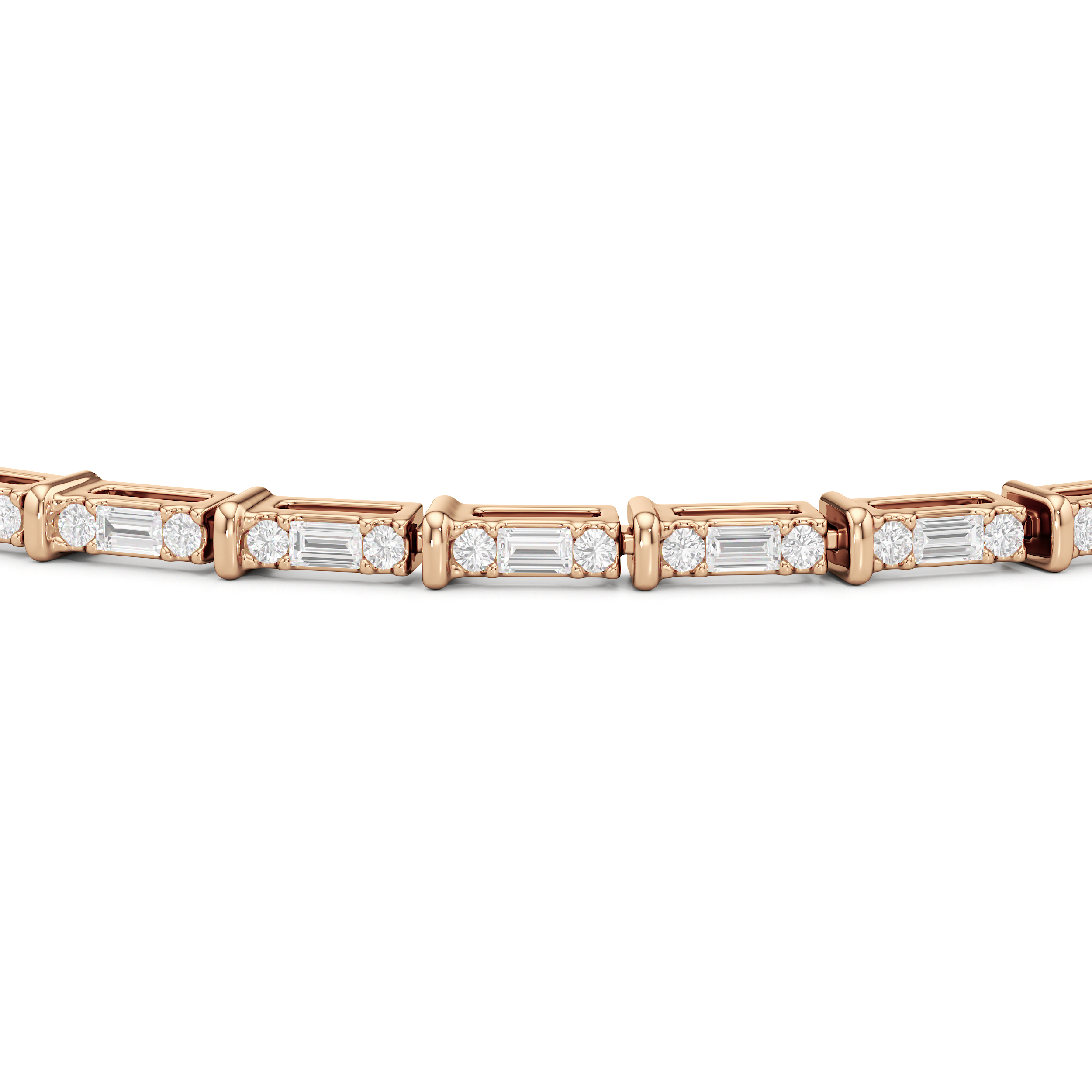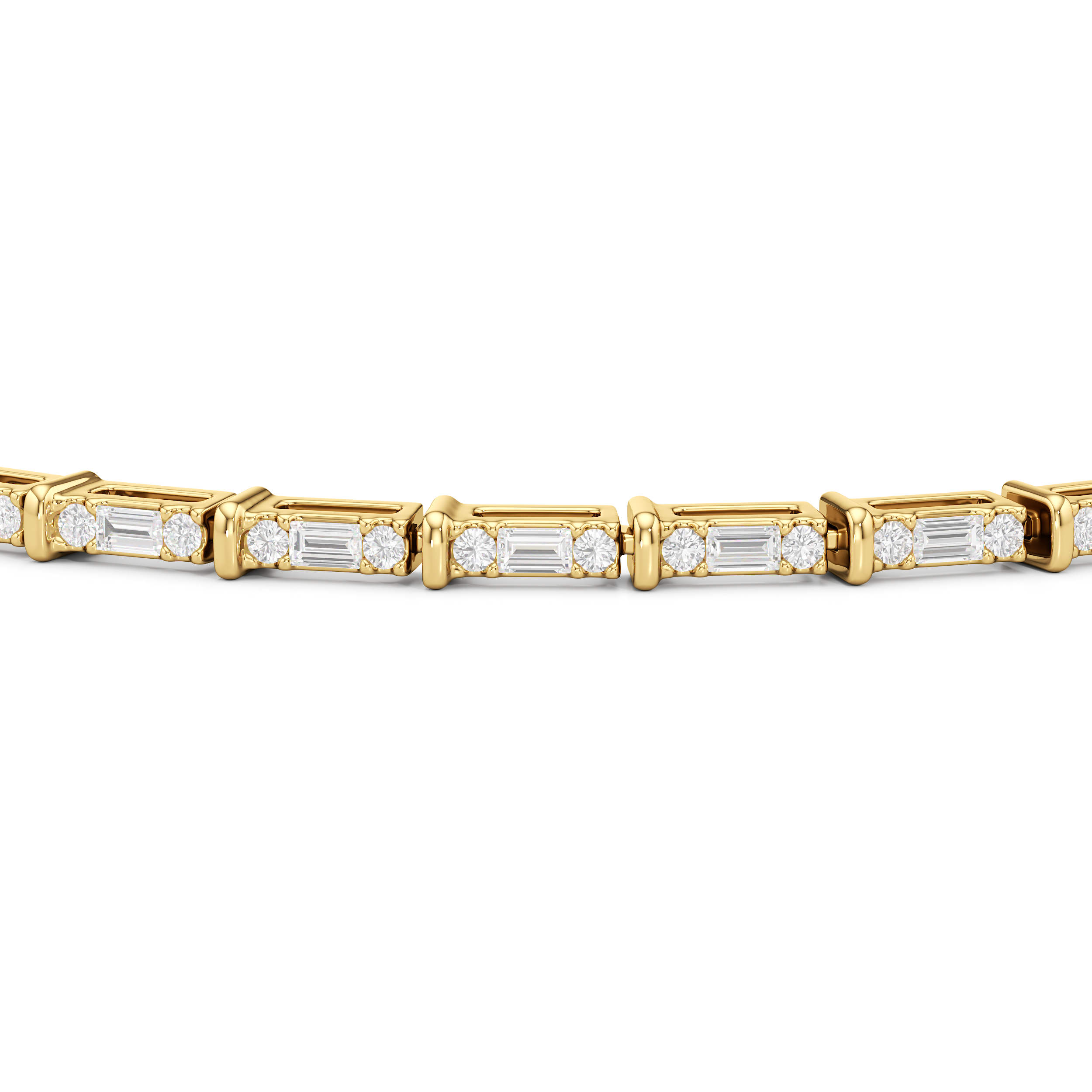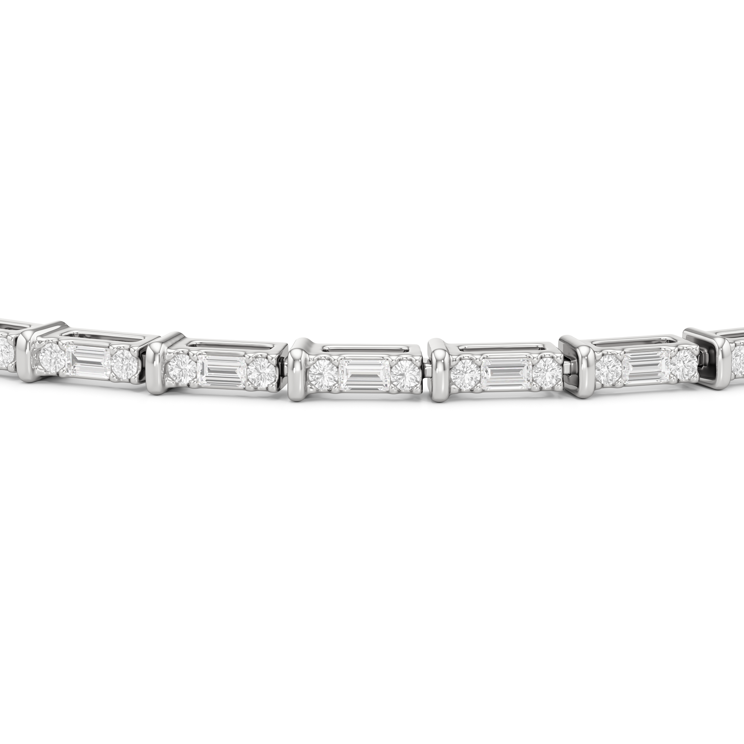 An essential statement piece perfectly styled for those who appreciate refined glamour. Duos of round diamonds are set in between duos of baguette diamonds in an east-west setting, forming a continuous line of brilliant bars that create a graceful sequence of sparkle and structure.