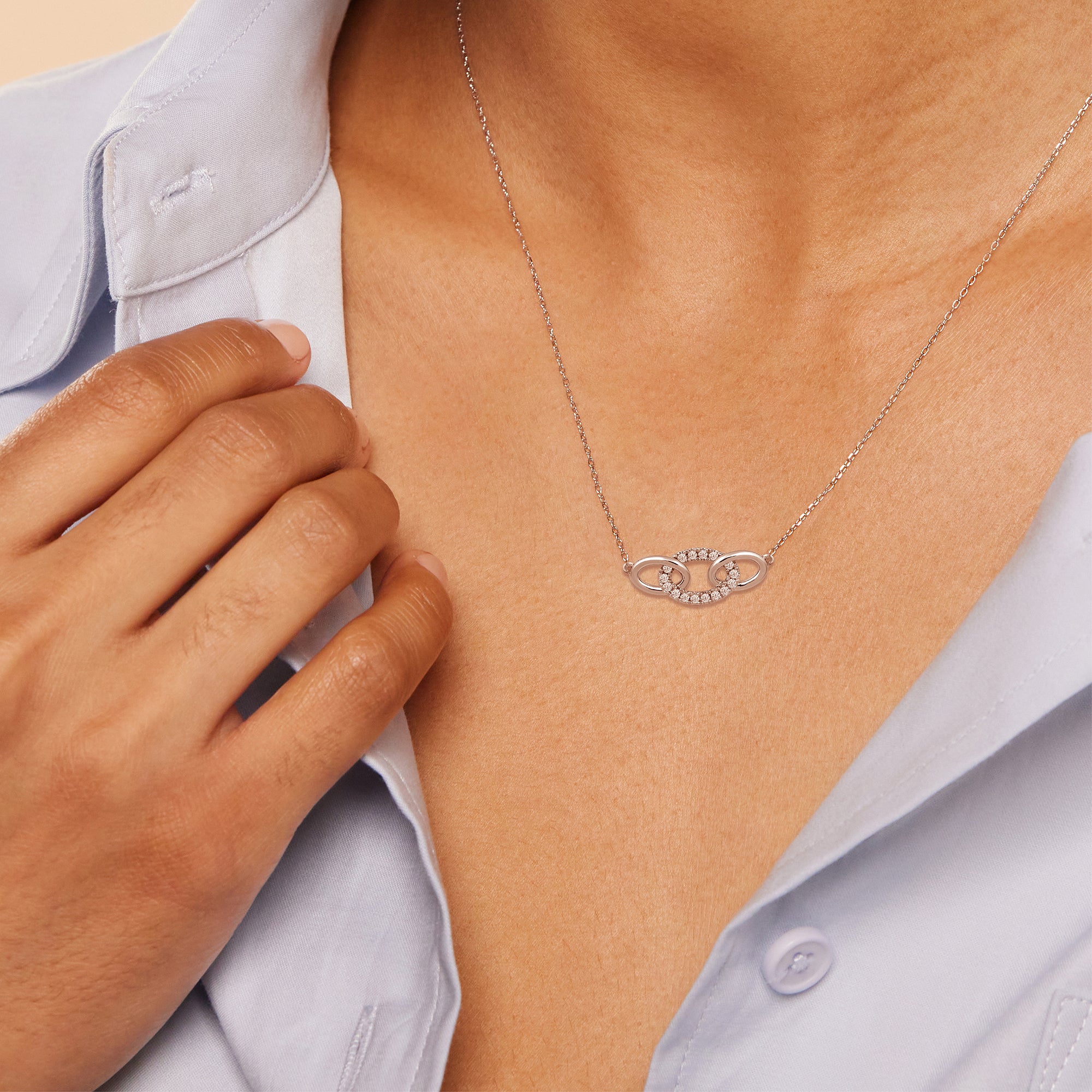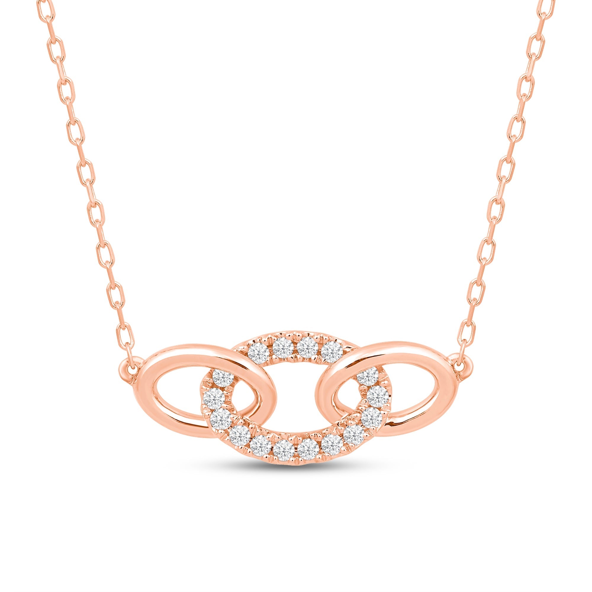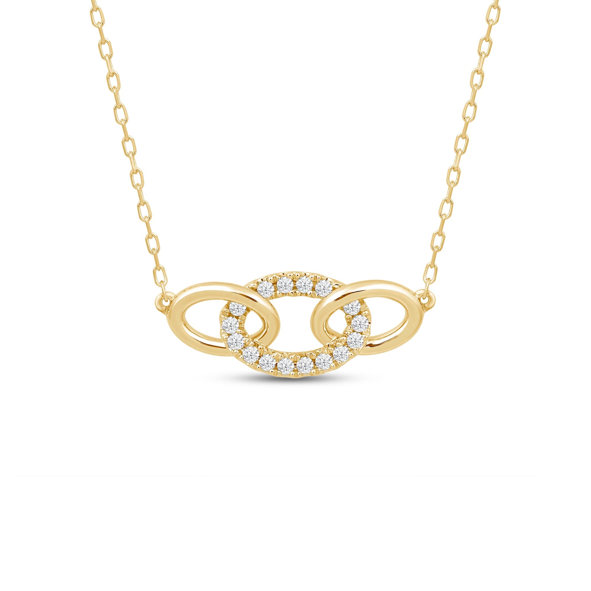 A delicate and subtle link necklace to infuse your looks with easy elegance. This piece features three oval links in a vertical or east-west layout. The central and bigger oval link is dressed with 0.16 ct diamonds that deliver a graceful barely-there sparkle suitable for everyday fashion.