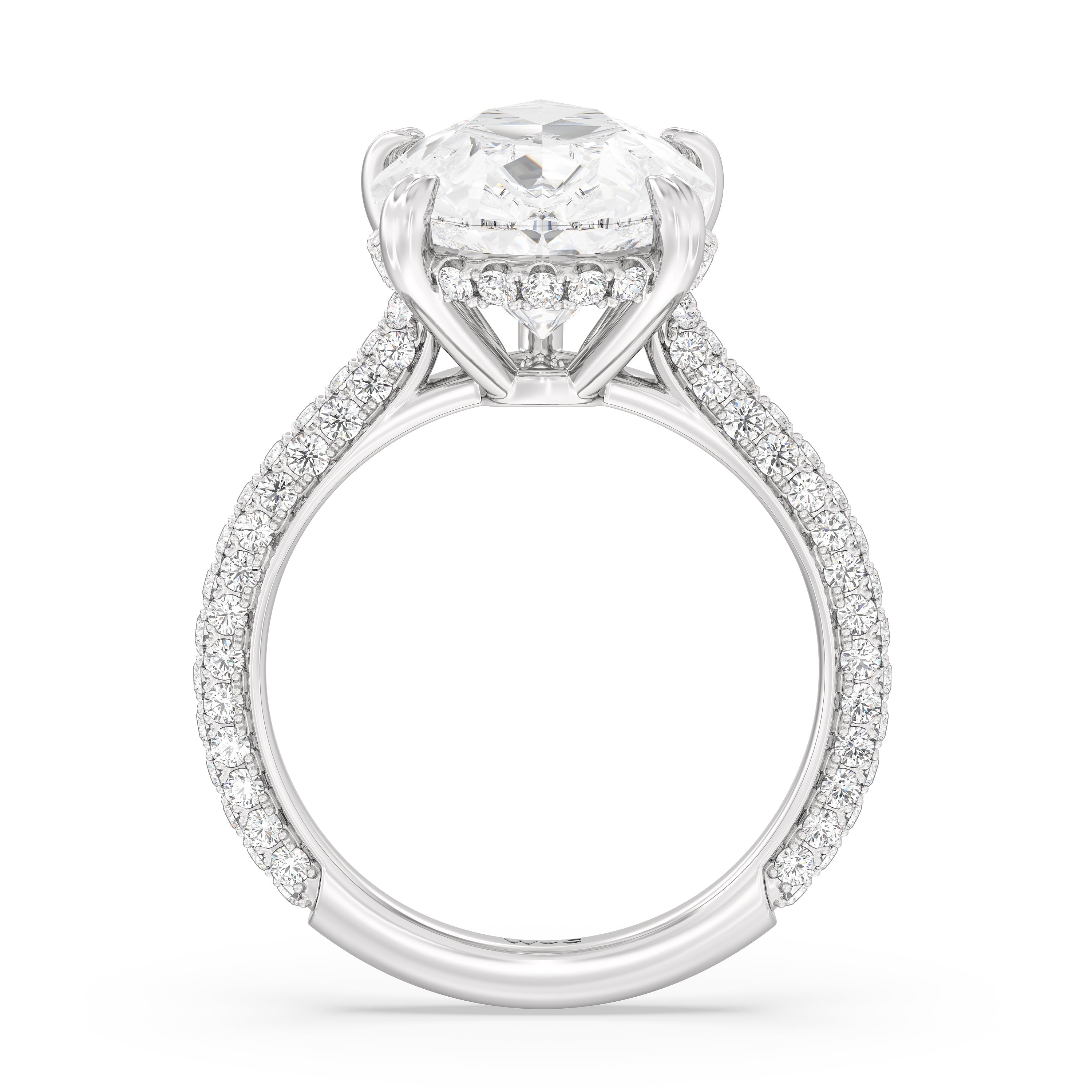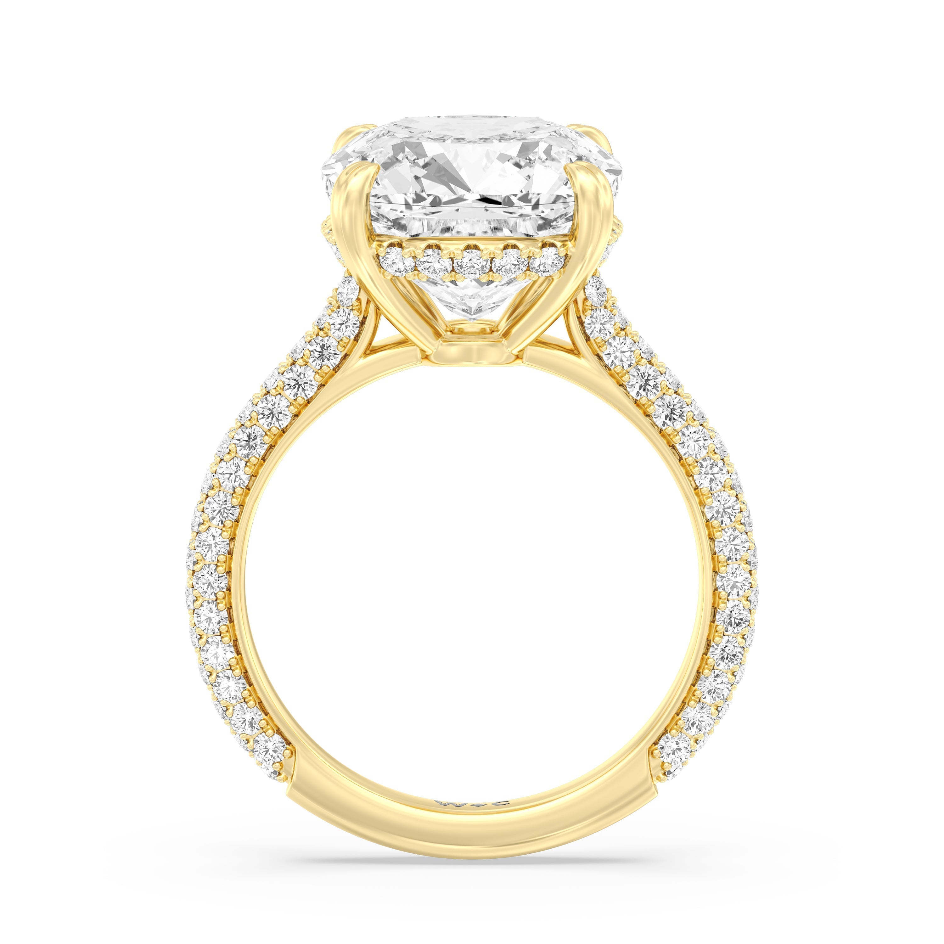 Dazzle her with the enchanting refinement of this luxury diamond engagement ring. This design showcases a center diamond securely mounted in a 4-prong double claw basket with a glittering hidden halo, ensuring brilliance from every angle. The cathedral shank's arching shoulders are adorned with a triple row of diamonds, elegantly cascading three-fourths of the way around the band. A dome pavé shank enhances the rings radiance, offering a balance of grandeur and quiet luxury. This hidden halo engagement ring defines sophistication is finished with claw prongs for a refined touch.