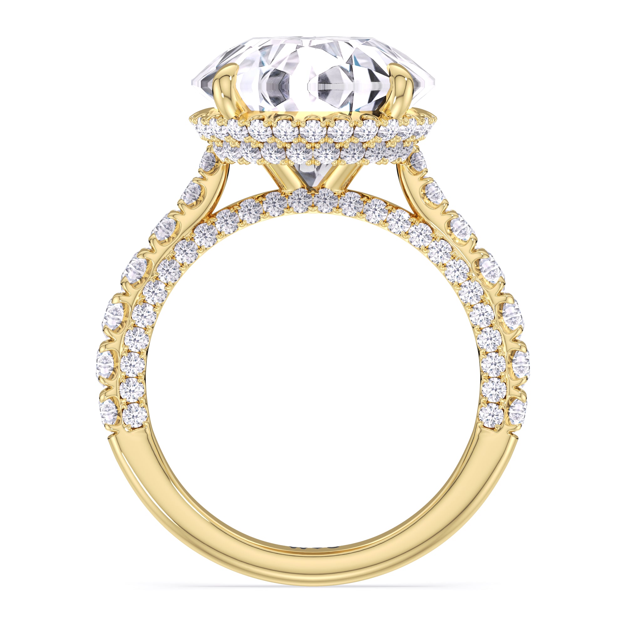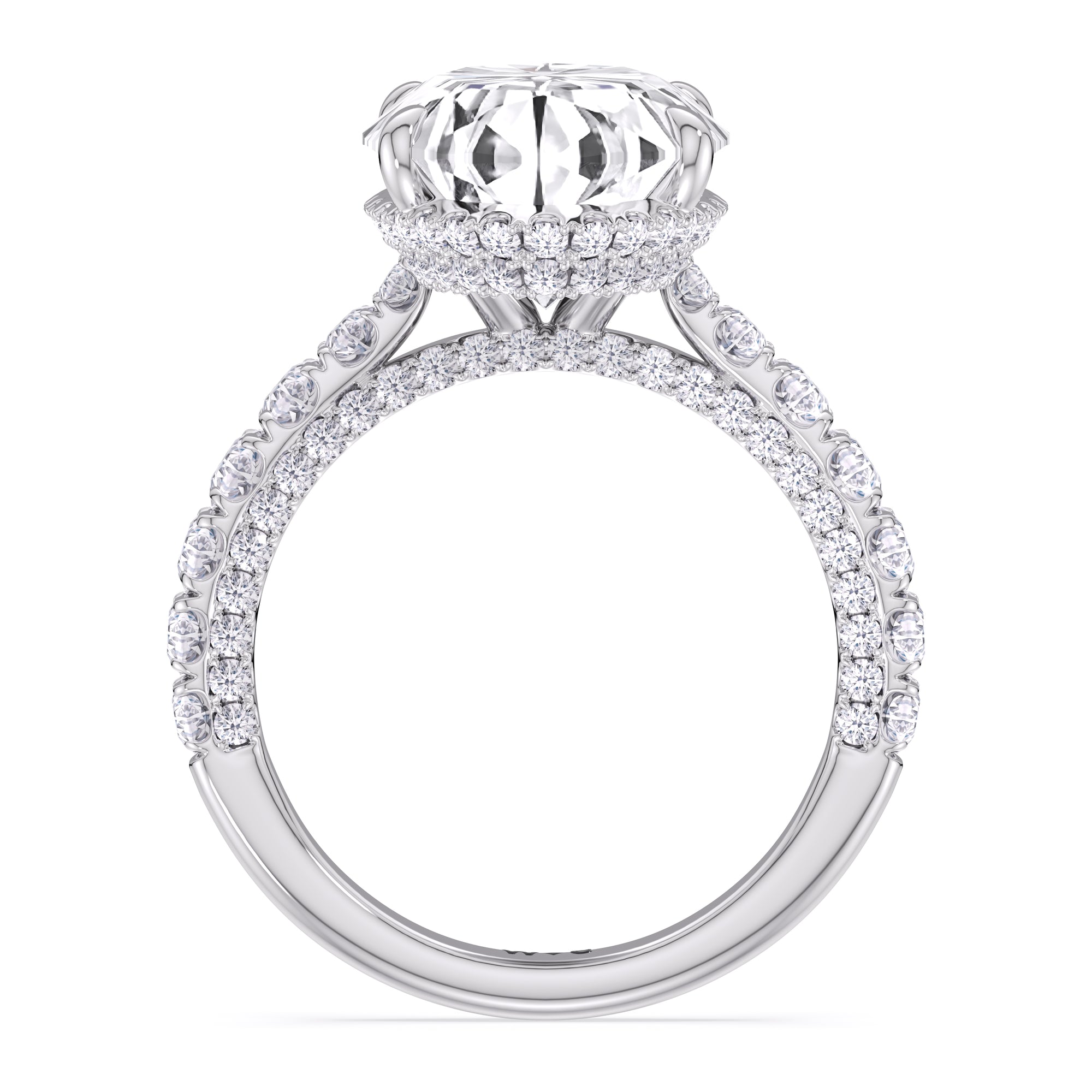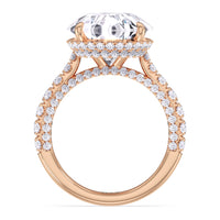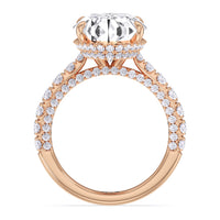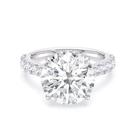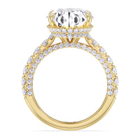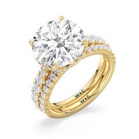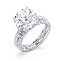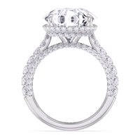 One of a kind in its design, this diamond engagement ring features a split shank band. Tapered pave diamonds of varying sizes align the shank, while additional diamonds adorn the bridge. The center diamond is set atop a double basket encircled with pave diamonds. The view from the side is just as impressive as the view from atop, creating an unforgettable masterpiece.