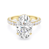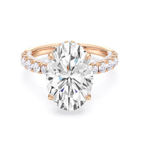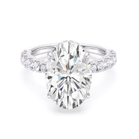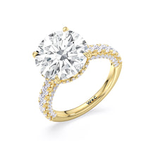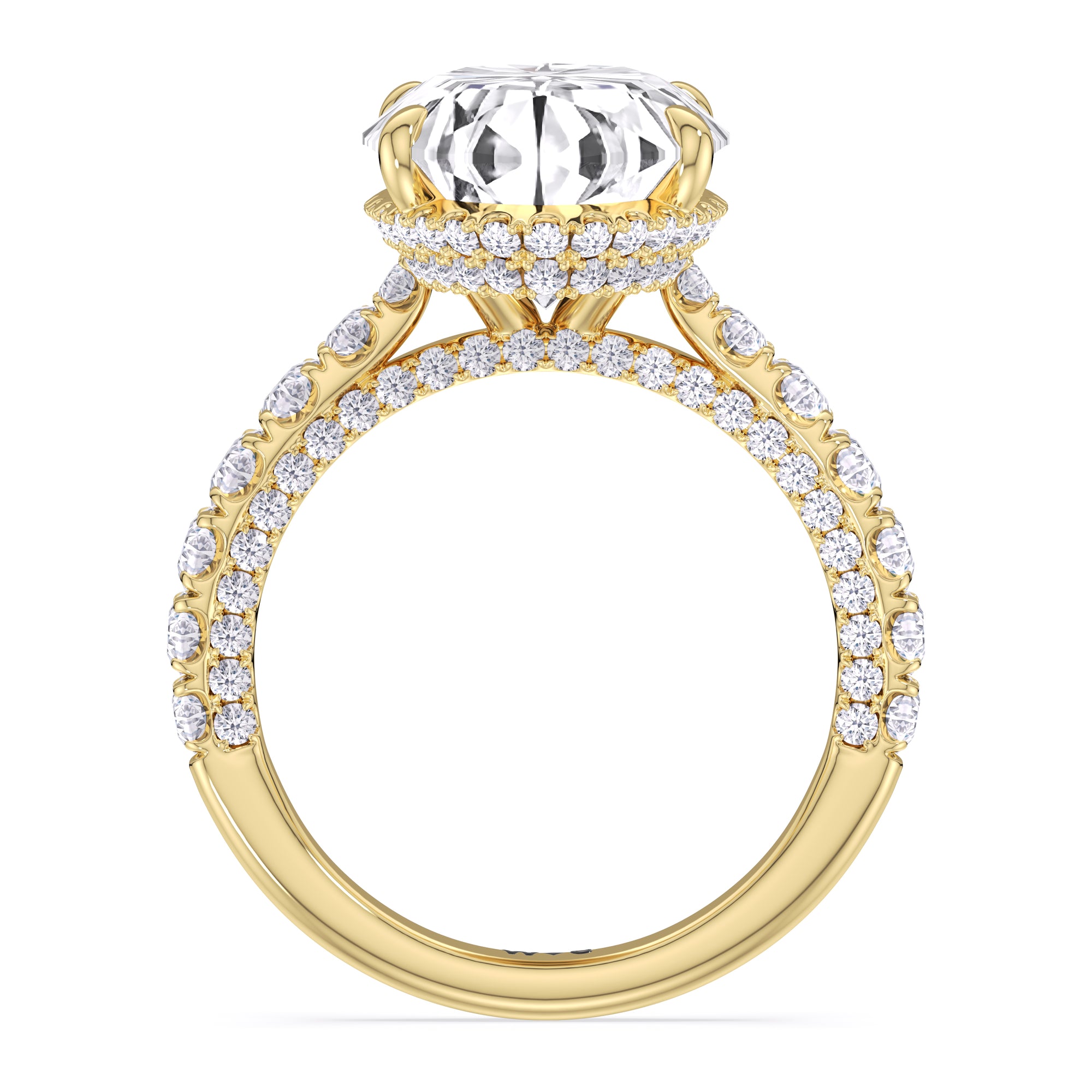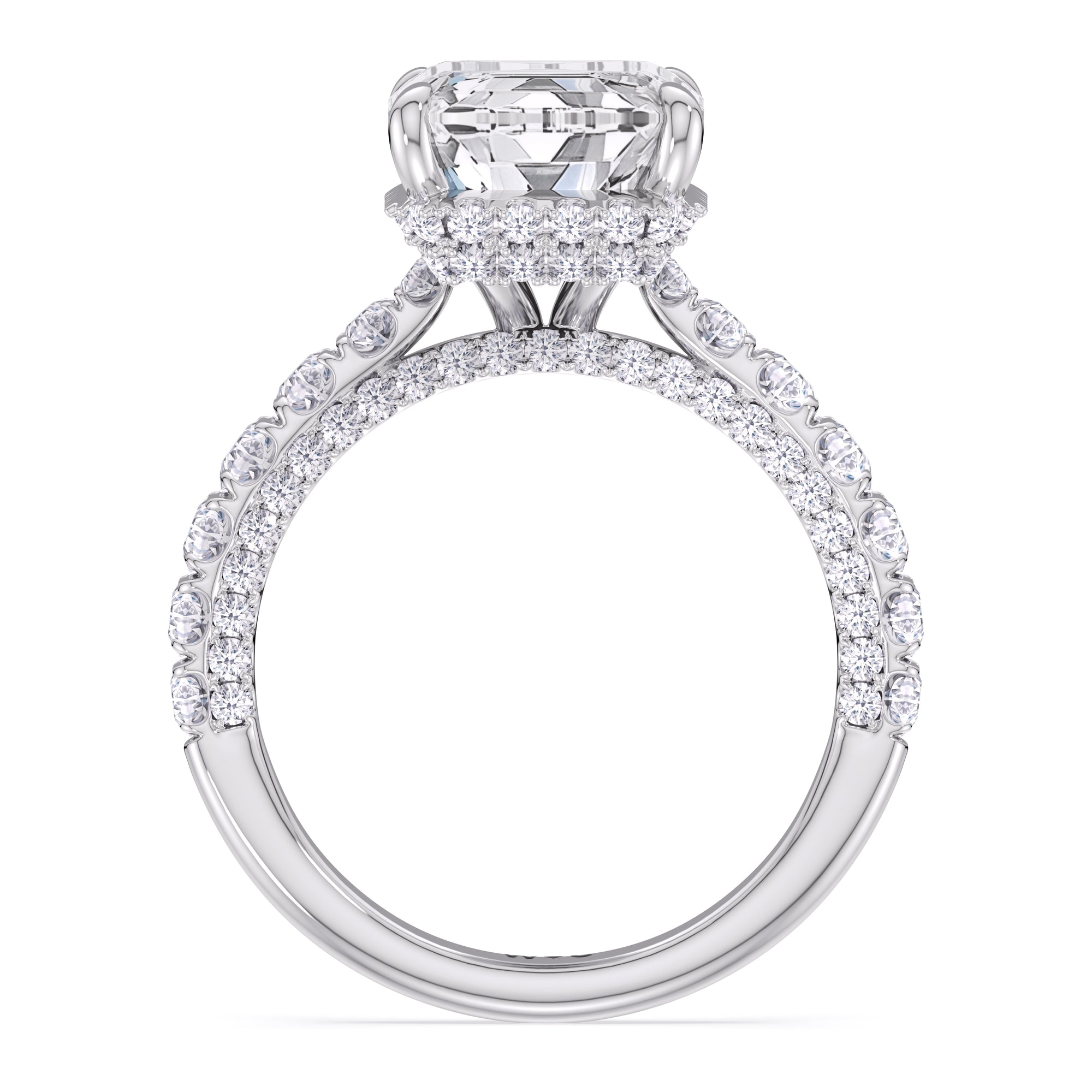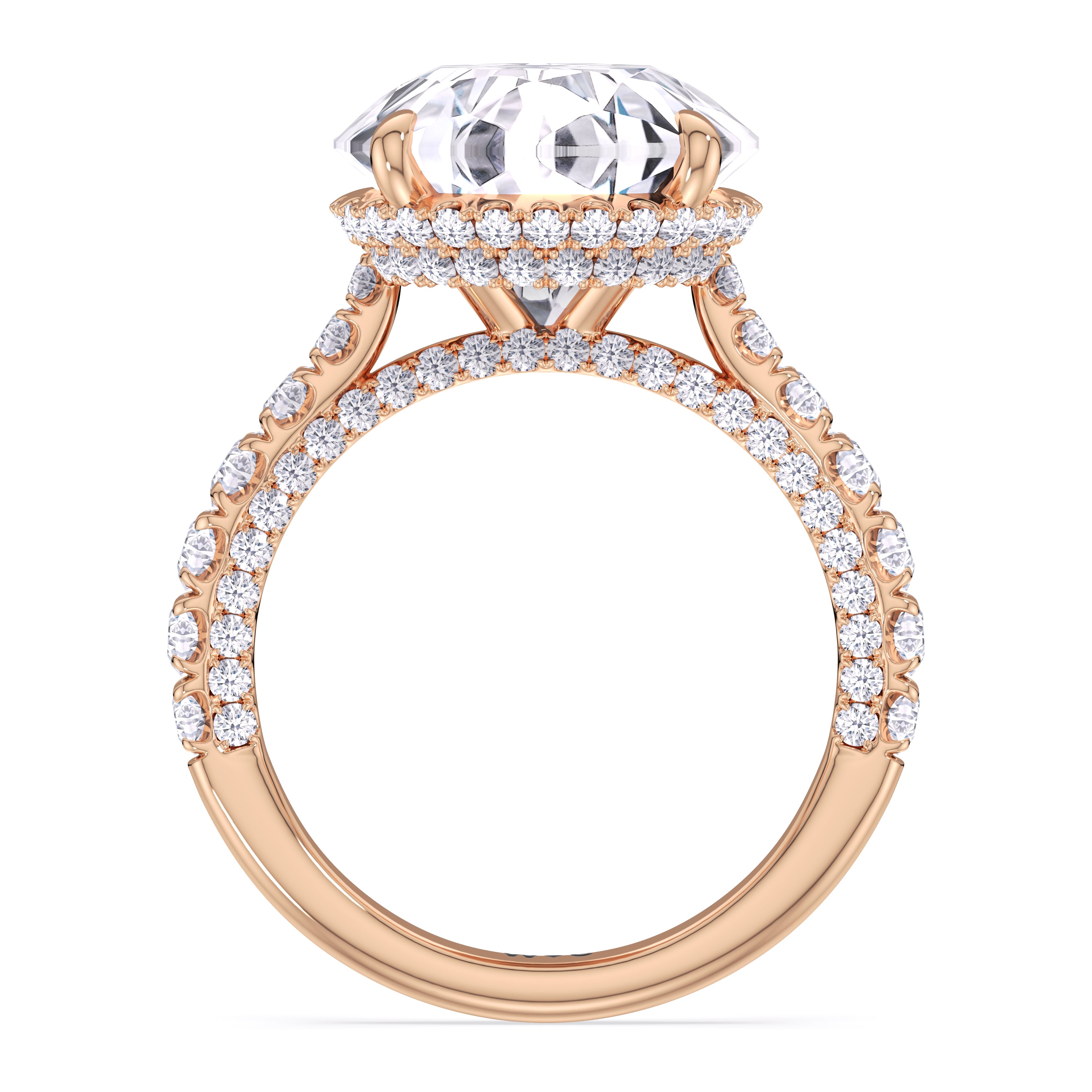 One of a kind in its design, this diamond engagement ring features a split shank band. Tapered pave diamonds of varying sizes align the shank, while additional diamonds adorn the bridge. The center diamond is set atop a double basket encircled with pave diamonds. The view from the side is just as impressive as the view from atop, creating an unforgettable masterpiece.