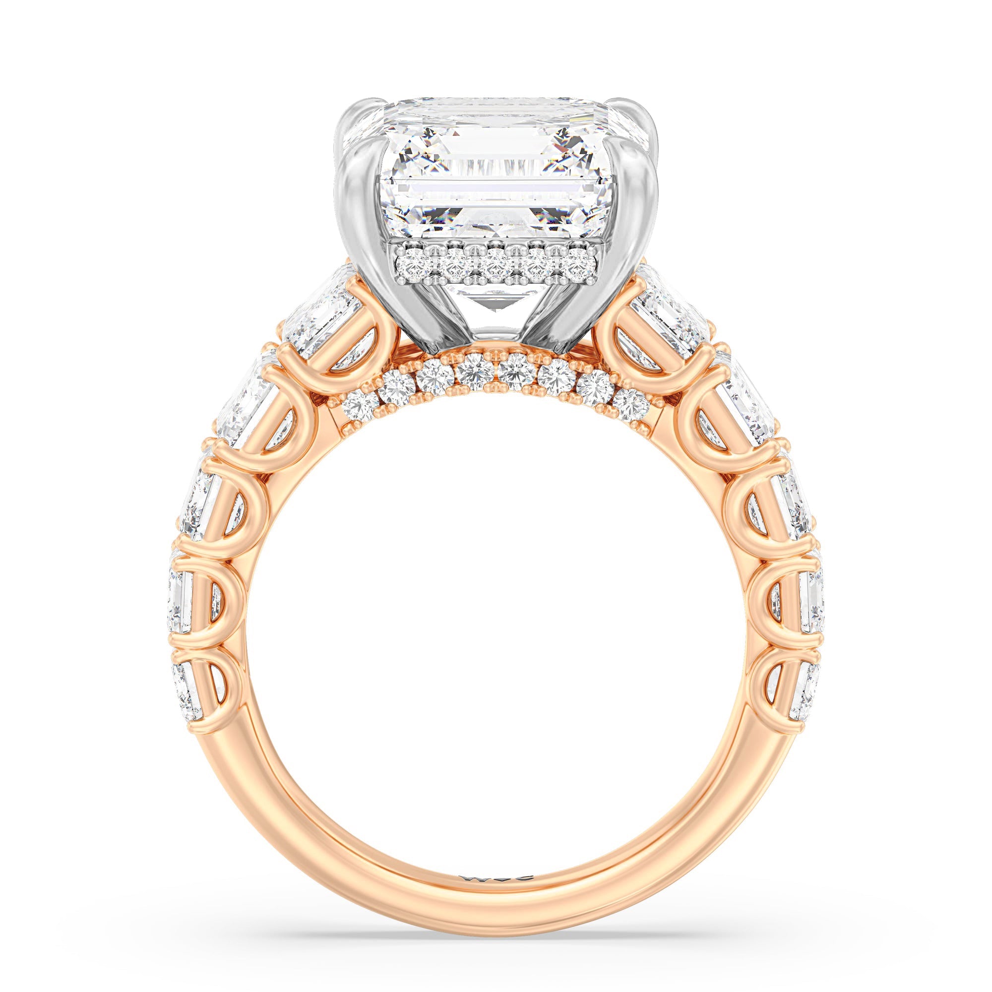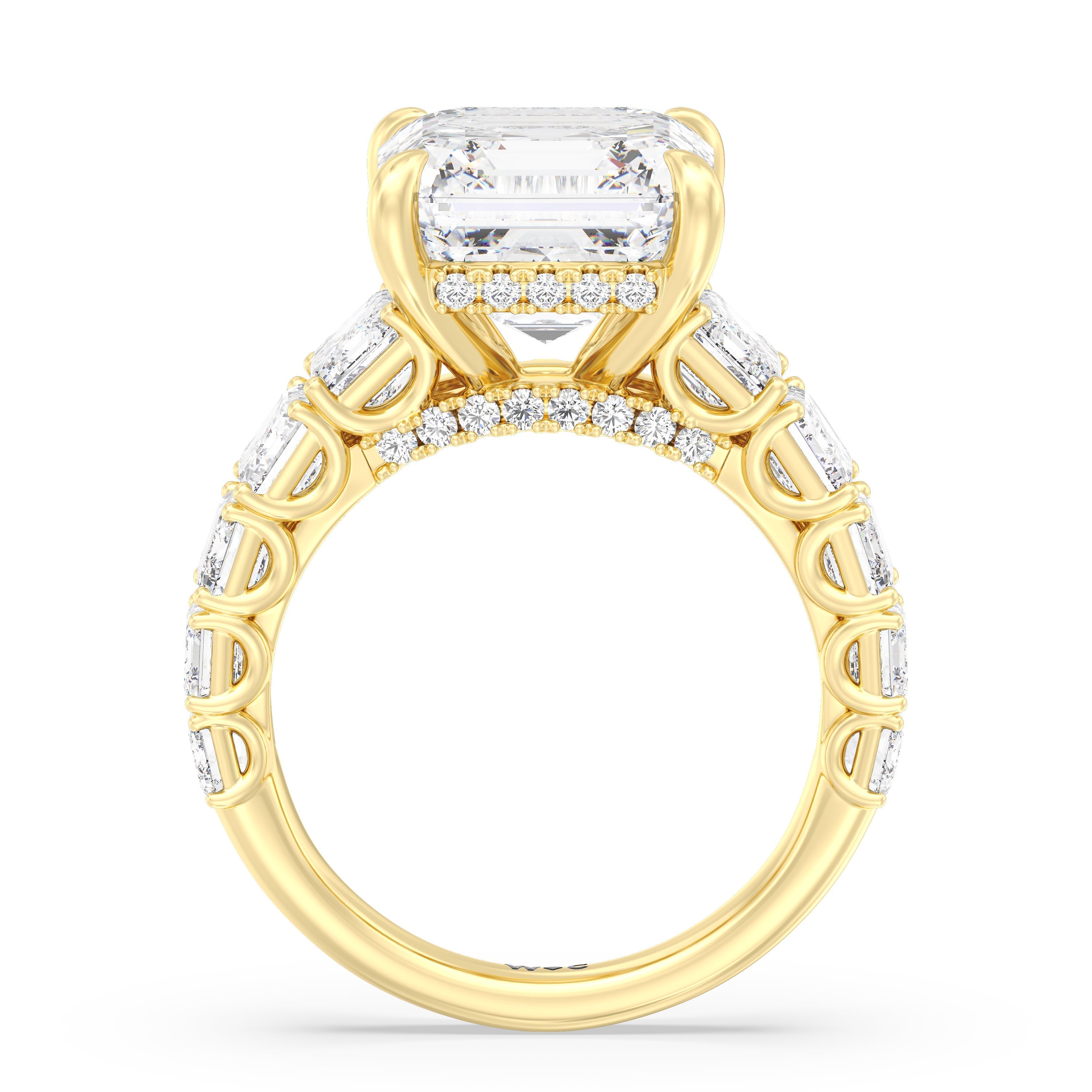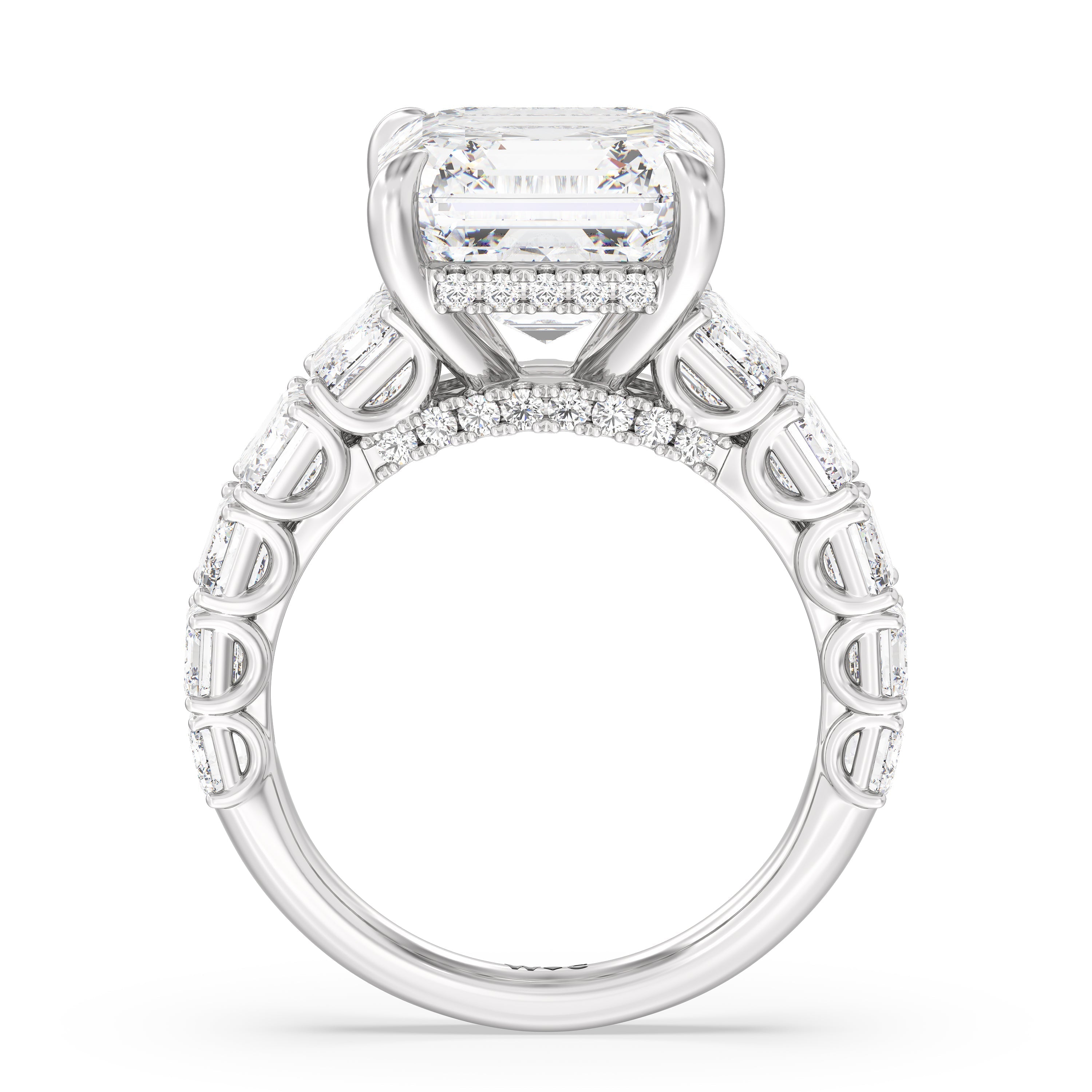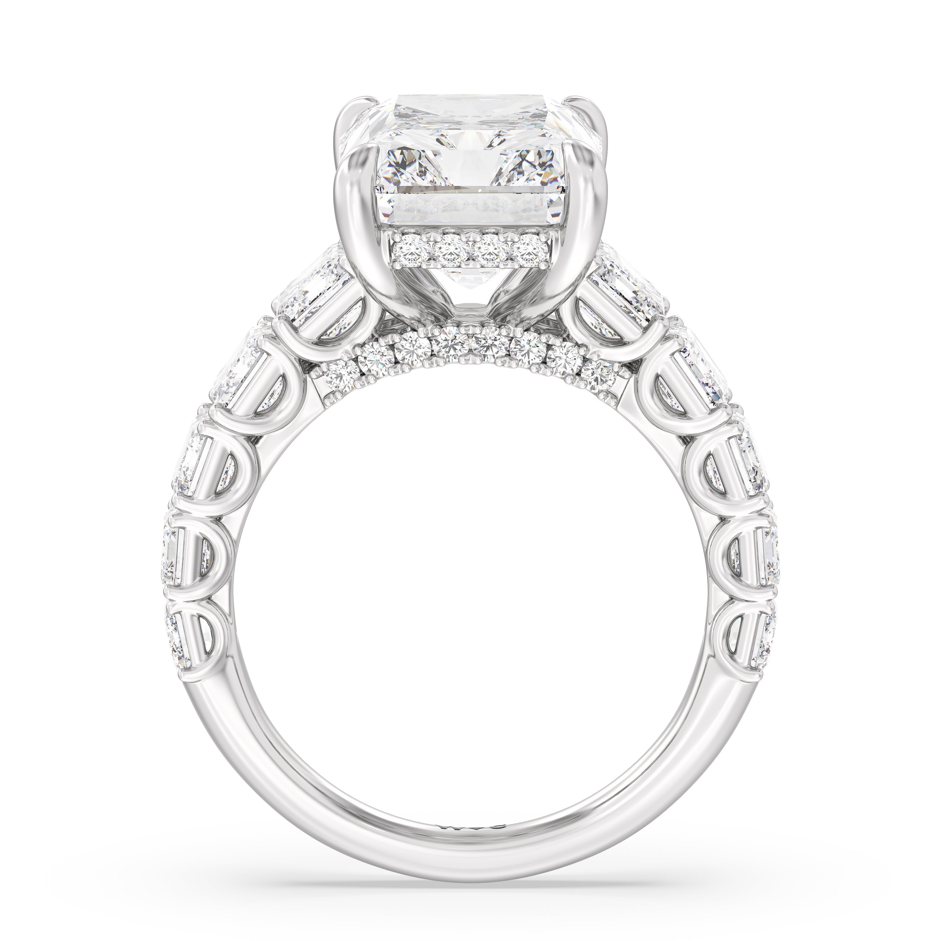 This remarkable hidden halo engagement ring is adorned with diamonds. Striking emerald-cut accent diamonds line the band's shank, creating a show-stopping look. A delicate hidden halo sits beneath the center stone for added brilliance, while additional diamonds encrust the band's gallery, offering a breathtaking view from every angle.