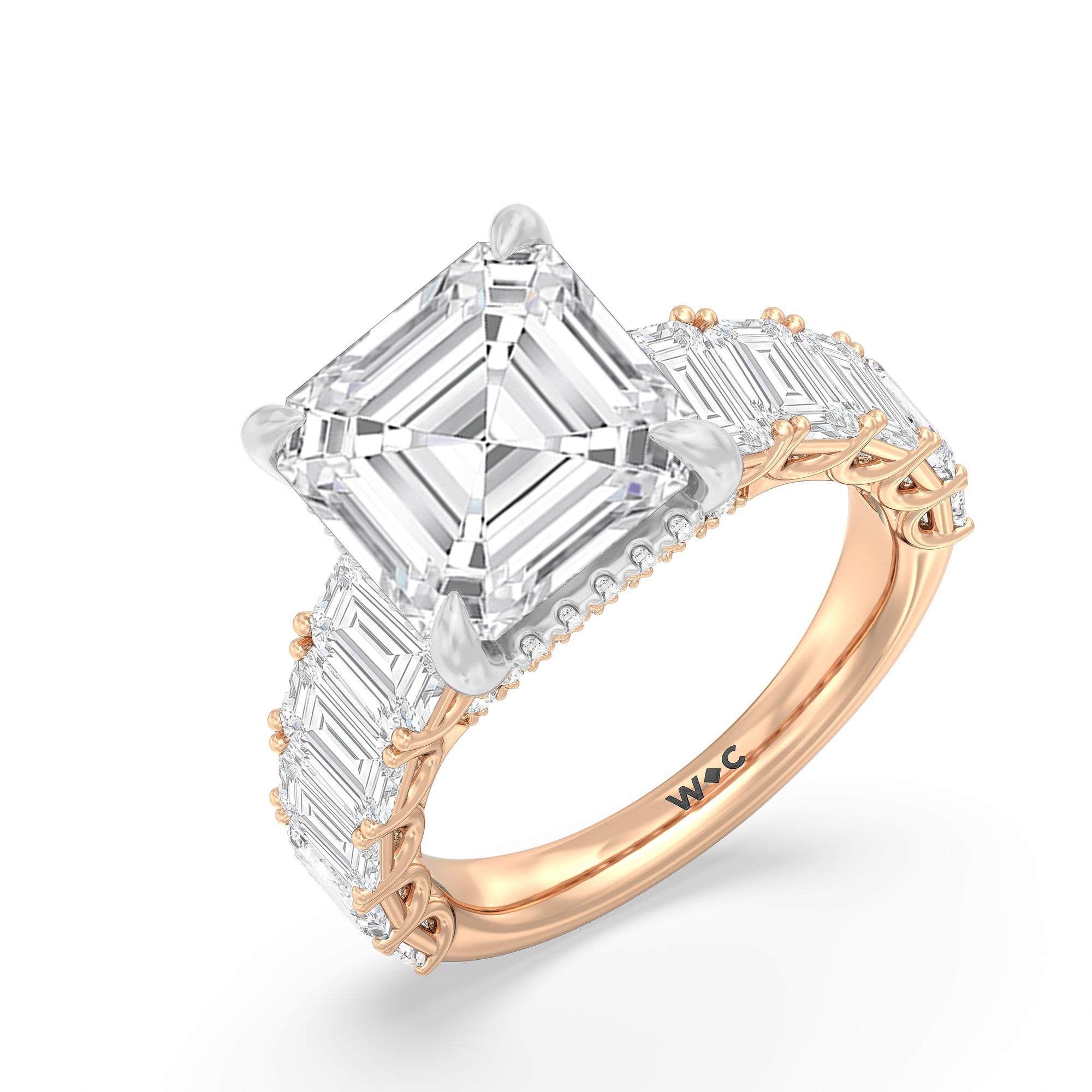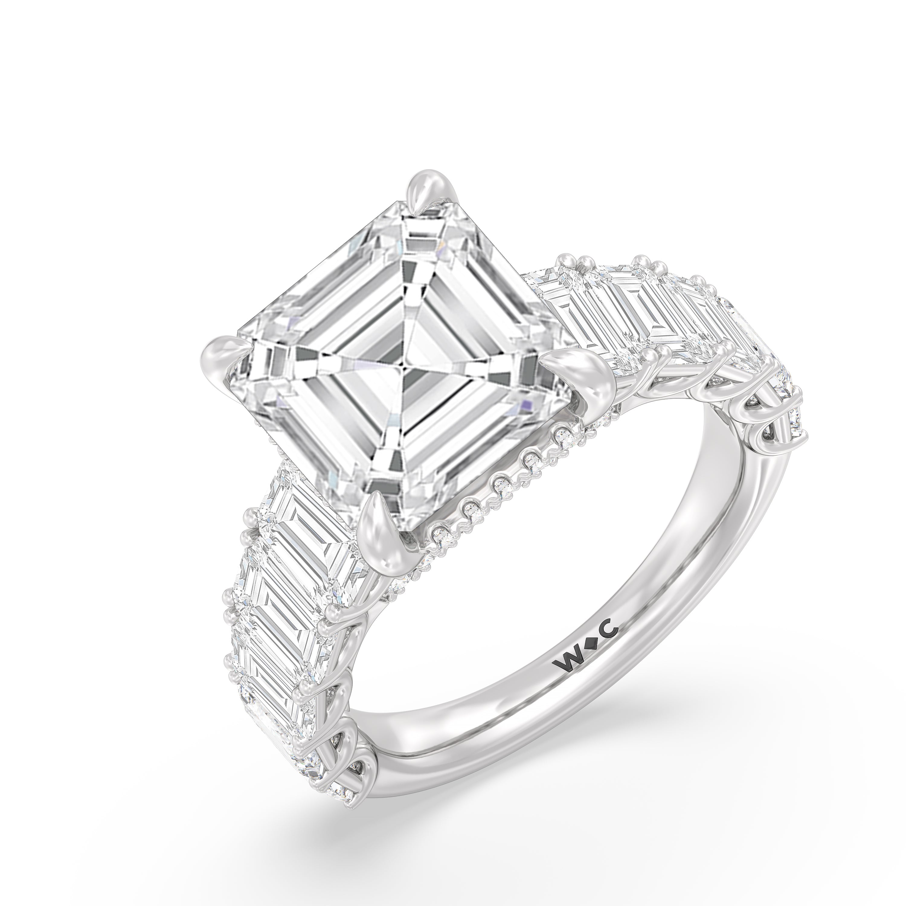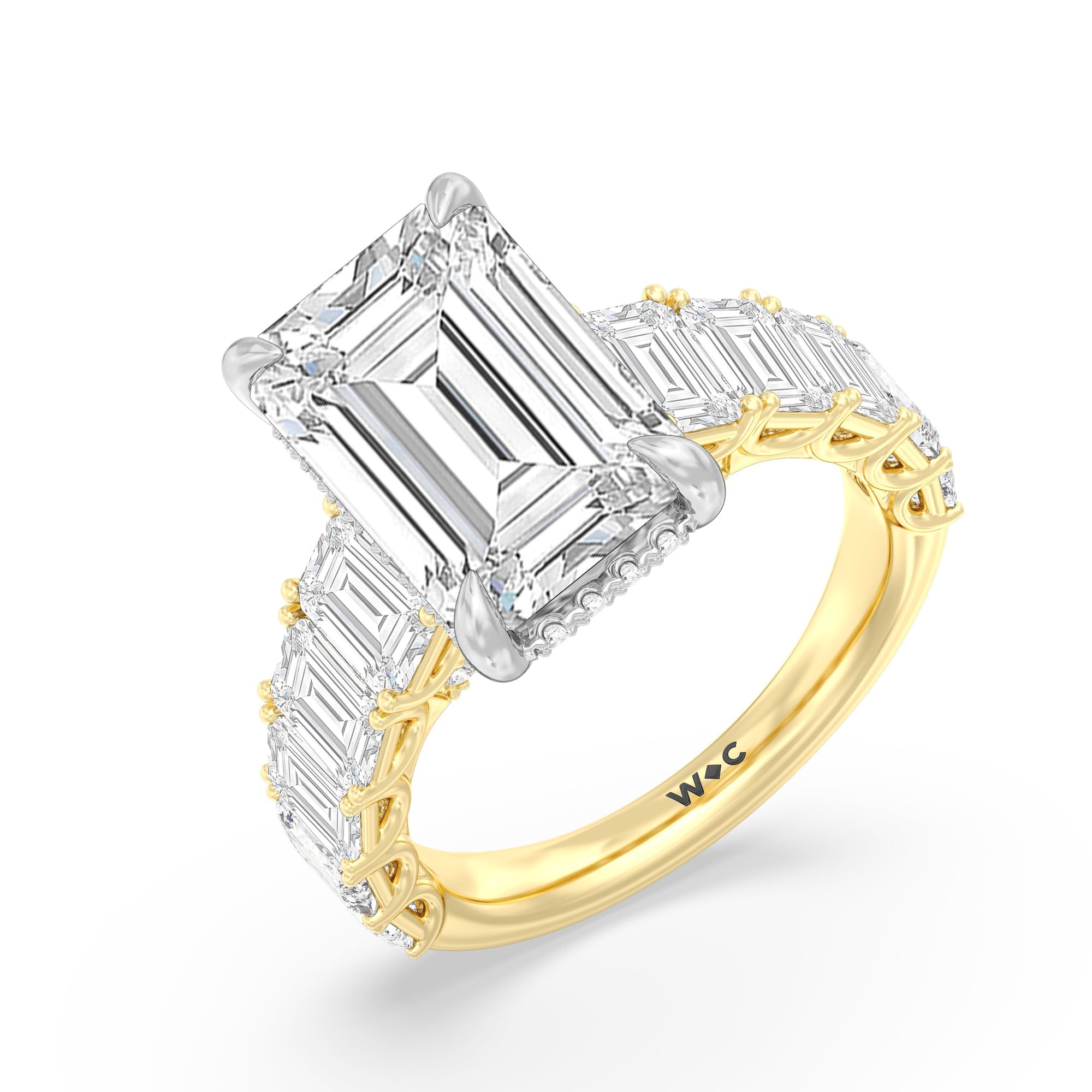 This remarkable hidden halo engagement ring is adorned with diamonds. Striking emerald-cut accent diamonds line the band's shank, creating a show-stopping look. A delicate hidden halo sits beneath the center stone for added brilliance, while additional diamonds encrust the band's gallery, offering a breathtaking view from every angle.