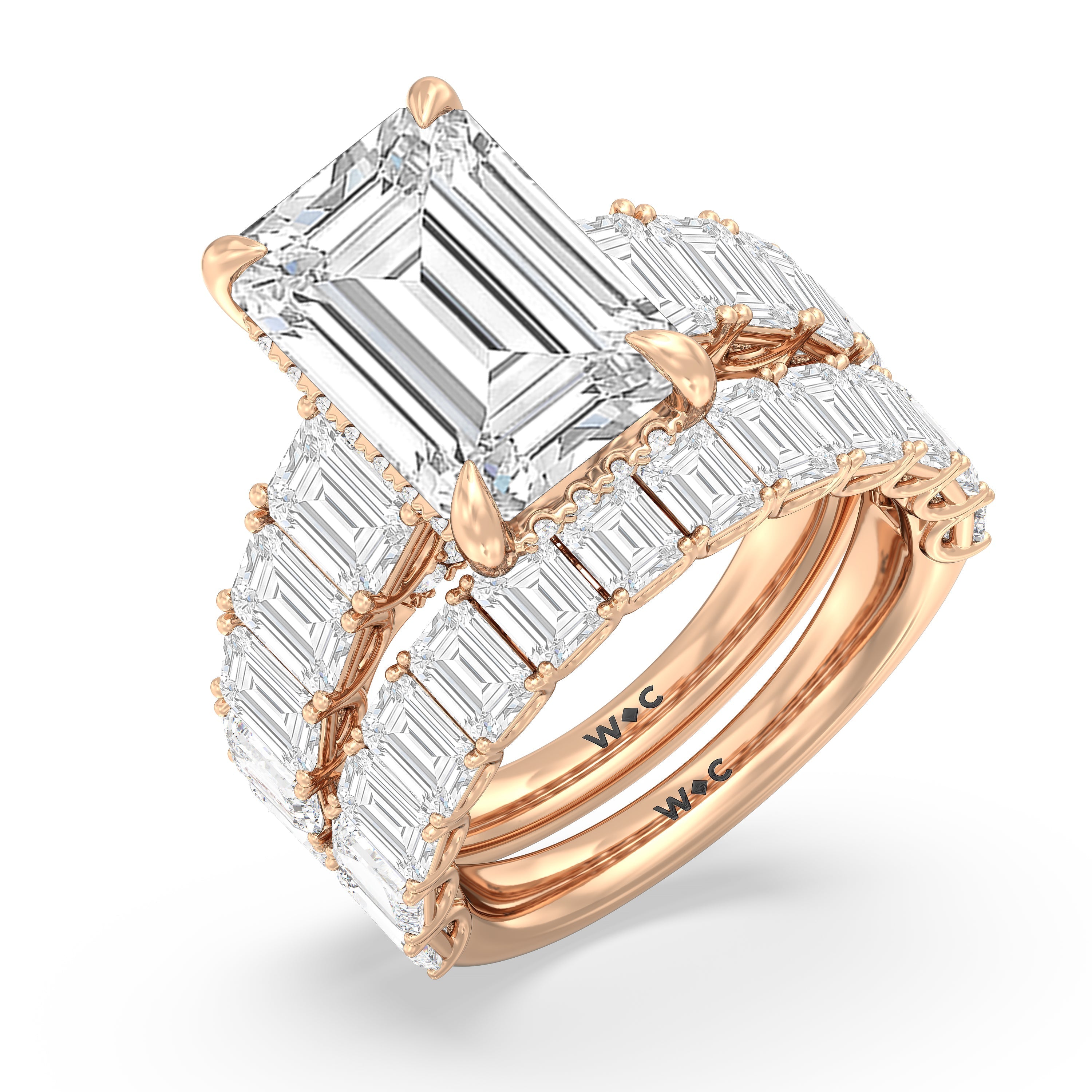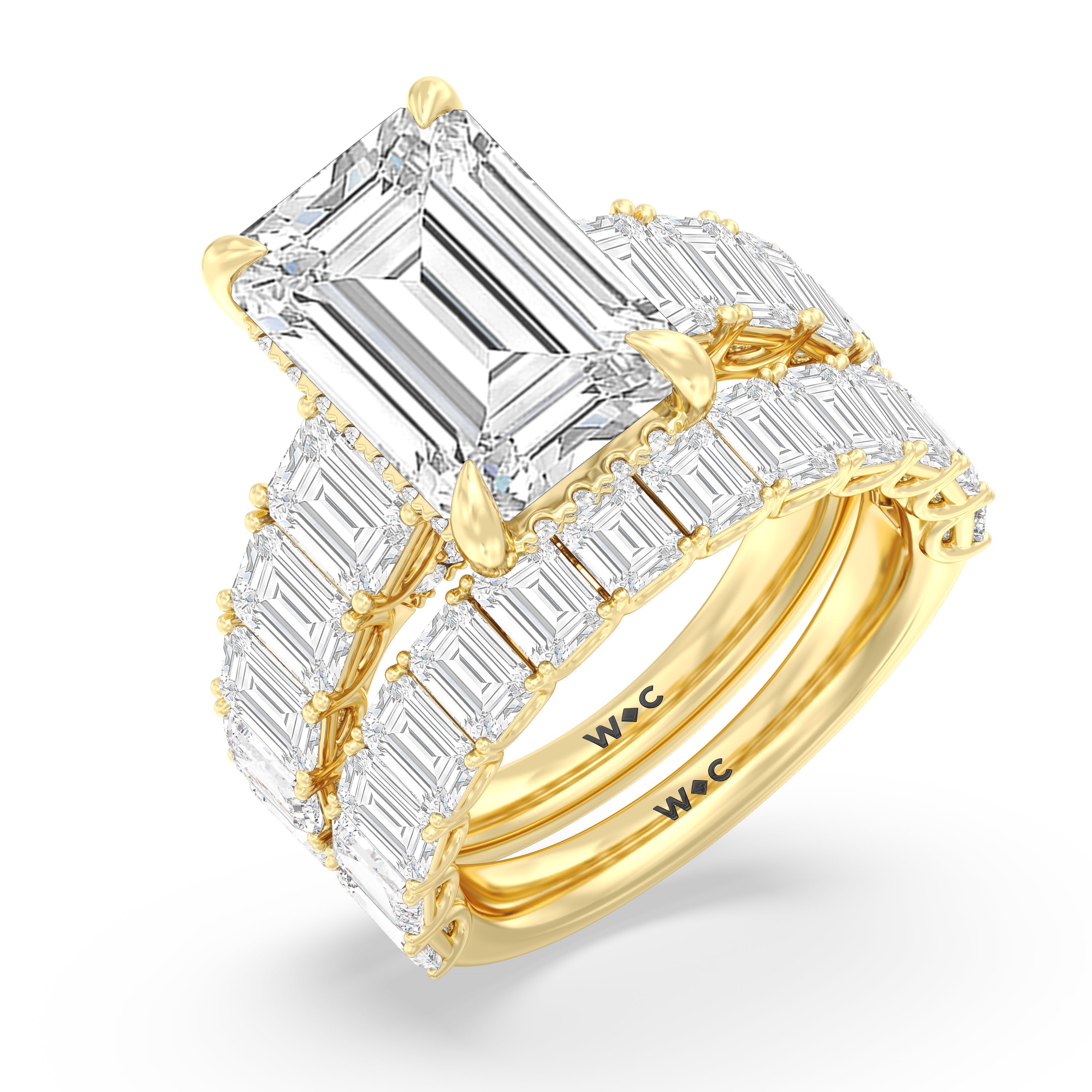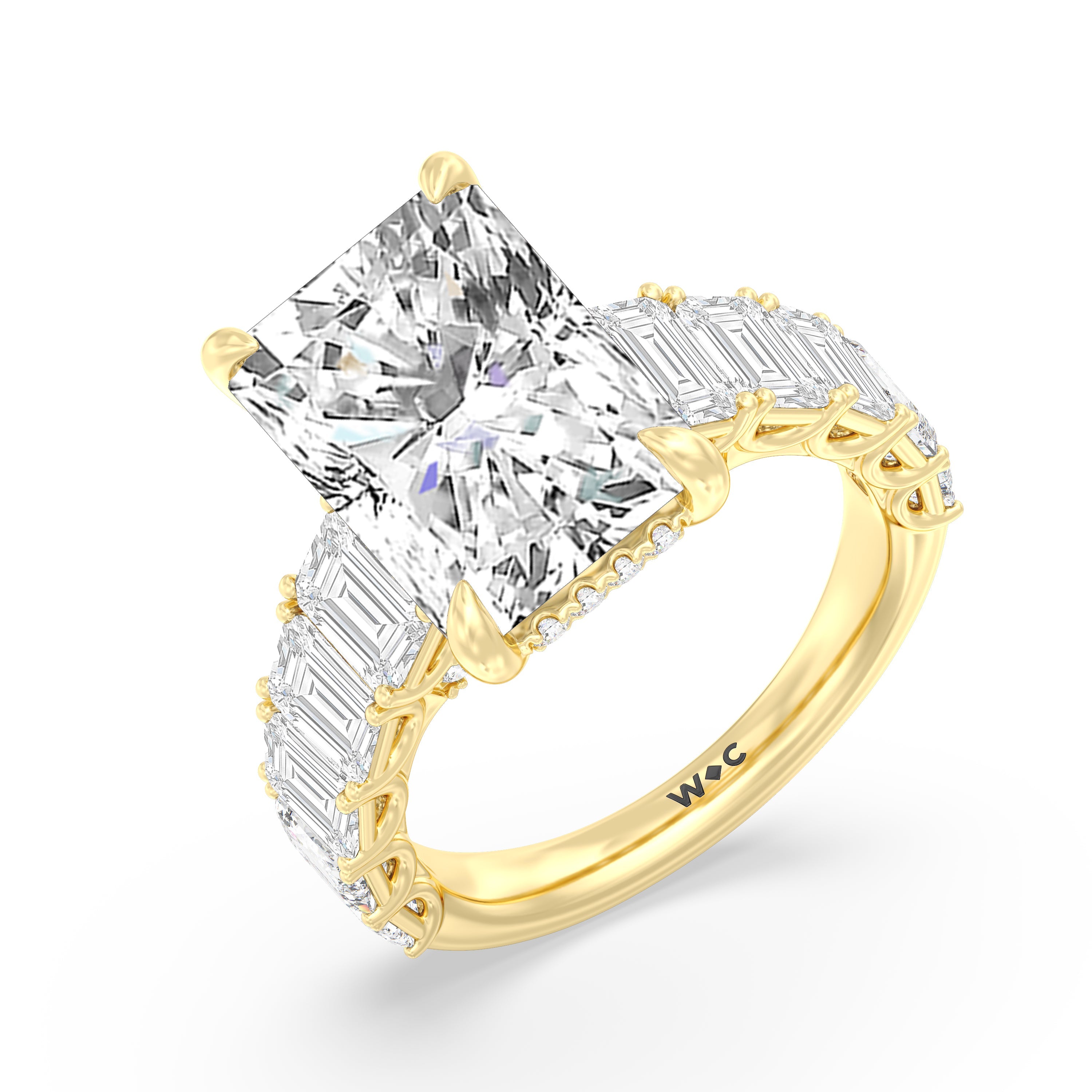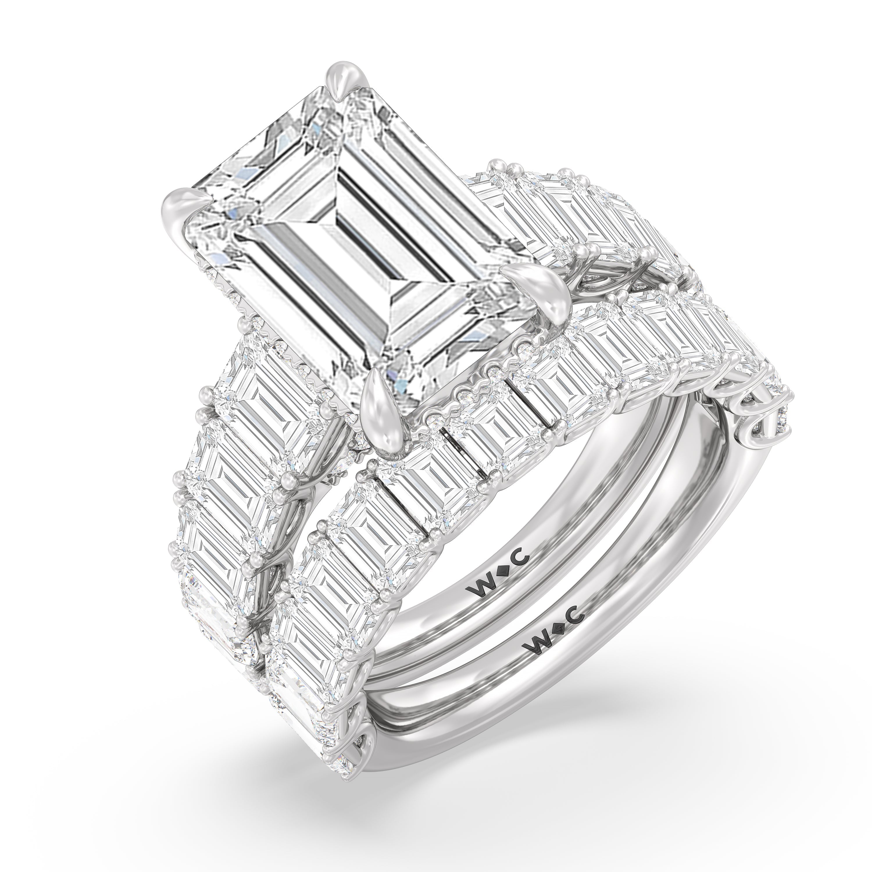 This remarkable hidden halo engagement ring is adorned with diamonds. Striking emerald-cut accent diamonds line the band's shank, creating a show-stopping look. A delicate hidden halo sits beneath the center stone for added brilliance, while additional diamonds encrust the band's gallery, offering a breathtaking view from every angle.