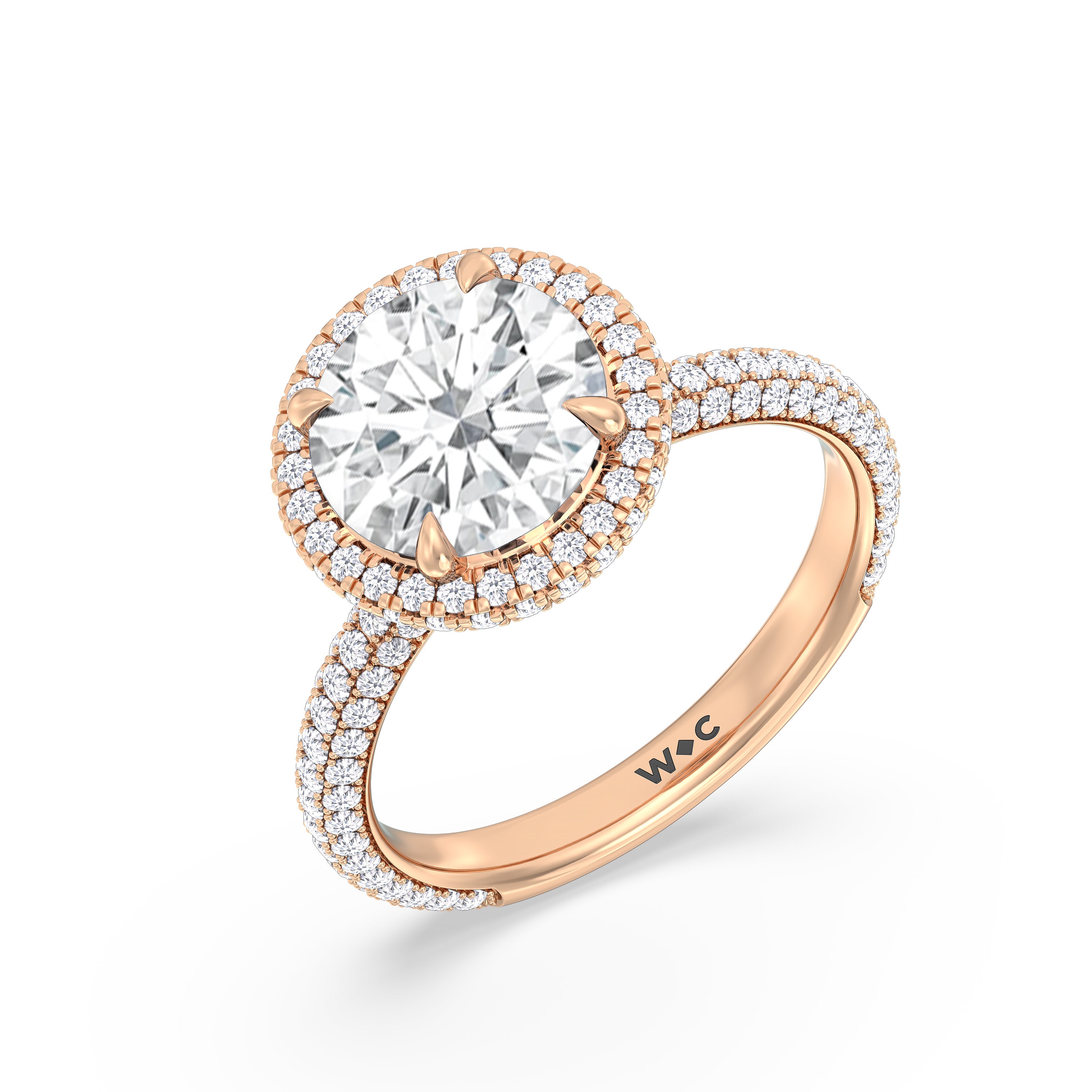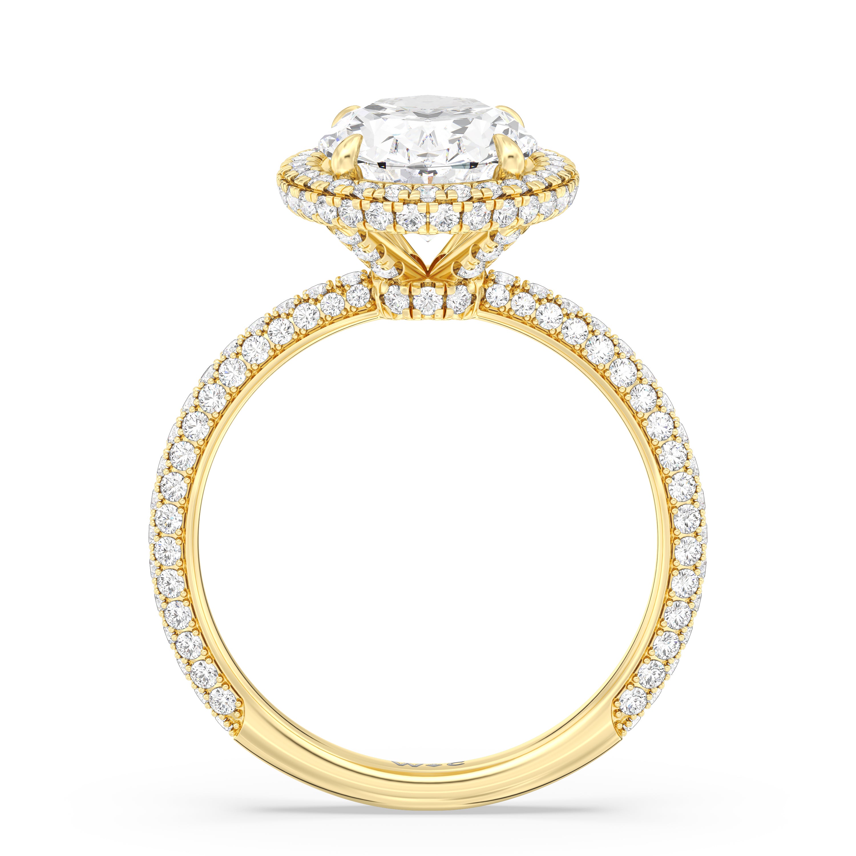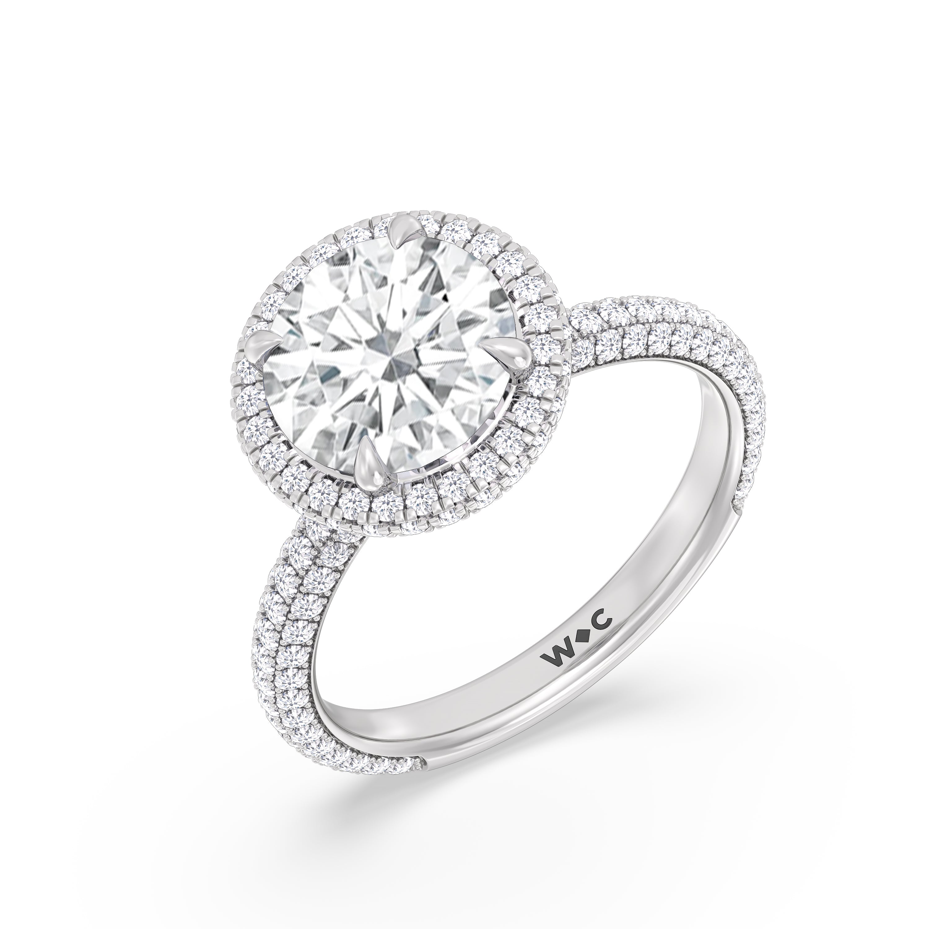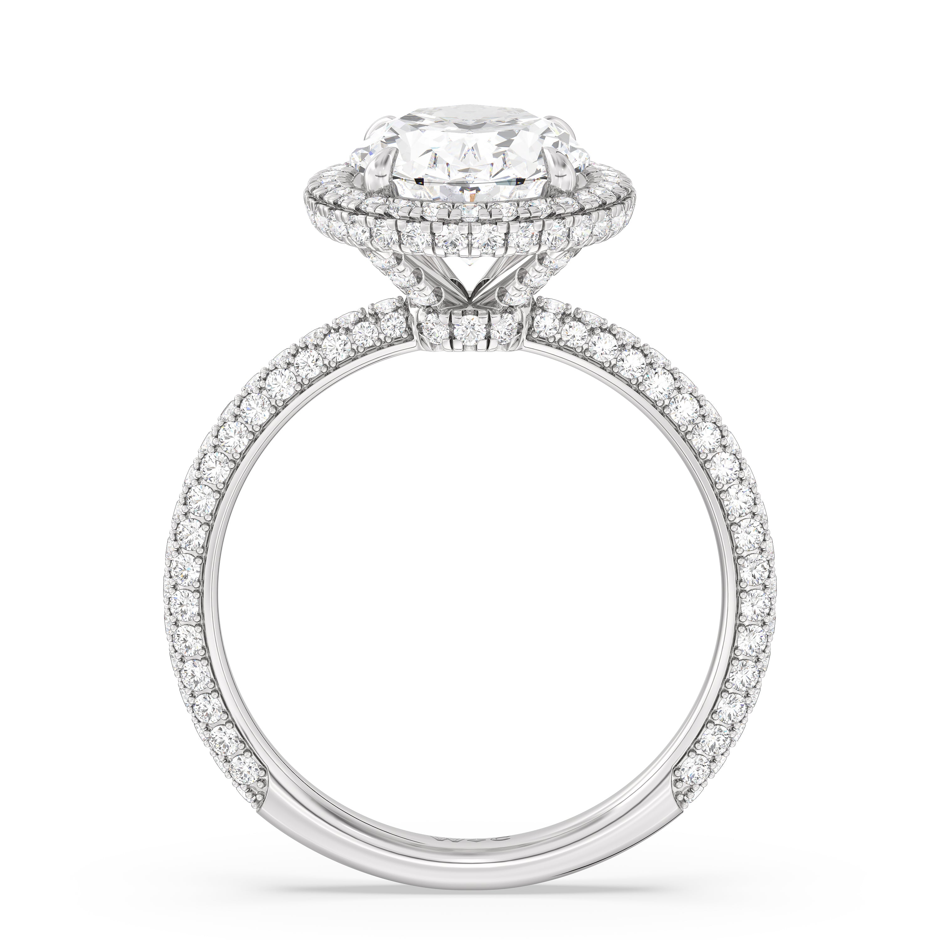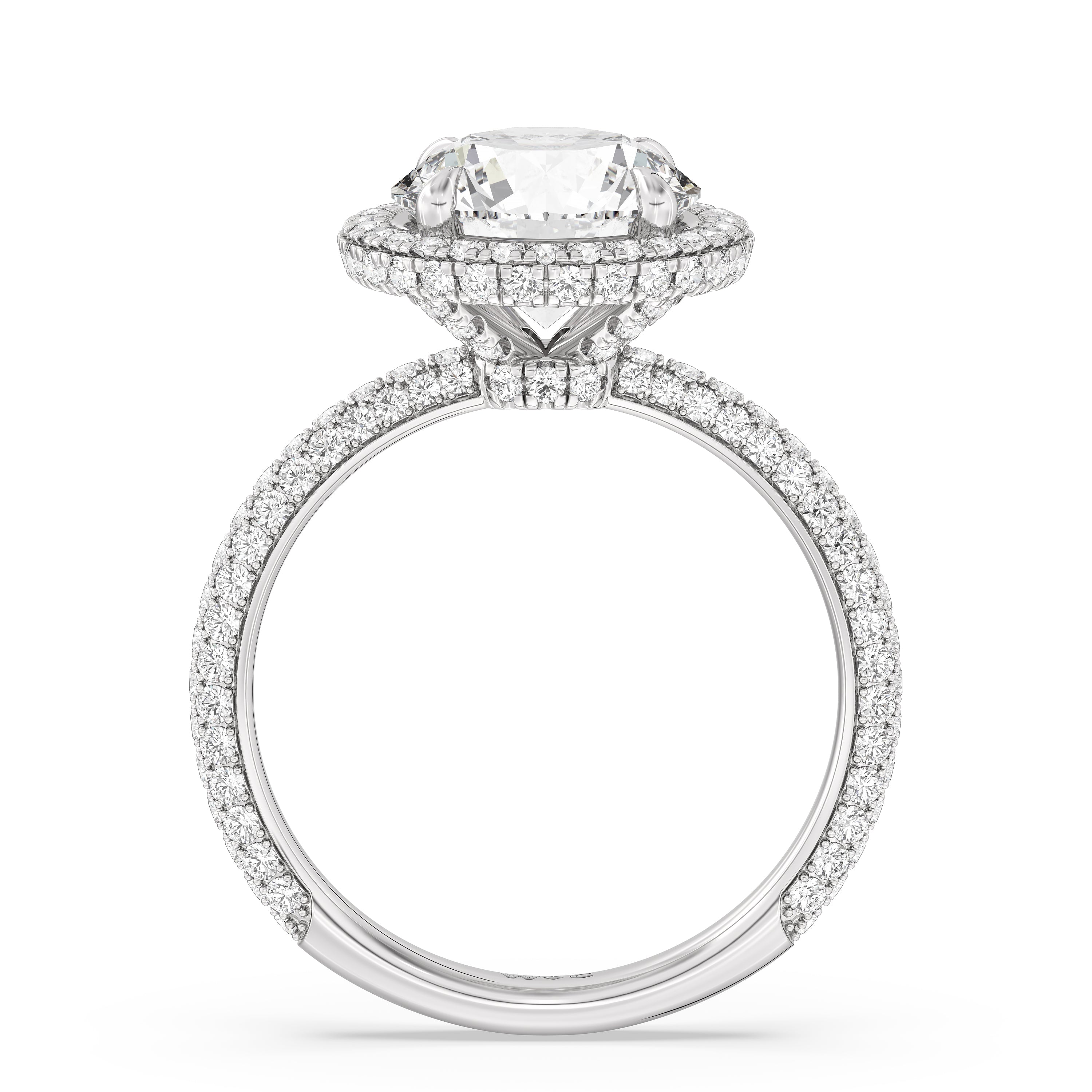 This ring's design brings boldness to a classic solitaire. It features a bigger center diamond framed beautifully by a halo of smaller diamonds and secured by diamond-encrusted prongs. The base of the center stone is also detailed with a hidden halo, complementing the brilliance of the pavé-set round diamonds that run almost all the way around the band.