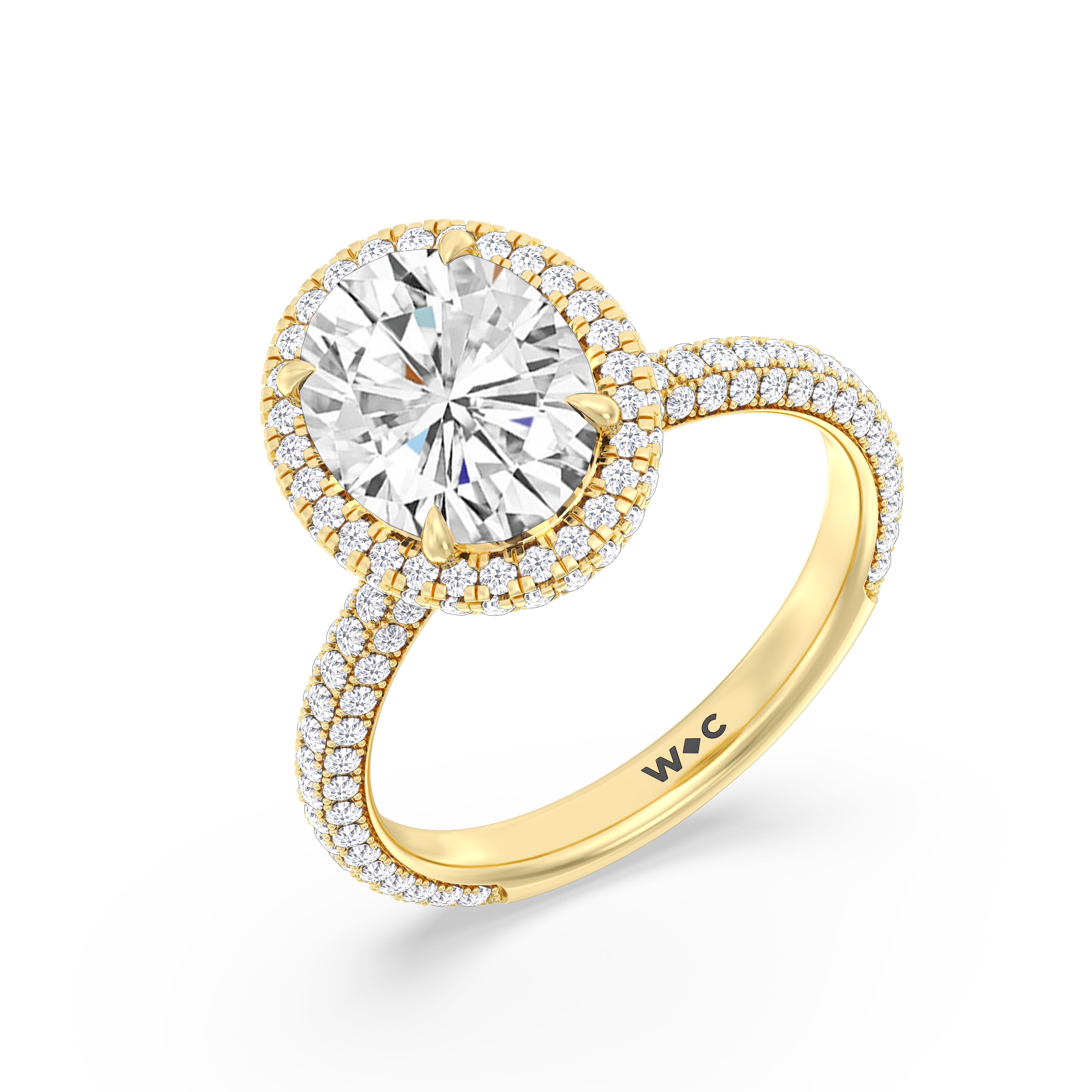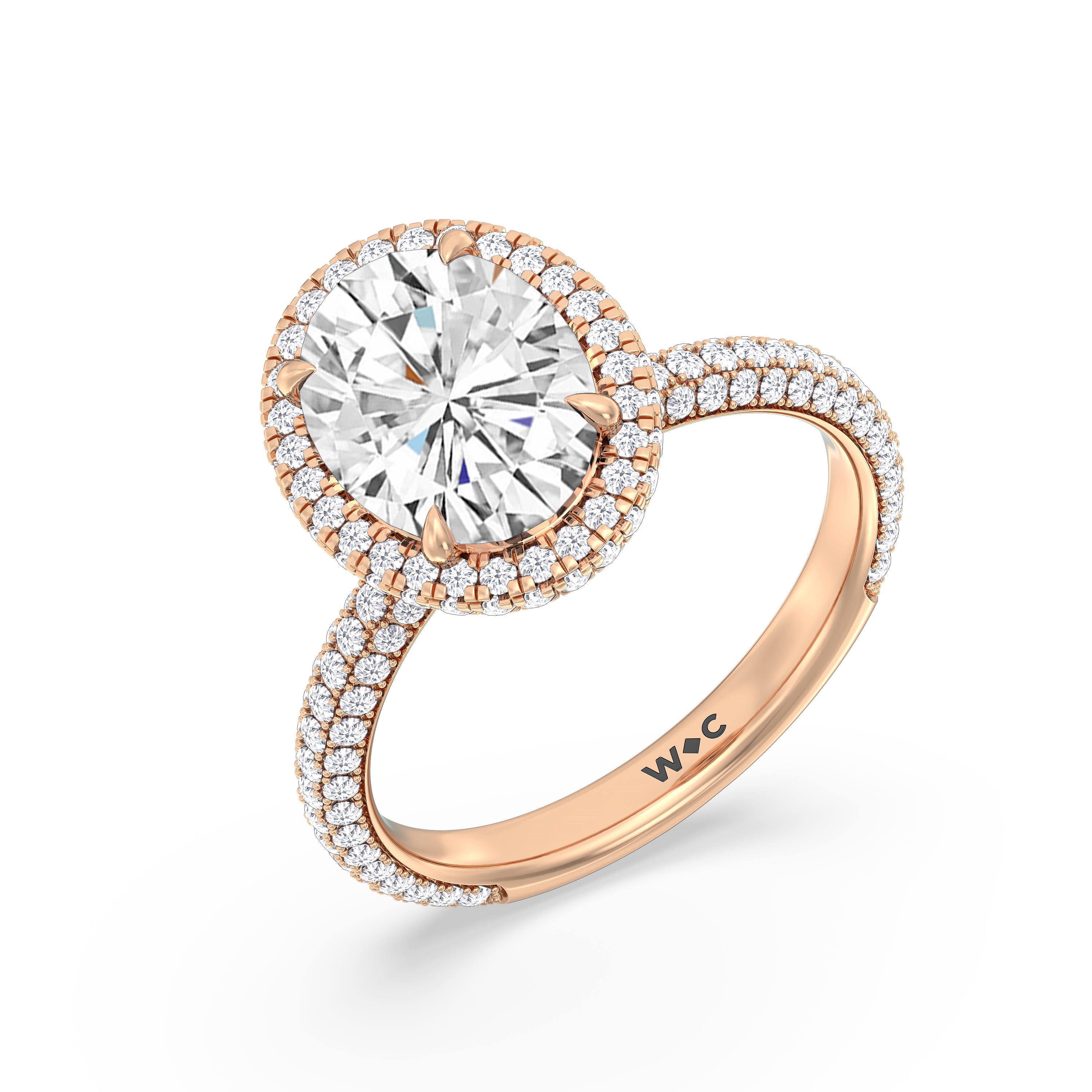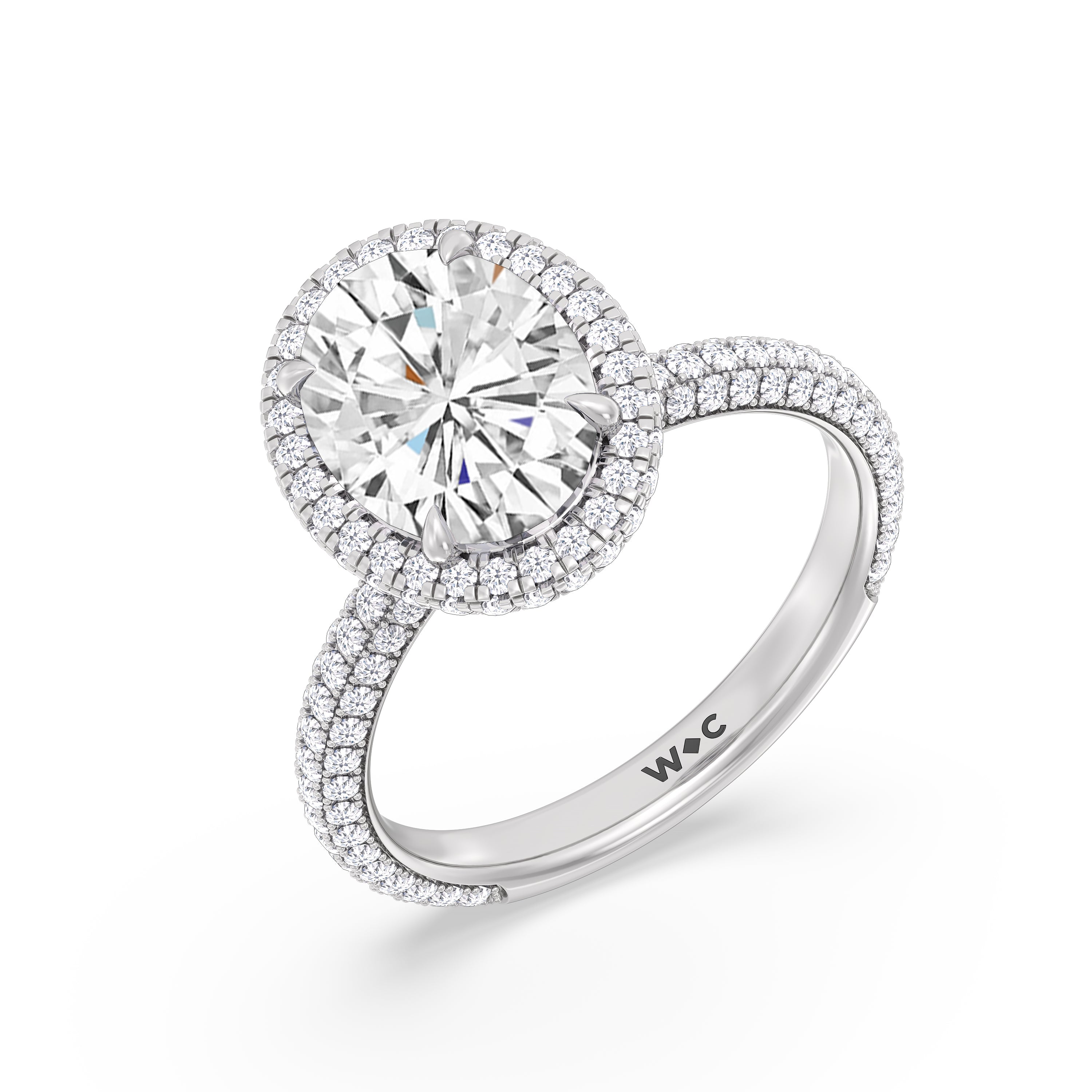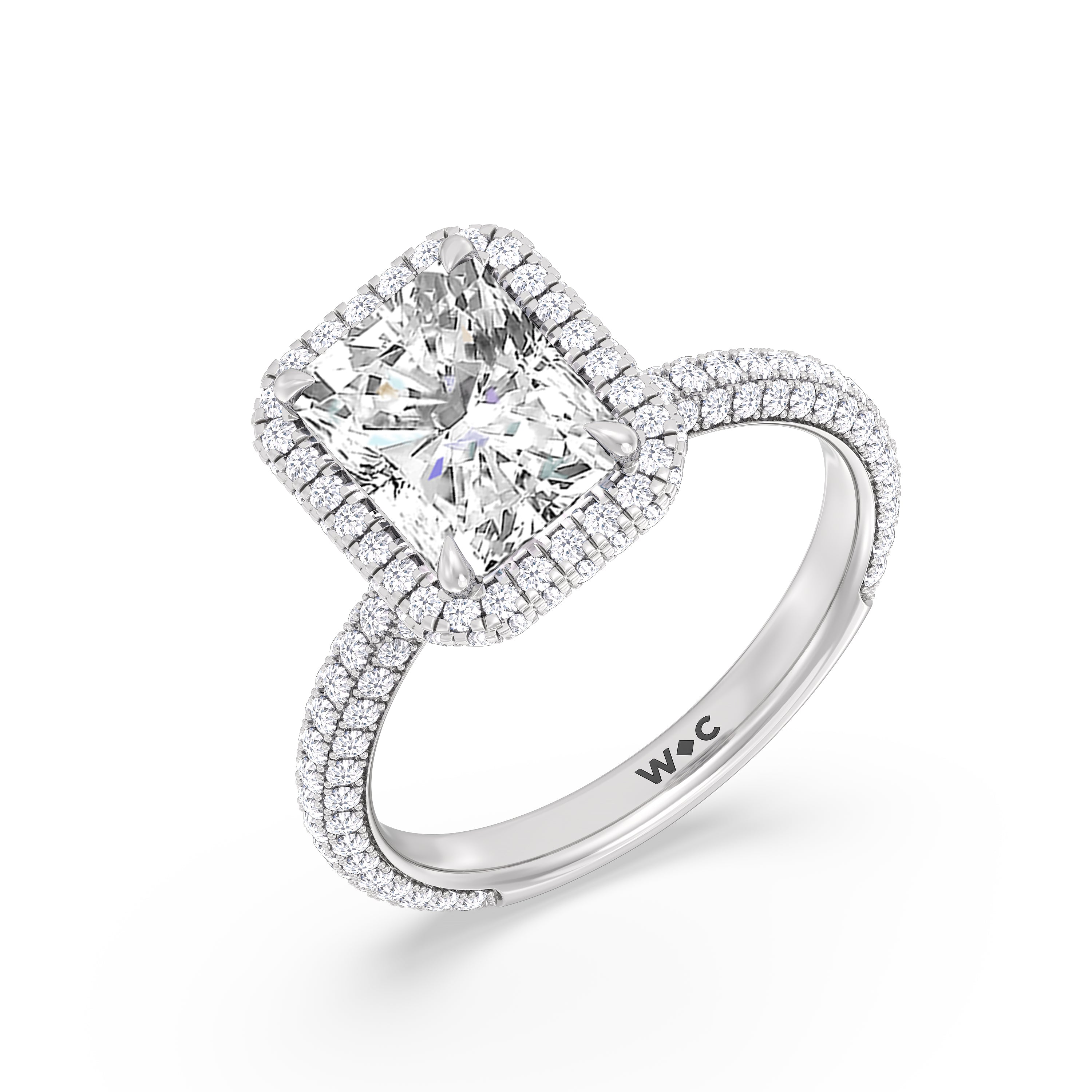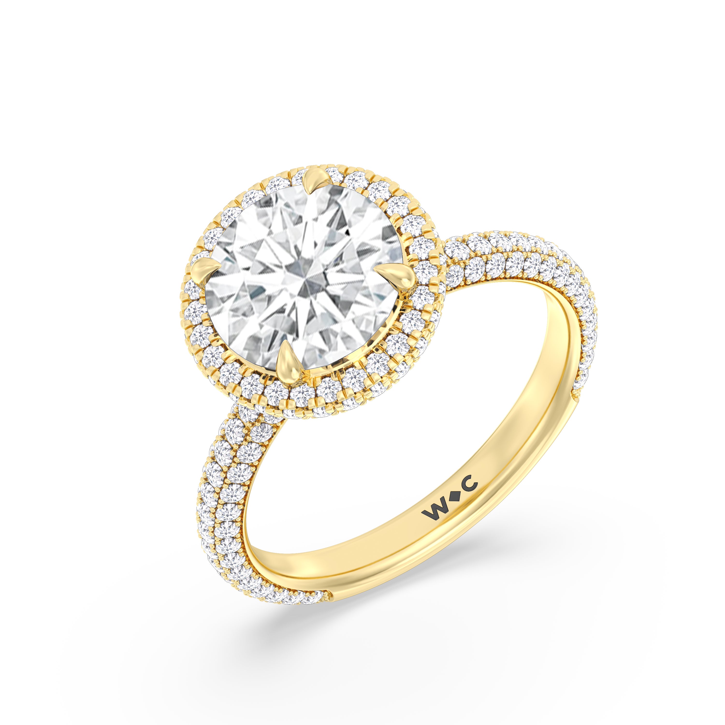 This ring's design brings boldness to a classic solitaire. It features a bigger center diamond framed beautifully by a halo of smaller diamonds and secured by diamond-encrusted prongs. The base of the center stone is also detailed with a hidden halo, complementing the brilliance of the pavé-set round diamonds that run almost all the way around the band.