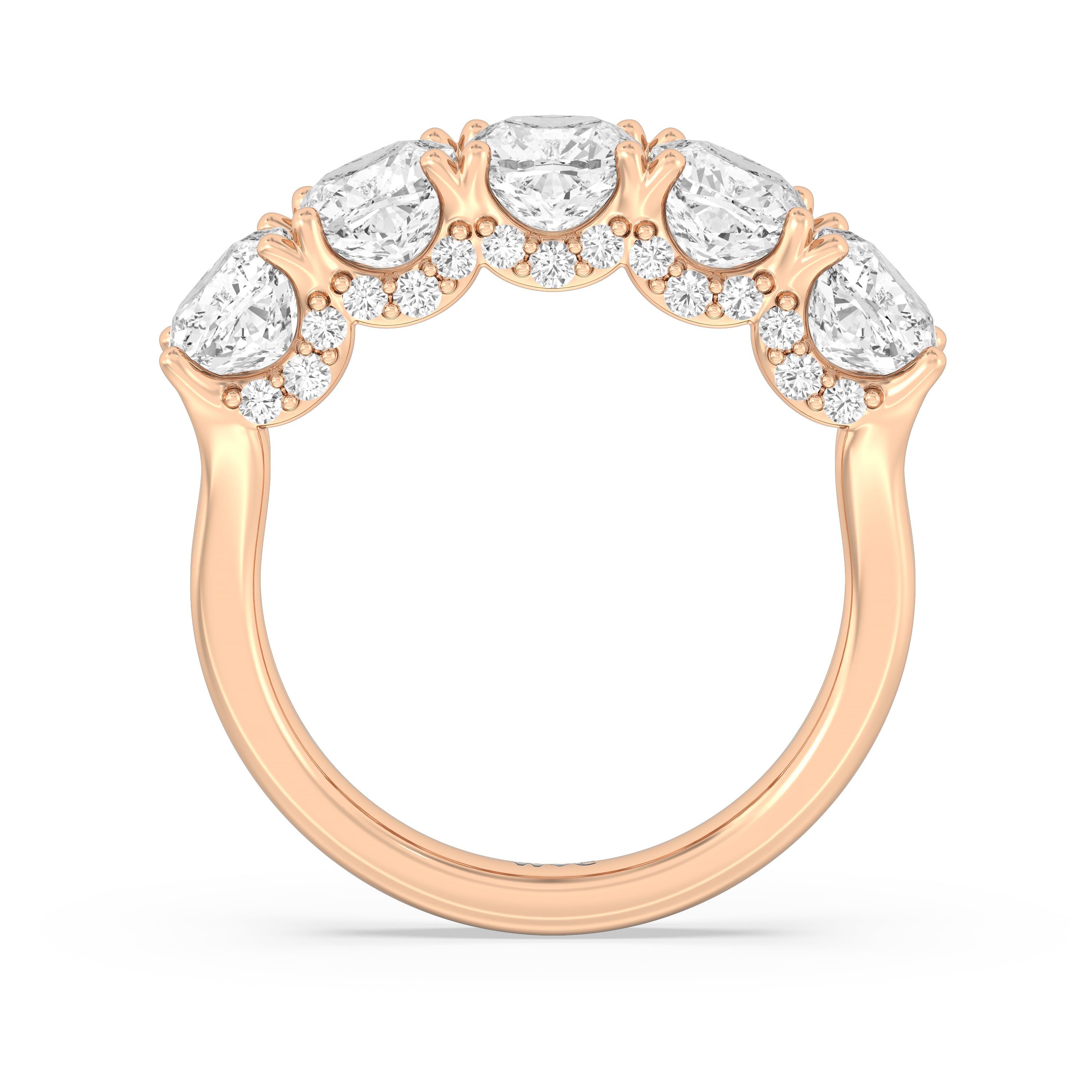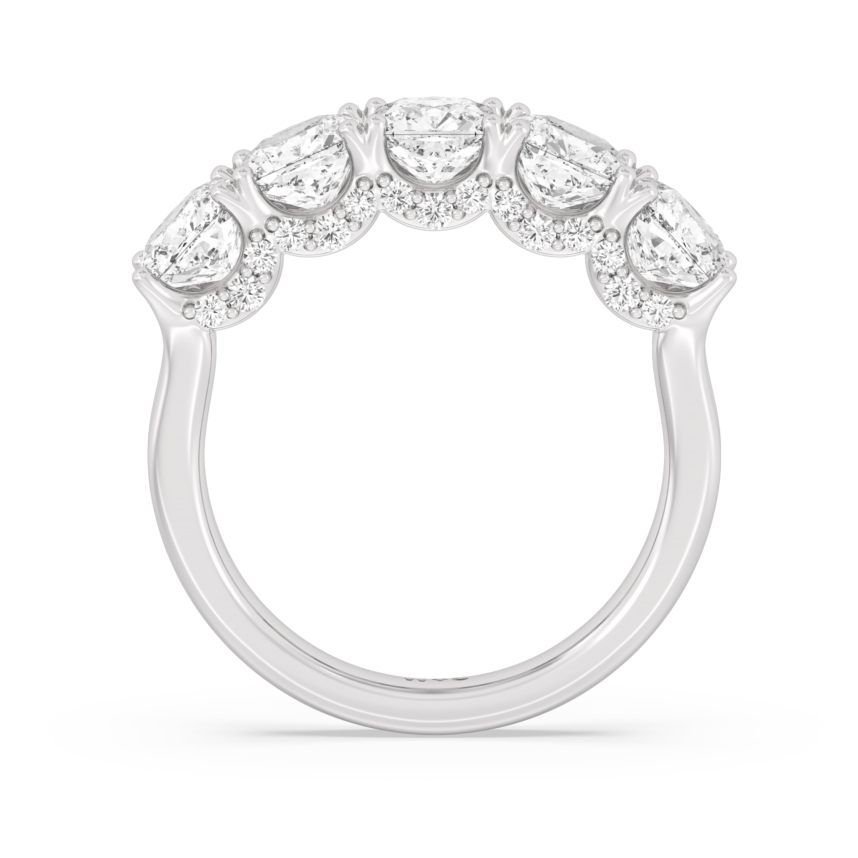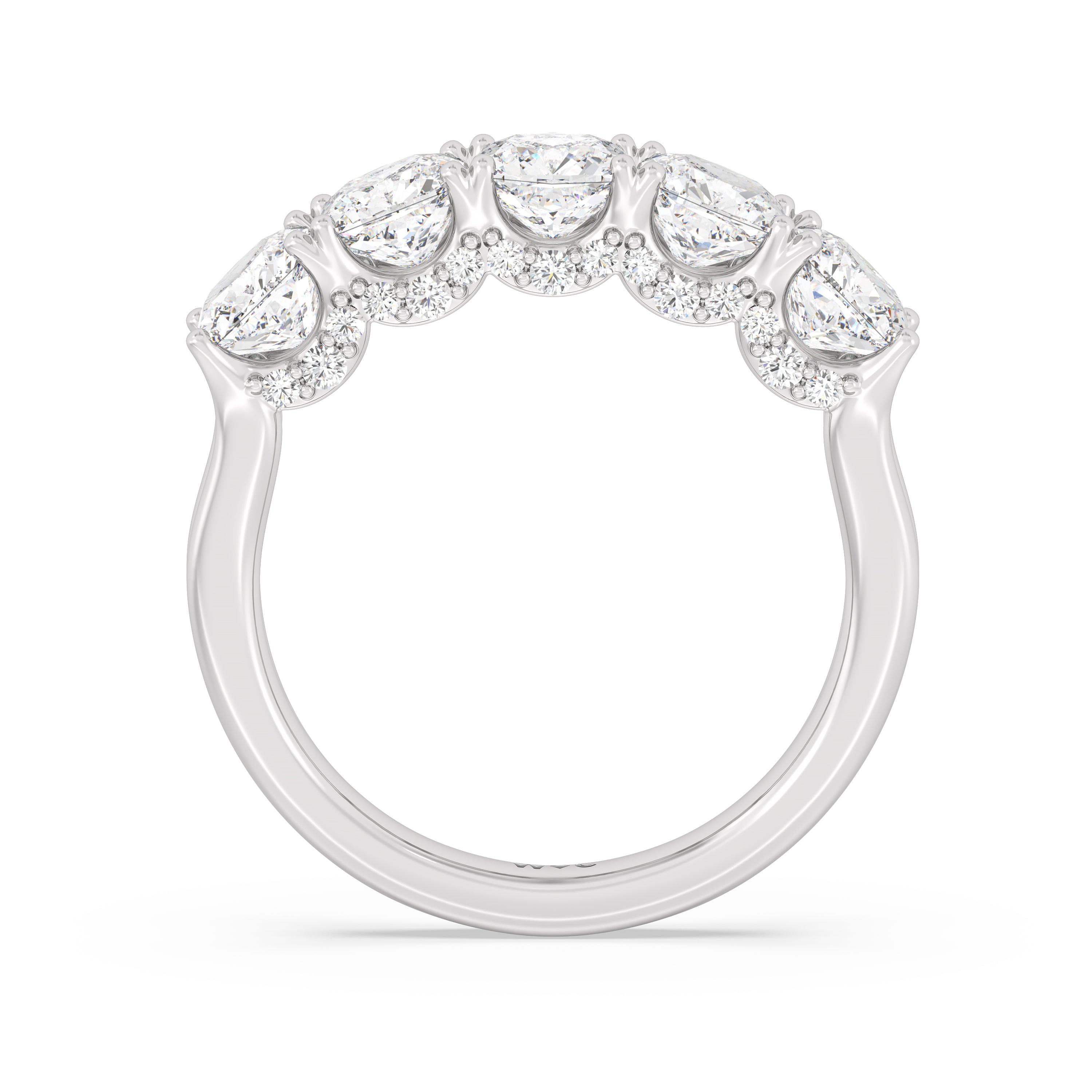 Offering expressive brilliance, this five-stone anniversary band makes the perfect marker to celebrate a cherished milestone. It features a split shank with five diamonds, each detailed with a hidden halo. The petite stones that are visible only on side views add an extra layer of depth to the ring's shine, offering the perfect reminder to celebrate not just the length but also the depth of your relationship.
