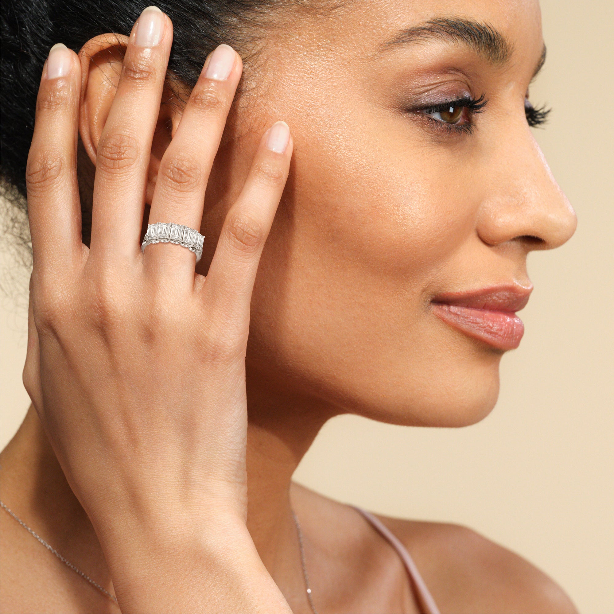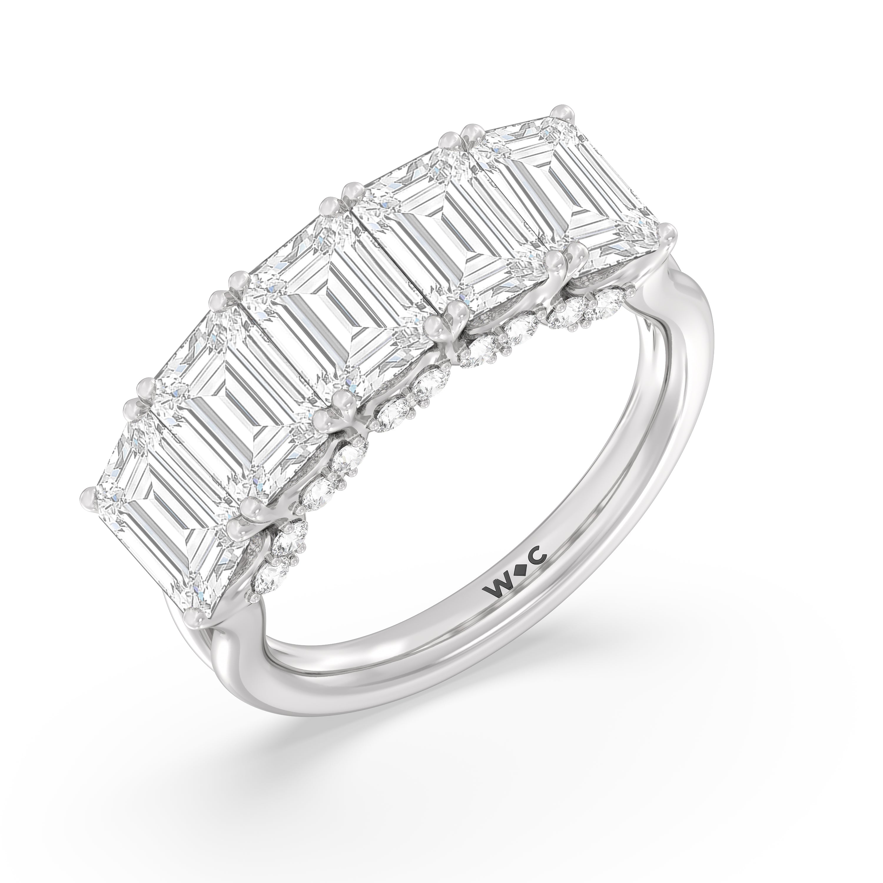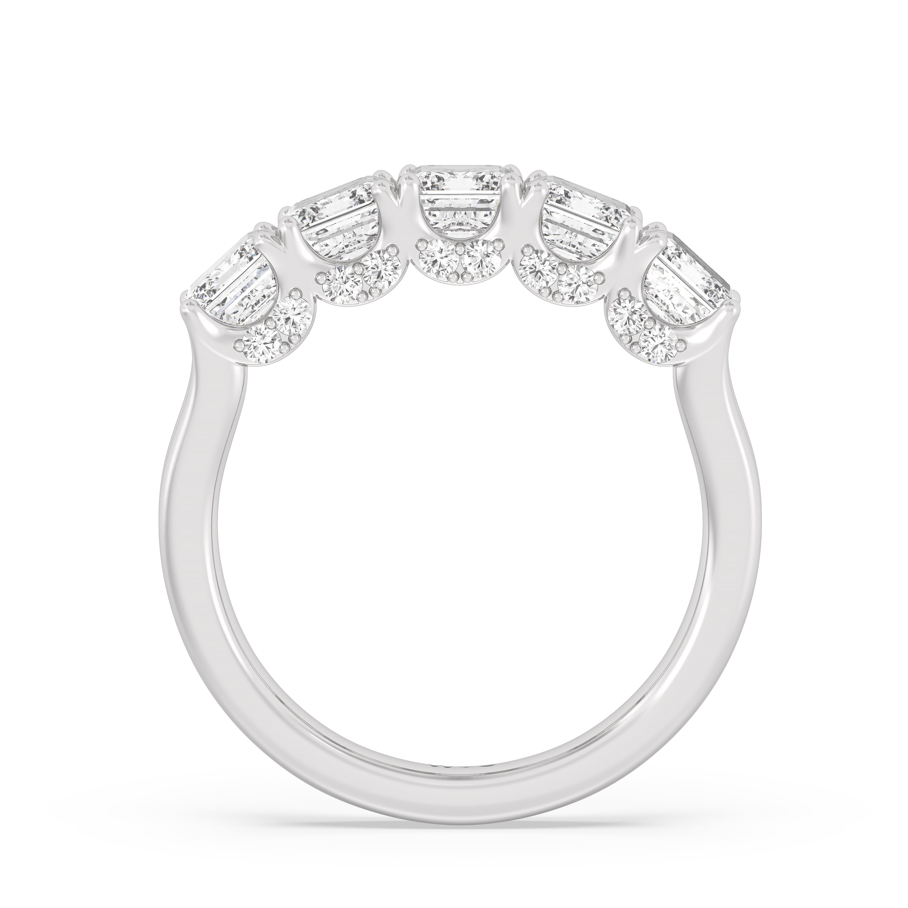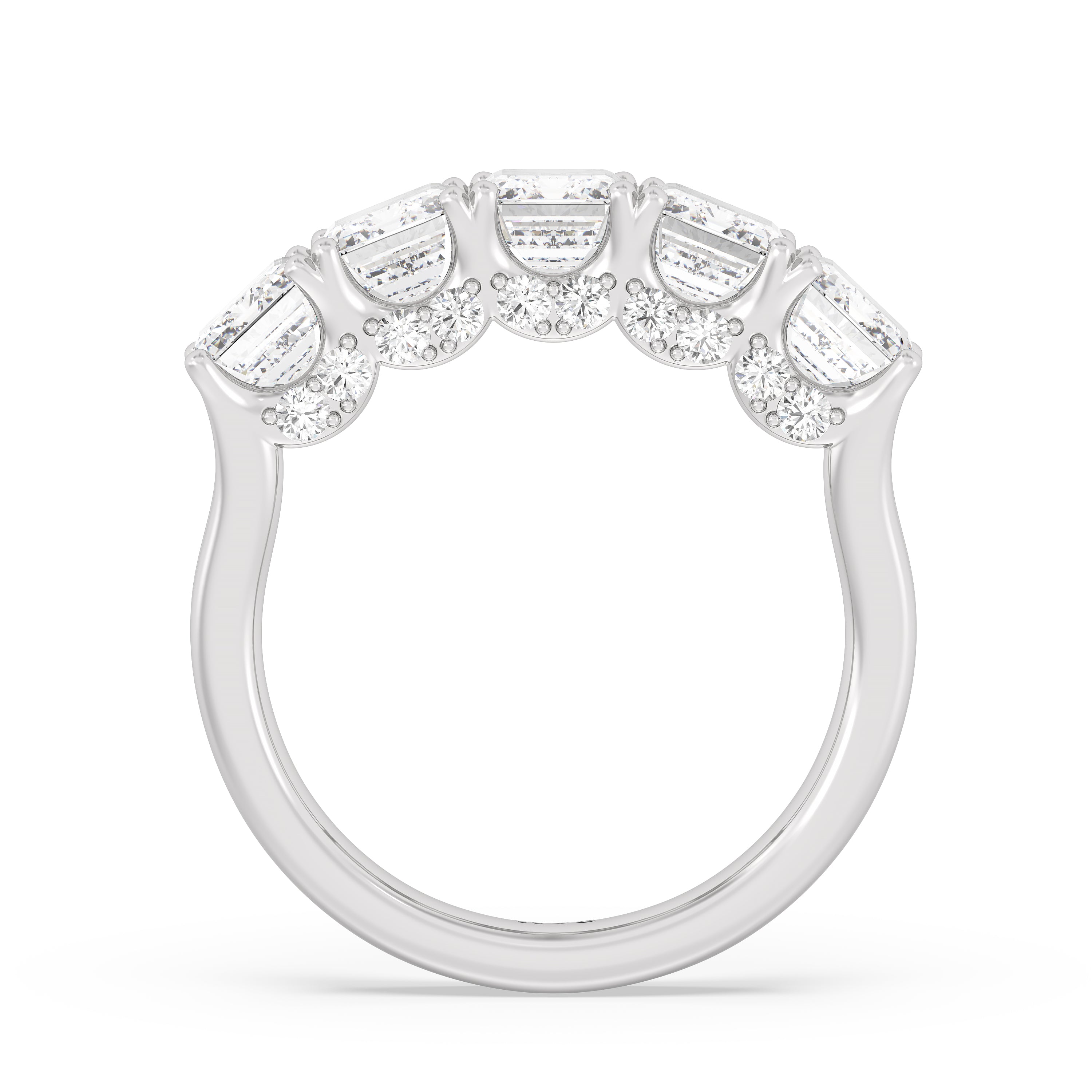 Offering expressive brilliance, this five-stone anniversary band makes the perfect marker to celebrate a cherished milestone. It features a split shank with five diamonds, each detailed with a hidden halo. The petite stones that are visible only on side views add an extra layer of depth to the ring's shine, offering the perfect reminder to celebrate not just the length but also the depth of your relationship.