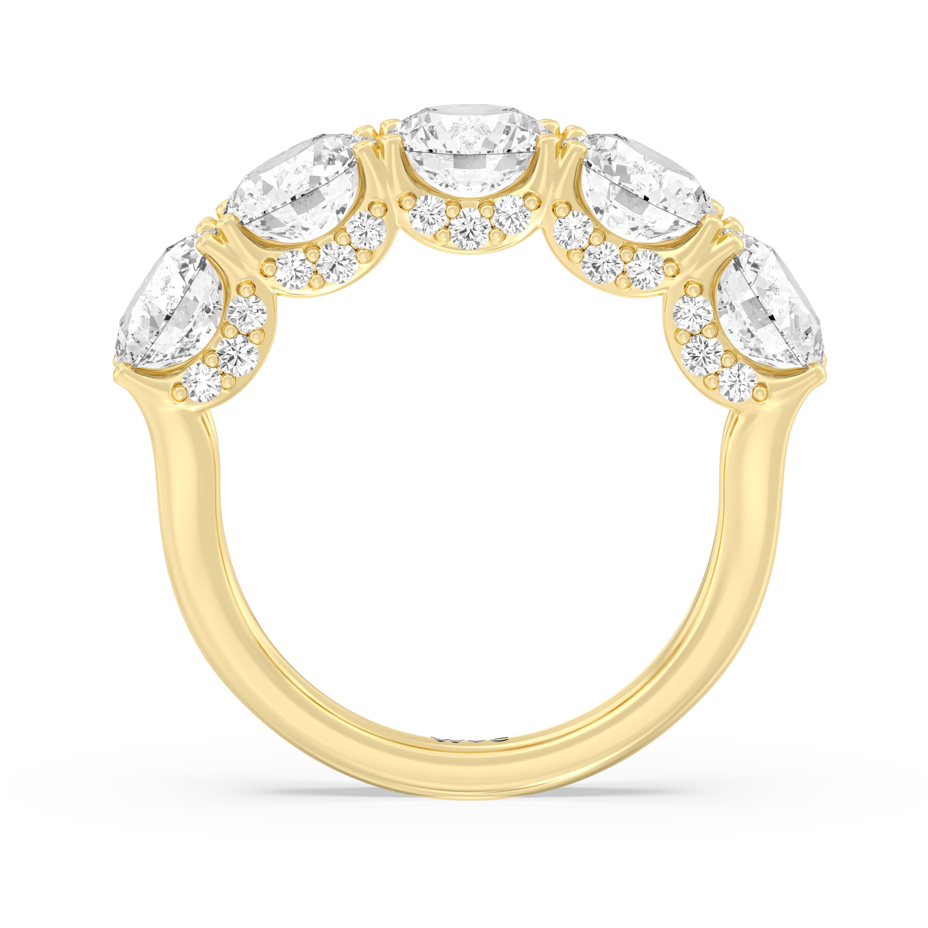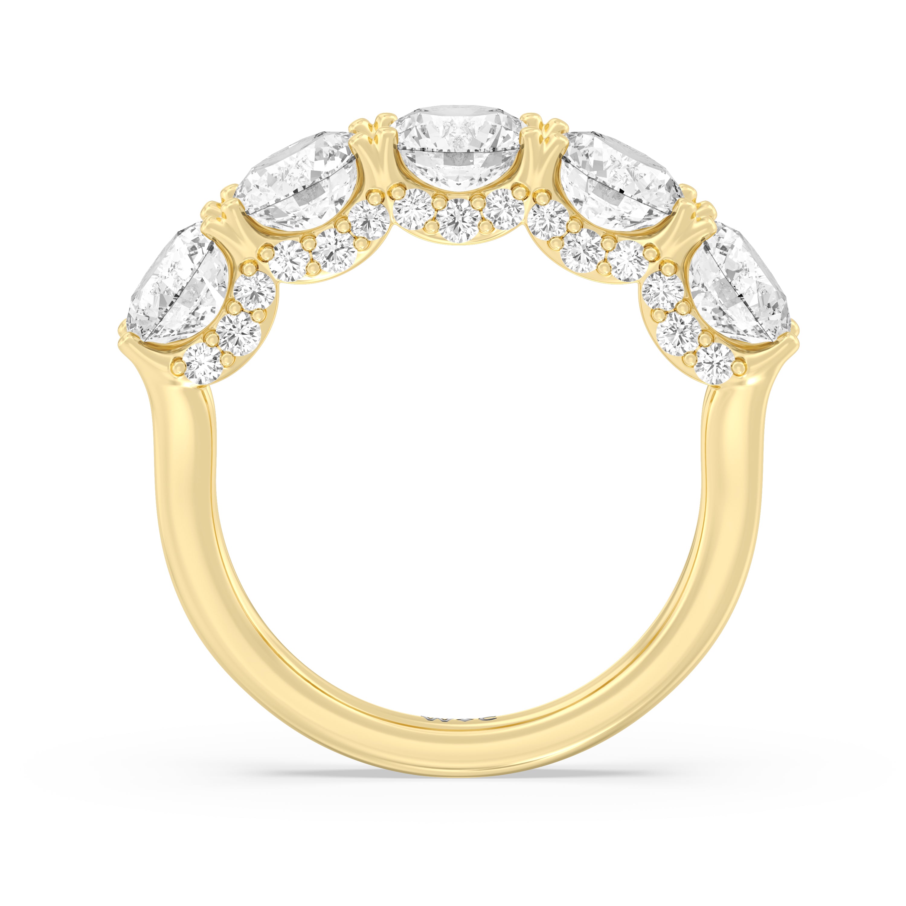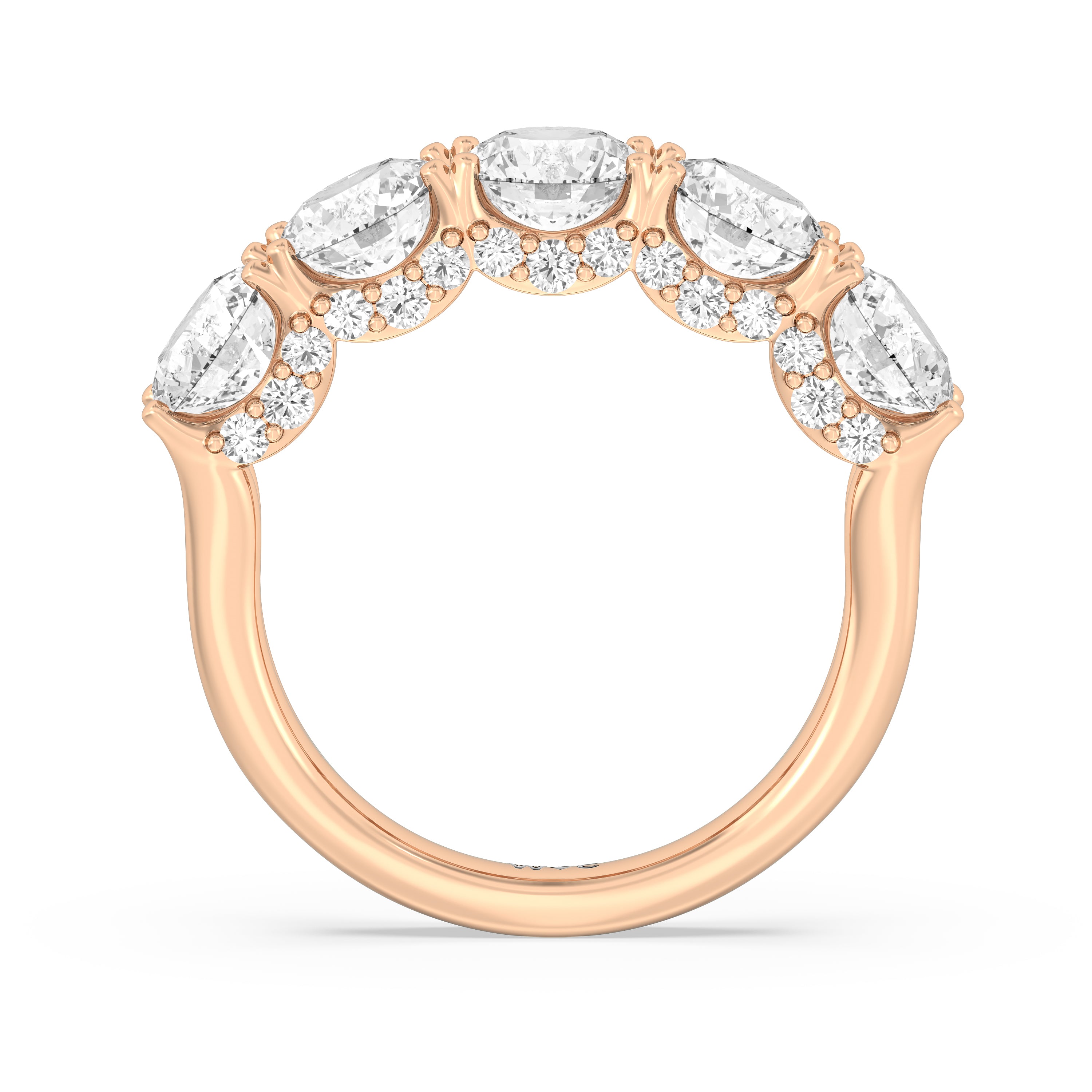 Offering expressive brilliance, this five-stone anniversary band makes the perfect marker to celebrate a cherished milestone. It features a split shank with five diamonds, each detailed with a hidden halo. The petite stones that are visible only on side views add an extra layer of depth to the ring's shine, offering the perfect reminder to celebrate not just the length but also the depth of your relationship.
