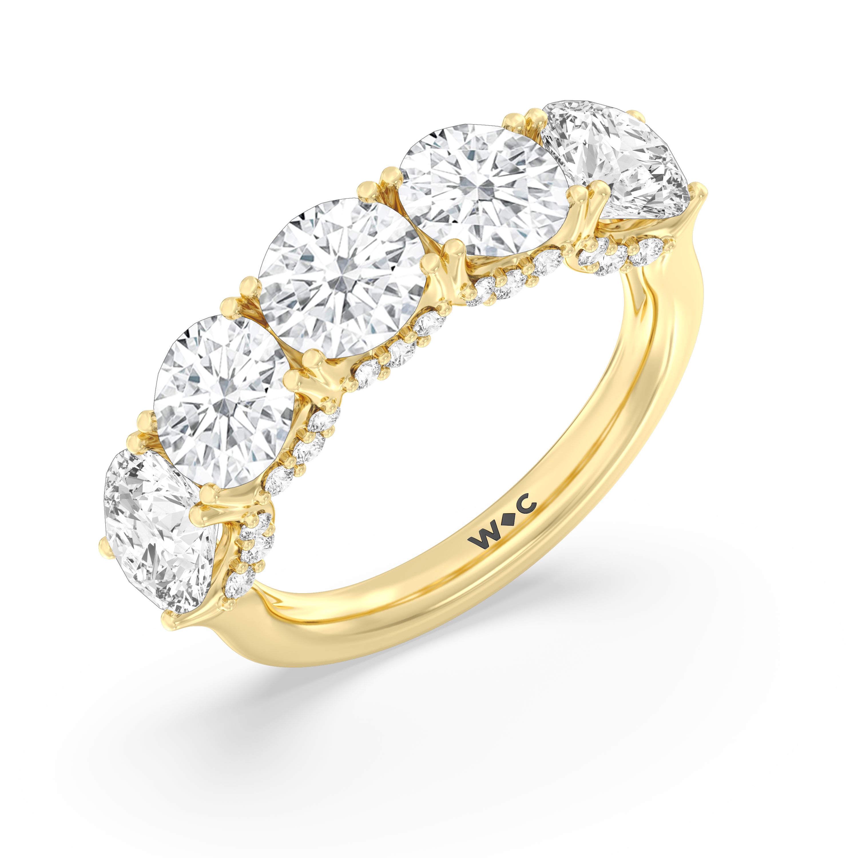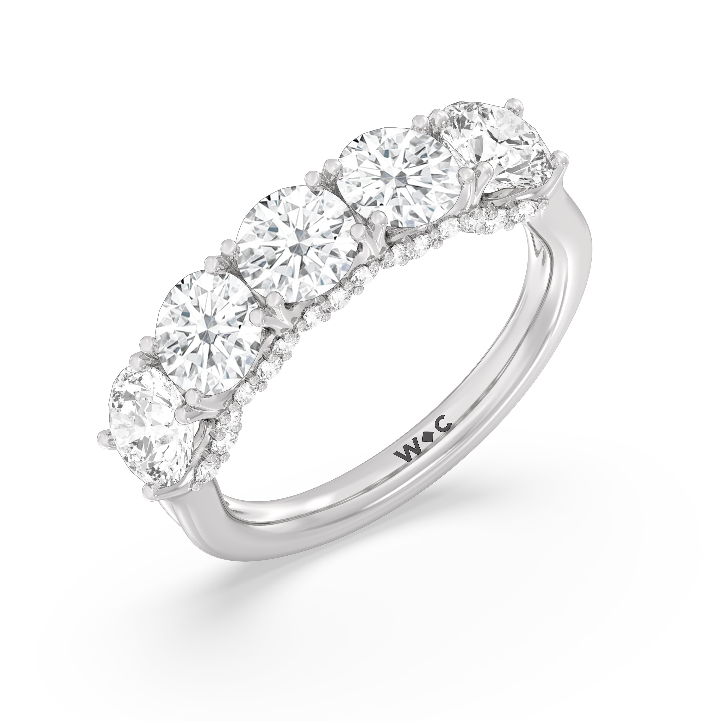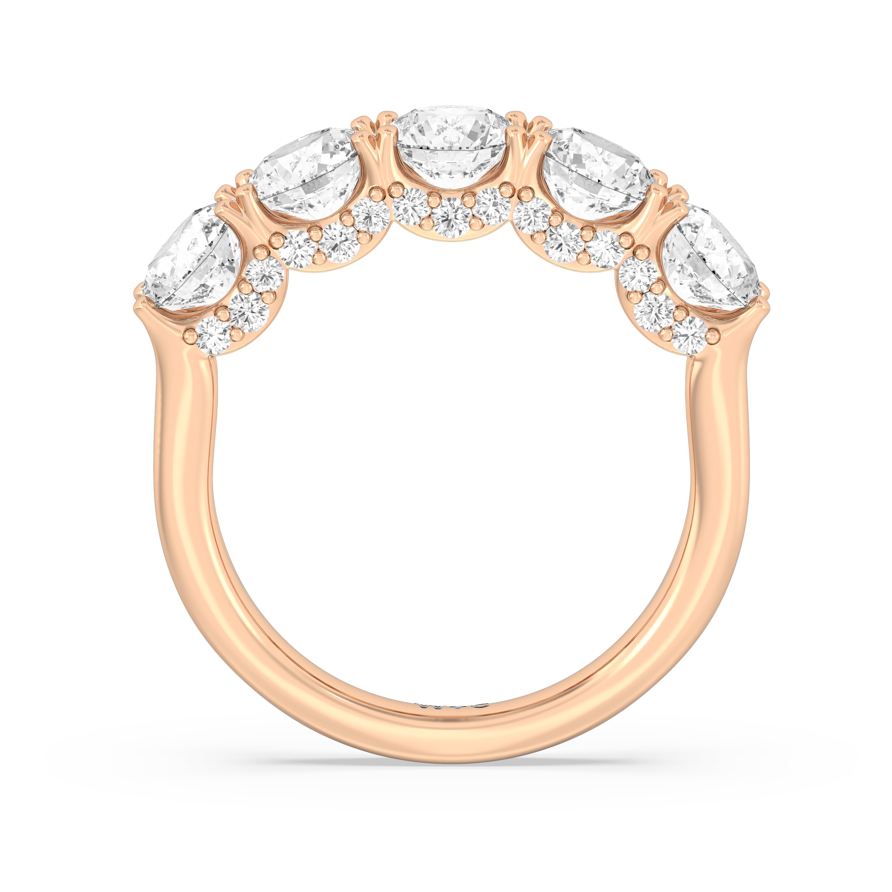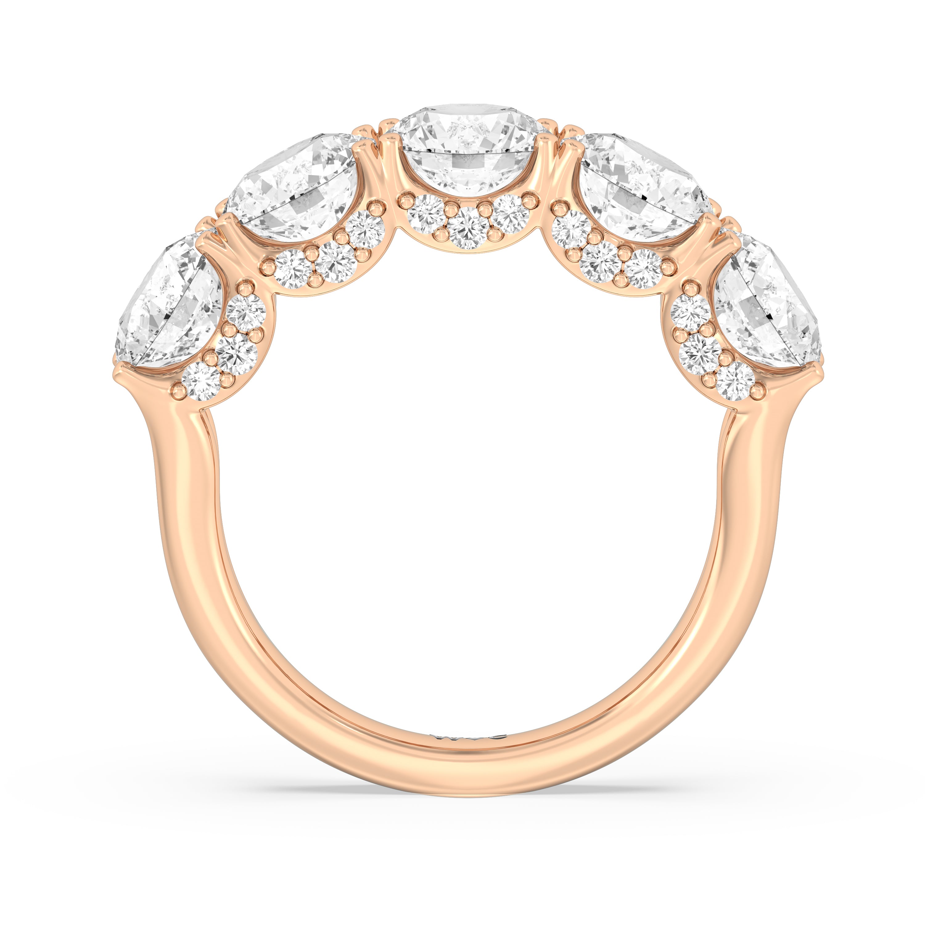 Offering expressive brilliance, this five-stone anniversary band makes the perfect marker to celebrate a cherished milestone. It features a split shank with five diamonds, each detailed with a hidden halo. The petite stones that are visible only on side views add an extra layer of depth to the ring's shine, offering the perfect reminder to celebrate not just the length but also the depth of your relationship.