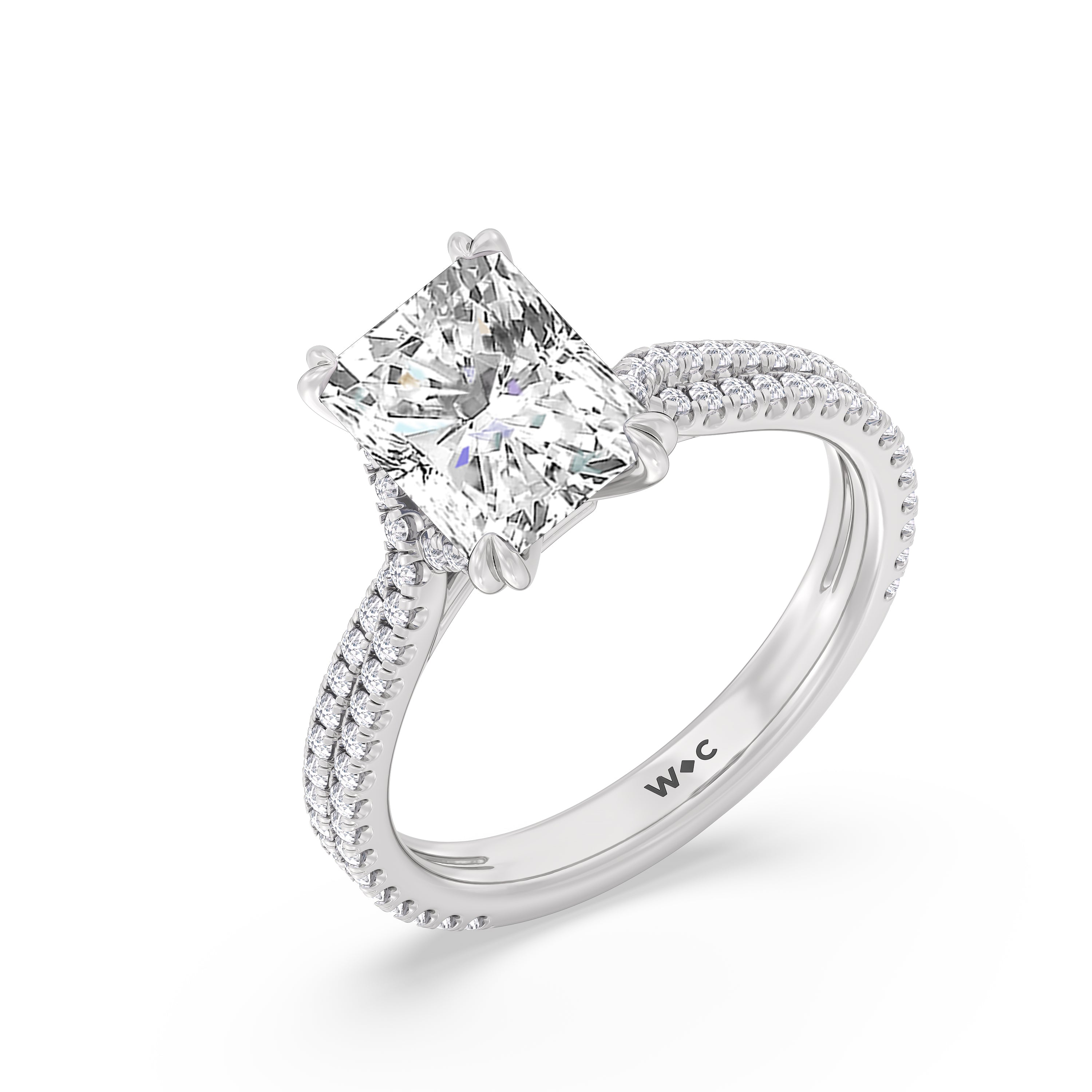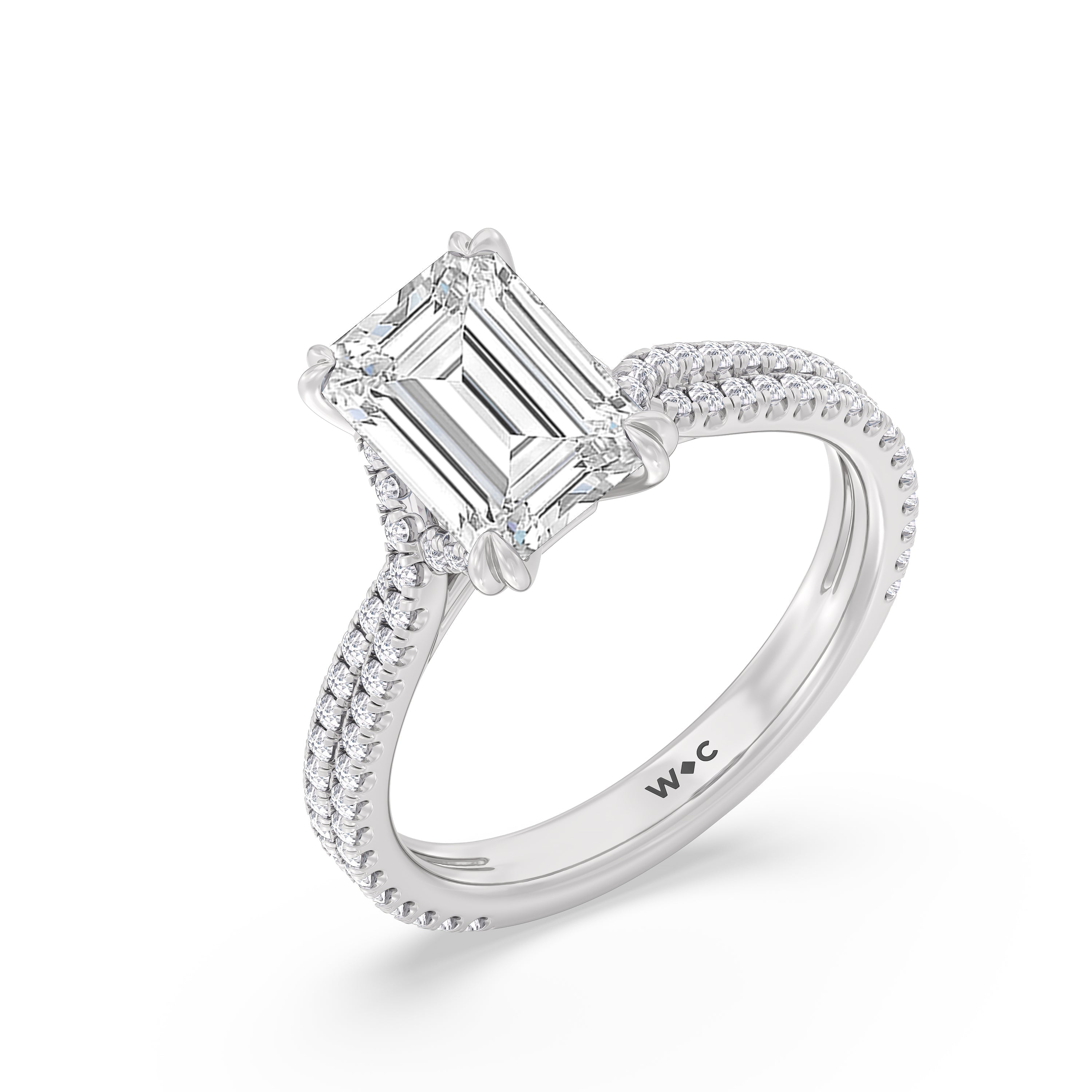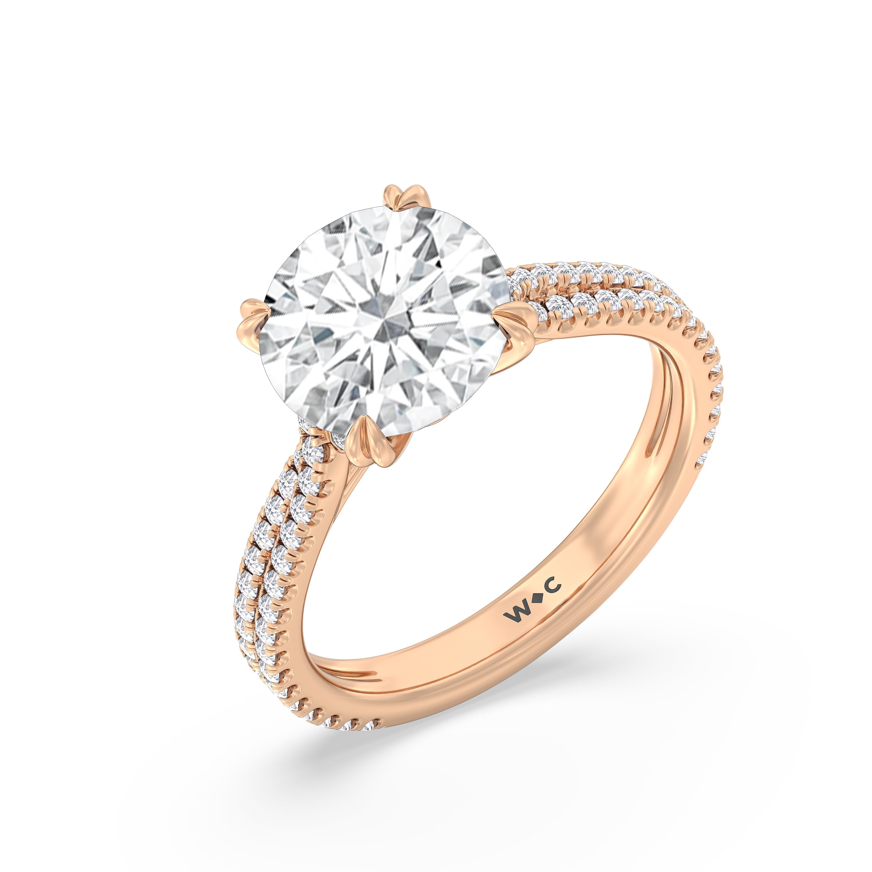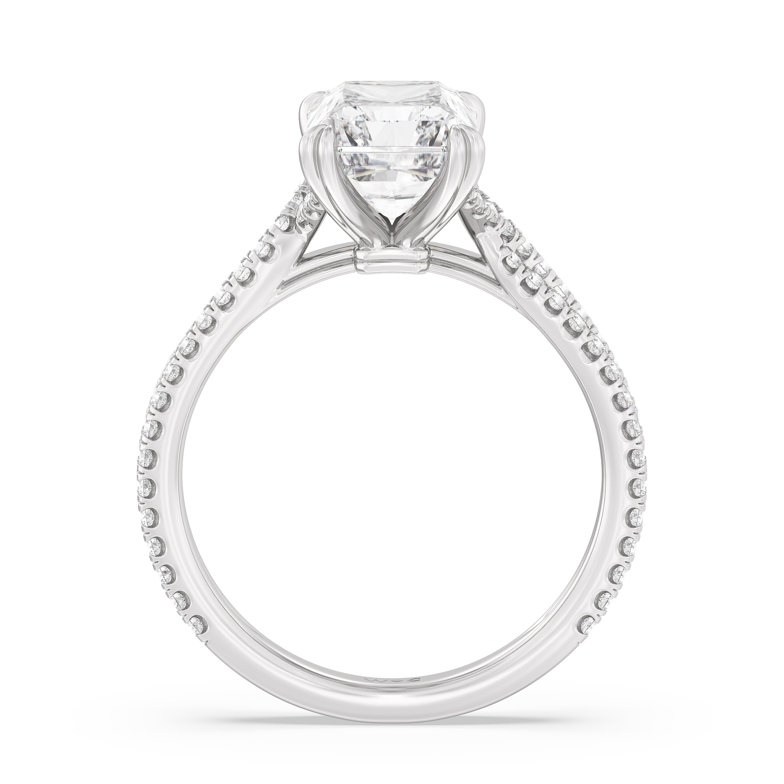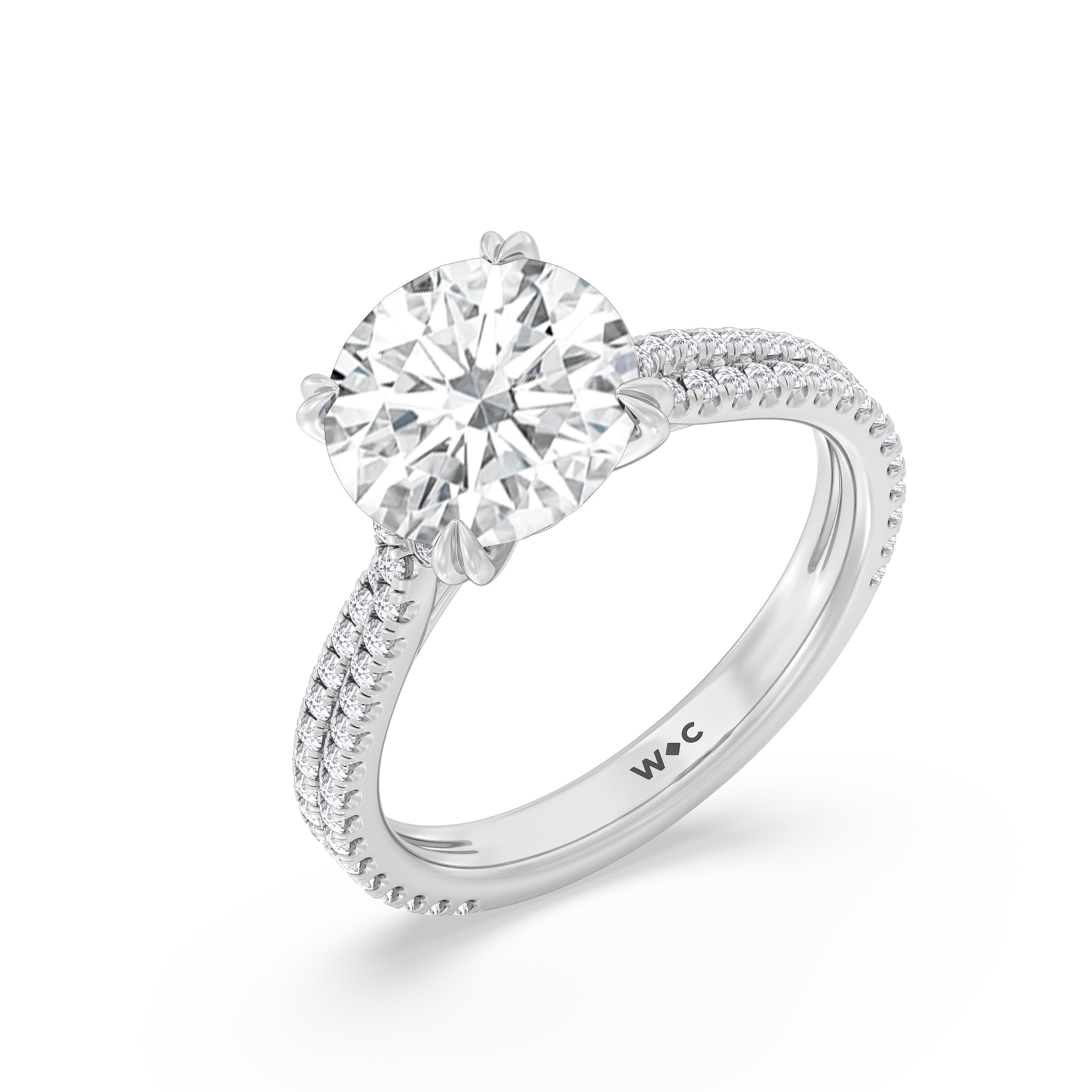 Coveted for its perfect blend of romance and timeless elegance, this ring features heart-shaped double-claw prongs that secure the raised center diamond in place. Double rows of diamonds also run along the band's arching shoulders, lending this piece a dazzling effect.