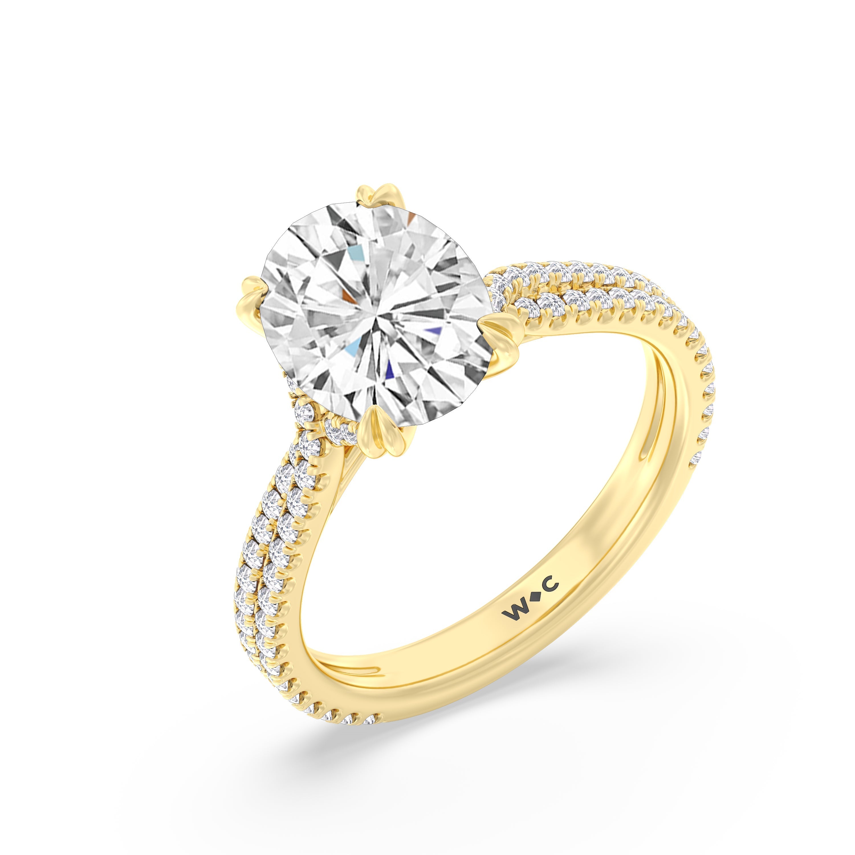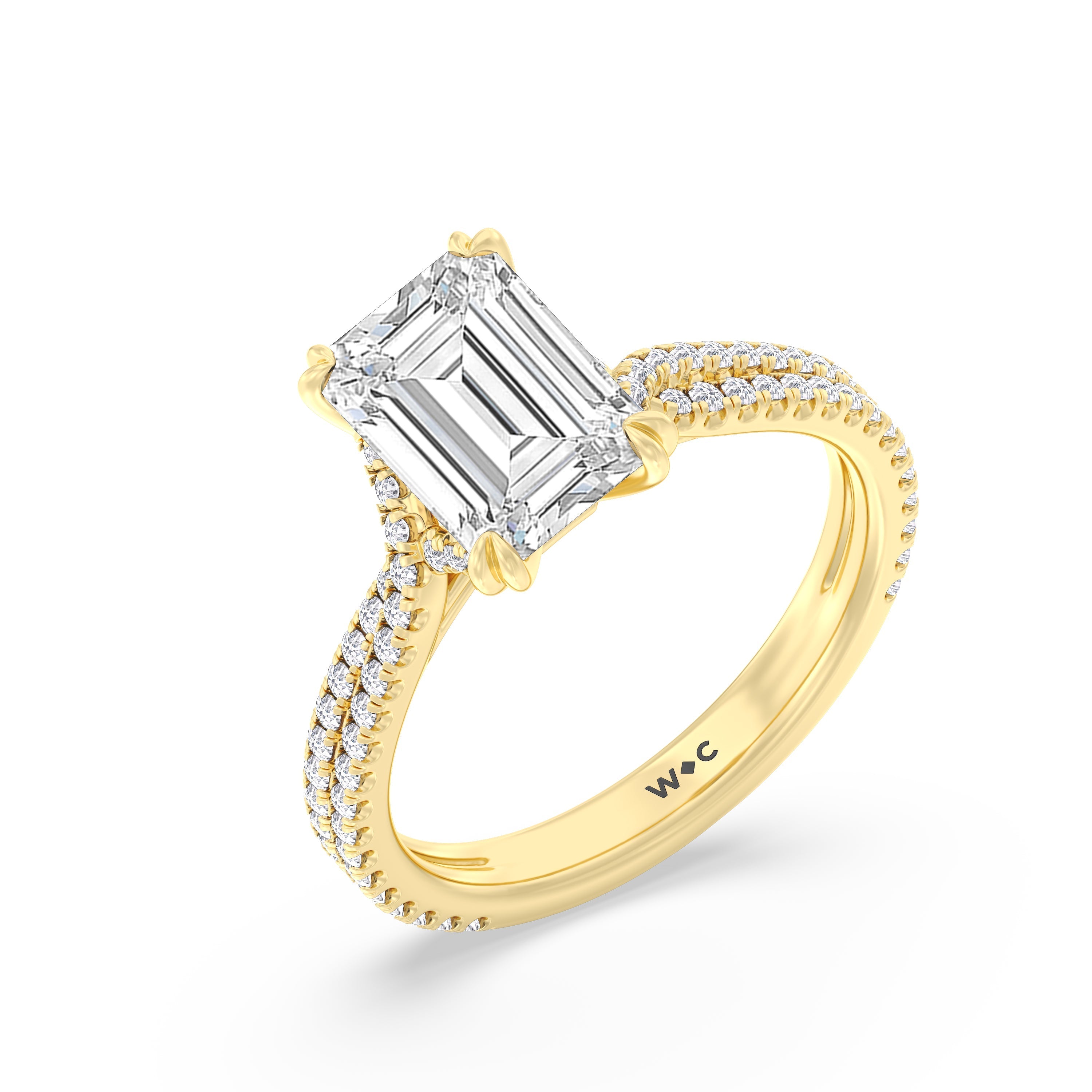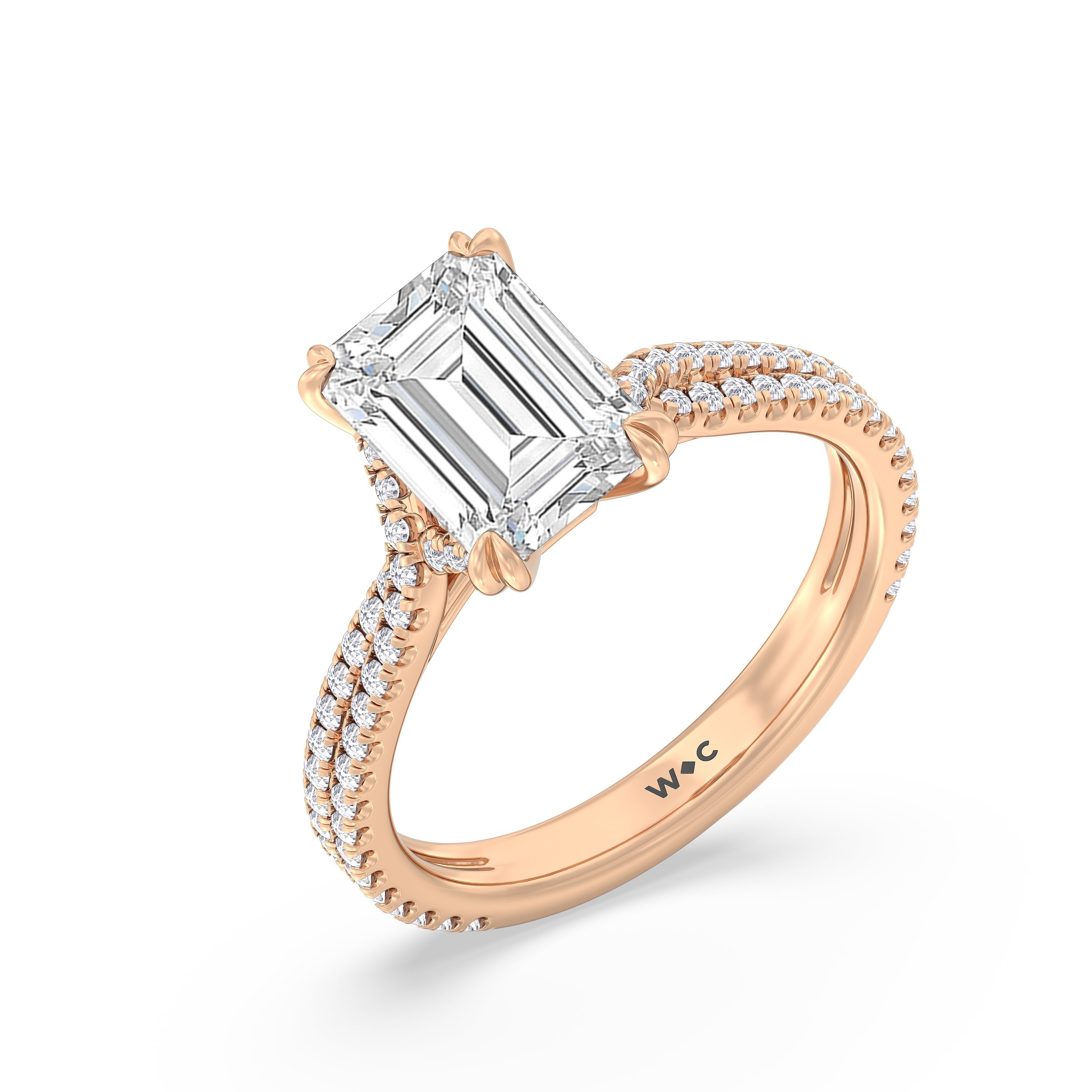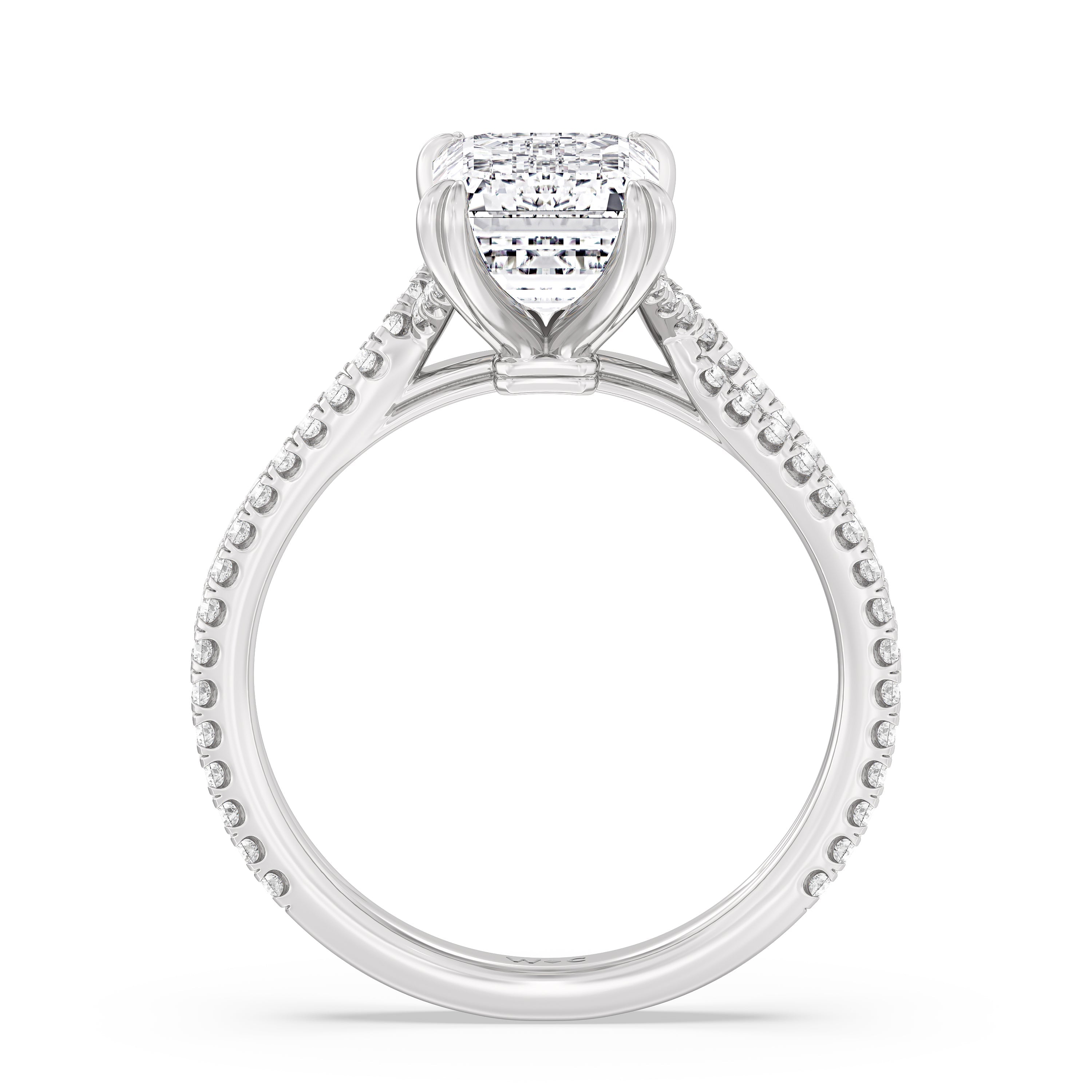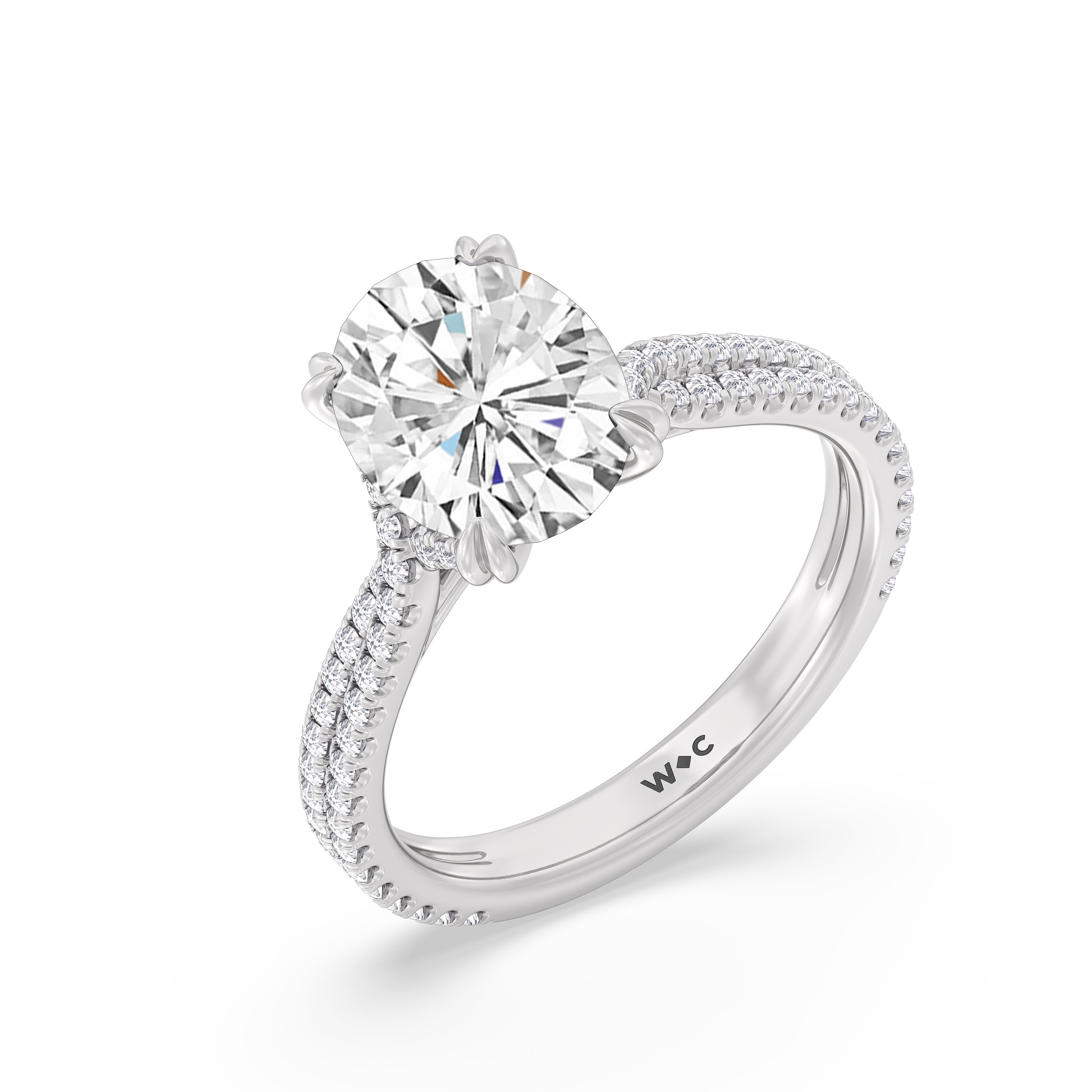 Coveted for its perfect blend of romance and timeless elegance, this ring features heart-shaped double-claw prongs that secure the raised center diamond in place. Double rows of diamonds also run along the band's arching shoulders, lending this piece a dazzling effect.