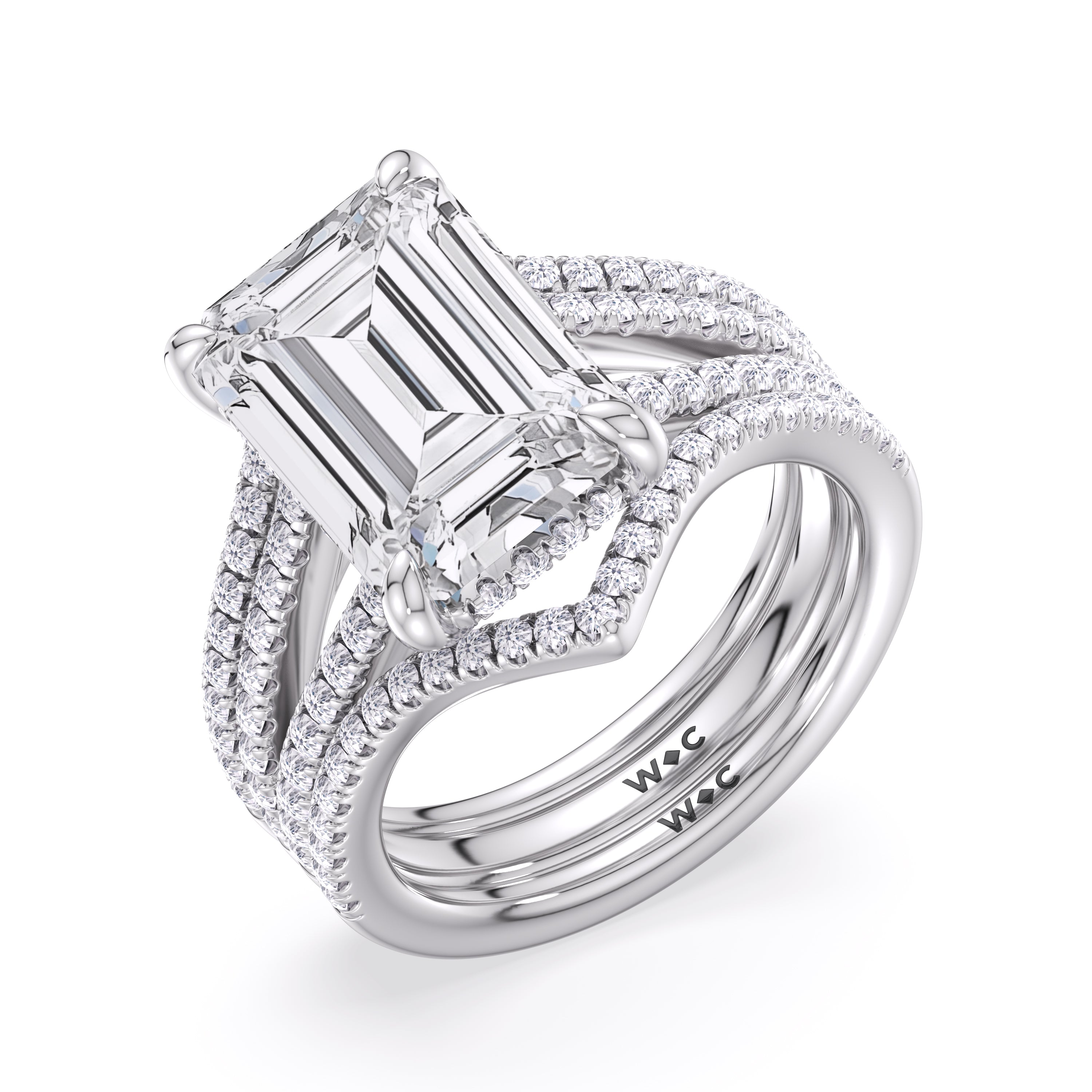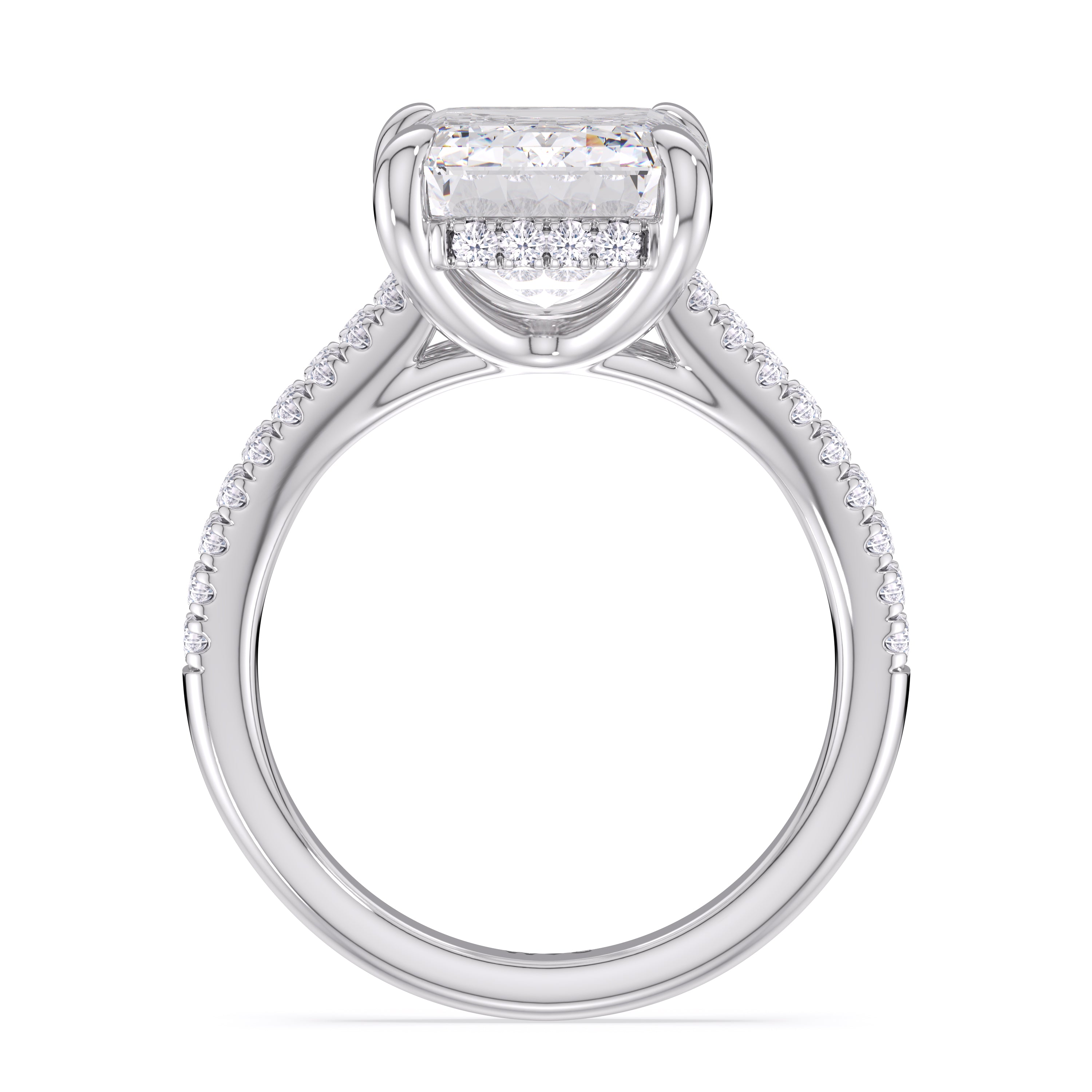 This engagement ring is uniquely brilliant. The band is split lined in pave diamonds. A hidden halo encircles the diamond, adding a touch of sparkle. If you're searching for a one of a kind symbol for your love story, this ring is the perfect choice.